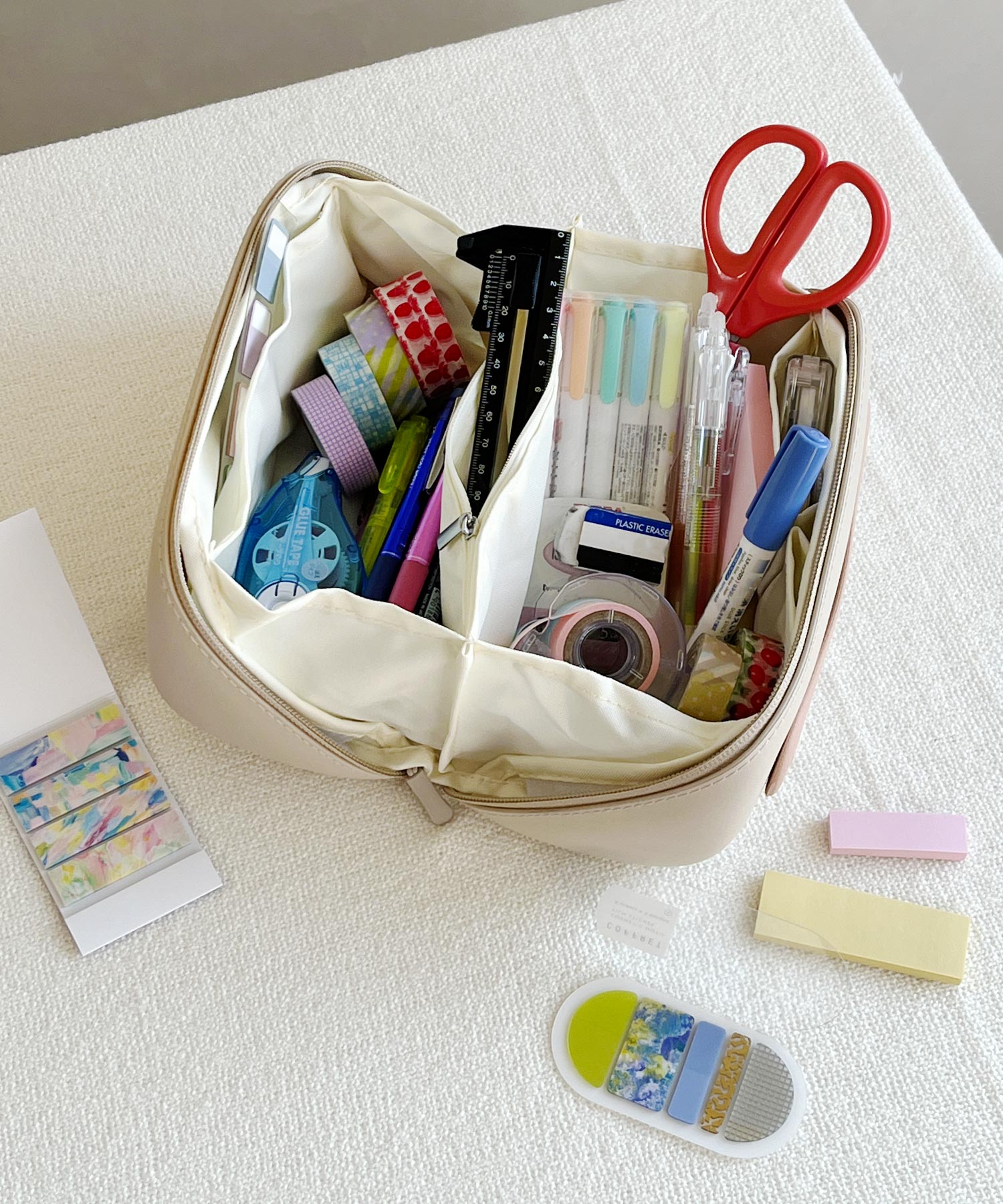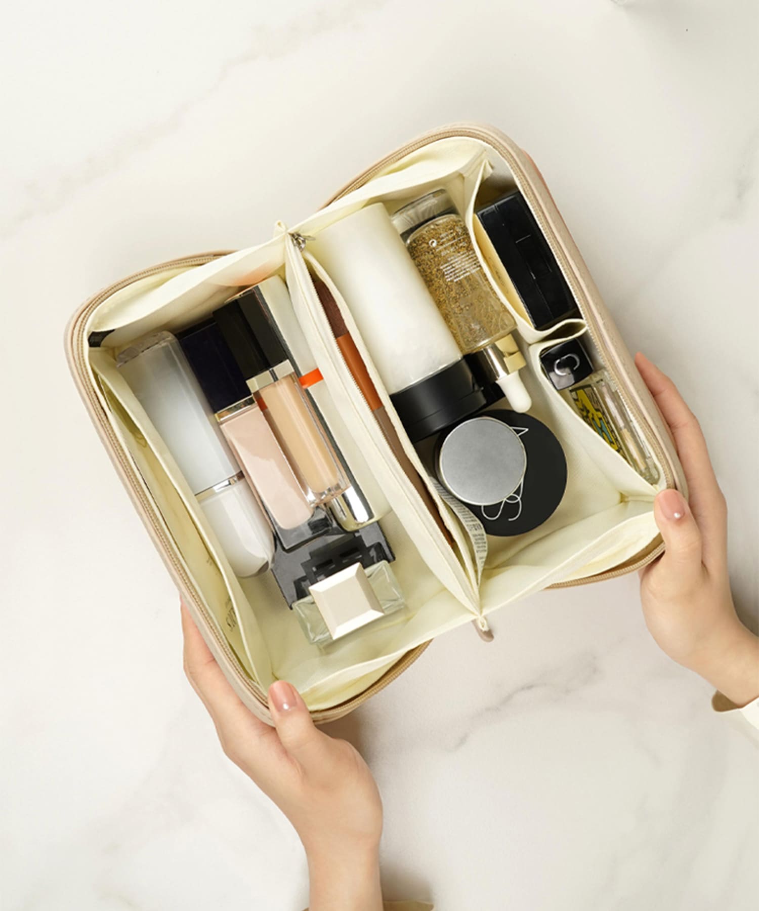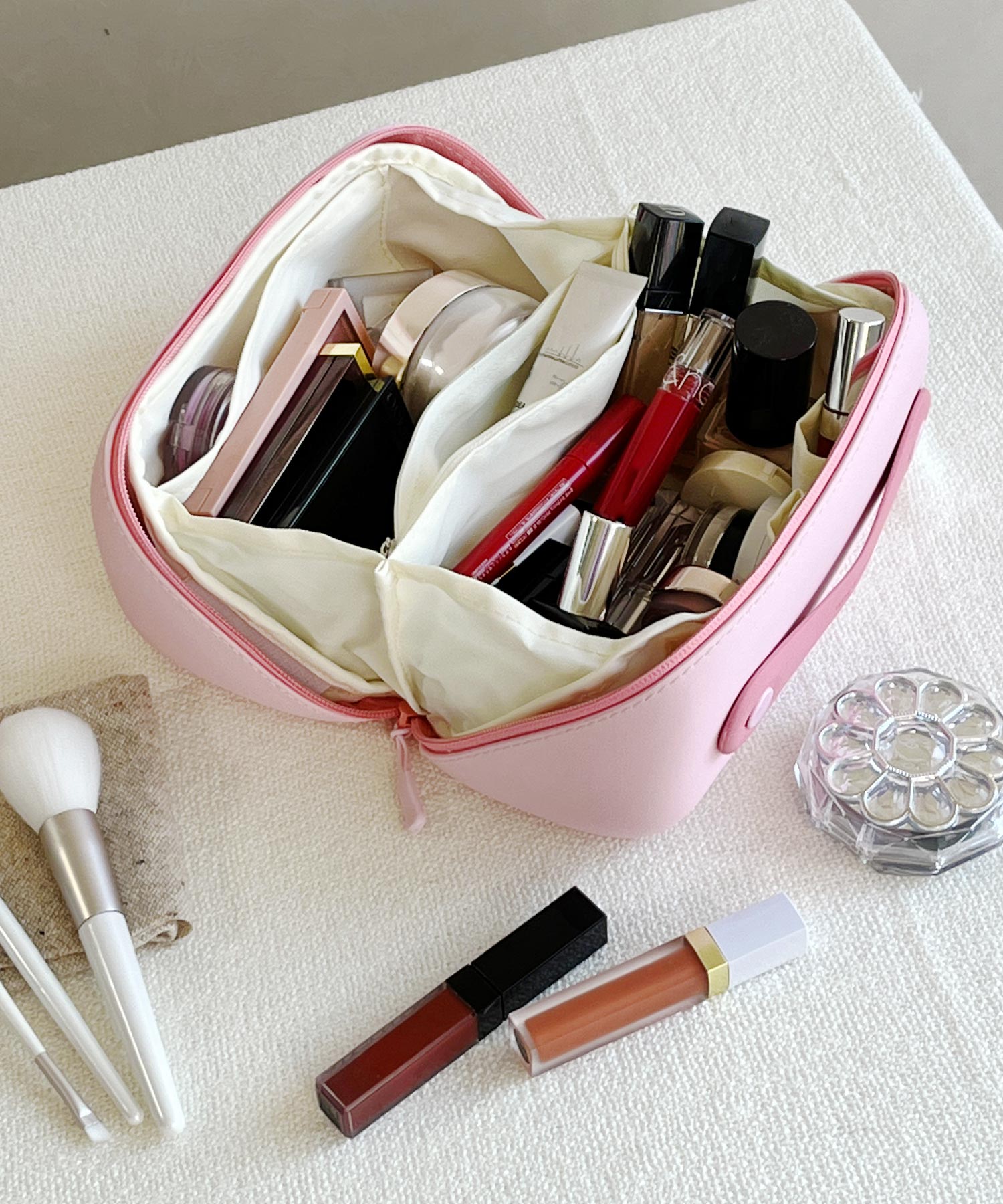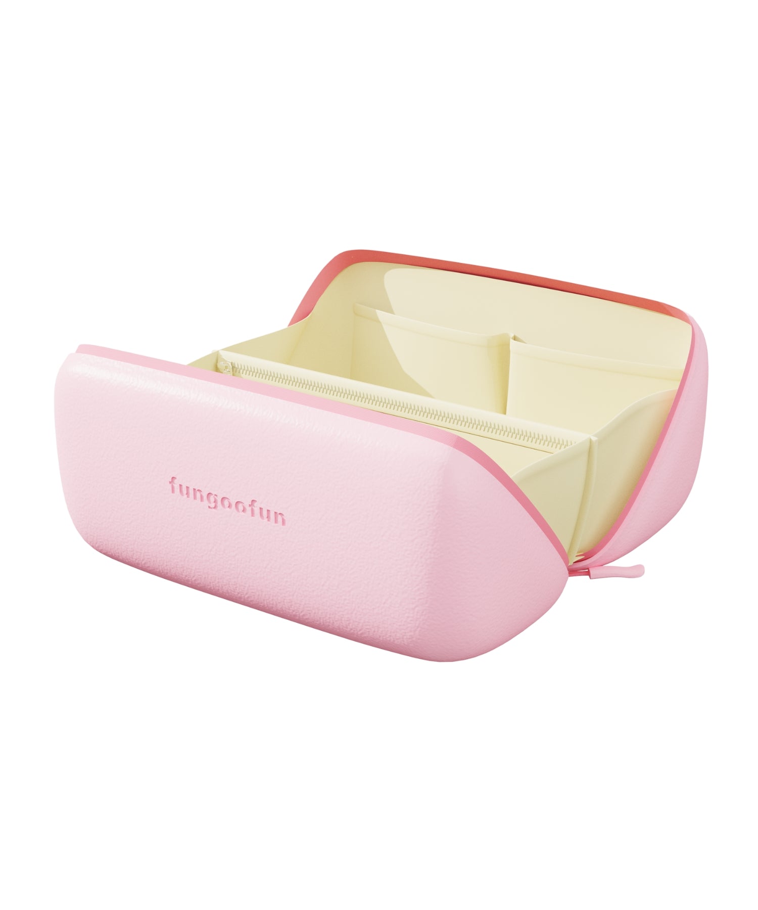ファスナーを開けるとがばっと180度開くボックス型マルチポーチ。開いた状態で置くこともでき、大きな間口のおかげで中身が見やすく取り出しやすい。蓋を閉じると上部にハンドルが付いているので、ラクに持ち運びでき旅行にもおすすめ。コスメはもちろん、ペンケースやガジェット収納としてなどマルチに活躍。内側にはポケットが4か所あるため細かいツールやすぐに取り出したいアイテムの整理にもぴったり。また、中の仕切り部分はベルクロタイプで着脱ができ手洗い可能なので清潔に使用できるのも嬉しいポイント。EVA素材を使用しているのでとても軽く、防水性と防汚性に優れたデイリー使いにもぴったりなアイテム。