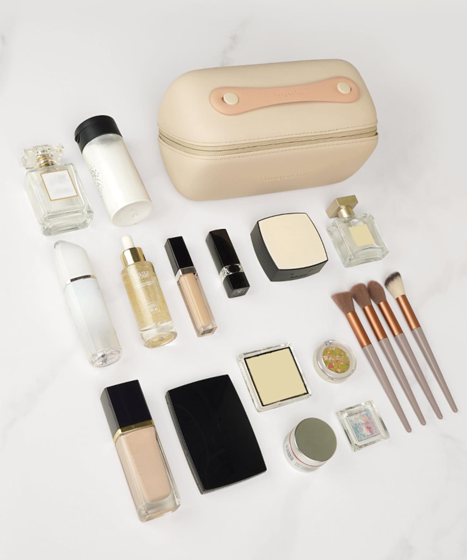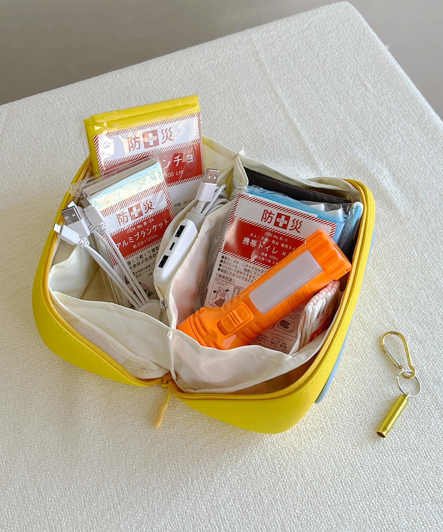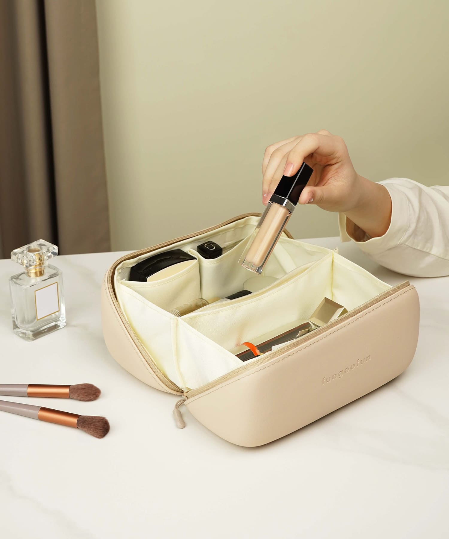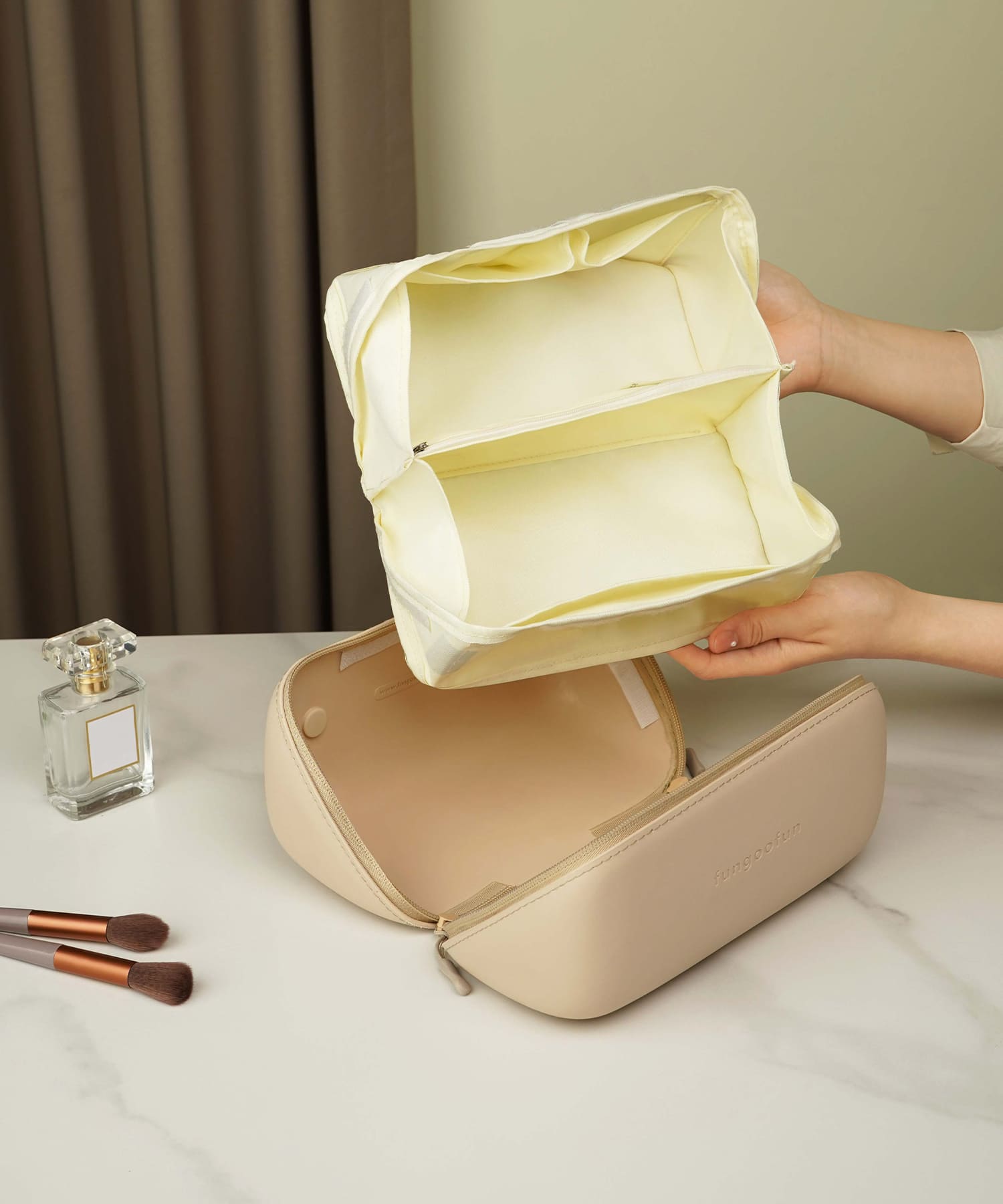 ファスナーを開けるとがばっと180度開くボックス型マルチポーチ。開いた状態で置くこともでき、大きな間口のおかげで中身が見やすく取り出しやすい。蓋を閉じると上部にハンドルが付いているので、ラクに持ち運びでき旅行にもおすすめ。コスメはもちろん、ペンケースやガジェット収納としてなどマルチに活躍。内側にはポケットが4か所あるため細かいツールやすぐに取り出したいアイテムの整理にもぴったり。また、中の仕切り部分はベルクロタイプで着脱ができ手洗い可能なので清潔に使用できるのも嬉しいポイント。EVA素材を使用しているのでとても軽く、防水性と防汚性に優れたデイリー使いにもぴったりなアイテム。
