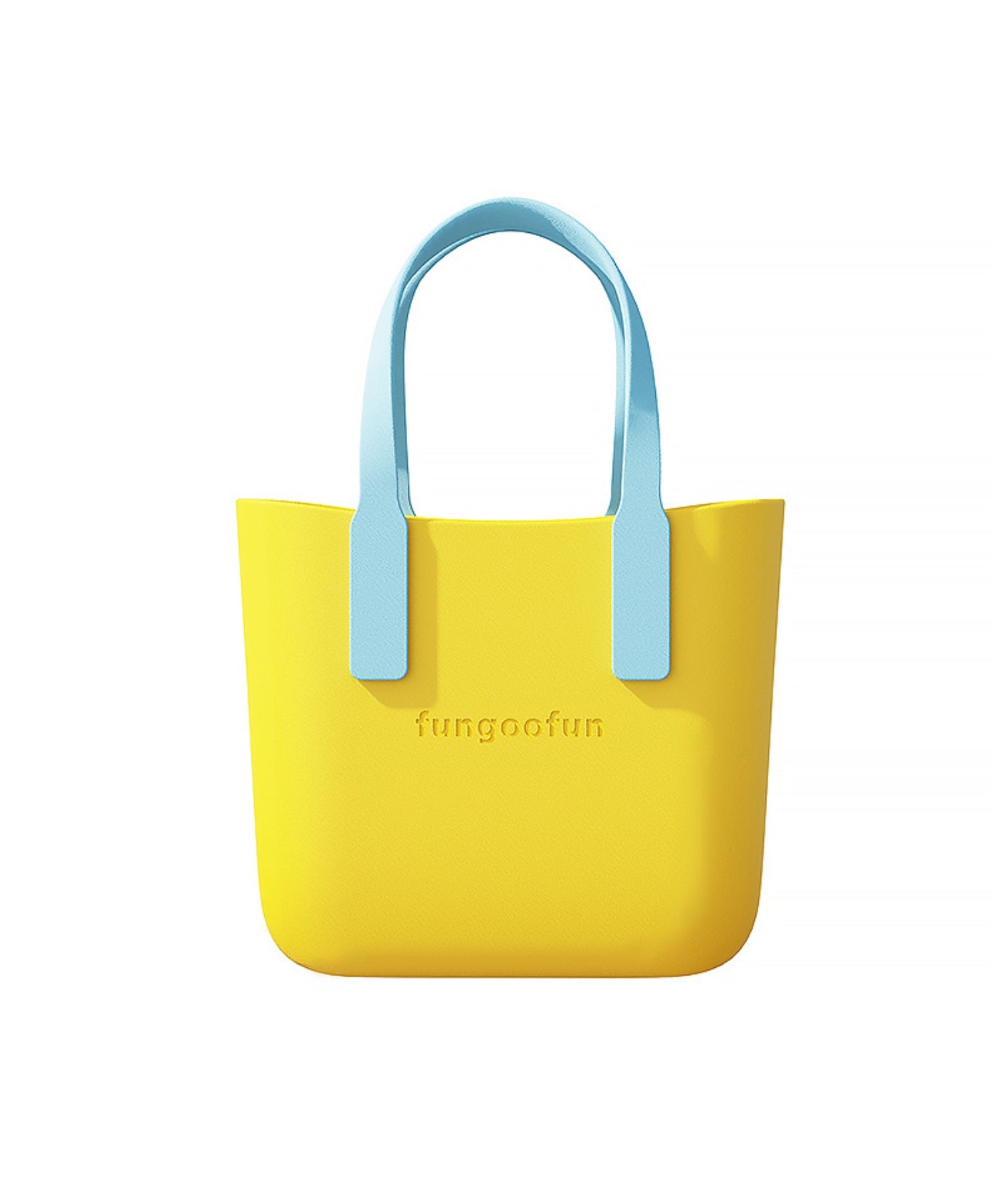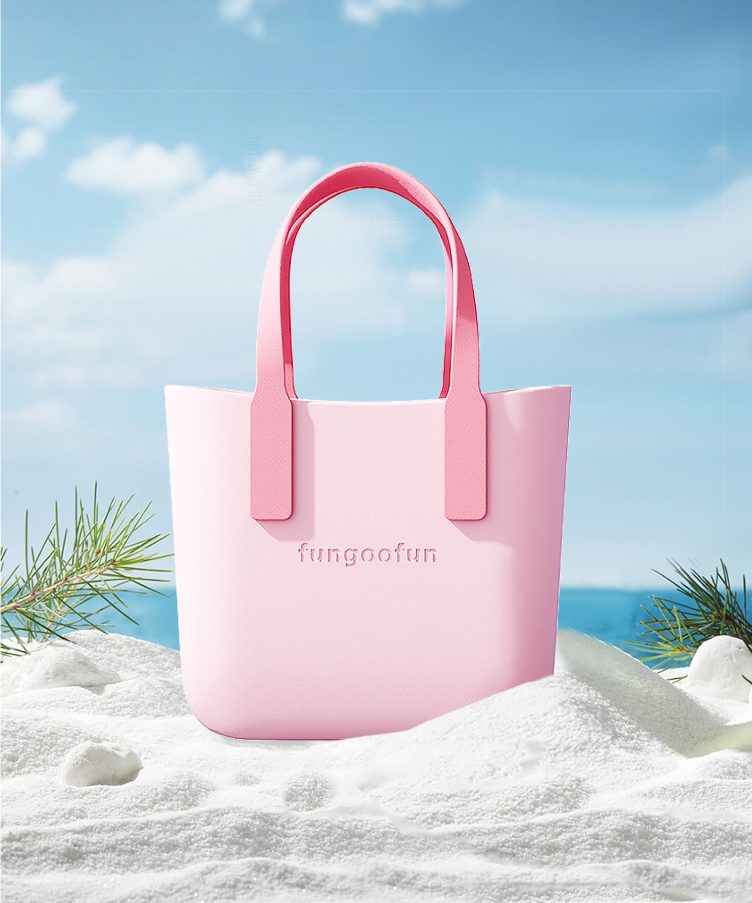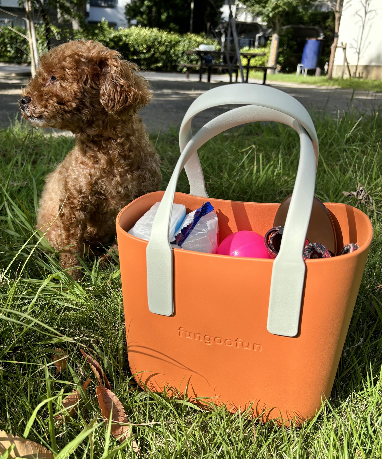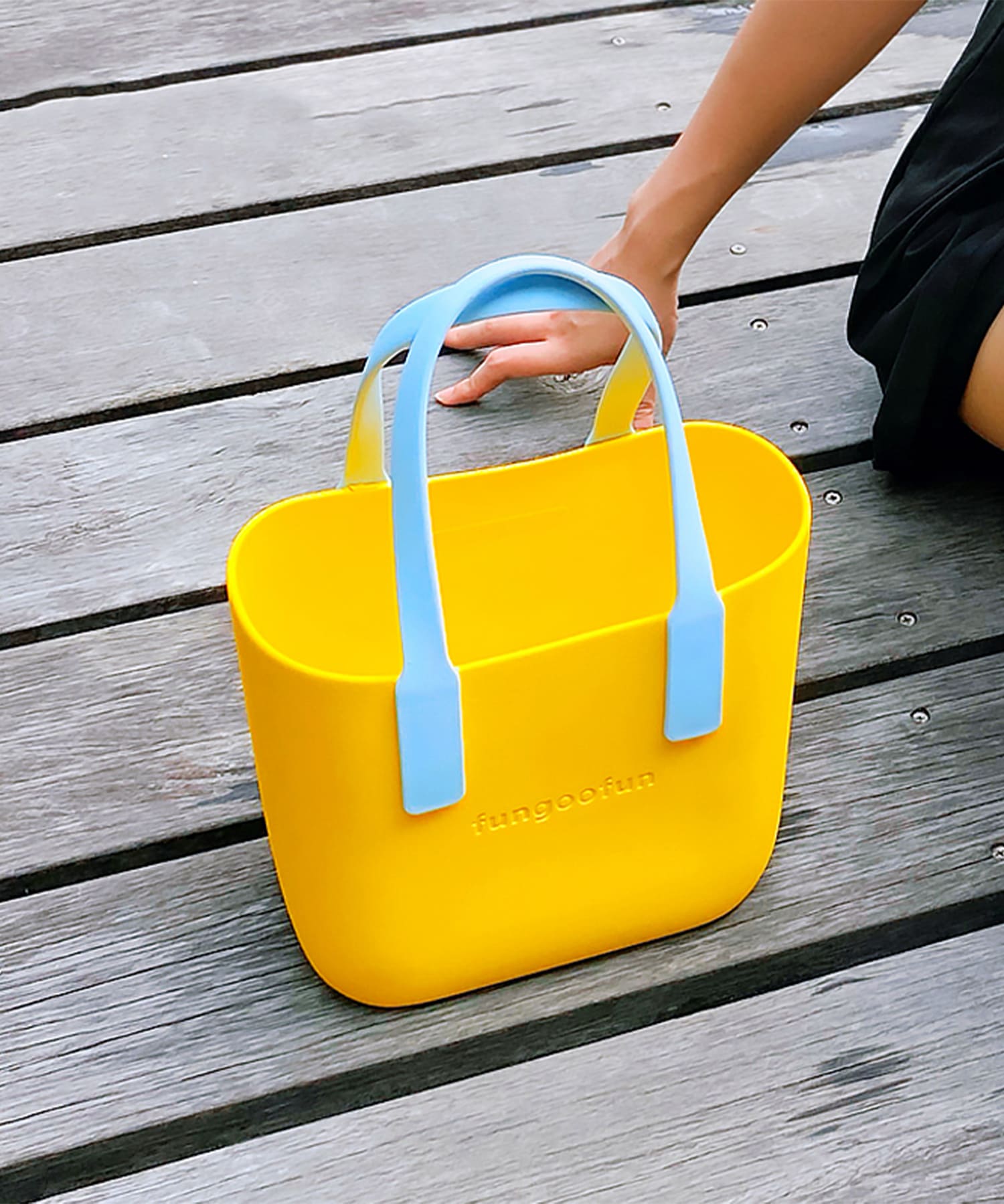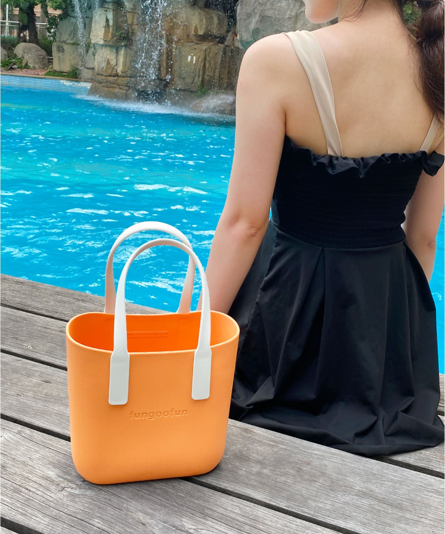 たっぷりのマチと使いやすい深さで収納力抜群のハンドバッグ。柔らかい素材感の持ち手は、滑らかなカーブを付けて手や腕にフィットする形に。さらに本体部分とバイカラーになったカラーリングはコーディネートのアクセントにもおすすめ。底部分は表面に細かい凹凸を付けることで滑り止め効果をプラス。EVA素材を使用しているので軽量で柔軟性も高く、防水性と防汚性に優れたアイテム。汚れても丸洗いができるのでお手入れが楽なのも魅力的。ゆったりとしたマチがあり500㎖のペットボトルもすっぽり入る大容量サイズ。お買い物やお出掛けはもちろん、ペットのお散歩用バッグや海・プールなどのアクティビティ、ピクニック、アウトドアシーンなど幅広く活躍すること間違いなし。