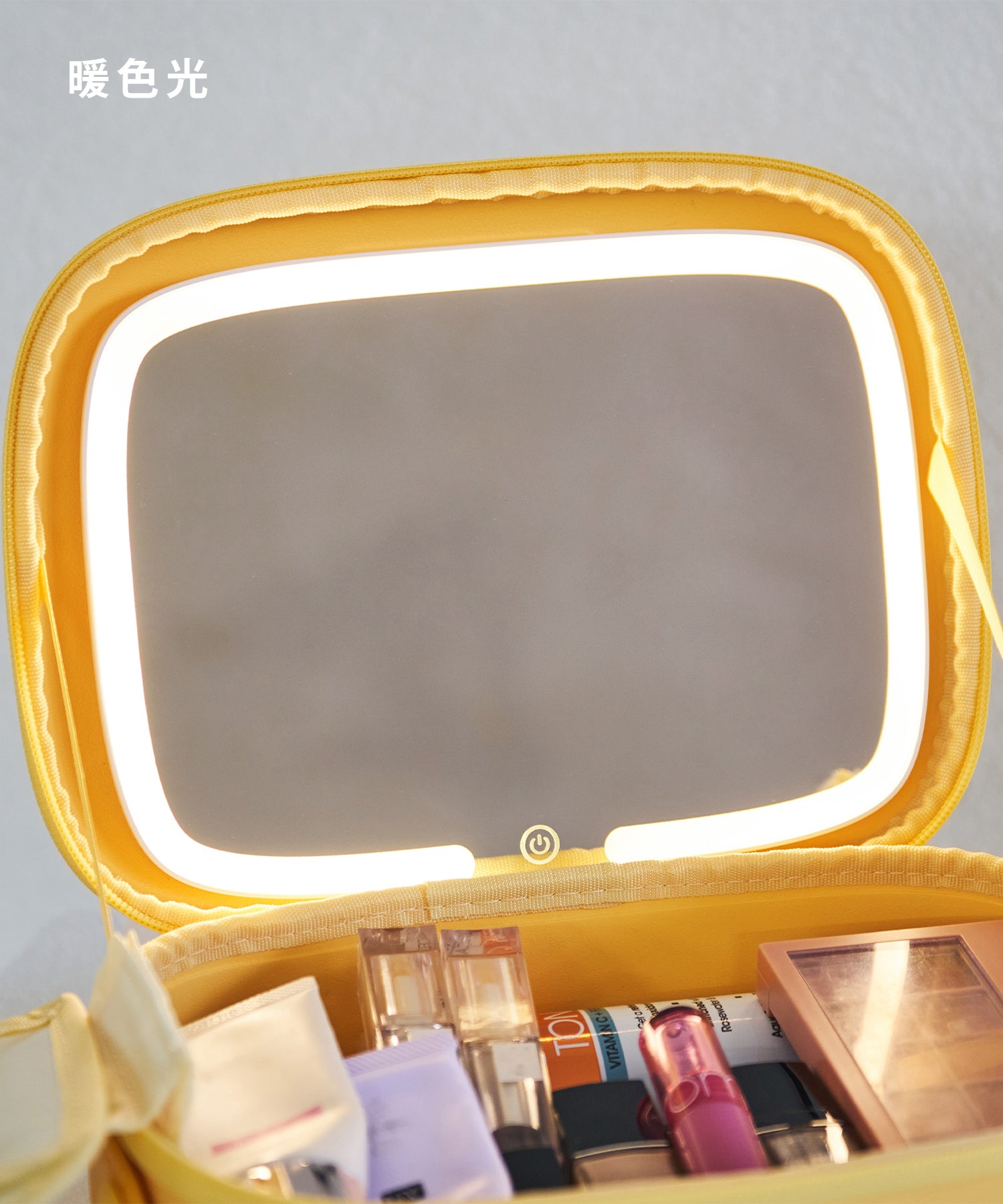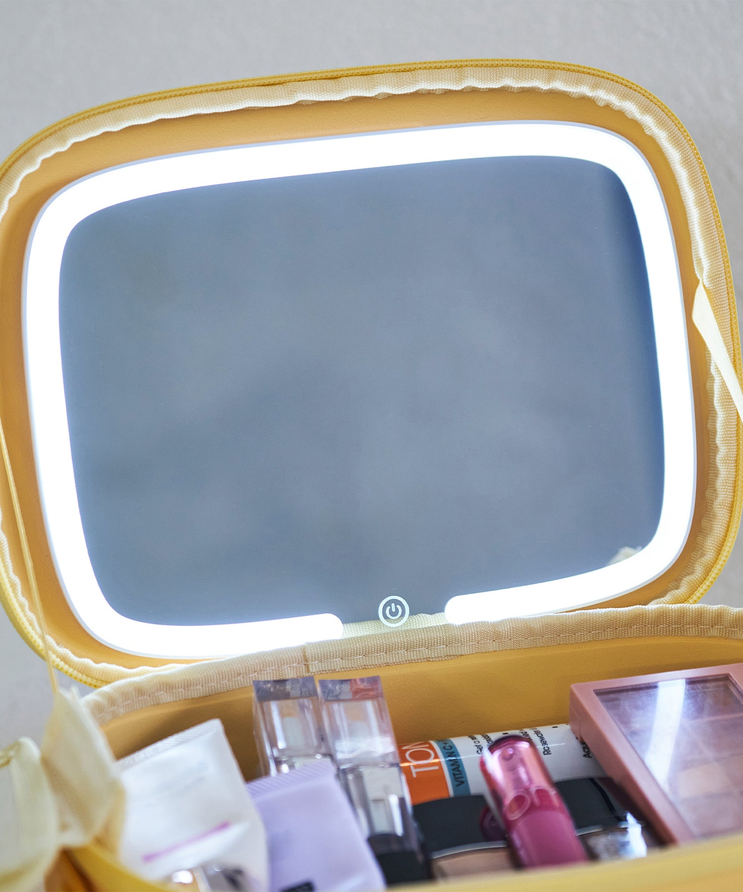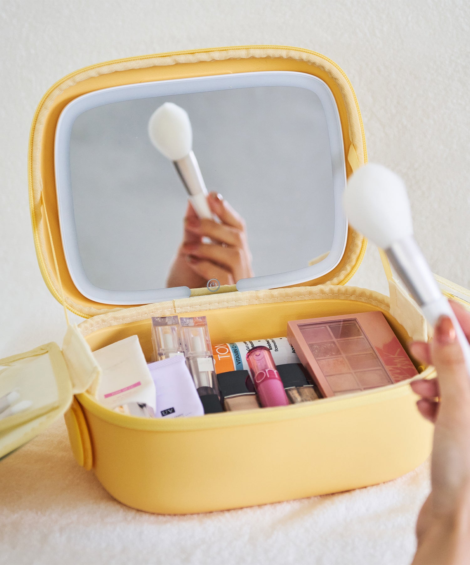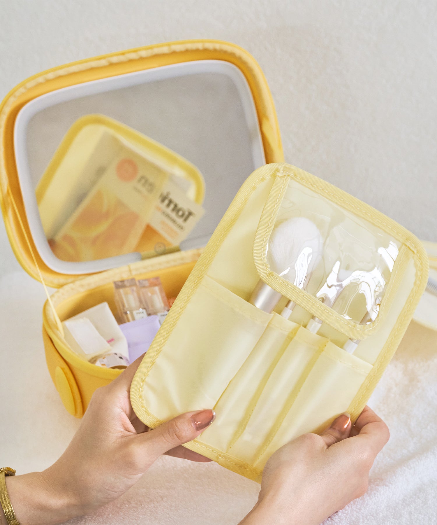 大きめのボトルやパレットアイテムもしっかり収納できる大容量ポーチは、コスメや基礎化粧品の収納にぴったり。ブラシが入る仕切り部分には汚れ防止の蓋が付いており、マジックテープで着脱可能な実用性の高さも嬉しい。内側にはUSB Type-Cで充電できるコードレスミラーライトがセットになっており、白色・暖色・昼白色の3段階での調整が可能。ハンドベルト付きなので持ち運びもしやすく、デイリー使いから旅行まで幅広く活躍するアイテム。カラーは柔らかい色味が大人可愛いブルー・グリーン・イエローの3色展開。EVA素材を使用しているのでとても軽く、汚れてしまっても水拭き可能でお手入れも簡単。