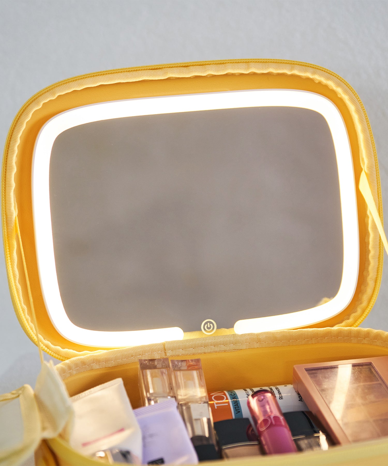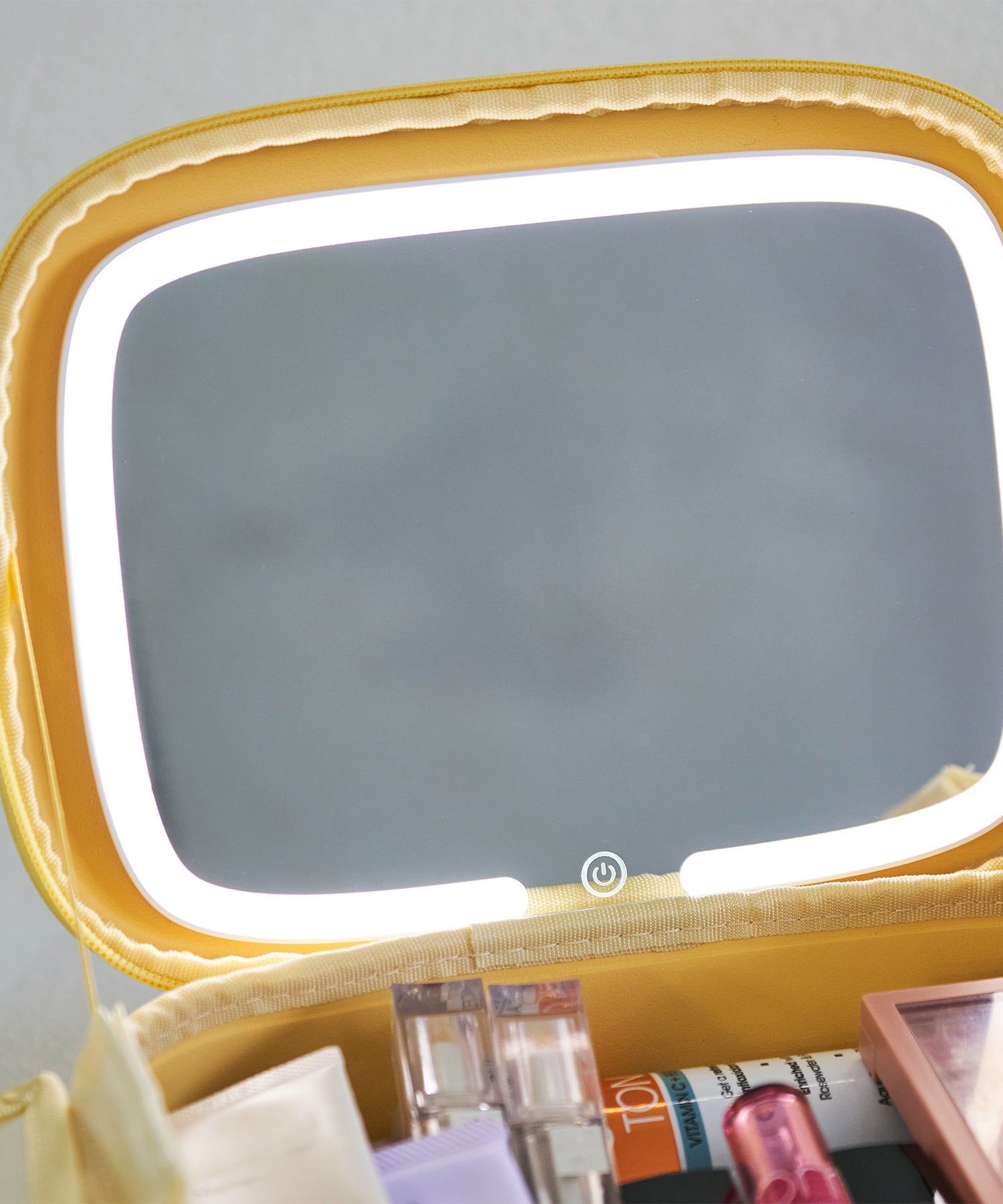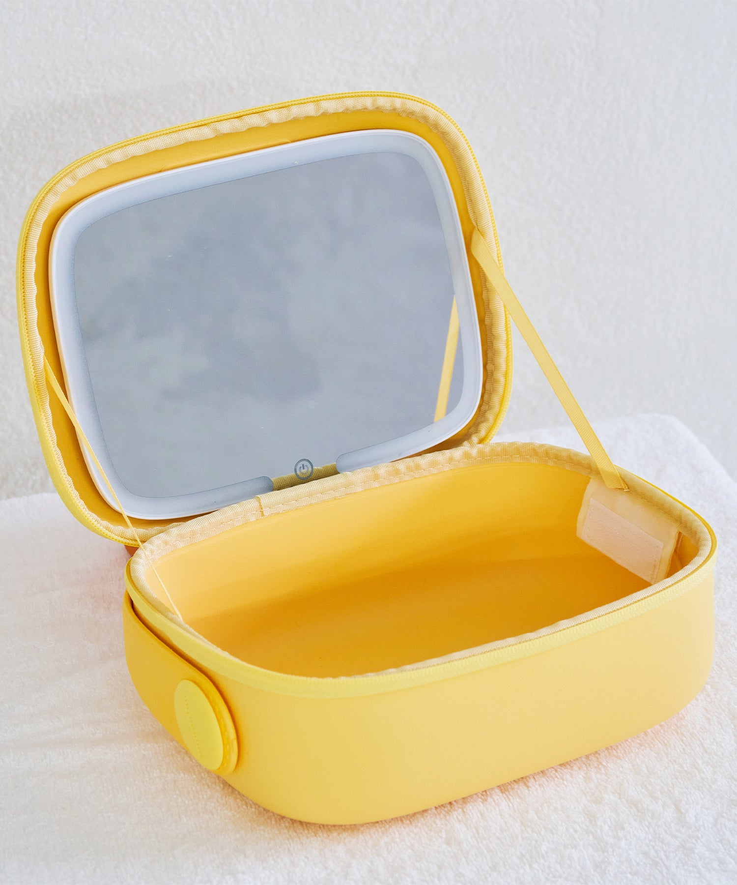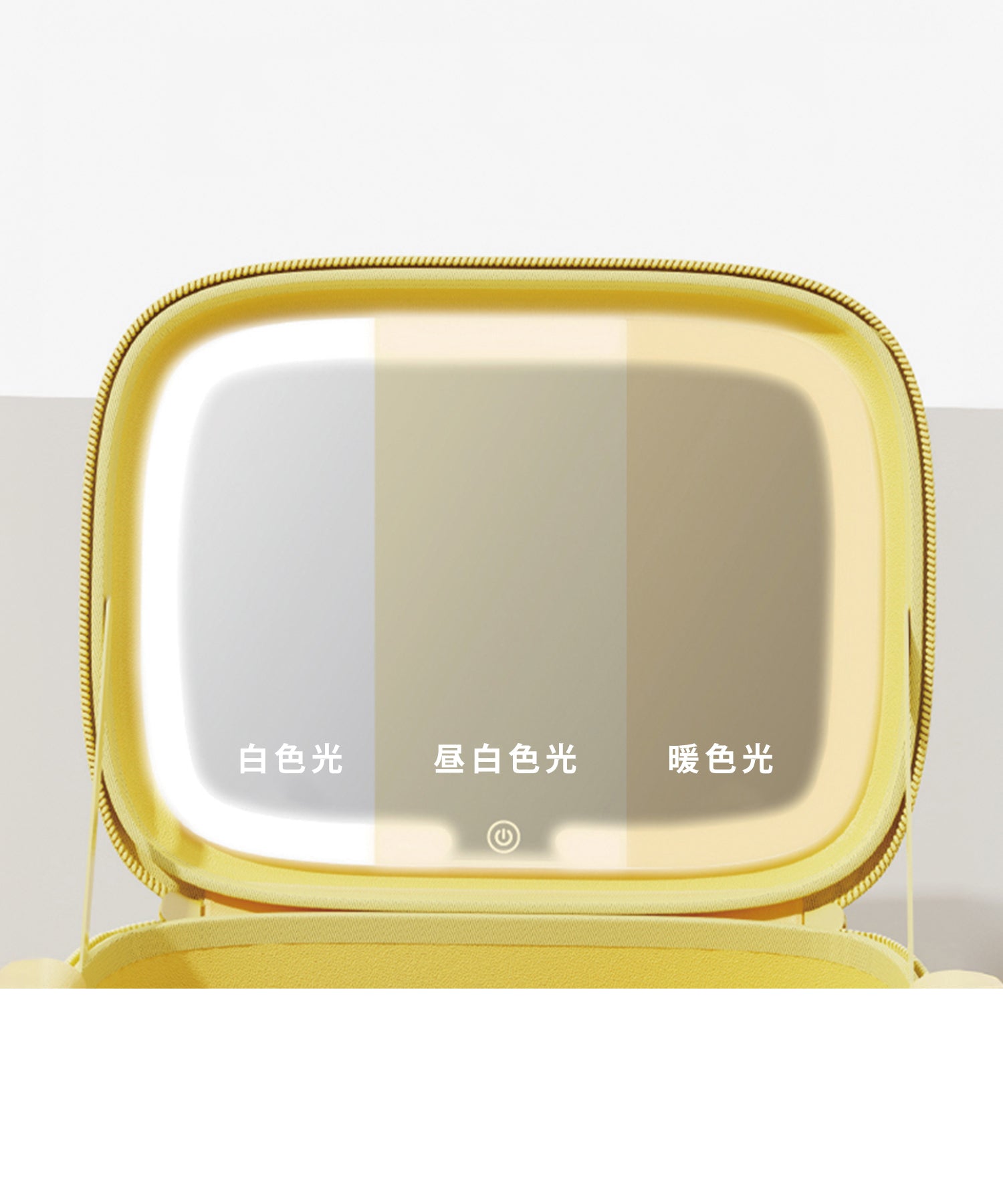 大きめのボトルやパレットアイテムもしっかり収納できる大容量ポーチは、コスメや基礎化粧品の収納にぴったり。ブラシが入る仕切り部分には汚れ防止の蓋が付いており、マジックテープで着脱可能な実用性の高さも嬉しい。内側にはUSB Type-Cで充電できるコードレスミラーライトがセットになっており、白色・暖色・昼白色の3段階での調整が可能。ハンドベルト付きなので持ち運びもしやすく、デイリー使いから旅行まで幅広く活躍するアイテム。カラーは柔らかい色味が大人可愛いブルー・グリーン・イエローの3色展開。EVA素材を使用しているのでとても軽く、汚れてしまっても水拭き可能でお手入れも簡単。