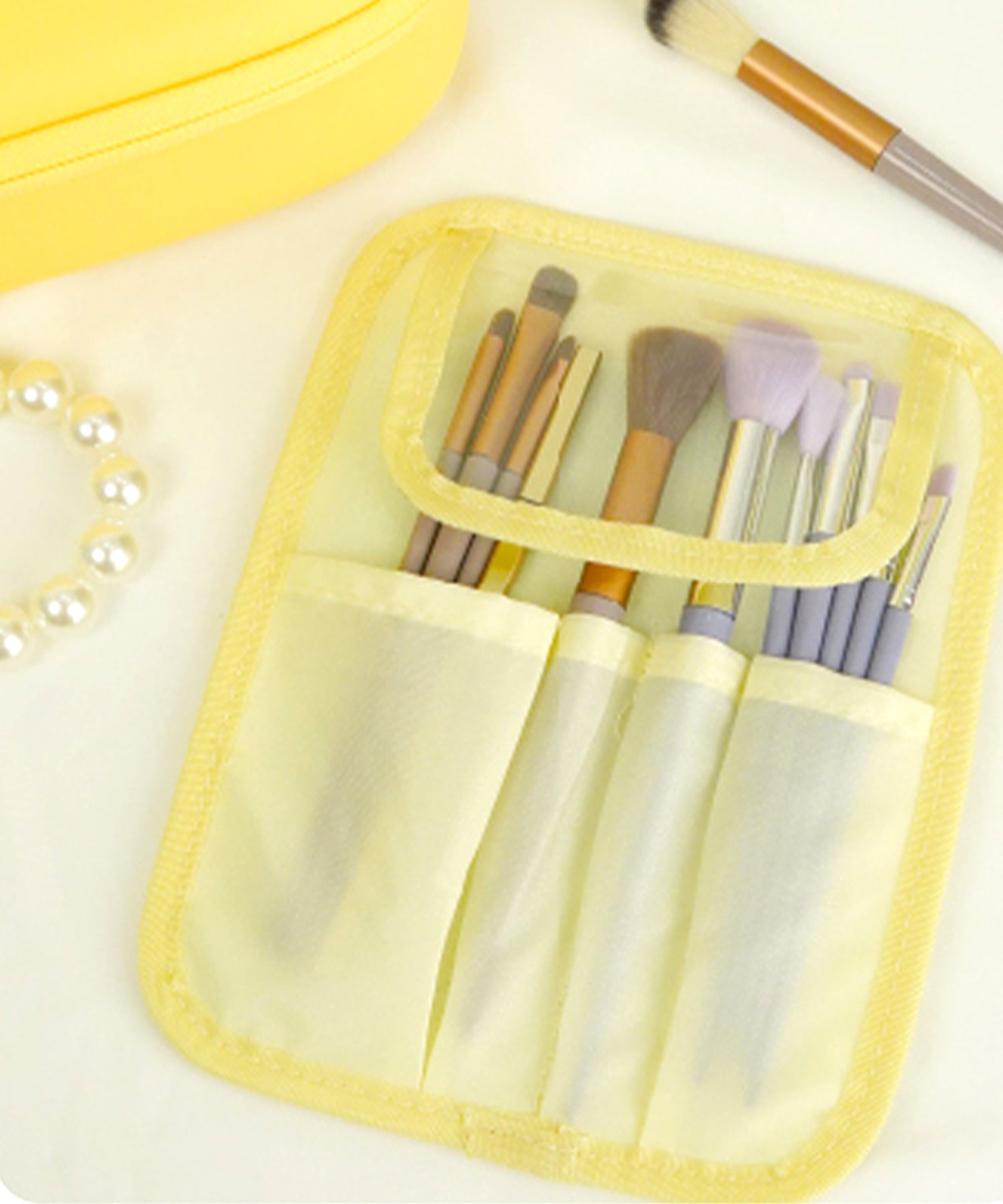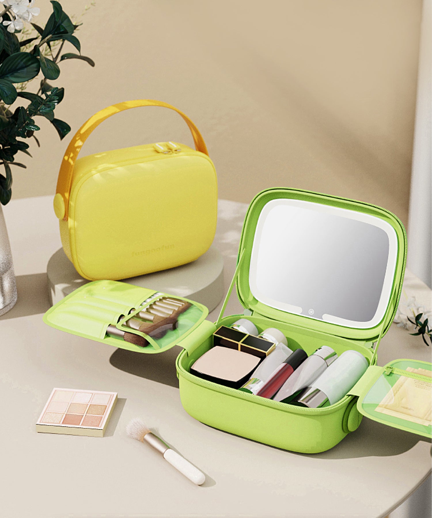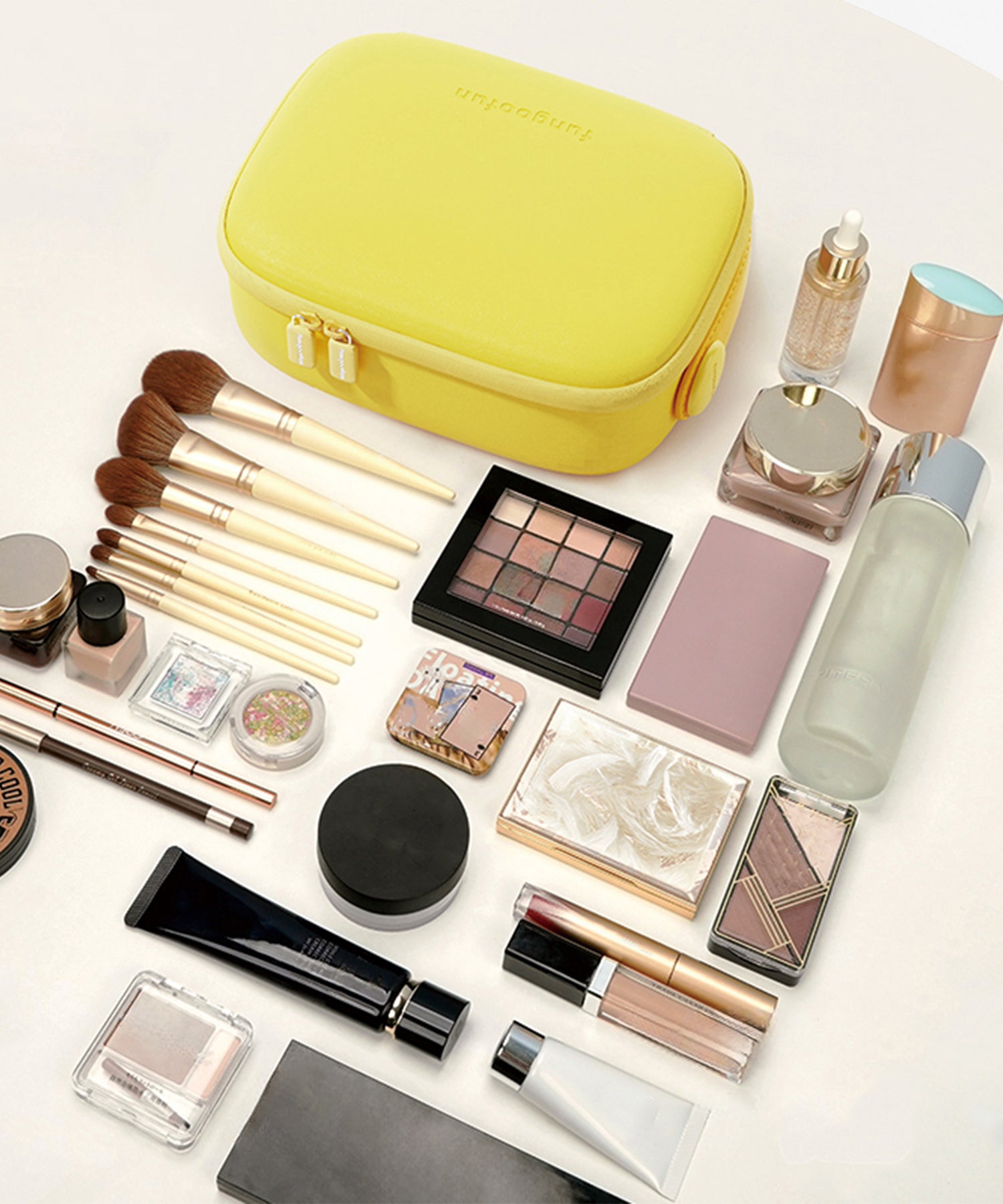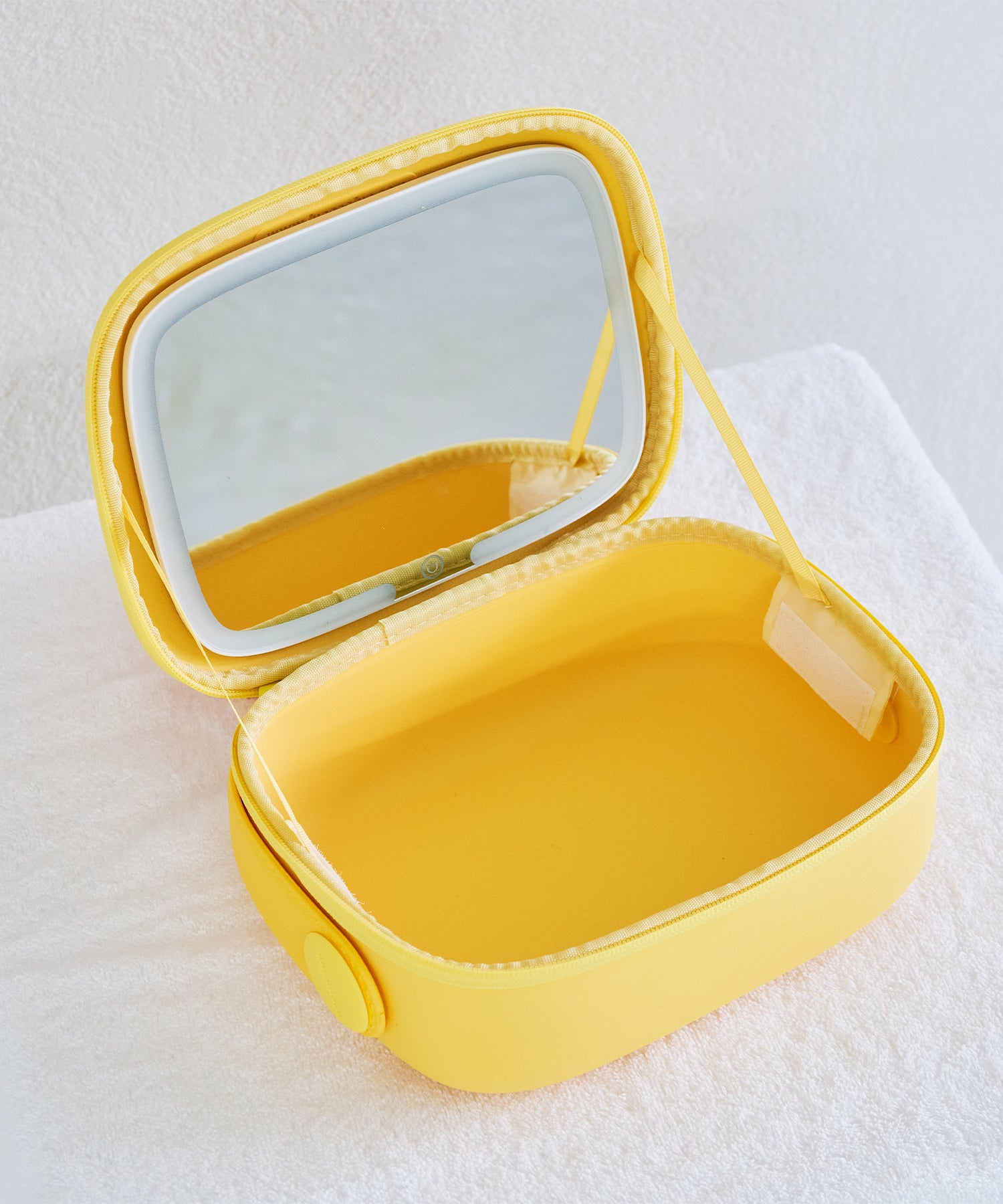 大きめのボトルやパレットアイテムもしっかり収納できる大容量ポーチは、コスメや基礎化粧品の収納にぴったり。ブラシが入る仕切り部分には汚れ防止の蓋が付いており、マジックテープで着脱可能な実用性の高さも嬉しい。内側にはUSB Type-Cで充電できるコードレスミラーライトがセットになっており、白色・暖色・昼白色の3段階での調整が可能。ハンドベルト付きなので持ち運びもしやすく、デイリー使いから旅行まで幅広く活躍するアイテム。カラーは柔らかい色味が大人可愛いブルー・グリーン・イエローの3色展開。EVA素材を使用しているのでとても軽く、汚れてしまっても水拭き可能でお手入れも簡単。