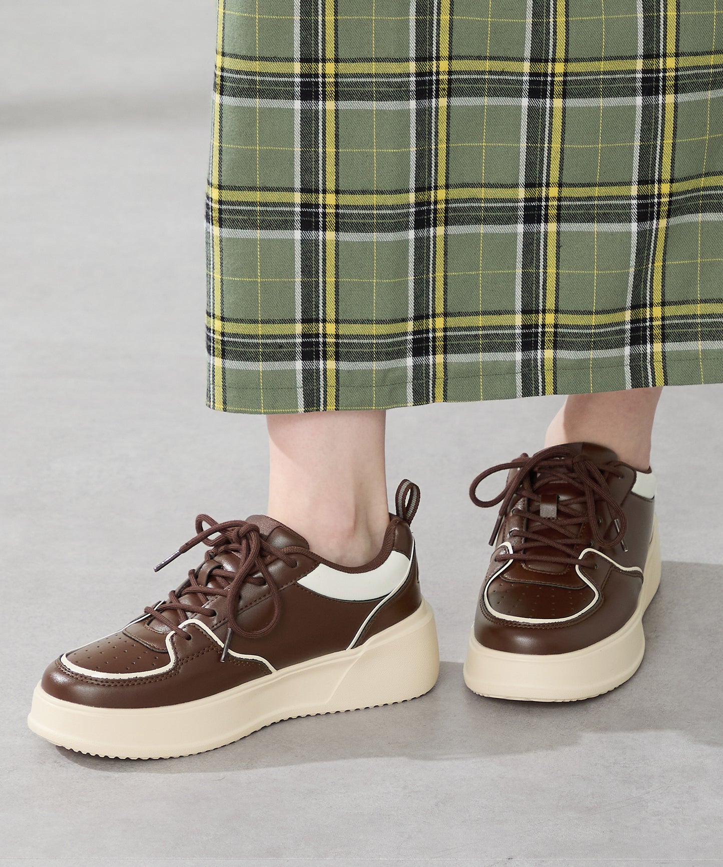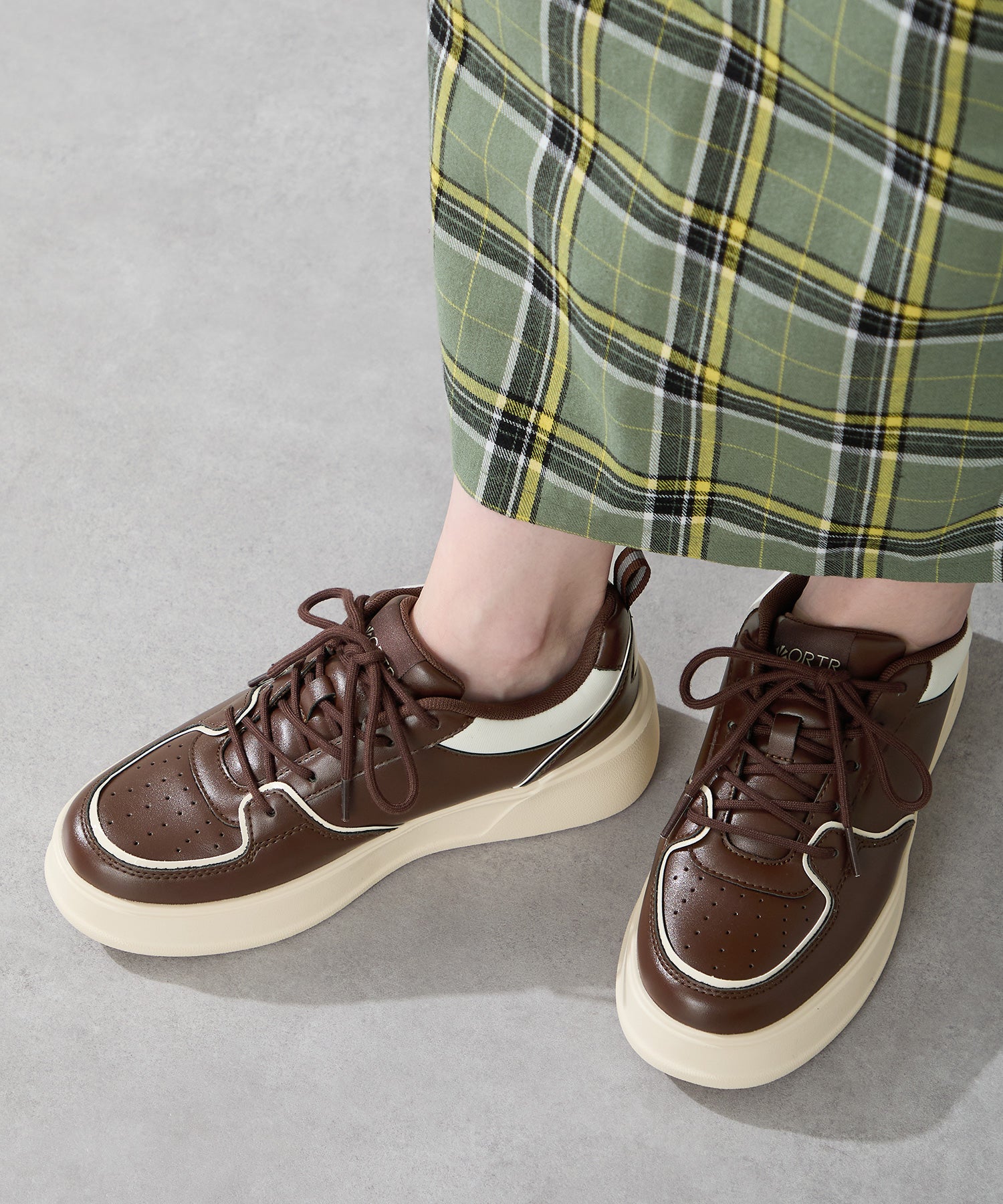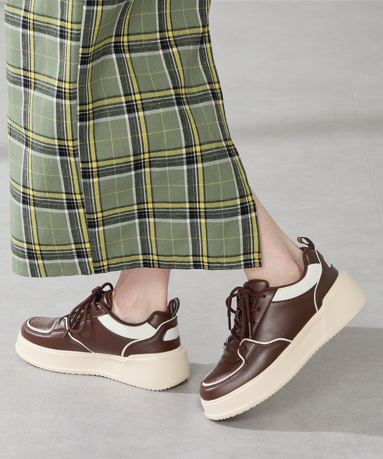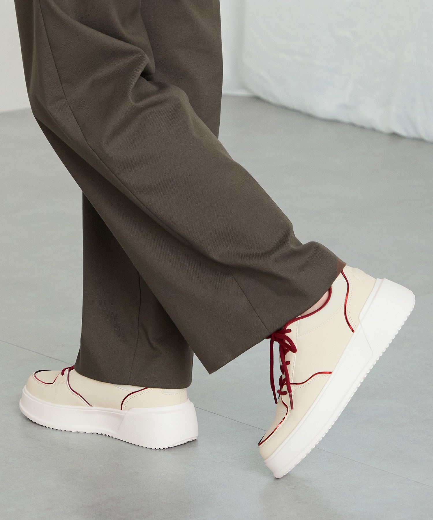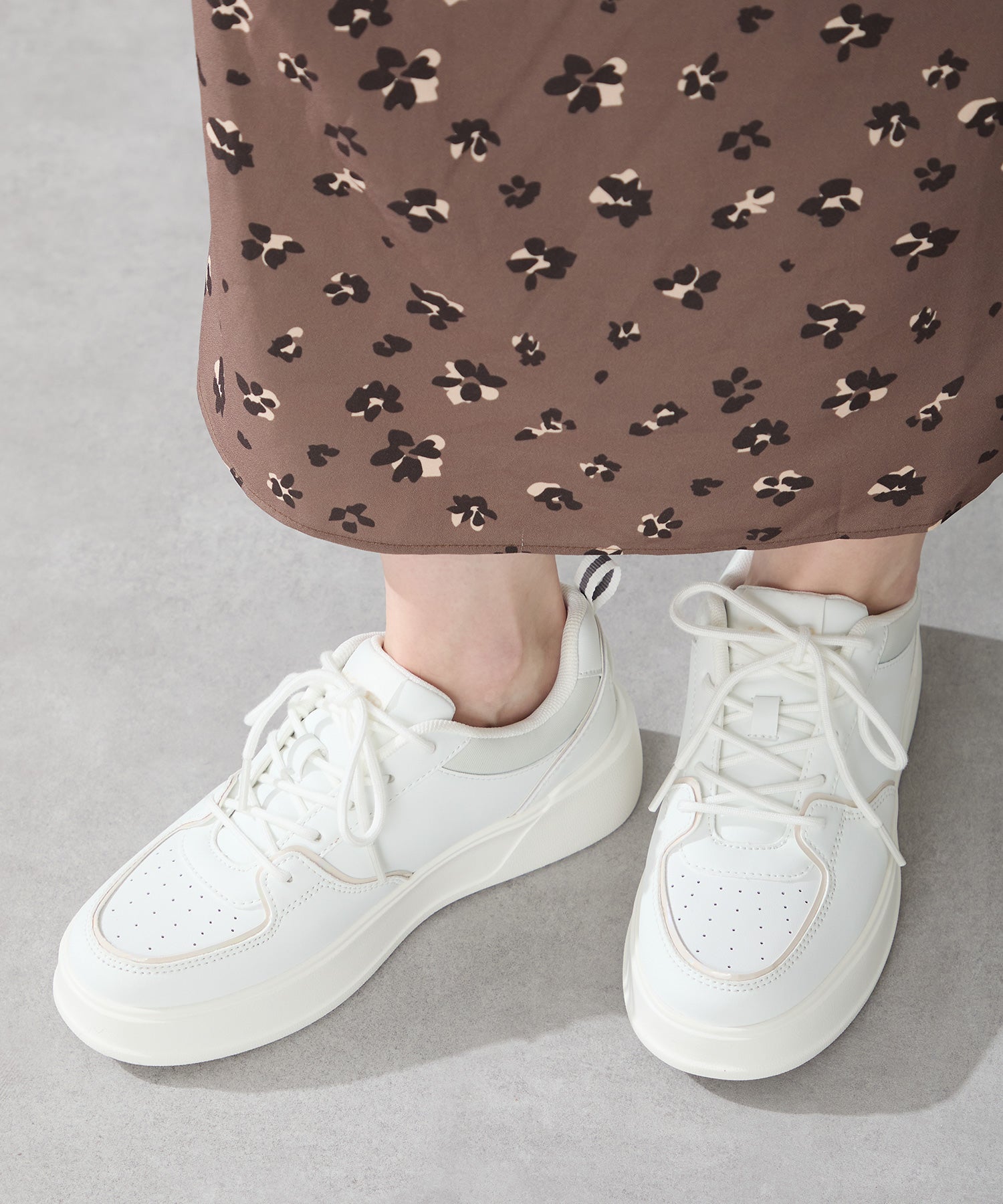 厚みのあるコートソールとパンチングデザインの組み合わせが今っぽいカジュアルなスニーカーは、厚底ながらもすっきりとしたソールで女性らしい柔らかい雰囲気を纏った仕上がりに。さりげないバイカラーのデザインが可愛いブラックとレッド、ワントーンでまとめることでコーデを選ばす履けるホワイト、新色のブラウンの豊富な選べる4色展開。
