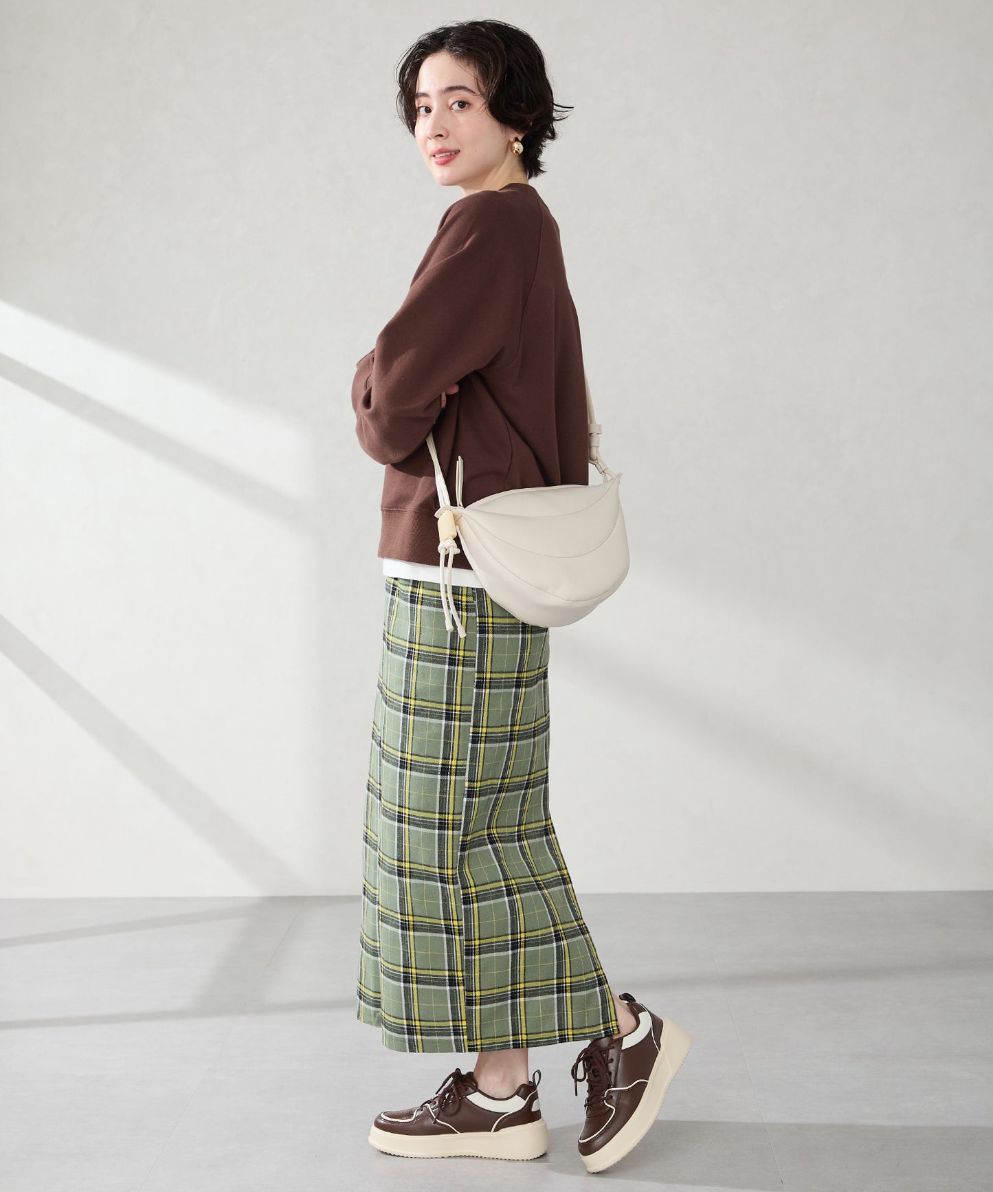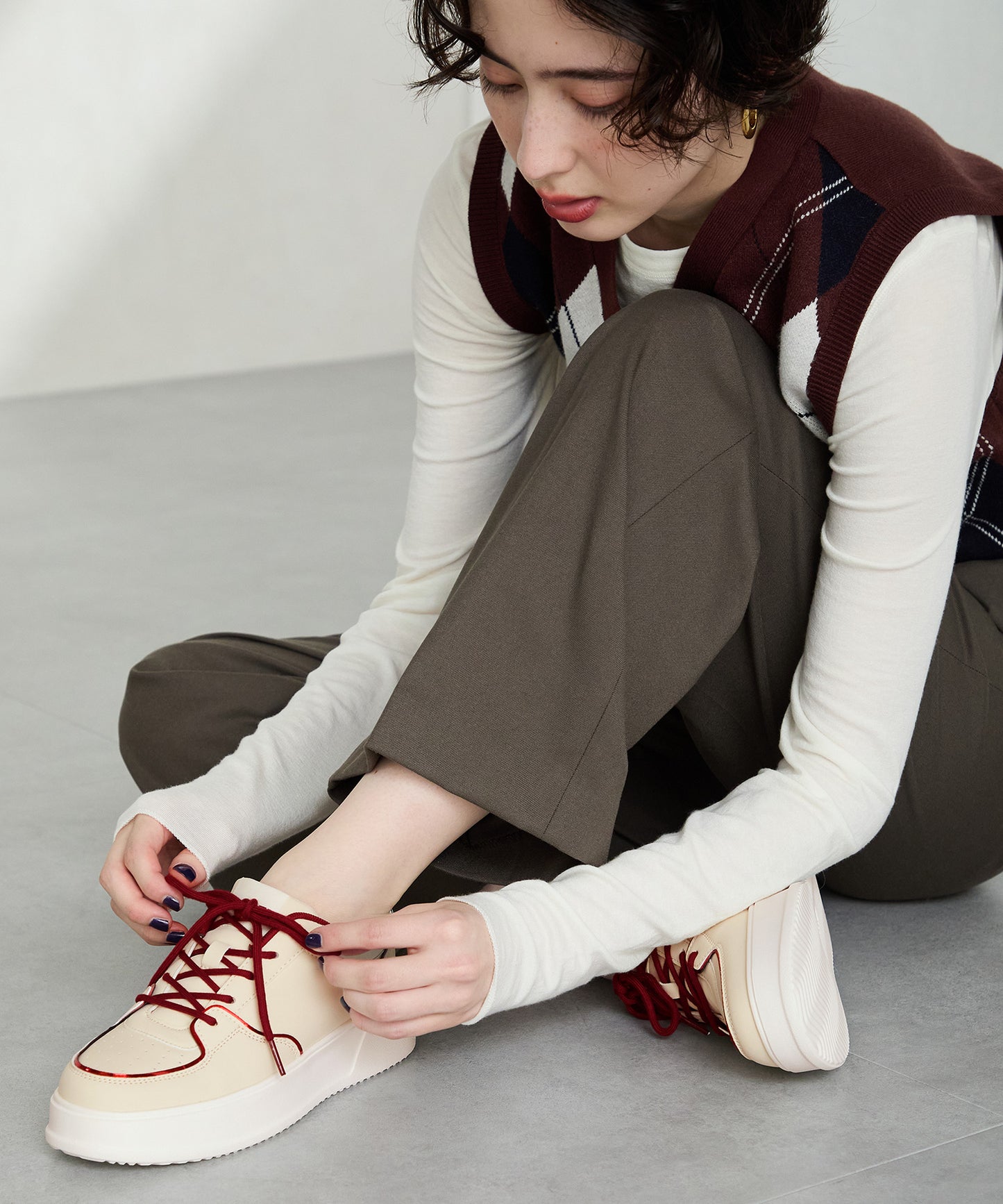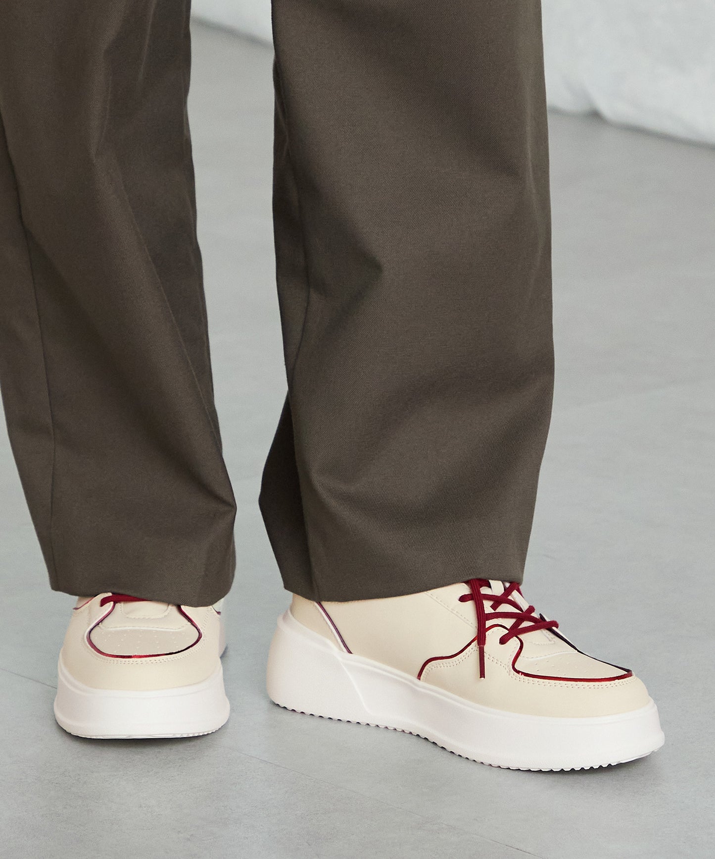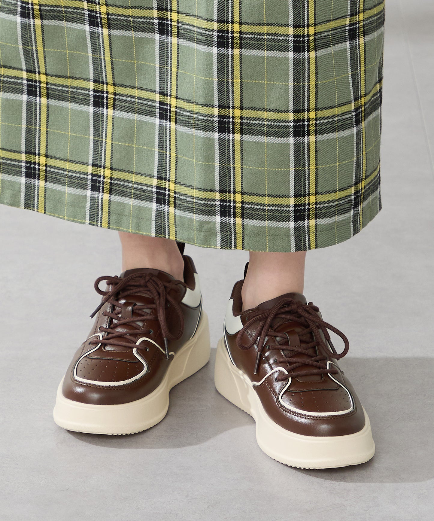 厚みのあるコートソールとパンチングデザインの組み合わせが今っぽいカジュアルなスニーカーは、厚底ながらもすっきりとしたソールで女性らしい柔らかい雰囲気を纏った仕上がりに。さりげないバイカラーのデザインが可愛いブラックとレッド、ワントーンでまとめることでコーデを選ばす履けるホワイト、新色のブラウンの豊富な選べる4色展開。