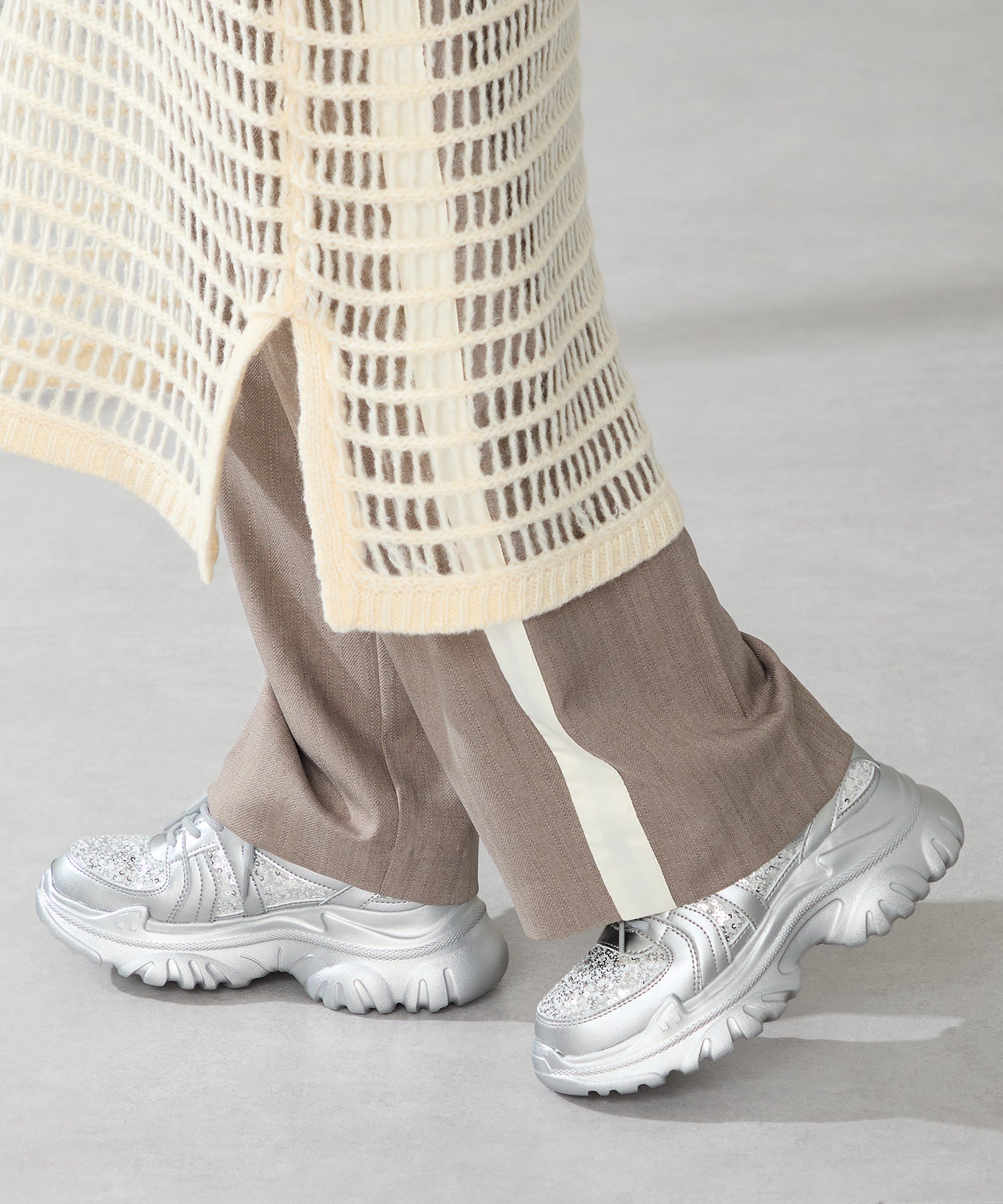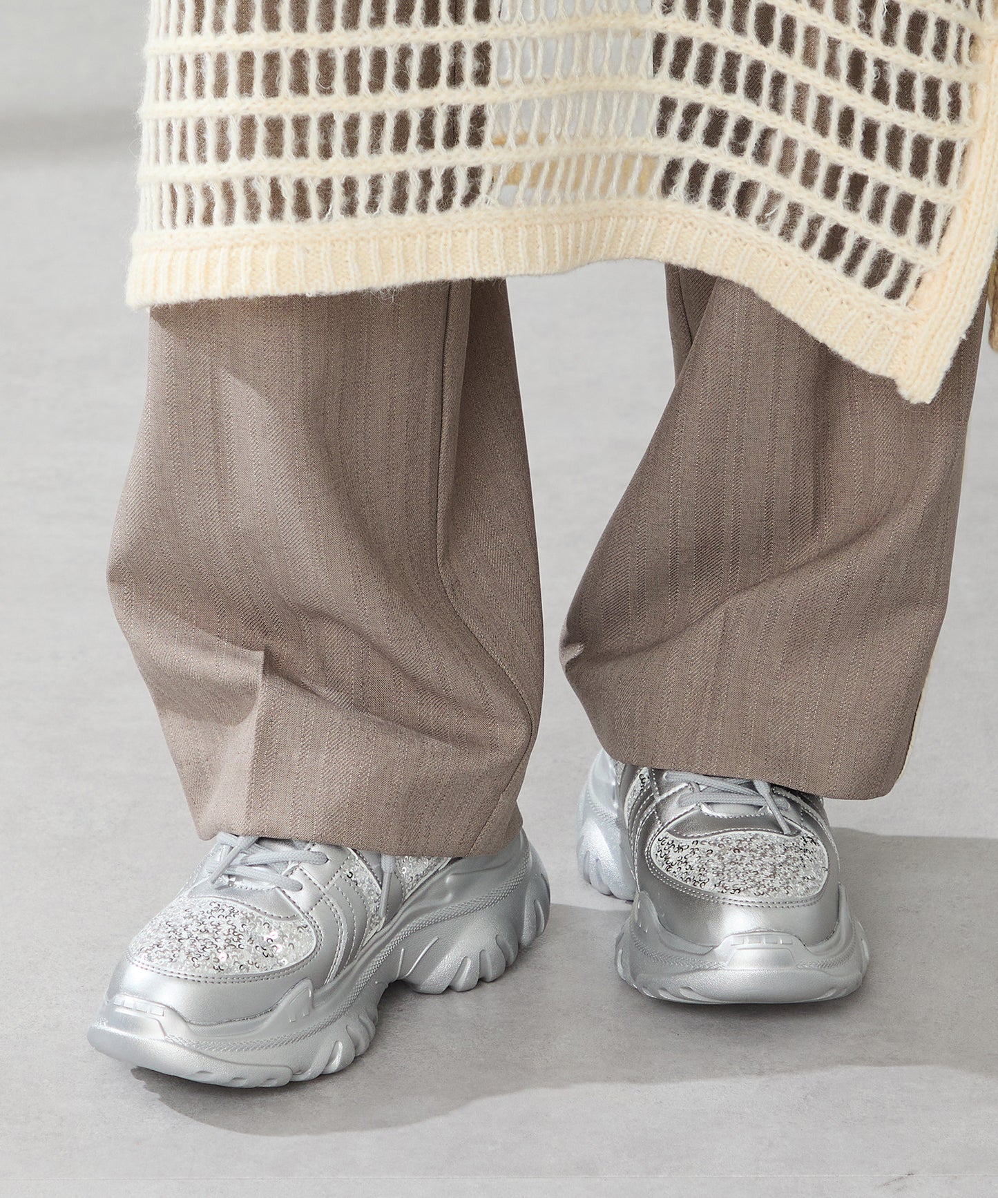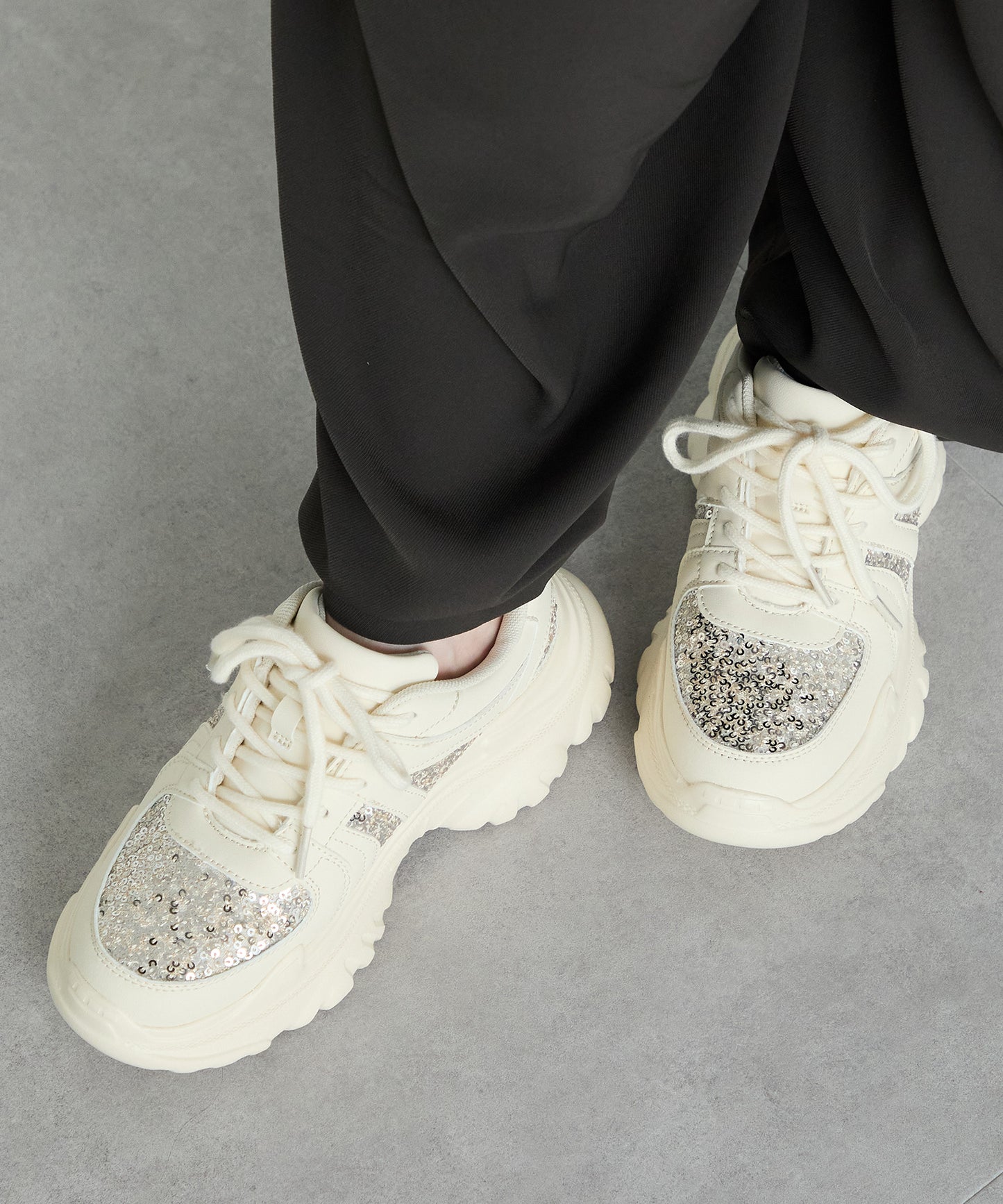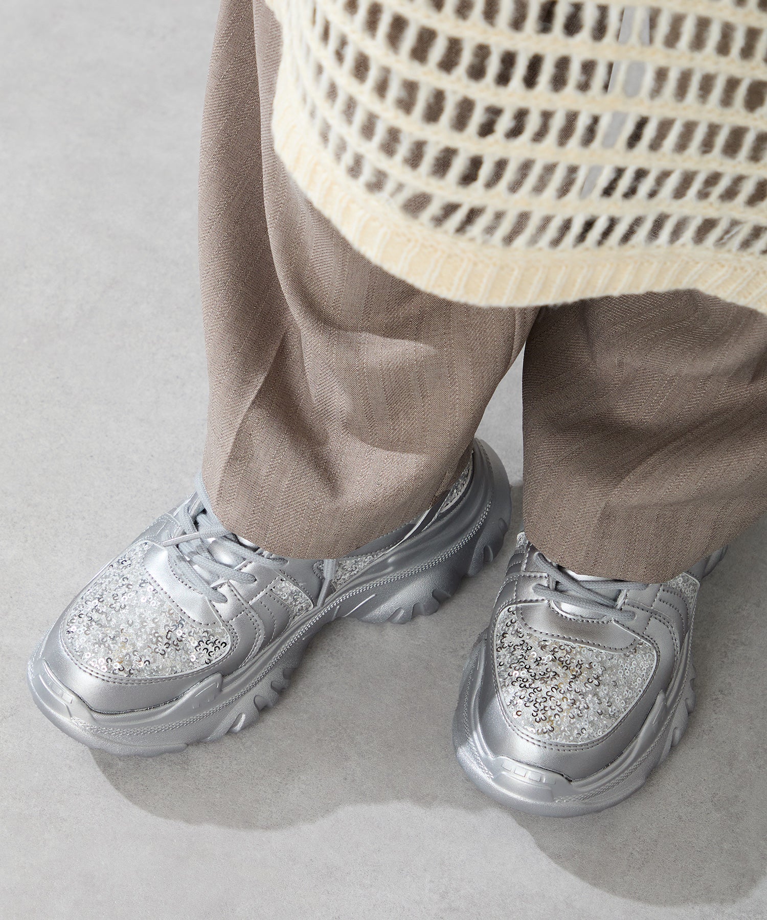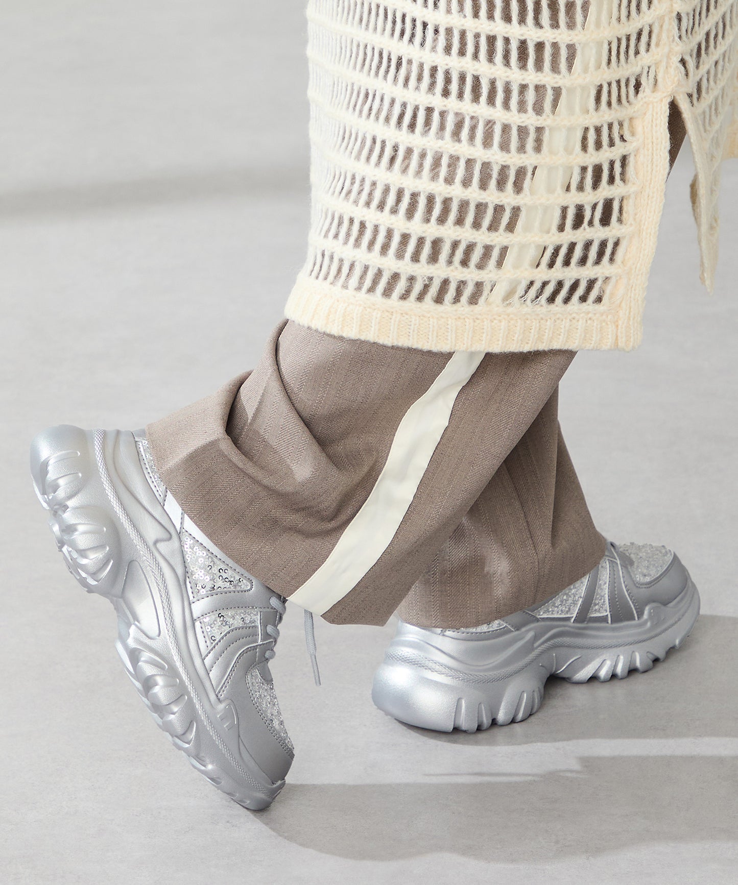 キラキラとしたスパンコールを敷き詰めたアッパーが目を引くスニーカーはあえて厚底ソールを組み合わせてエレガンスになり過ぎずカジュアル要素とのバランスも◎。中敷のクッションは厚みと弾力があり足裏への負担が少ないのも嬉しいポイント。今期も注目のシルバーはソールもメタリックカラーなのが新鮮でコーデの主役にして楽しんで。