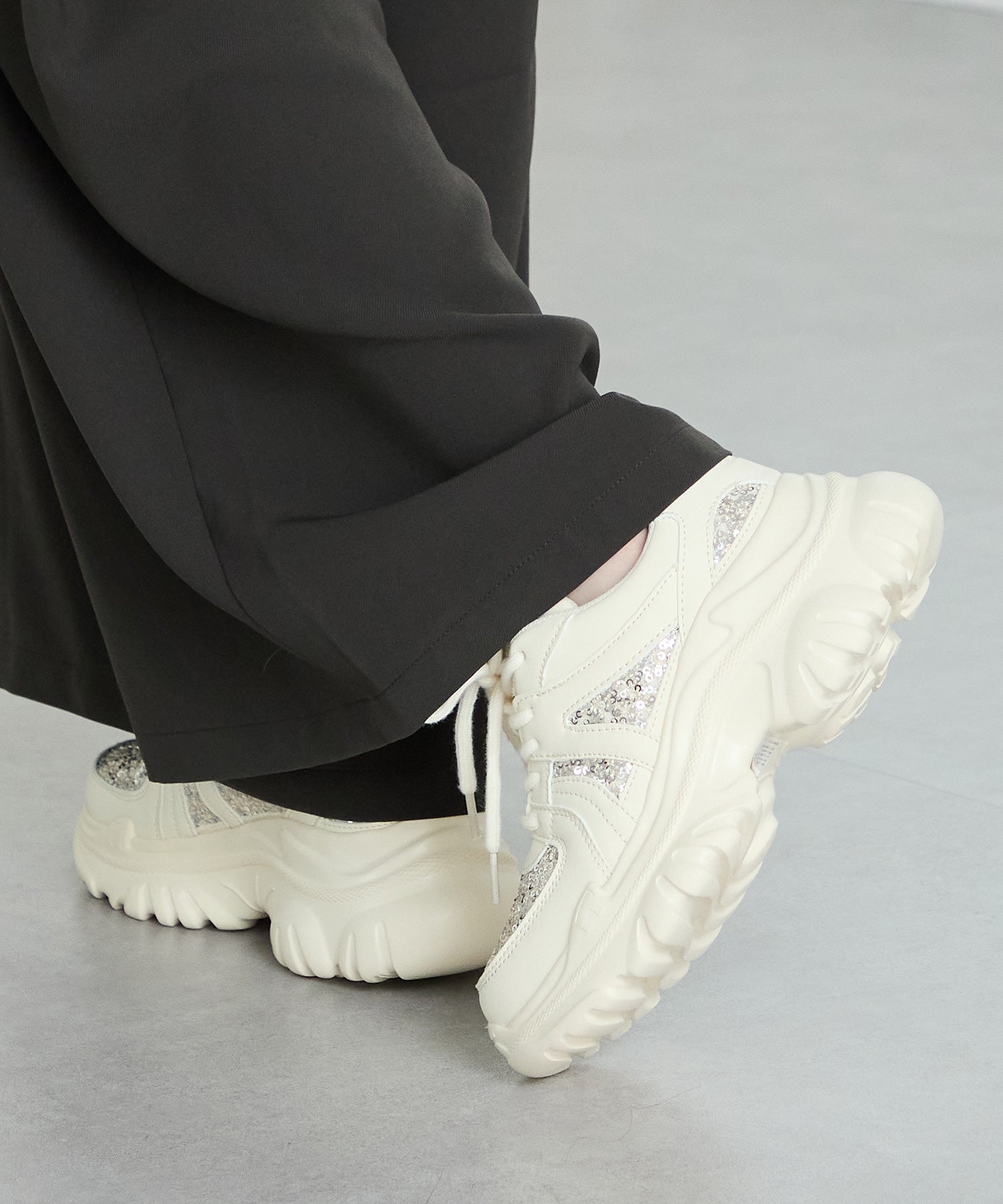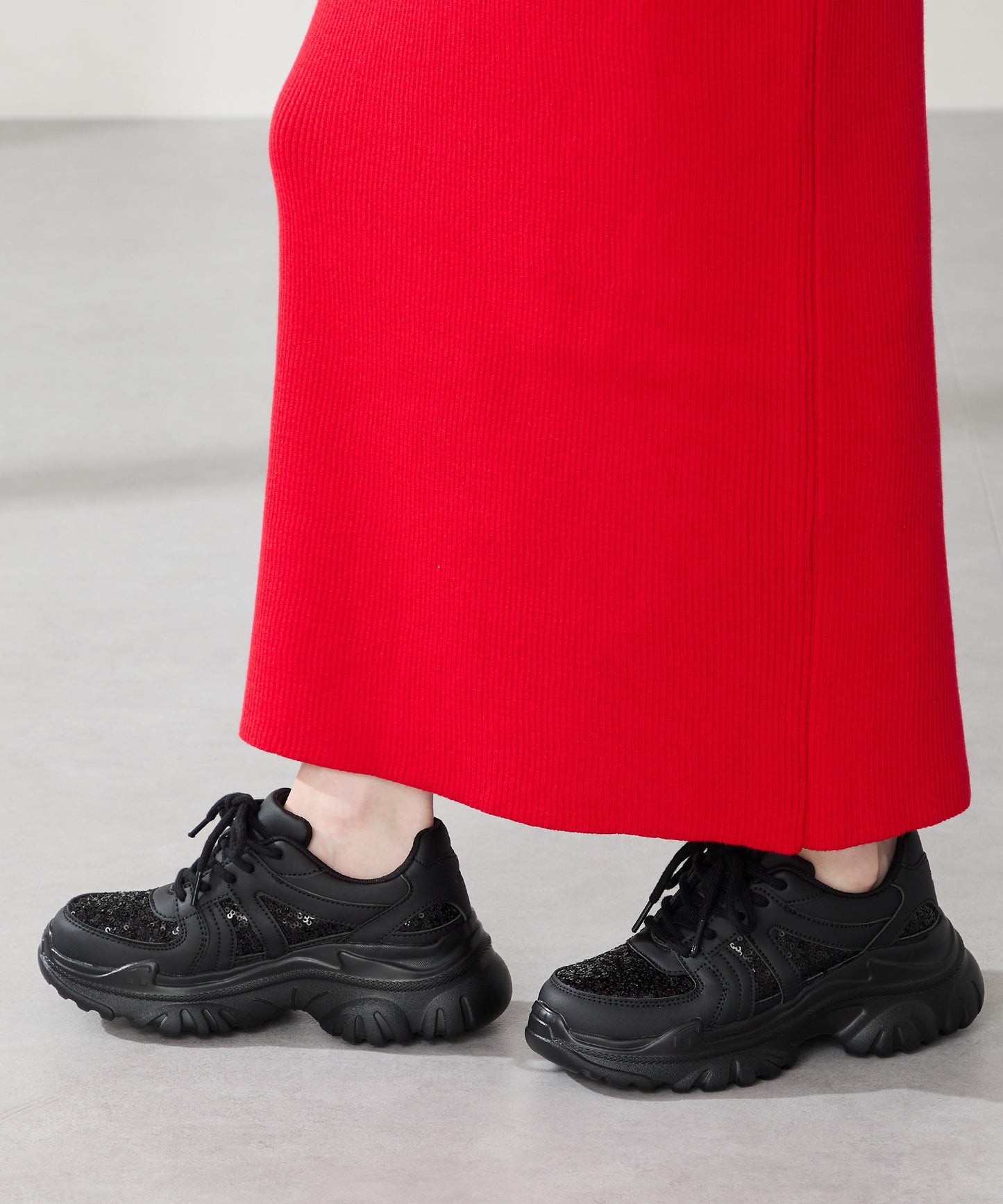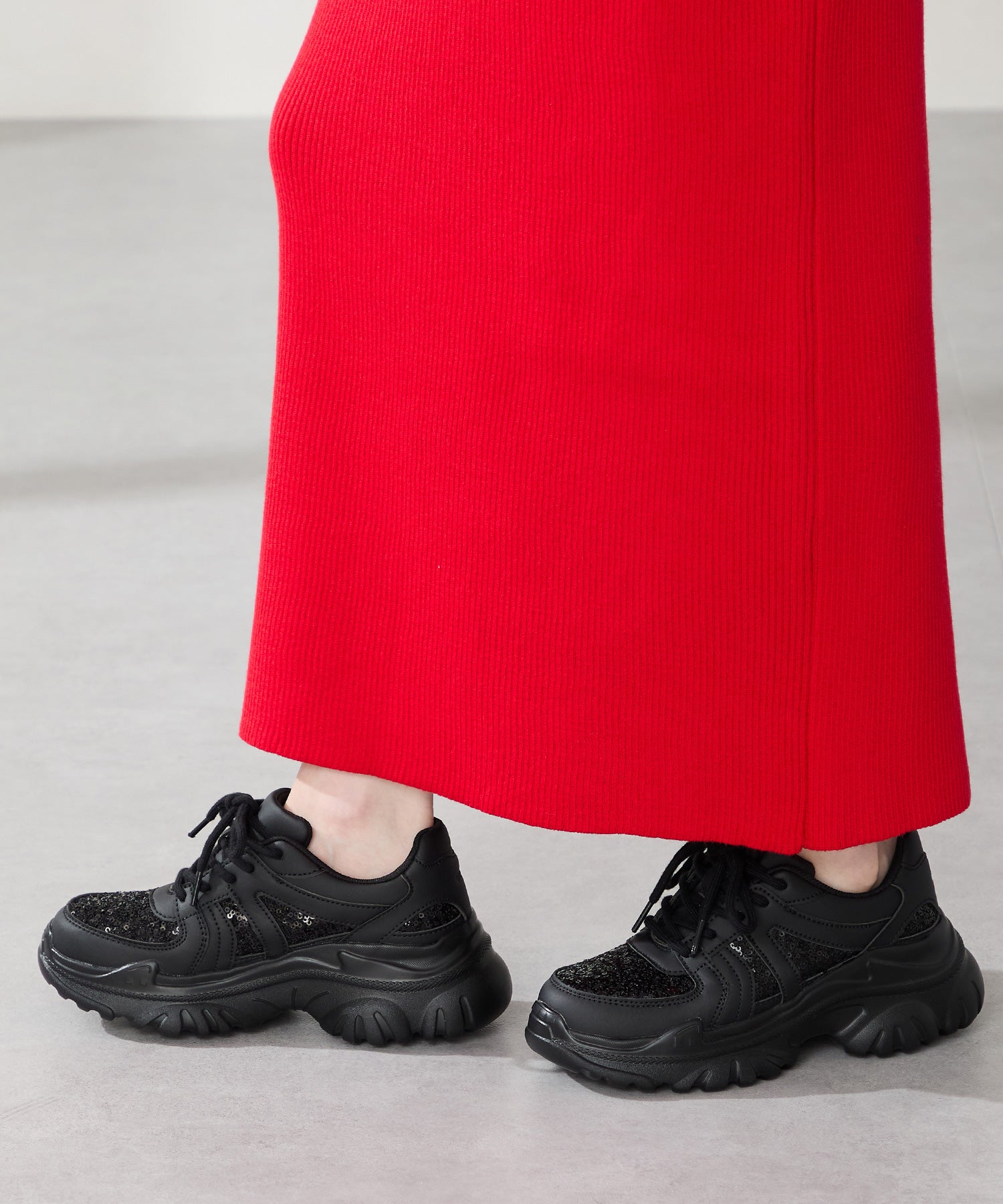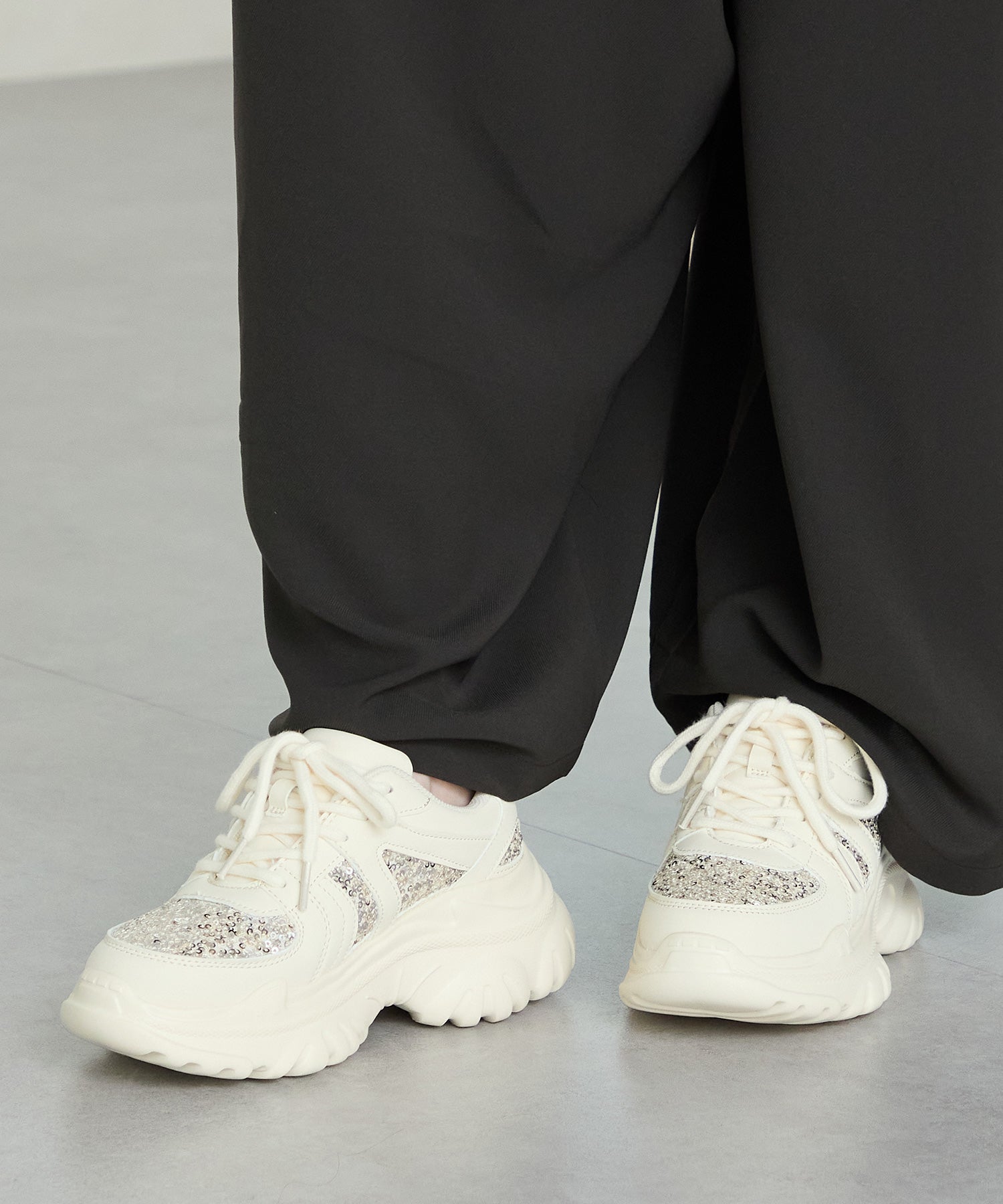 キラキラとしたスパンコールを敷き詰めたアッパーが目を引くスニーカーはあえて厚底ソールを組み合わせてエレガンスになり過ぎずカジュアル要素とのバランスも◎。中敷のクッションは厚みと弾力があり足裏への負担が少ないのも嬉しいポイント。今期も注目のシルバーはソールもメタリックカラーなのが新鮮でコーデの主役にして楽しんで。