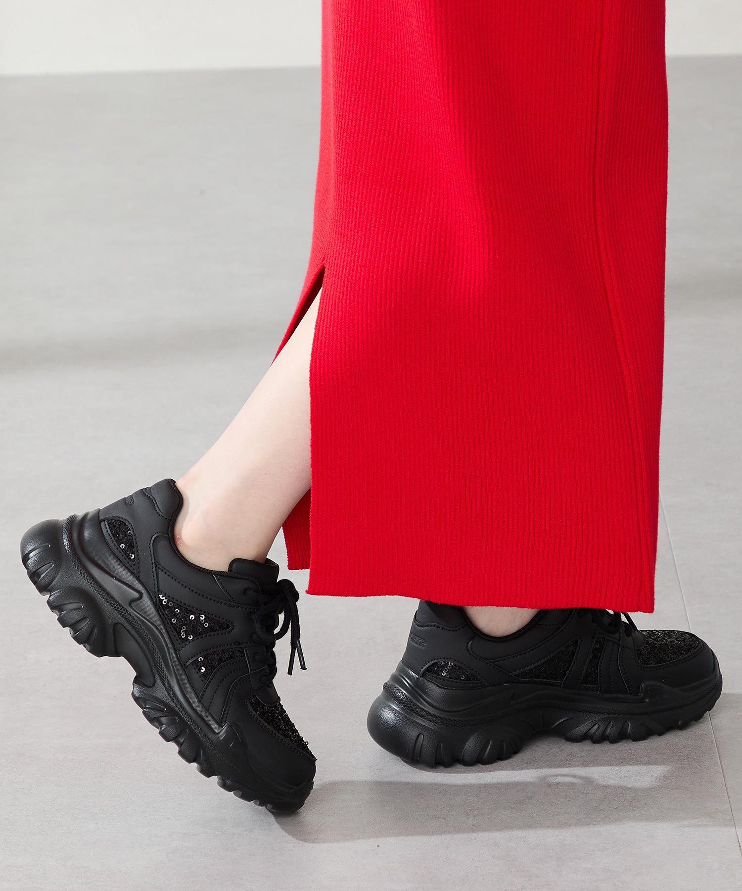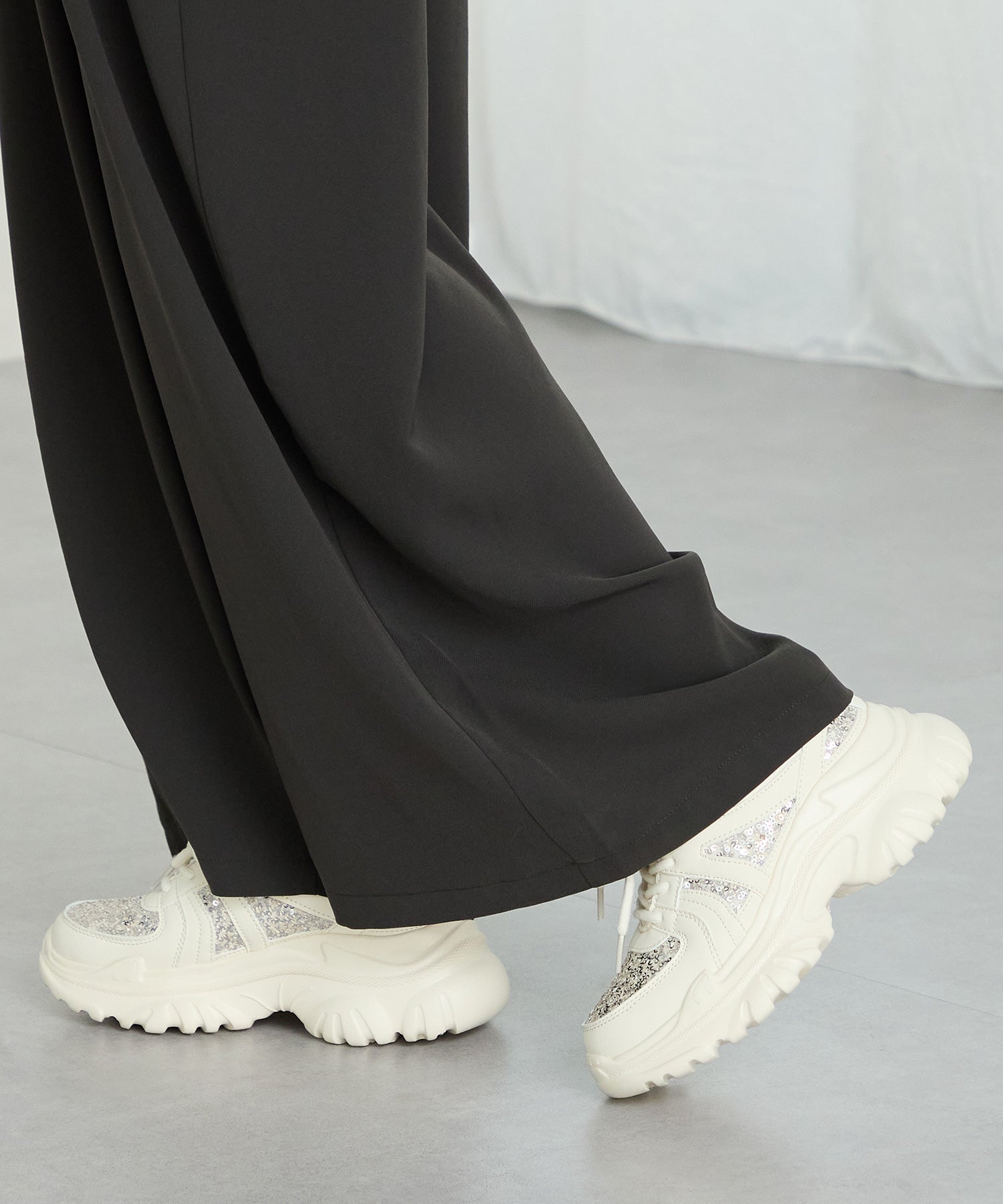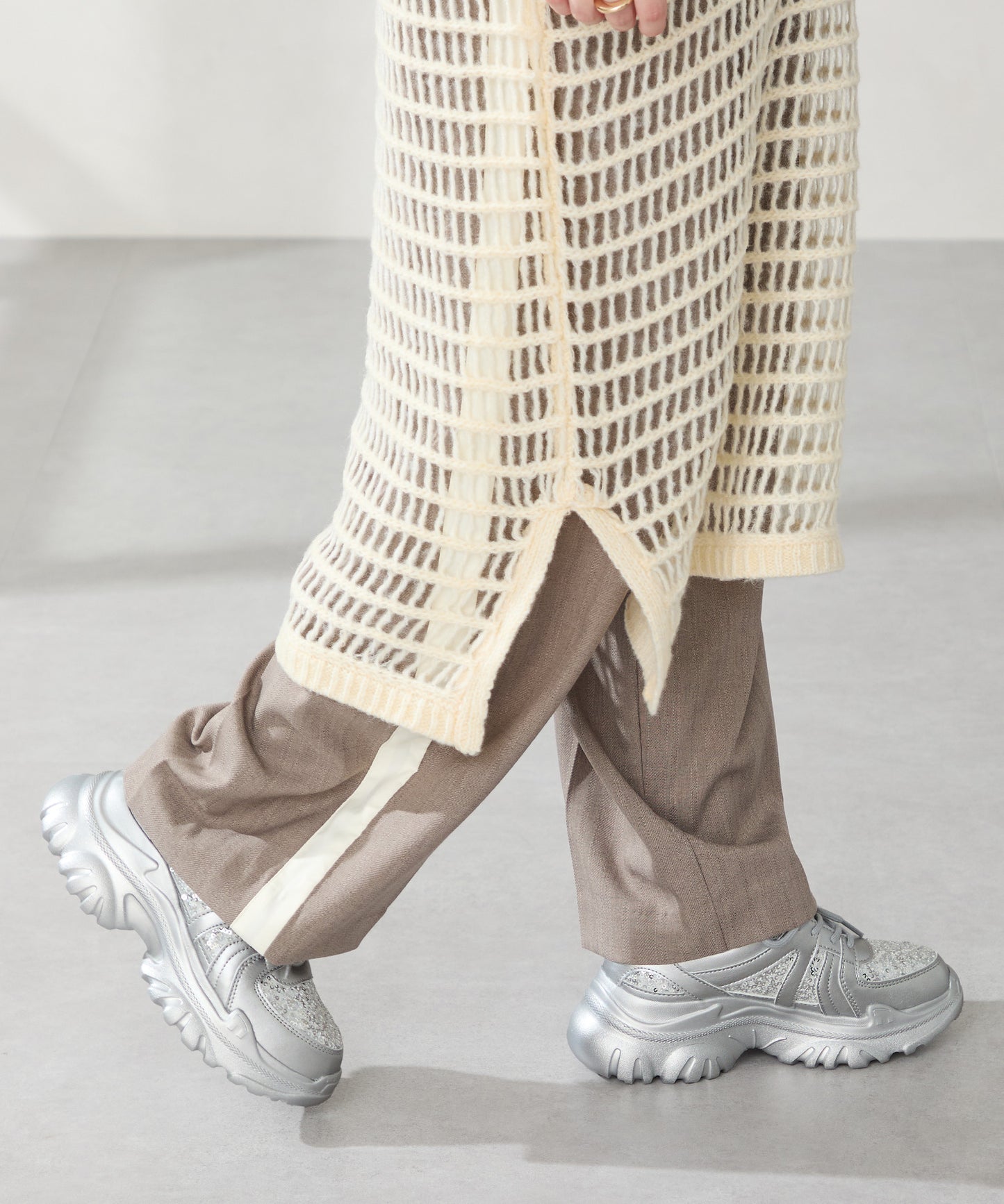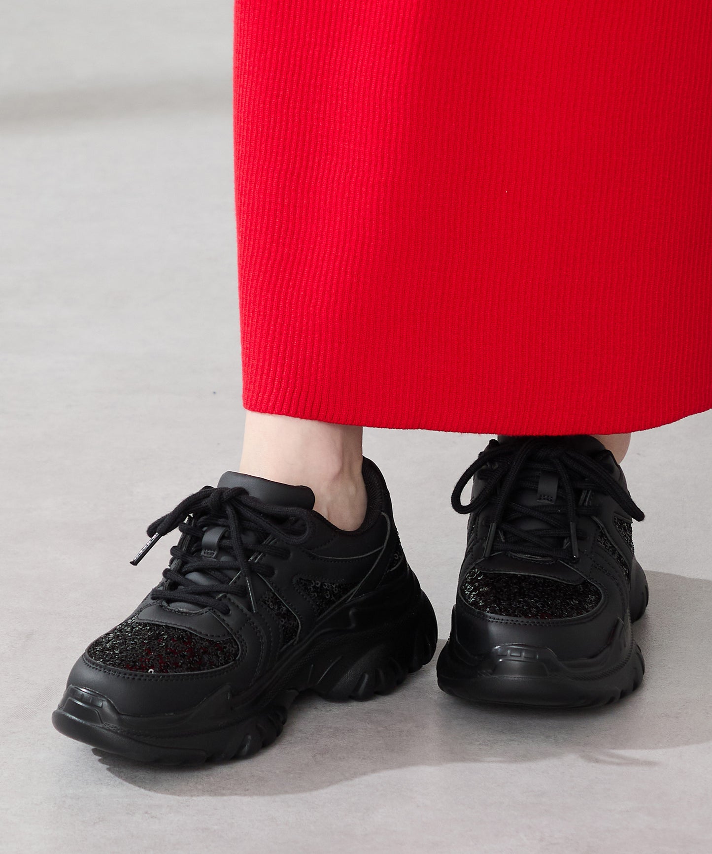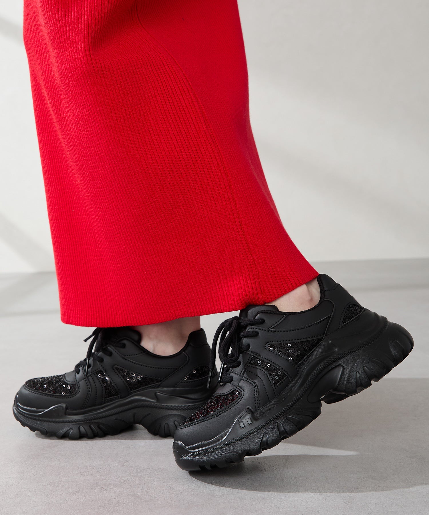 キラキラとしたスパンコールを敷き詰めたアッパーが目を引くスニーカーはあえて厚底ソールを組み合わせてエレガンスになり過ぎずカジュアル要素とのバランスも◎。中敷のクッションは厚みと弾力があり足裏への負担が少ないのも嬉しいポイント。今期も注目のシルバーはソールもメタリックカラーなのが新鮮でコーデの主役にして楽しんで。