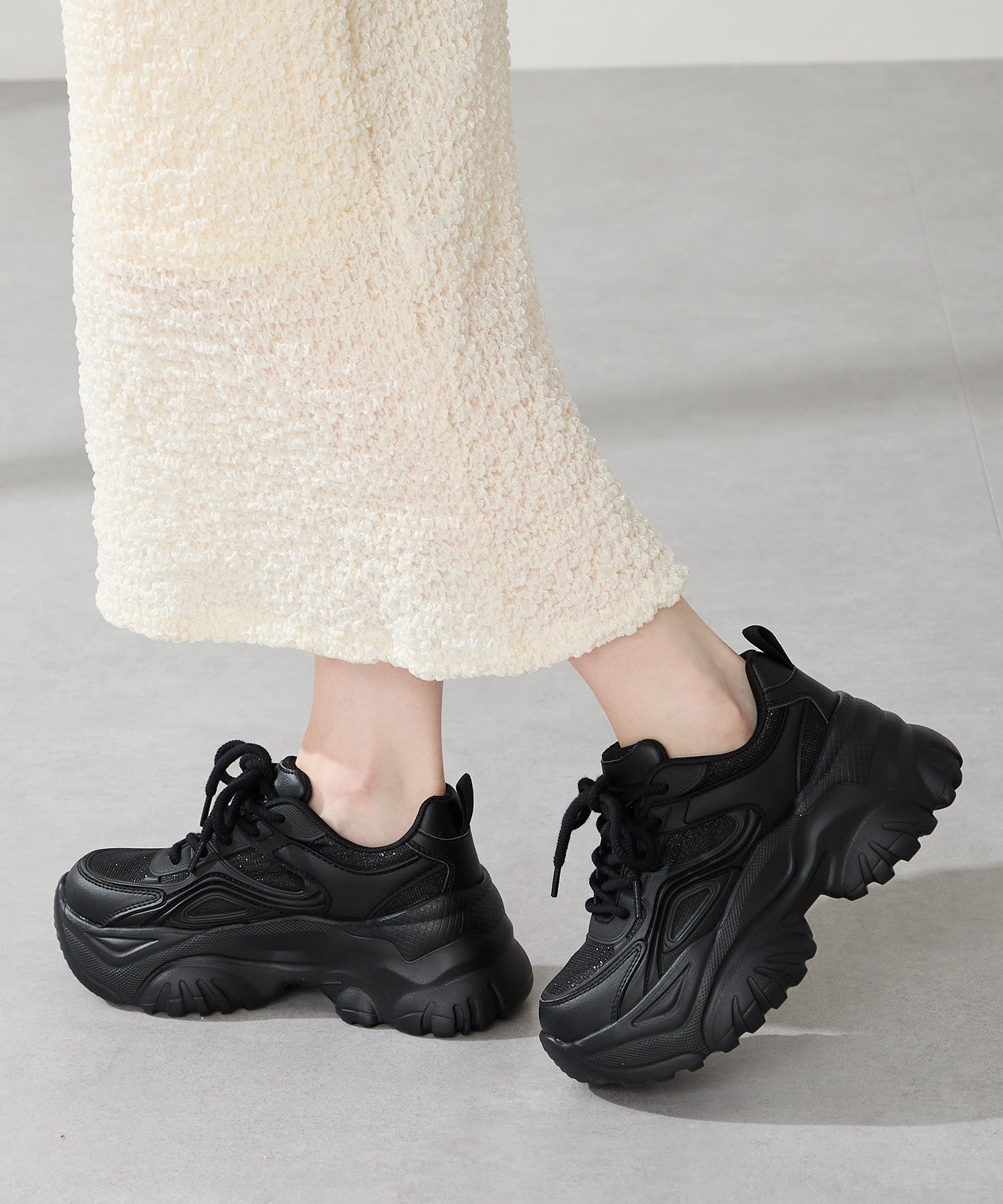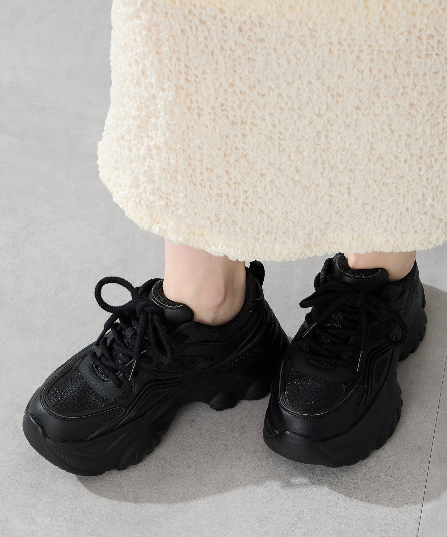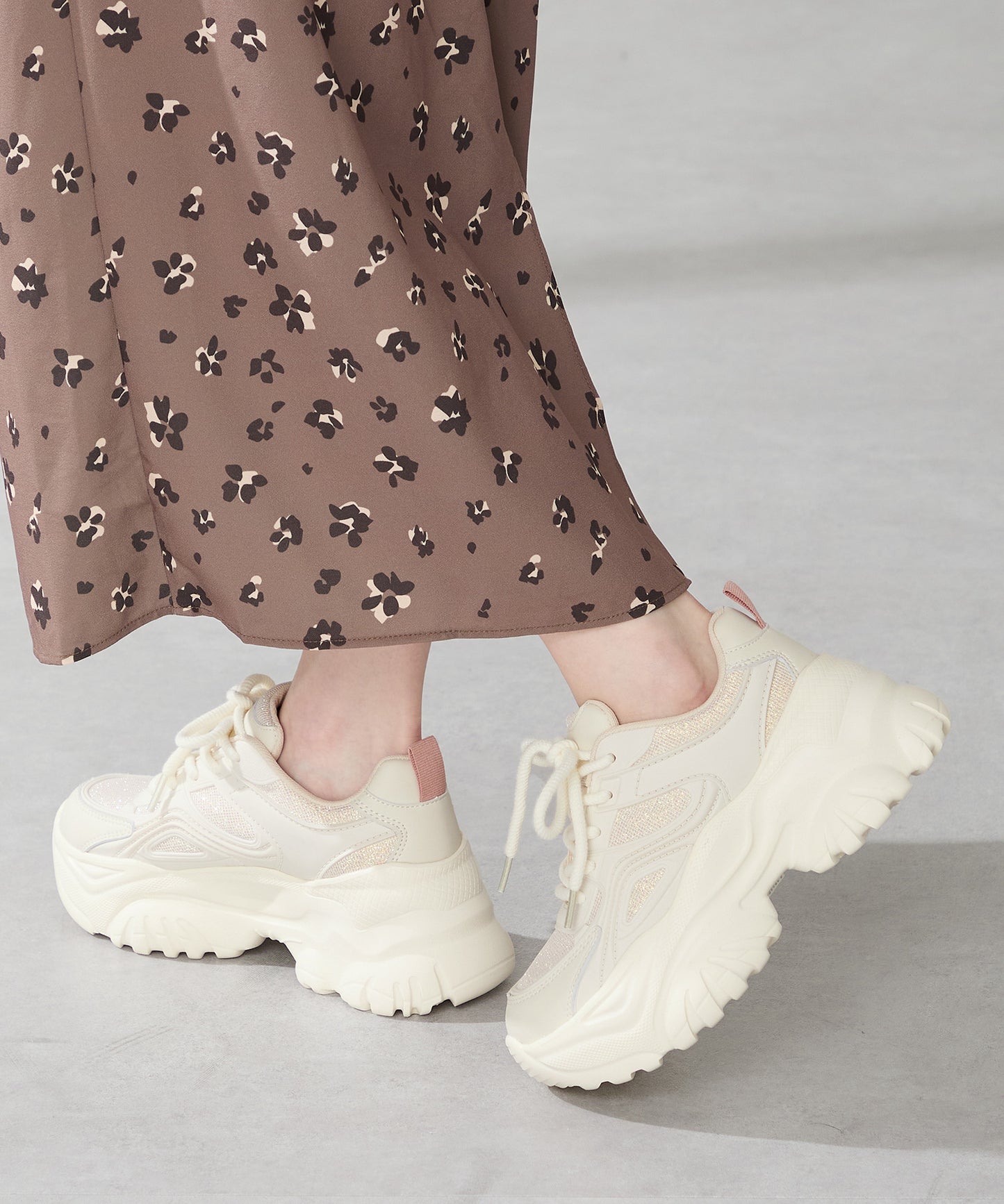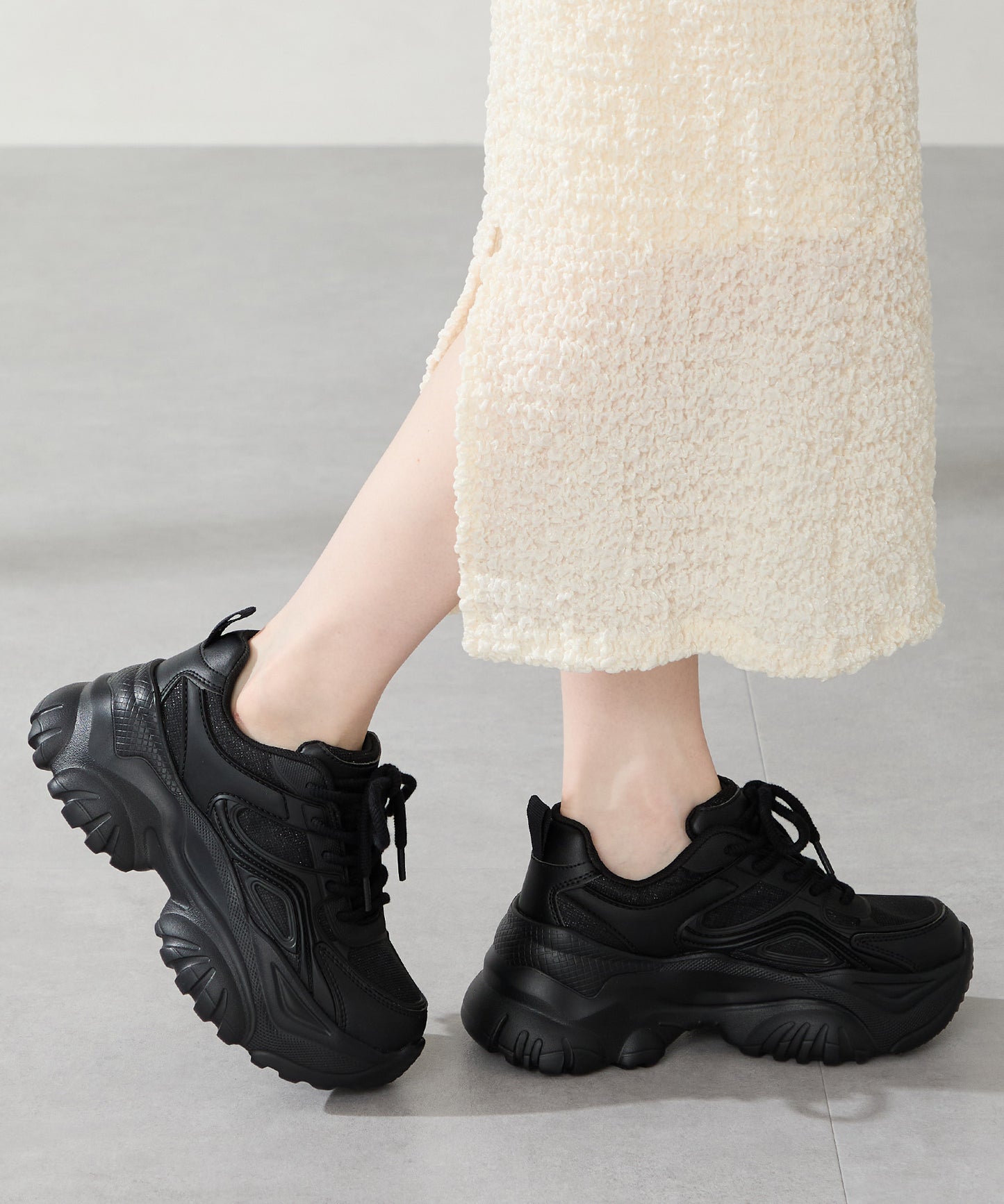 人気継続中のボリューム感たっぷりの厚底スニーカーは、細やかなラメを織り込んだアッパーデザインにすることで上品な印象に。スポーティーになりすぎない落ち着いたワントーンカラーなのでフェミニンコーデにも合わせやすく、スカートやワンピースはもちろん、ミニボトムと合わせて脚長効果が期待できるのも嬉しい。さりげない輝きが足元に軽やかさを与えてくれる。