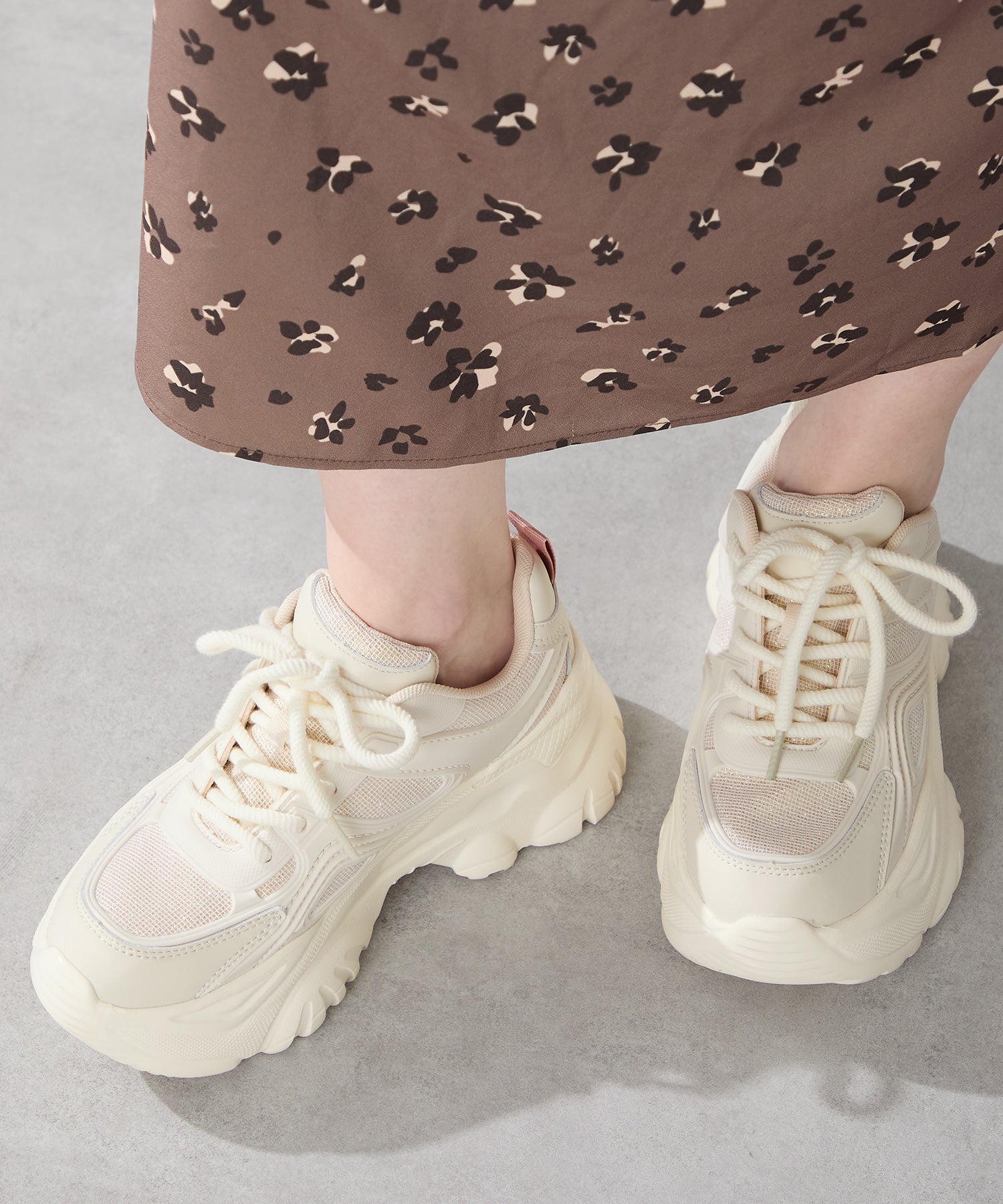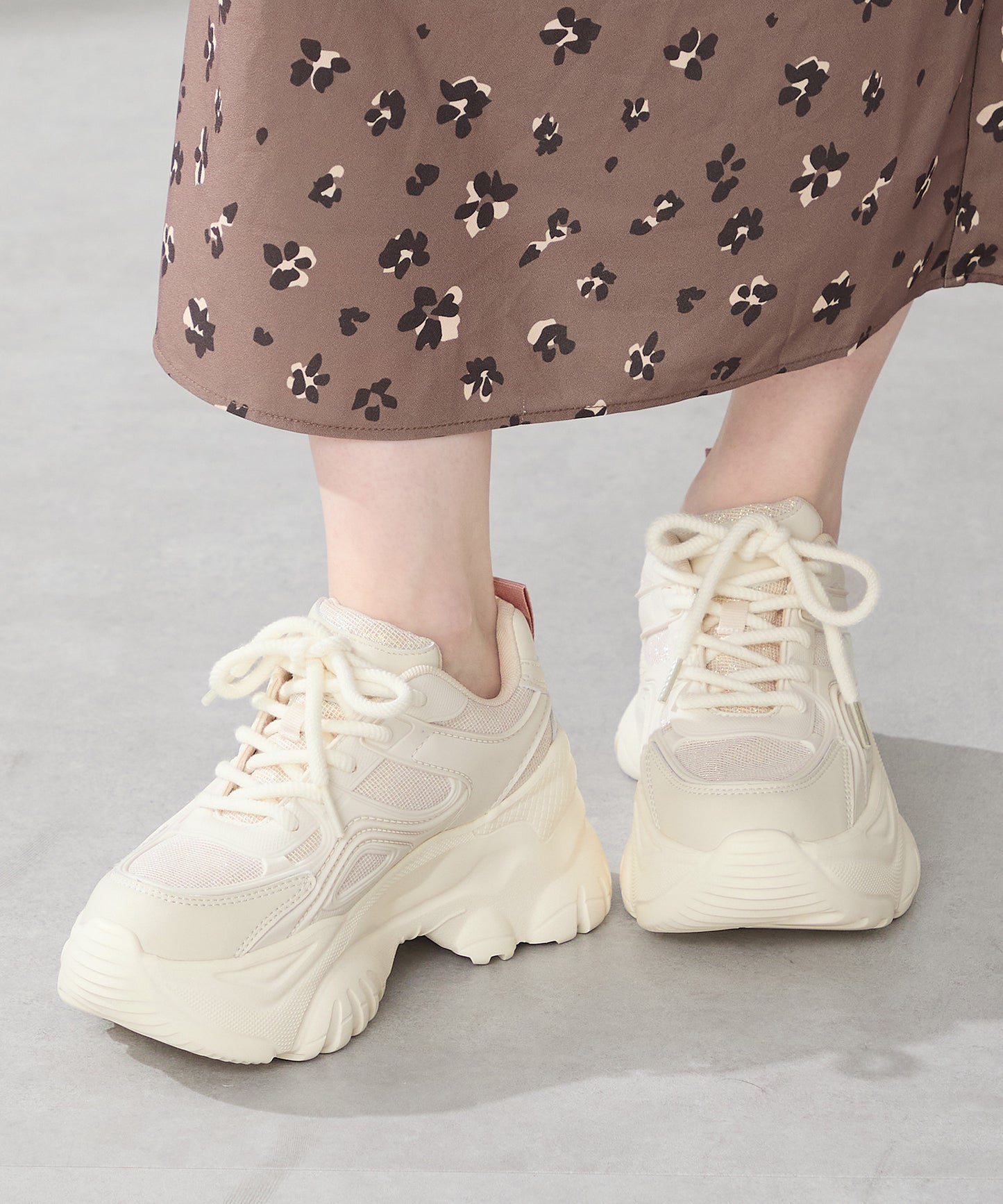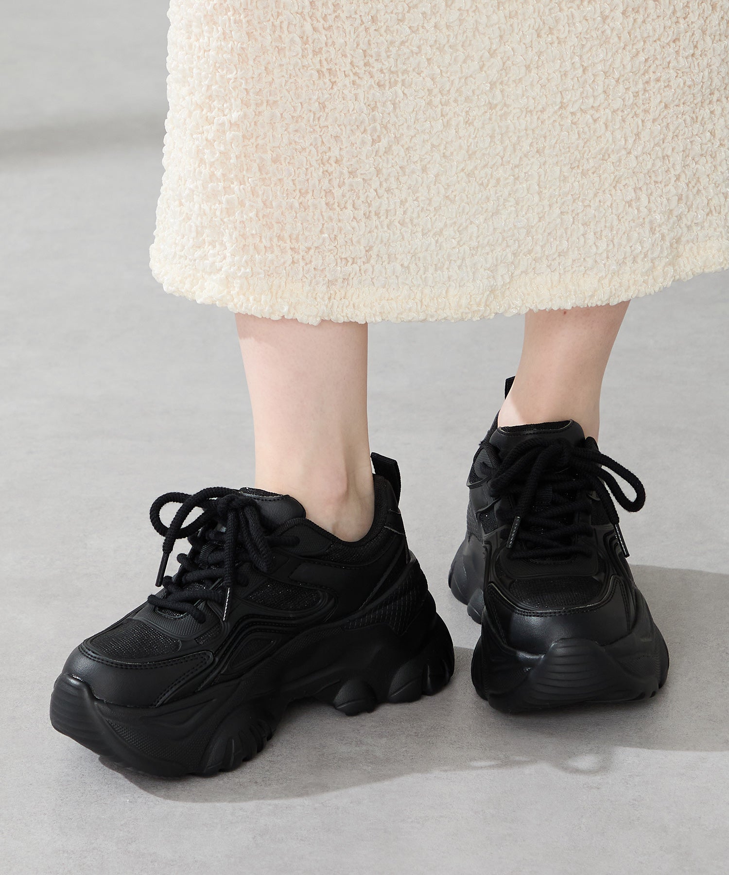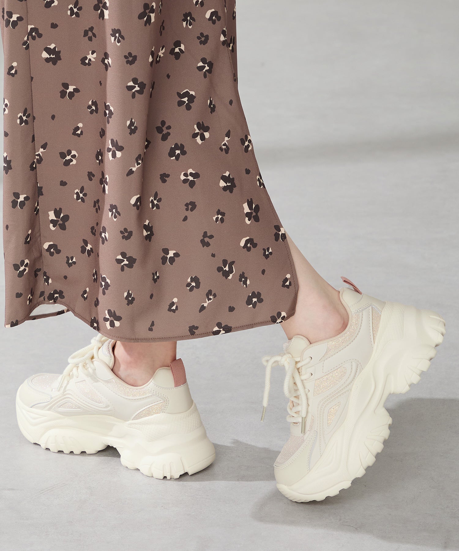 人気継続中のボリューム感たっぷりの厚底スニーカーは、細やかなラメを織り込んだアッパーデザインにすることで上品な印象に。スポーティーになりすぎない落ち着いたワントーンカラーなのでフェミニンコーデにも合わせやすく、スカートやワンピースはもちろん、ミニボトムと合わせて脚長効果が期待できるのも嬉しい。さりげない輝きが足元に軽やかさを与えてくれる。