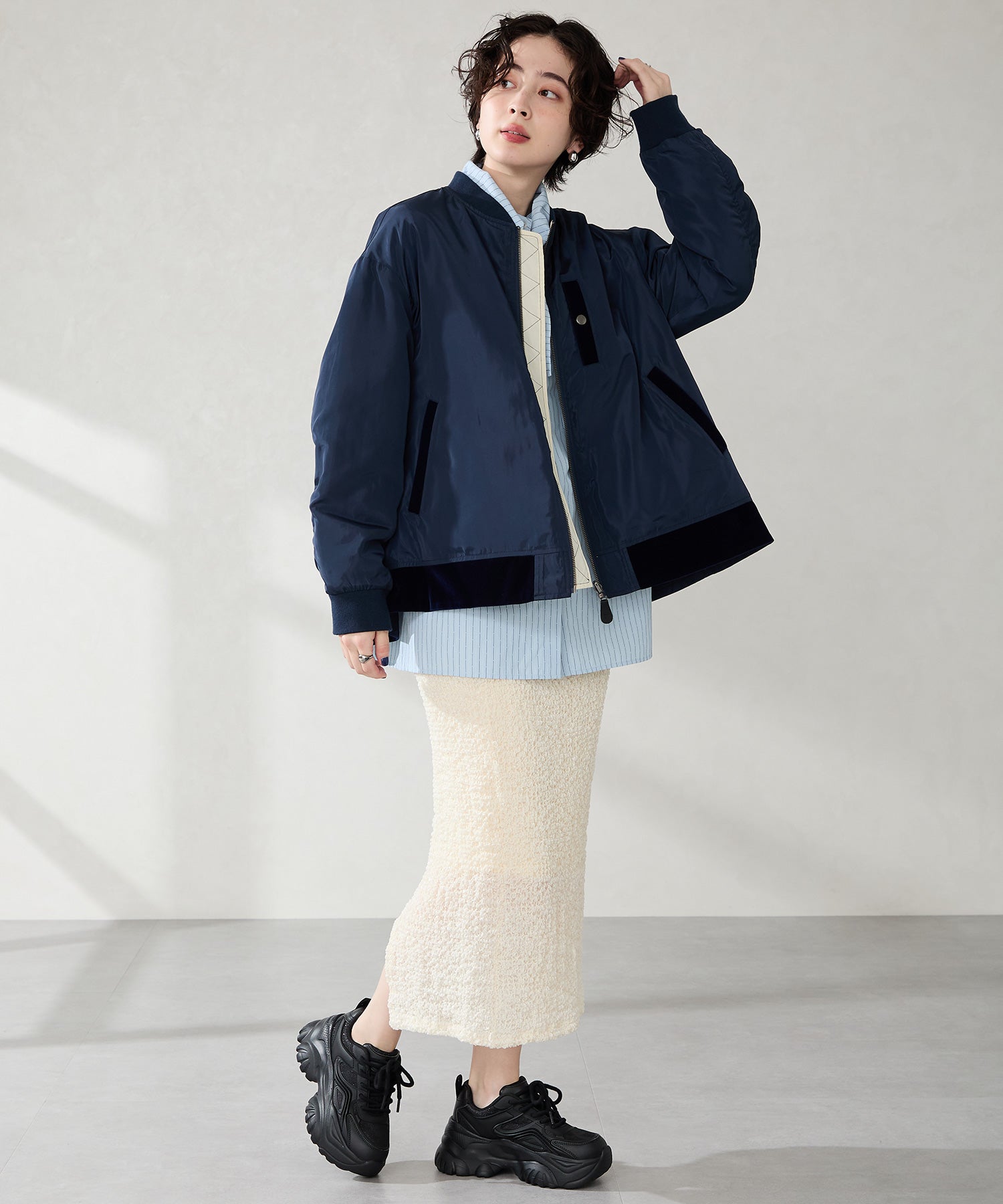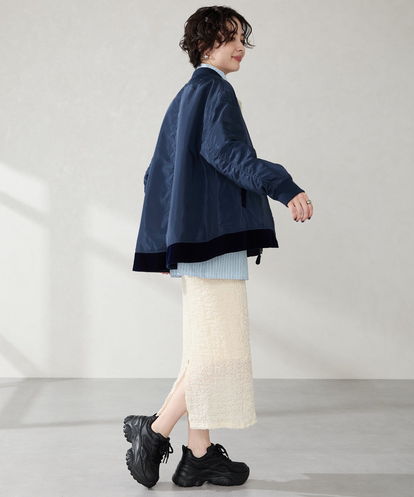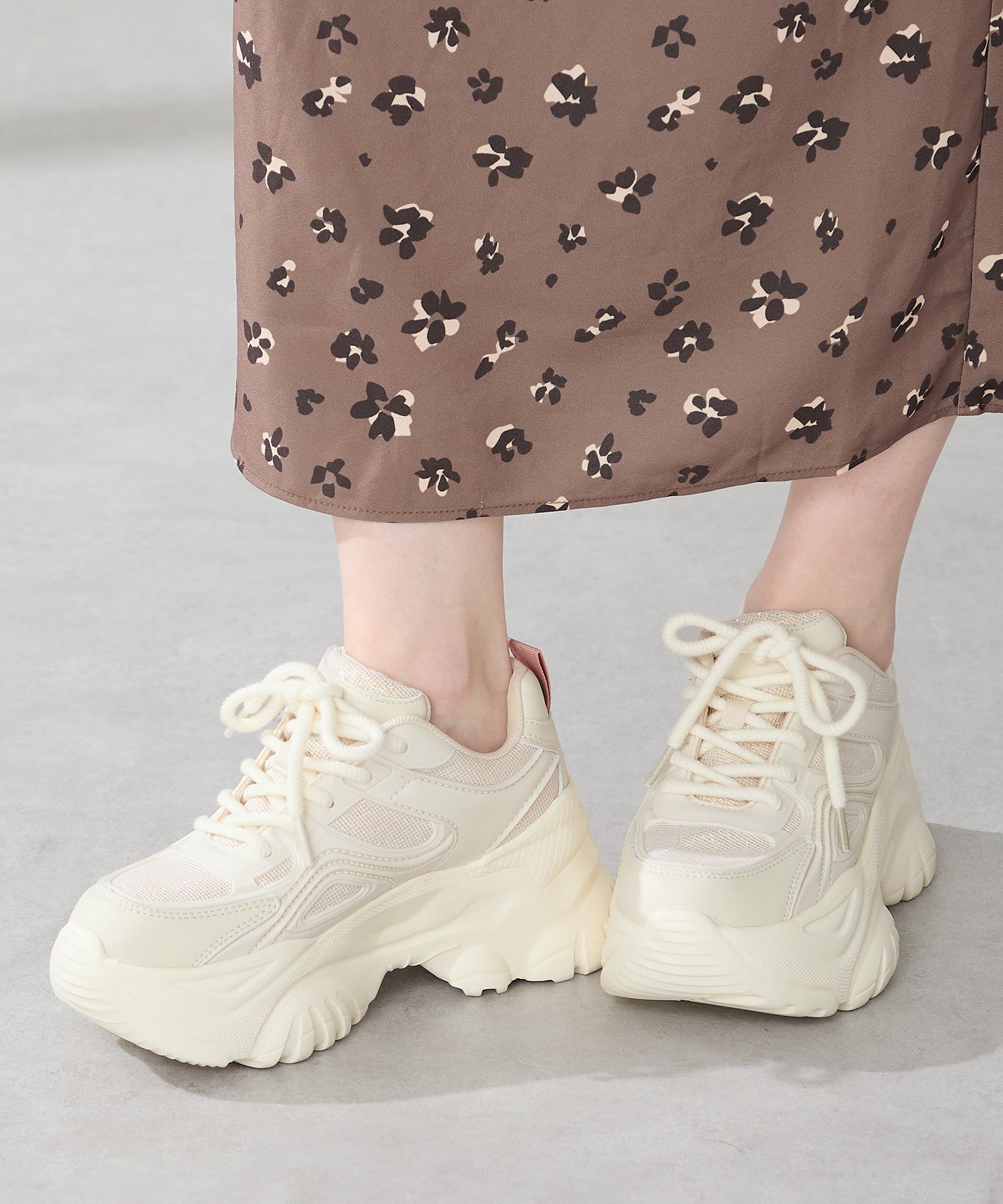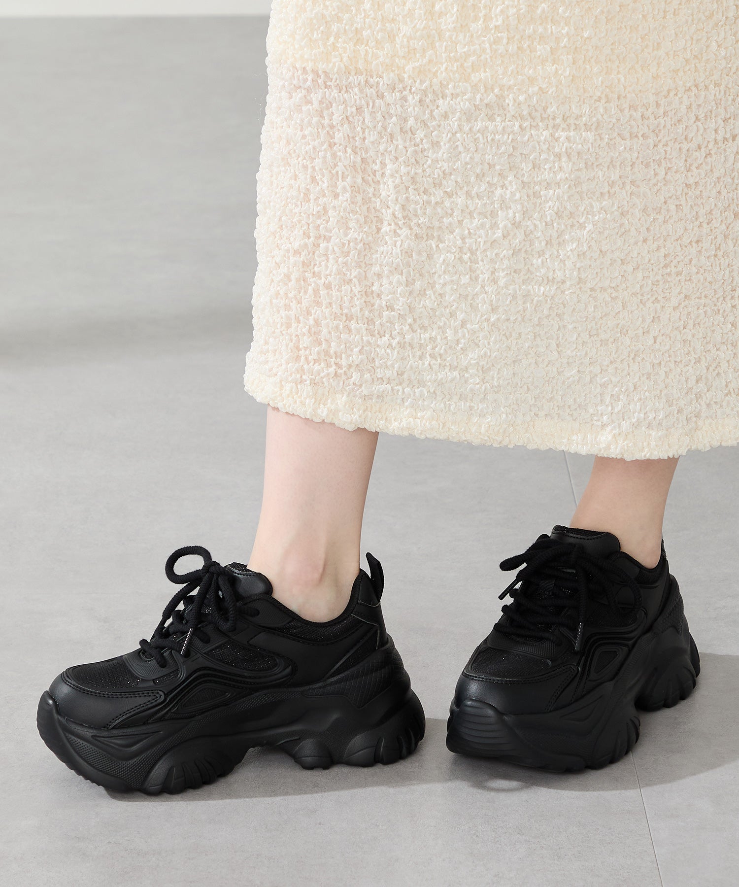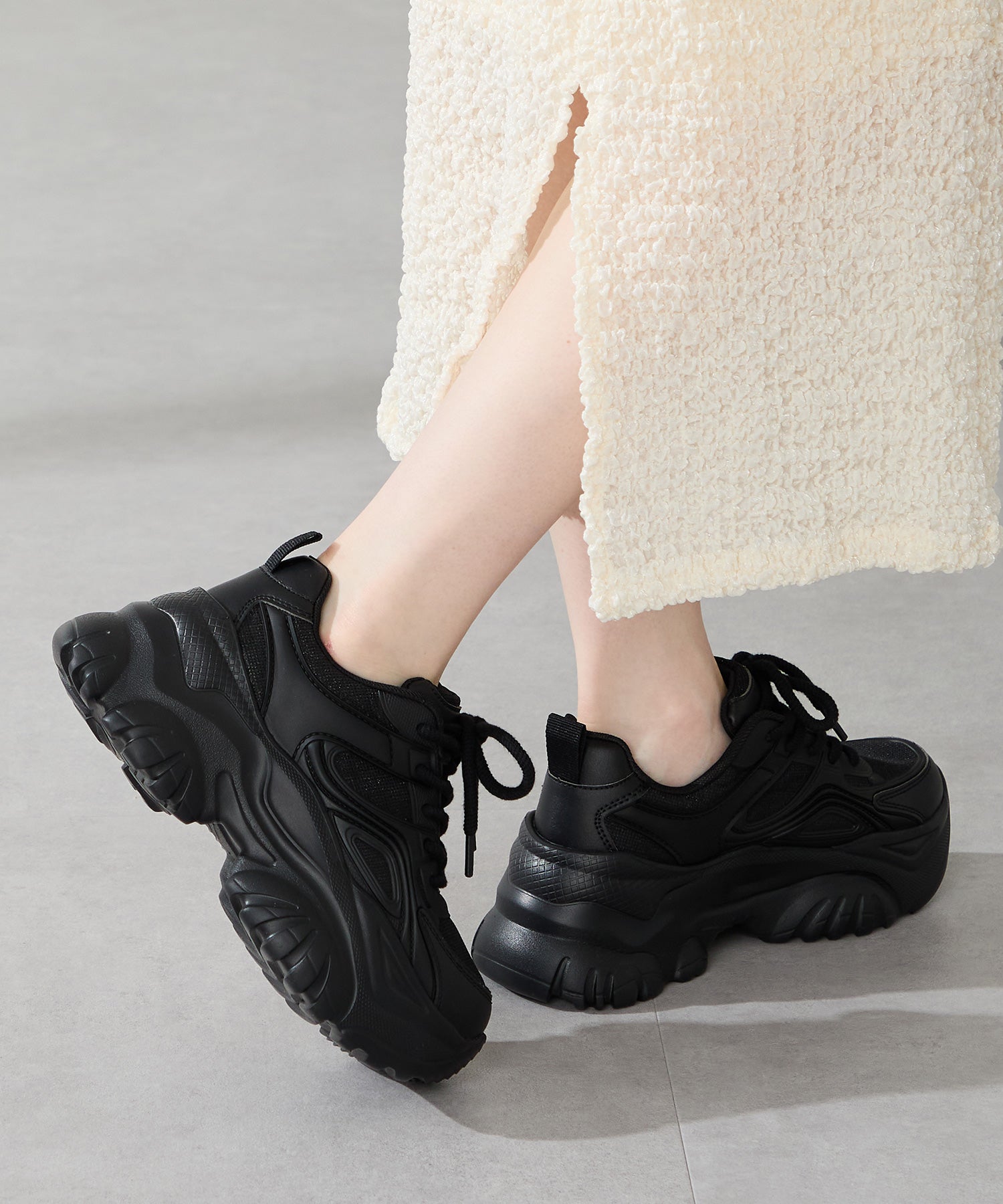 人気継続中のボリューム感たっぷりの厚底スニーカーは、細やかなラメを織り込んだアッパーデザインにすることで上品な印象に。スポーティーになりすぎない落ち着いたワントーンカラーなのでフェミニンコーデにも合わせやすく、スカートやワンピースはもちろん、ミニボトムと合わせて脚長効果が期待できるのも嬉しい。さりげない輝きが足元に軽やかさを与えてくれる。