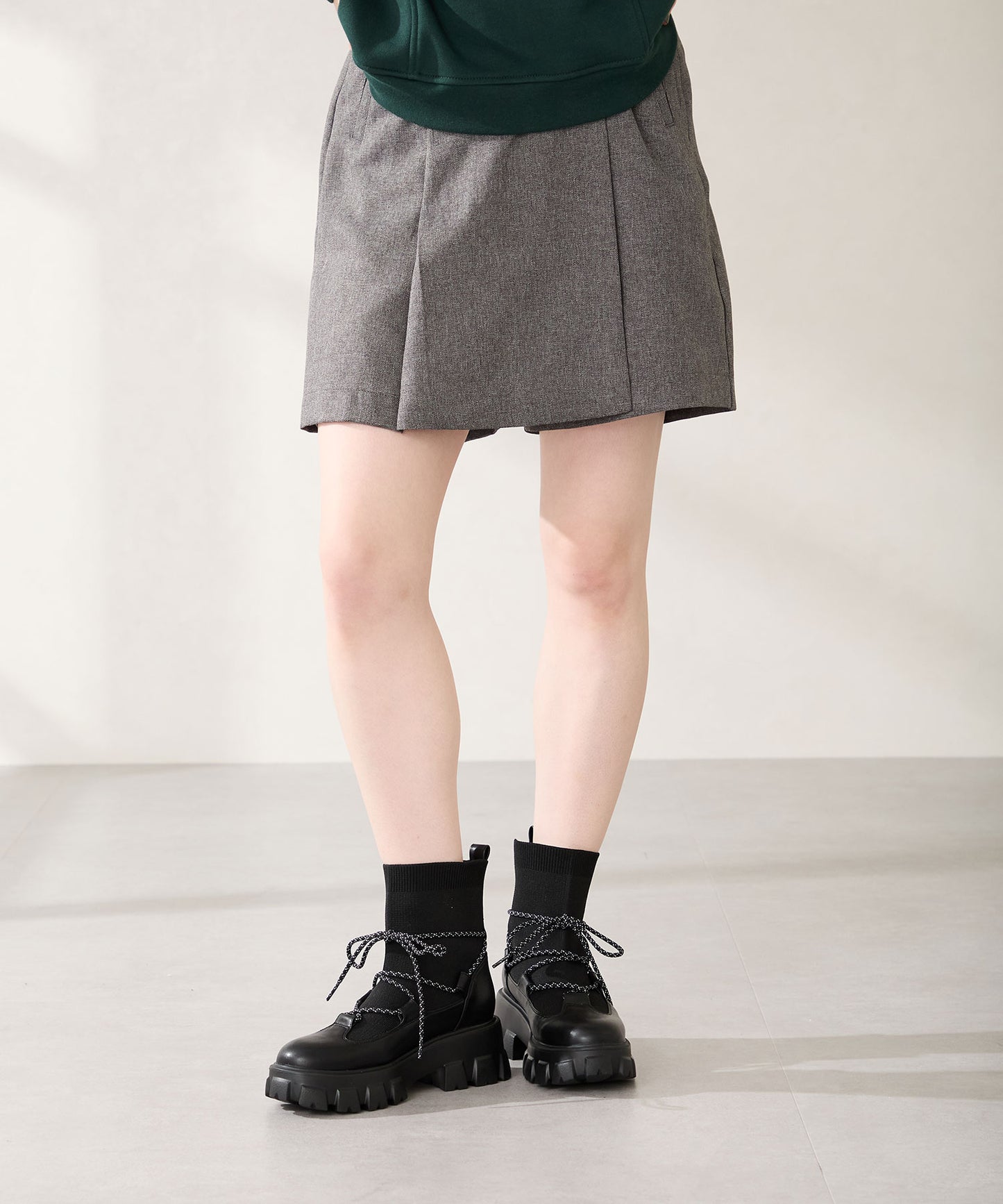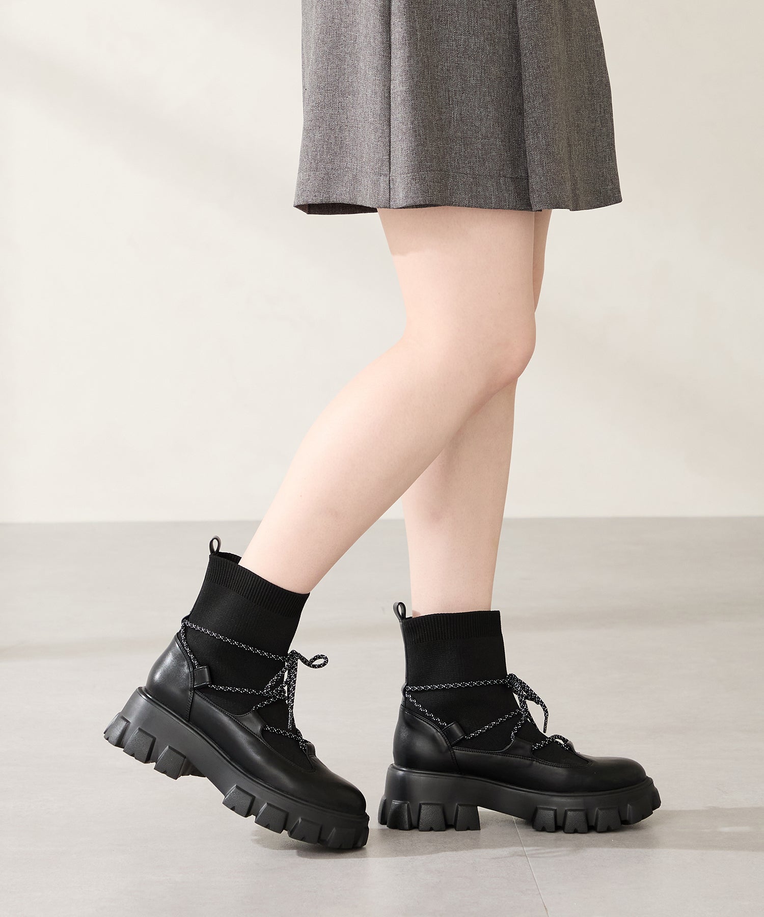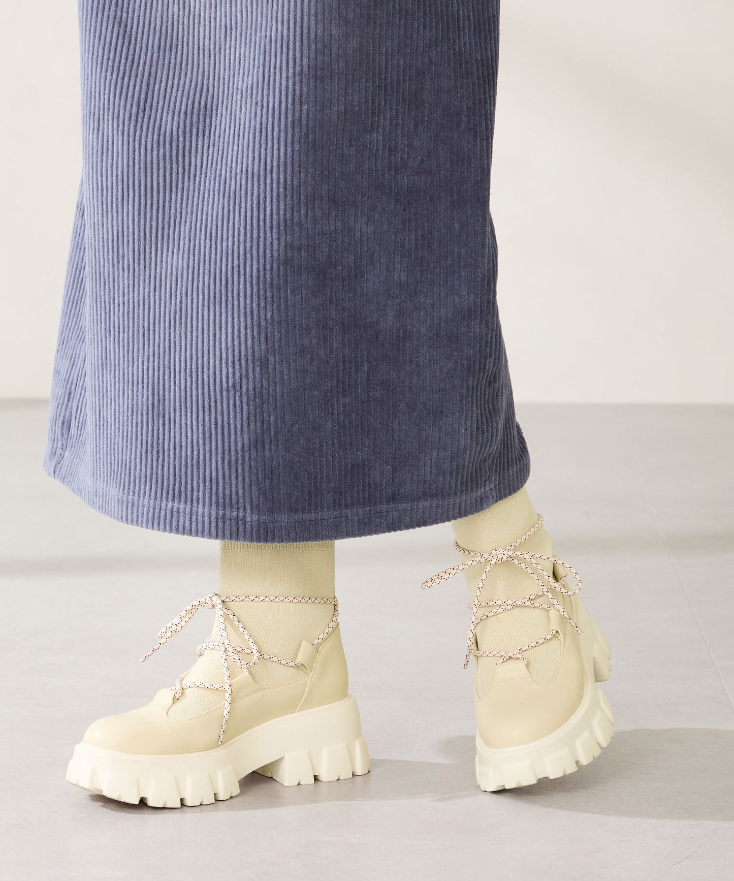 ごつごつとした凹凸のあるソールにストライプ柄のシューレース、柔らかなリブニットを掛け合わせることでスポーティーに仕上げたブーツ。伸縮性のあるニット素材と緩めの筒まわりで着脱がしやすく、肌触りも優しい快適な履き心地。足首を1周するレースアップデザインが足全体を細く見せてくれ、履くだけで旬な足元へアップデート。
