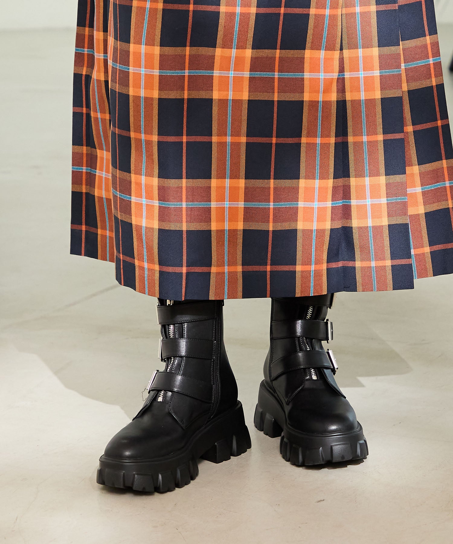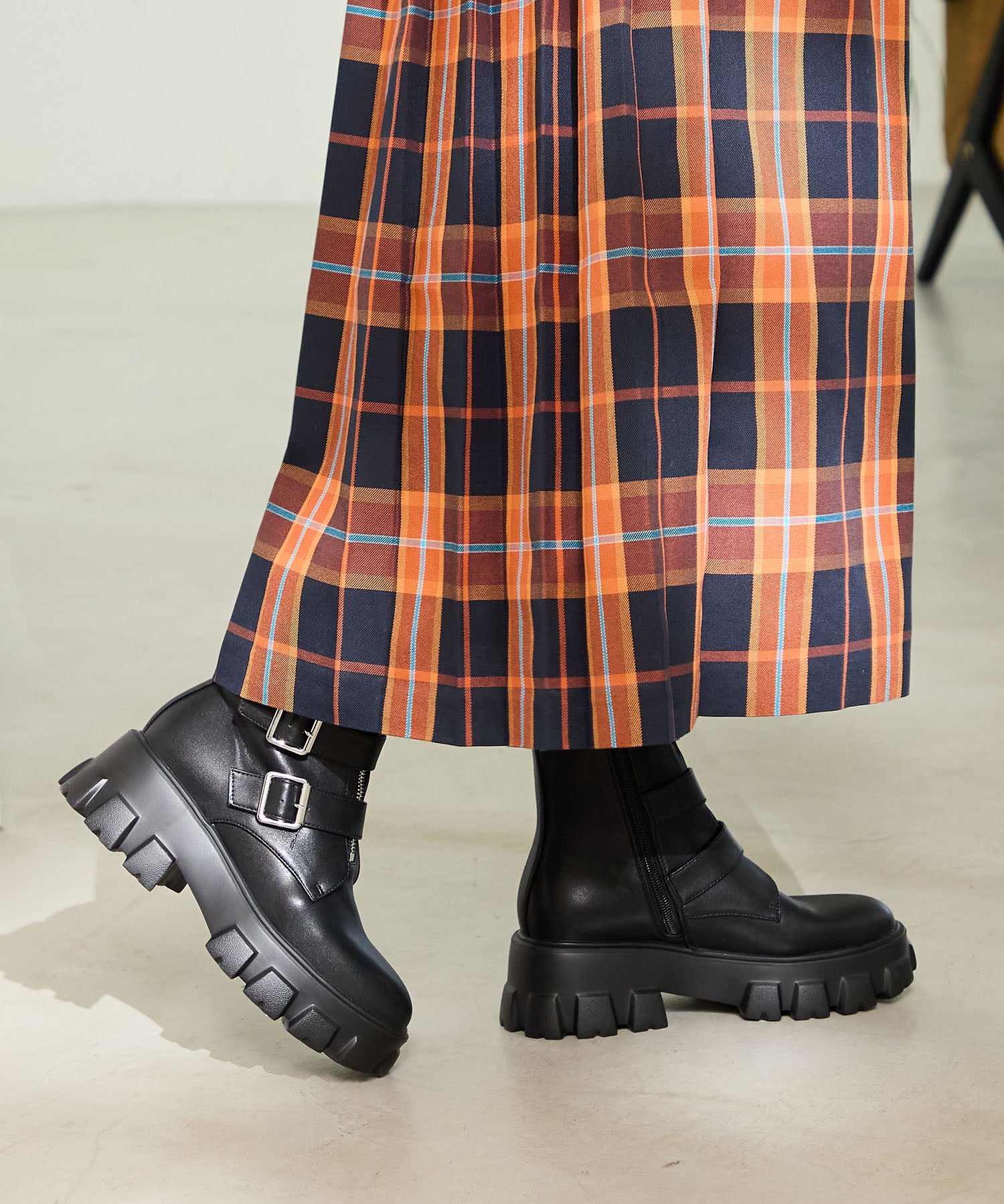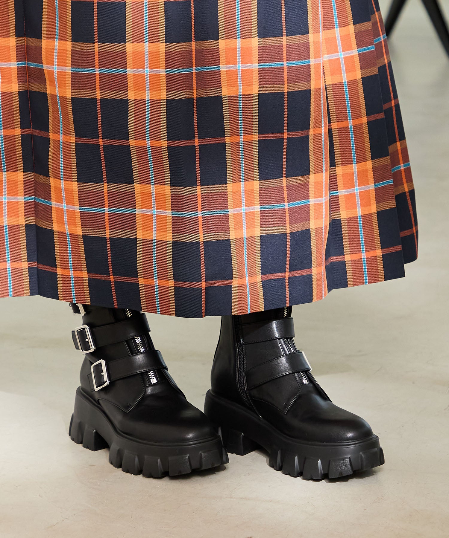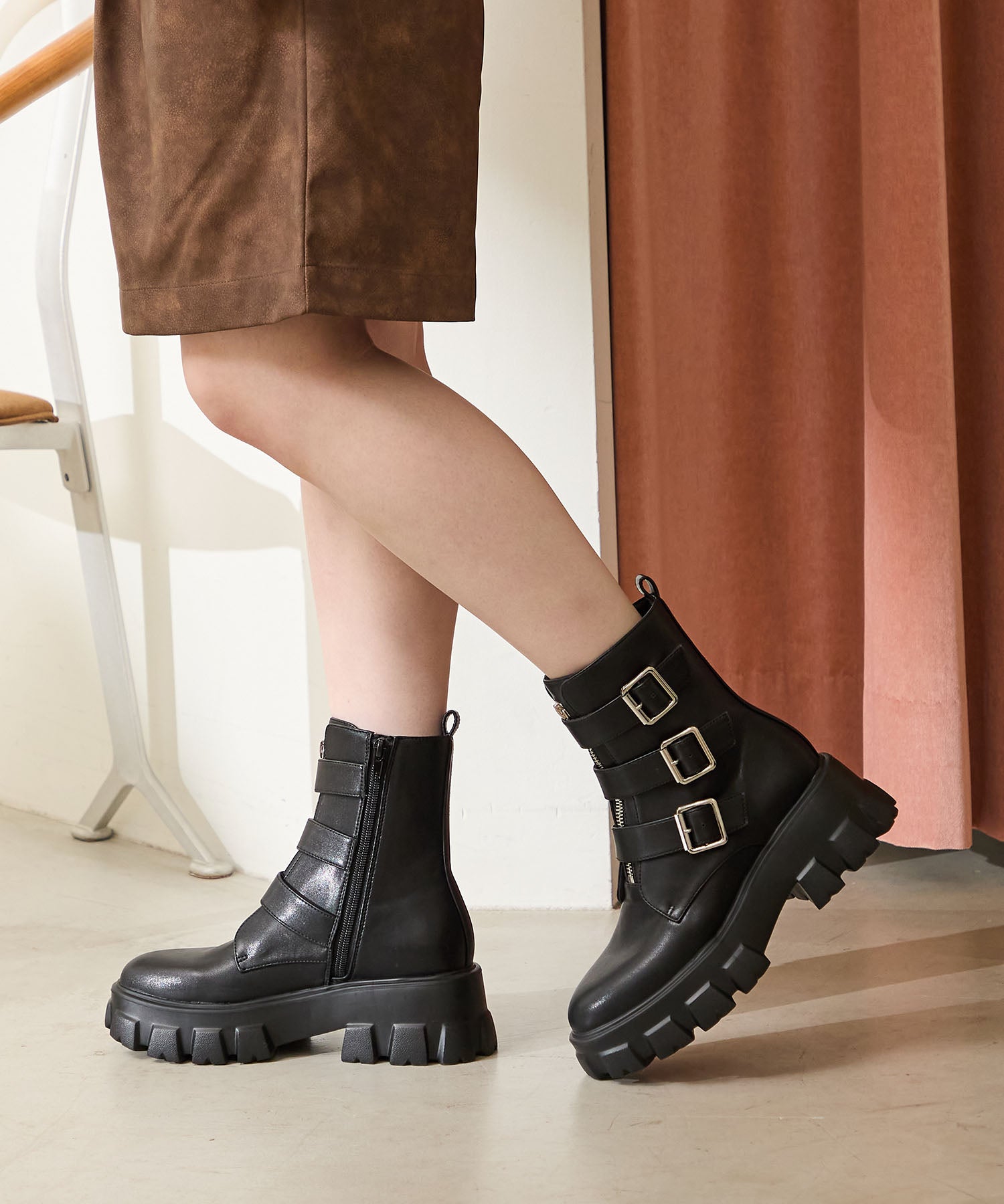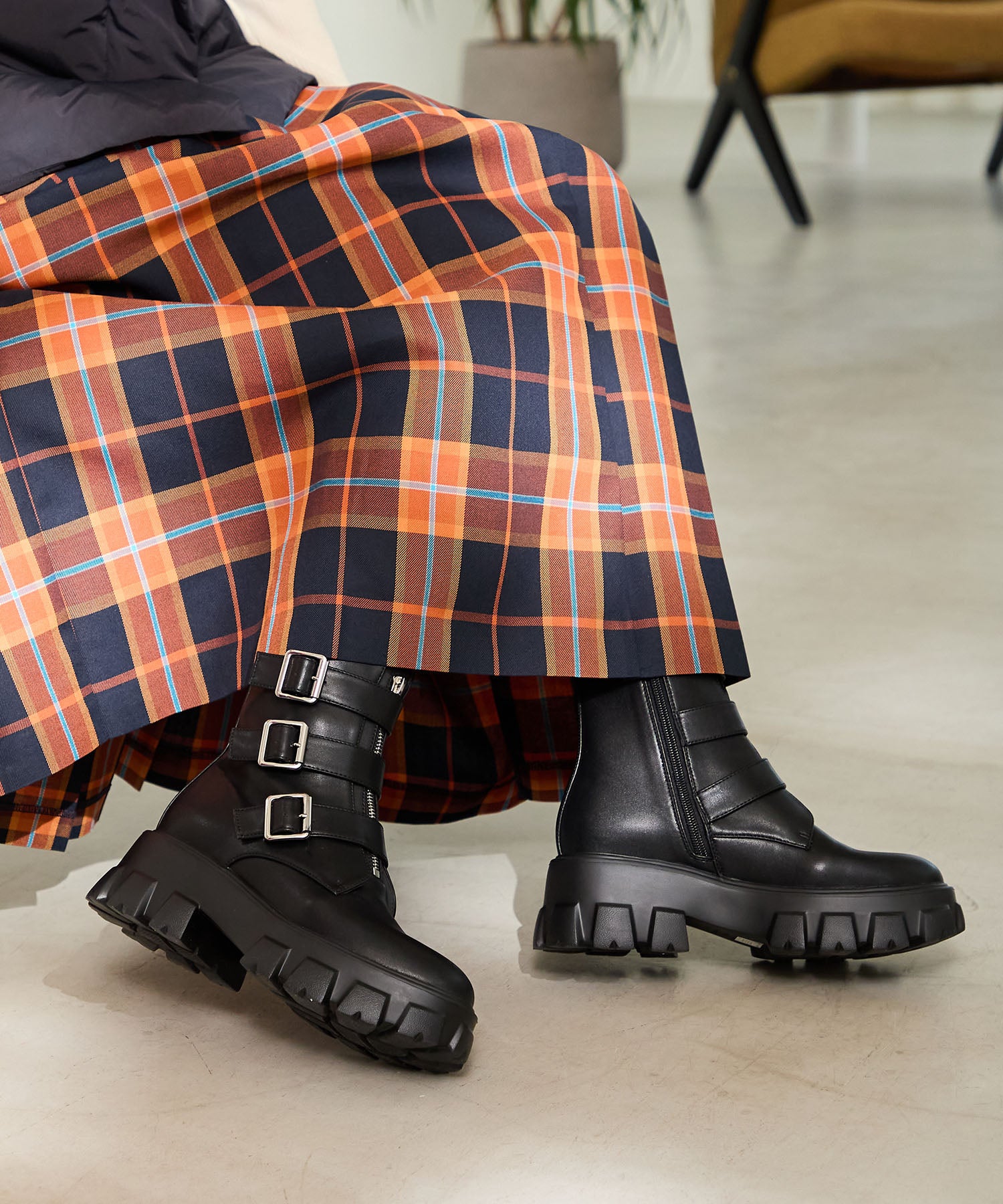 フロントジップと3本のベルトデザインでメンズライクなディテールを効かせた他とは被らない主役級アイテム。凹凸感のあるごつごつとしたソールを合わせ、とことんクールな印象ながら筒周りは少し細身のミドル丈にすることですっきりとした形にし、女性らしさも忘れないバランスの良いアイテムに。内側には着脱用のファスナーを付けているので脱ぎ履きのしやすさも◎。