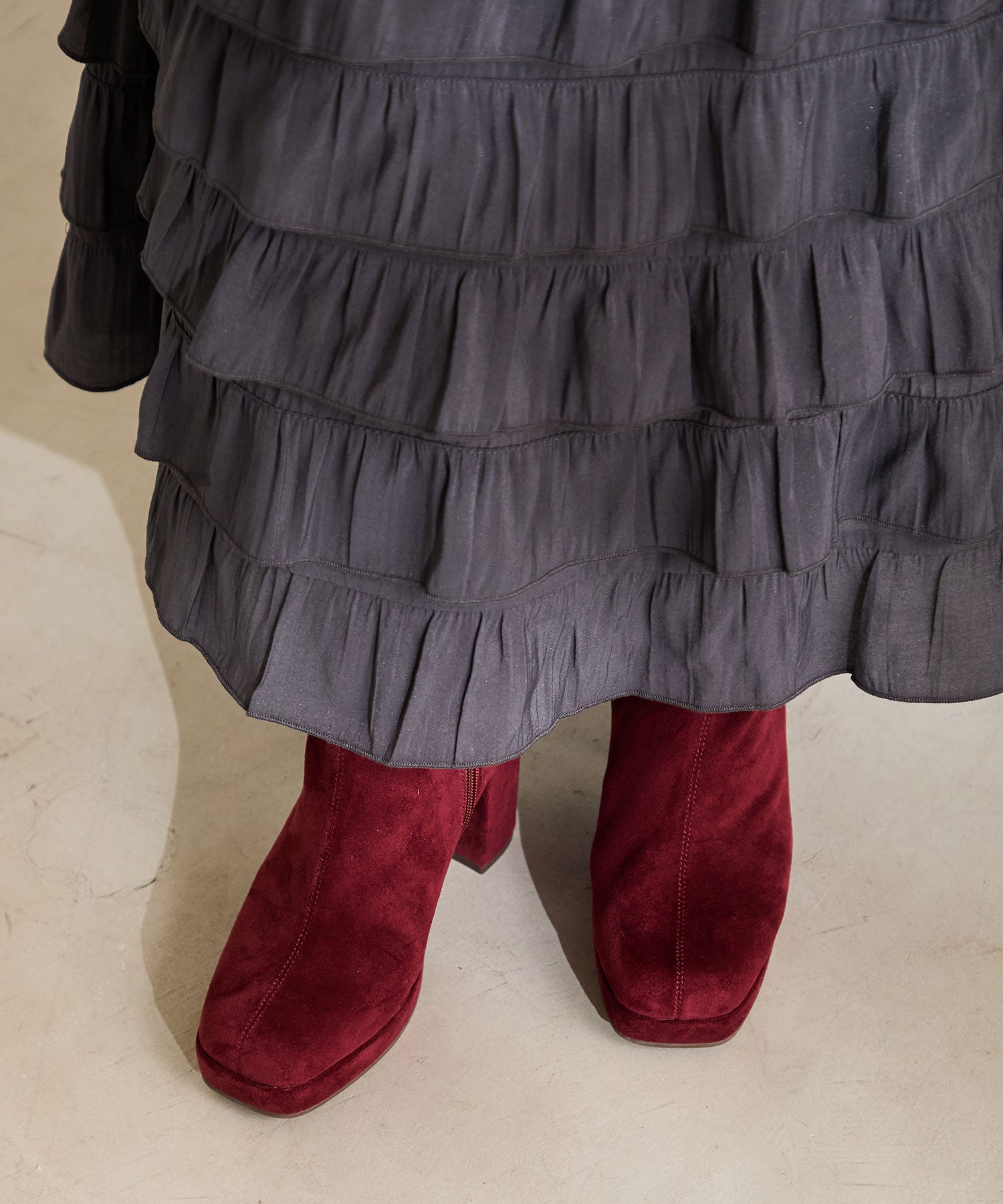 高めのヒールで存在感抜群のブーツは、足を綺麗に見せてくれるシルエットでスタイルアップを叶えてくれるアイテム。ストームに高さを付けることで全体的にインパクトのあるフォルムながら、高低差が少ないので安定した履き心地。スエード素材で温かみのあるレッドは、普段のスタイリングに合わせることで他とはひと味違う雰囲気になること間違いなし。
