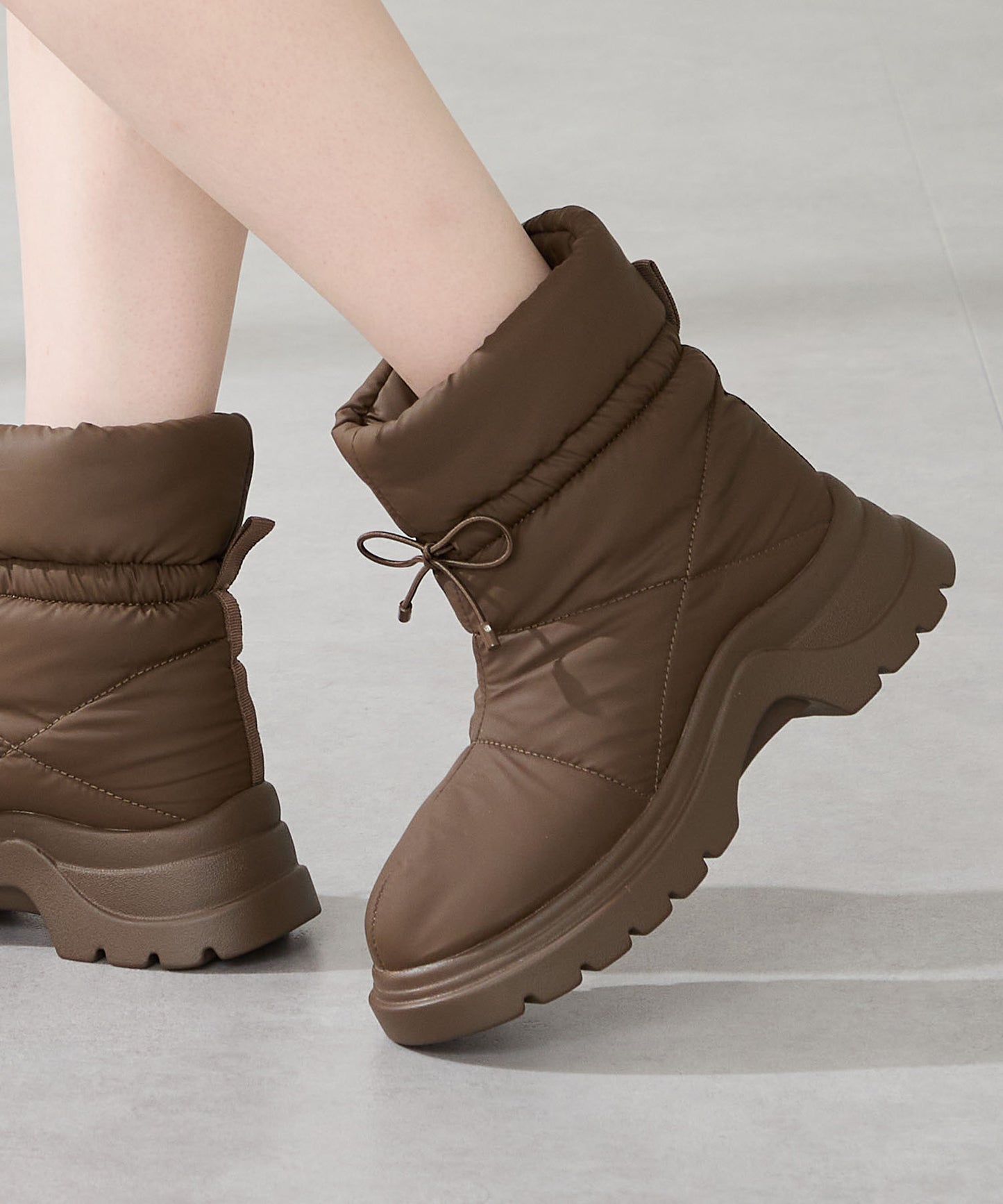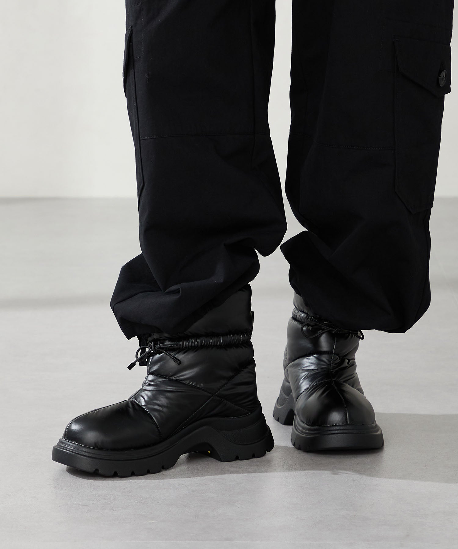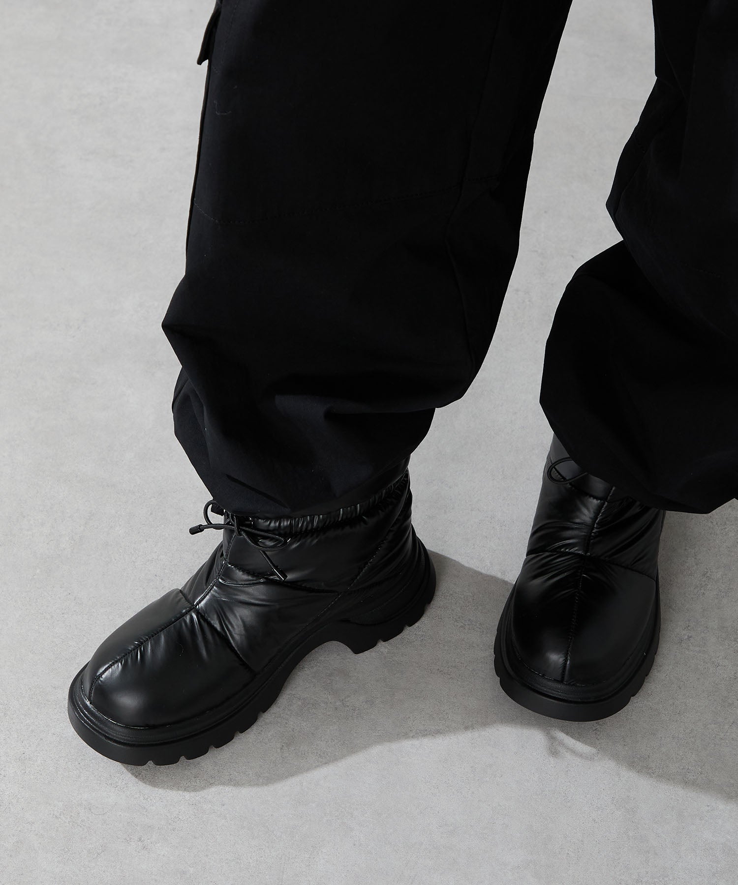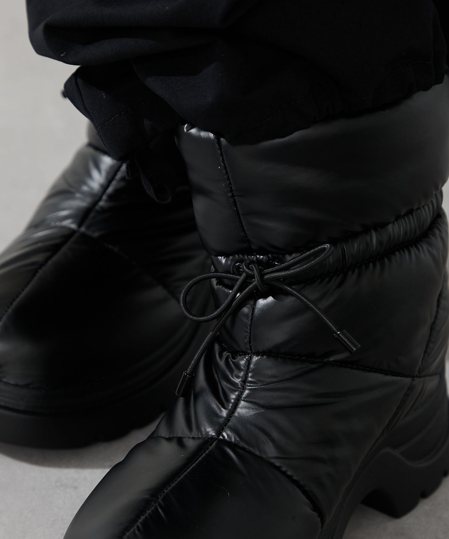 寒い季節にぴったりな防寒性と快適さを兼ね備えたブーツは厚底ソールでボリューム感のあるシルエットがトレンドライクなアイテム。裏側は全面ボア仕様で、足を入れた瞬間から包み込まれるようなあたたかさを感じられる。アッパーはふわふわとした柔らかいパデットデザインにすることで筒全体の足当たりが良く、リボン結びできる紐で絞ることでシルエットの変化も楽しむことができる仕様に。
