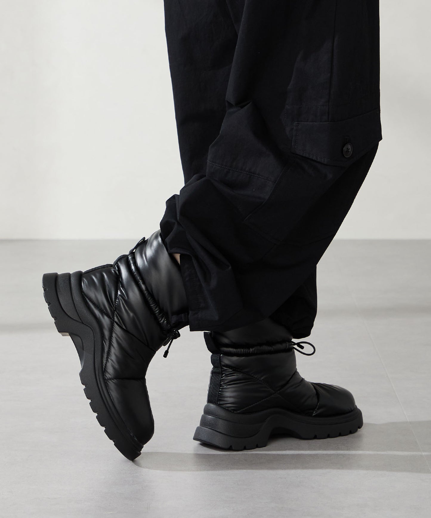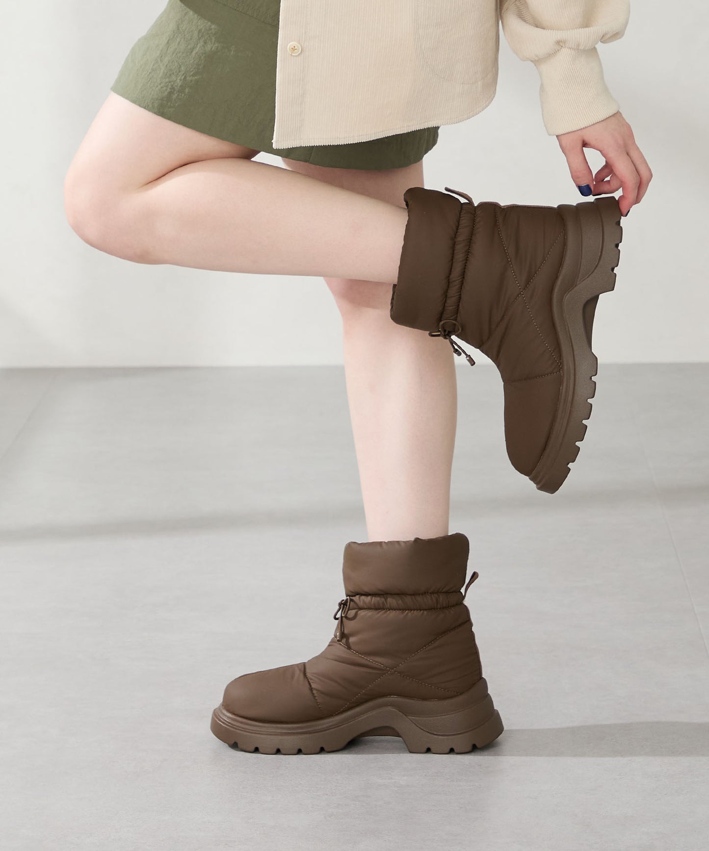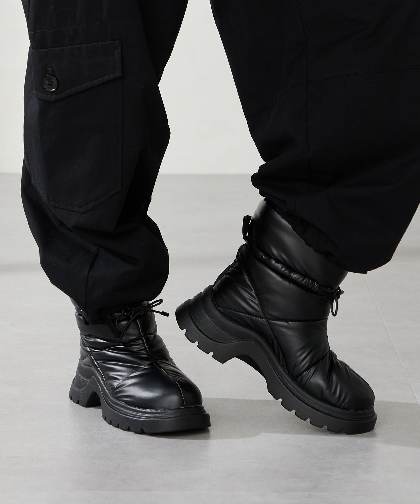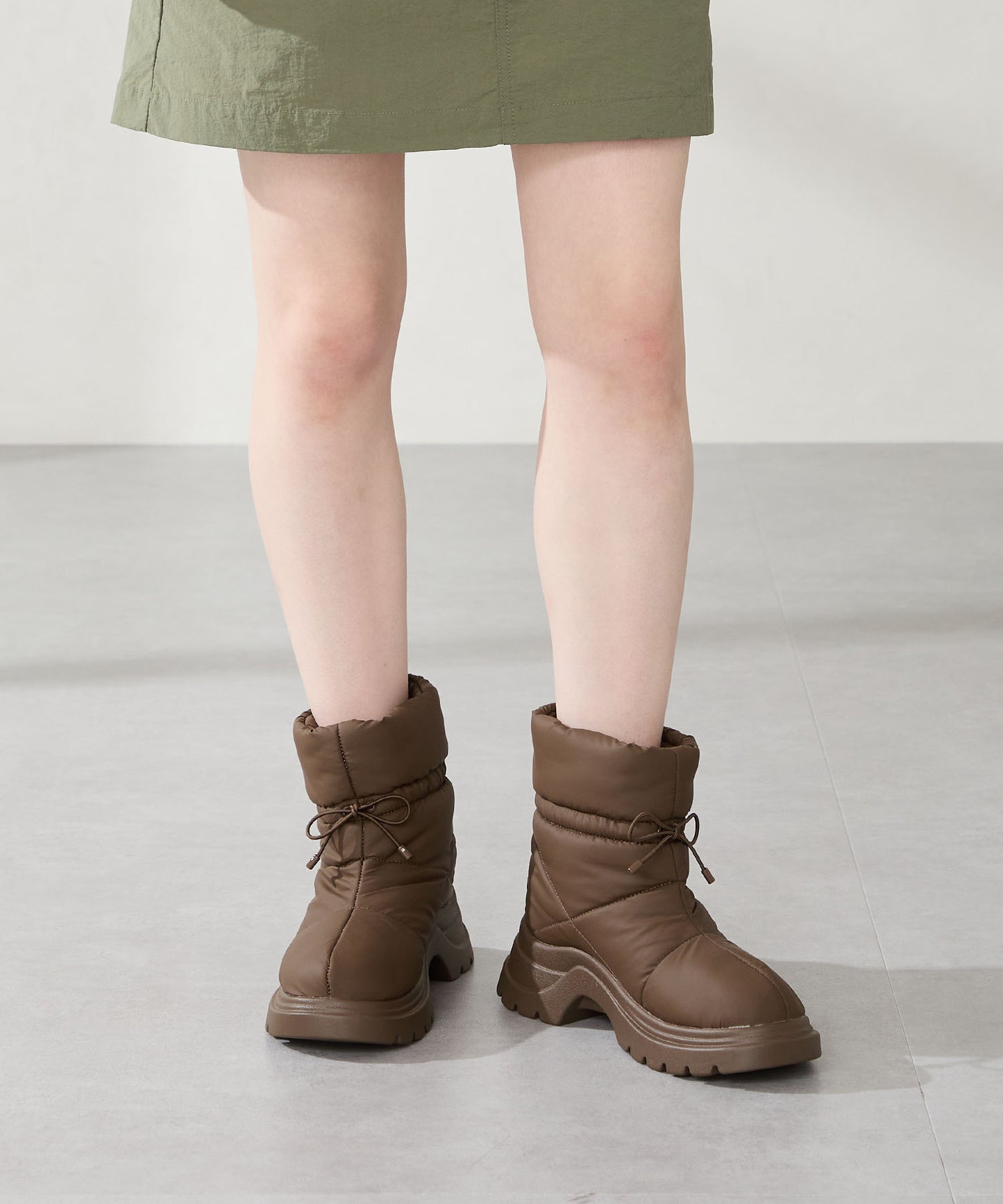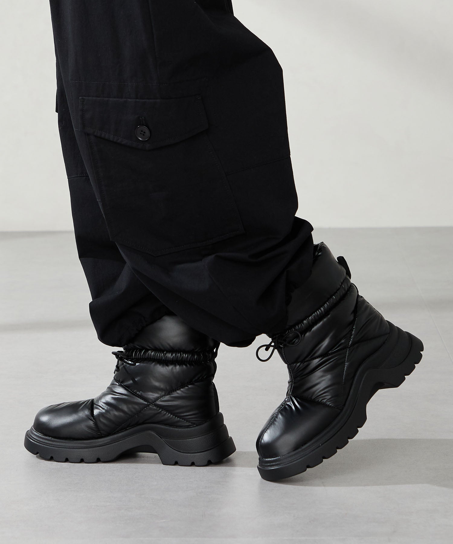 寒い季節にぴったりな防寒性と快適さを兼ね備えたブーツは厚底ソールでボリューム感のあるシルエットがトレンドライクなアイテム。裏側は全面ボア仕様で、足を入れた瞬間から包み込まれるようなあたたかさを感じられる。アッパーはふわふわとした柔らかいパデットデザインにすることで筒全体の足当たりが良く、リボン結びできる紐で絞ることでシルエットの変化も楽しむことができる仕様に。