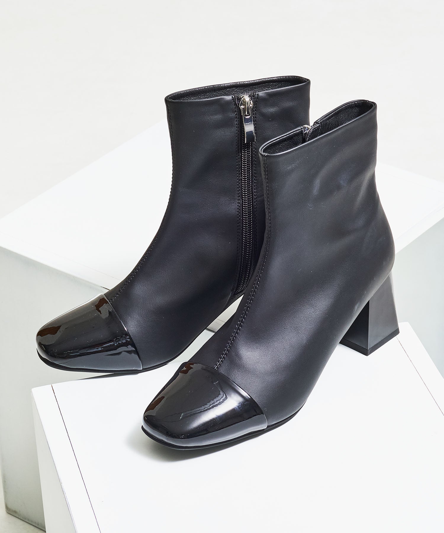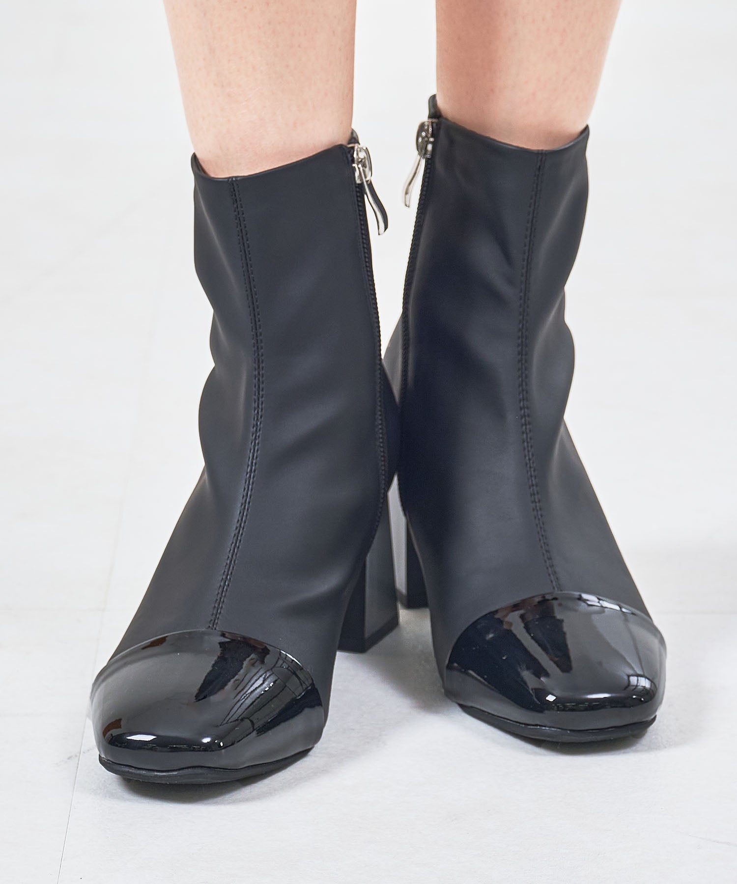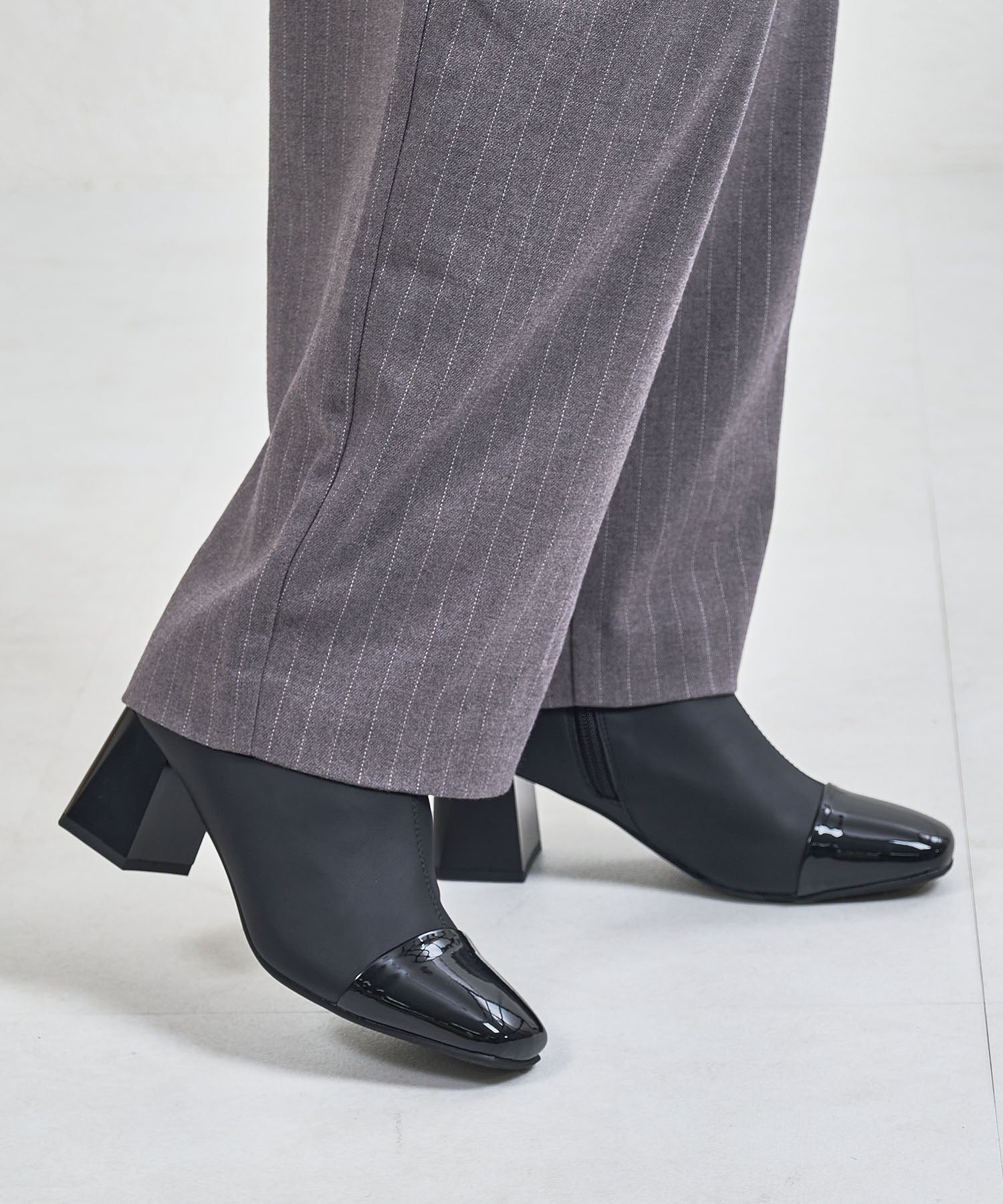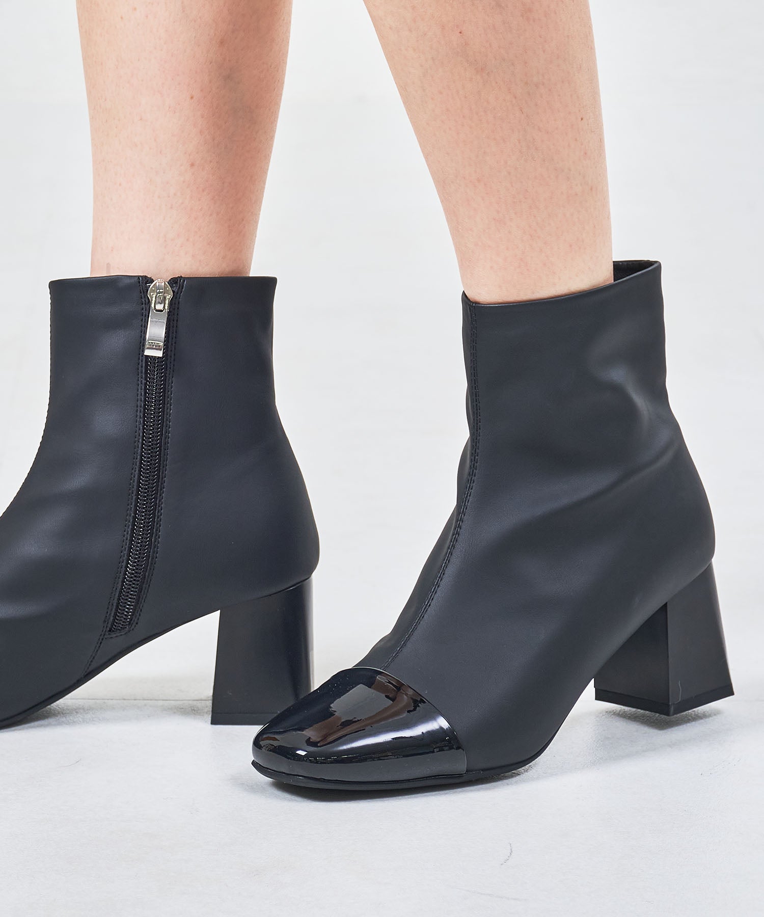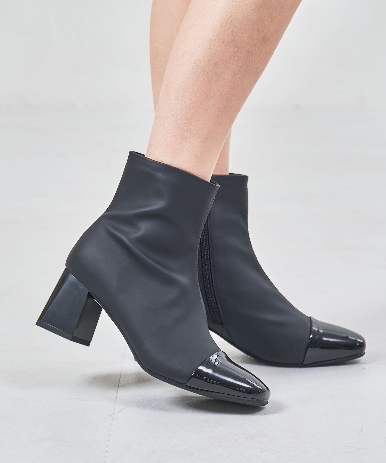 アッパーのマットなスムース素材に対しつま先部分はツヤ感のあるエナメル素材を組み合わせたことで、シンプルながらに履くだけでこなれ感の出る一足に。内側は足当たりの良い起毛素材を使用しており足を入れた瞬間にふわっと包み込まれるような柔らかさ。どんなコーディネートにも合わせやすい異素材ミックスのきれいめショートブーツ。