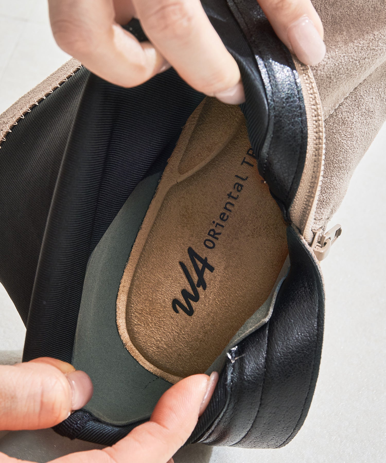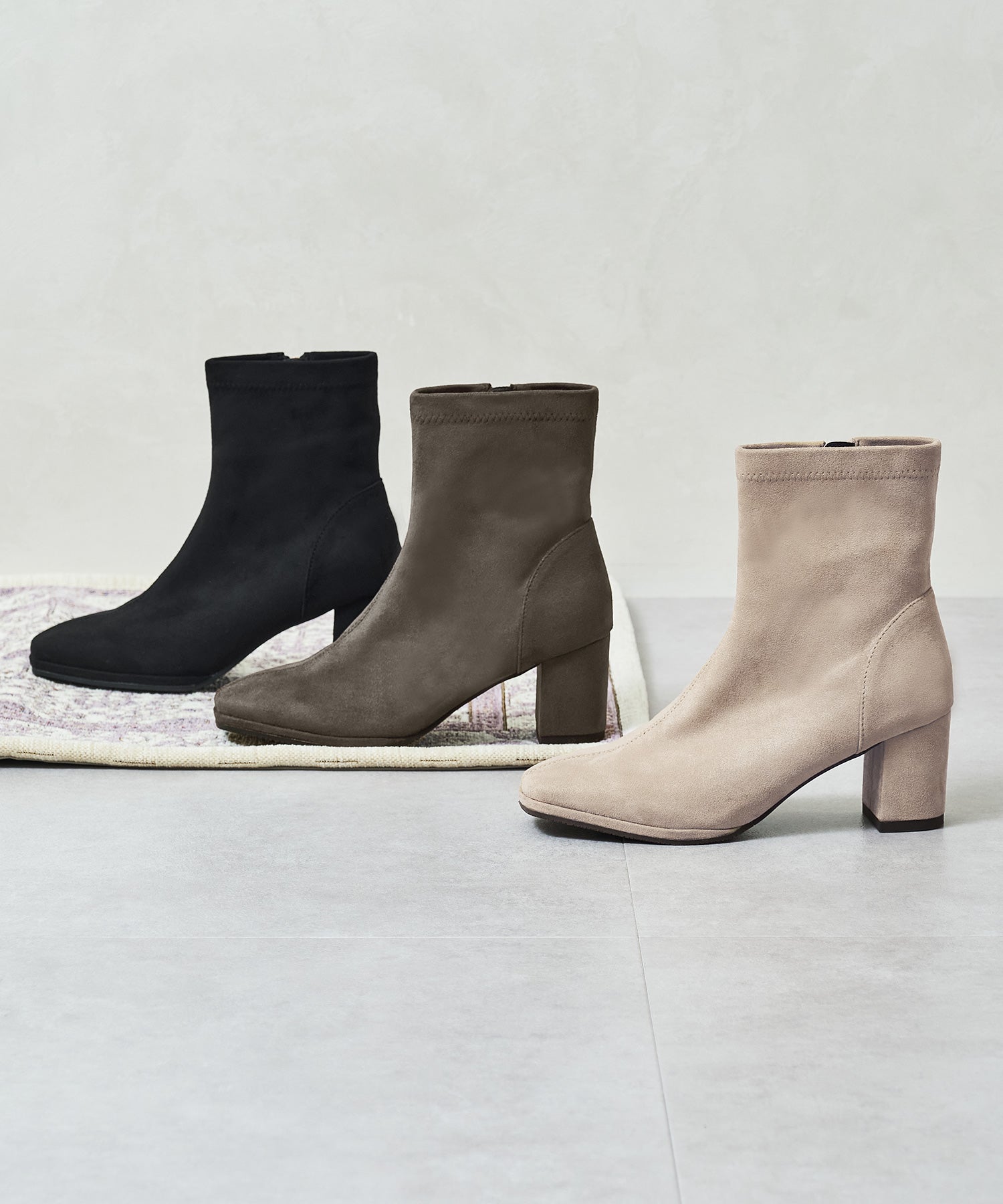 ストレッチの効いた素材でくたっと柔らかな足当たりの優しいブーツは、足に沿う細身のシルエットが美しいアイテム。馴染みの良いスエード素材にマットな塗装ヒールを組み合わせ、飾りのないシンプルなデザインながらもさりげなく上品な印象に。厚手クッション入りの中敷で疲れにくく、つま先の形状はアーモンドトゥにすることで、ボトムスを選ばないデイリー使いにぴったりの1足。