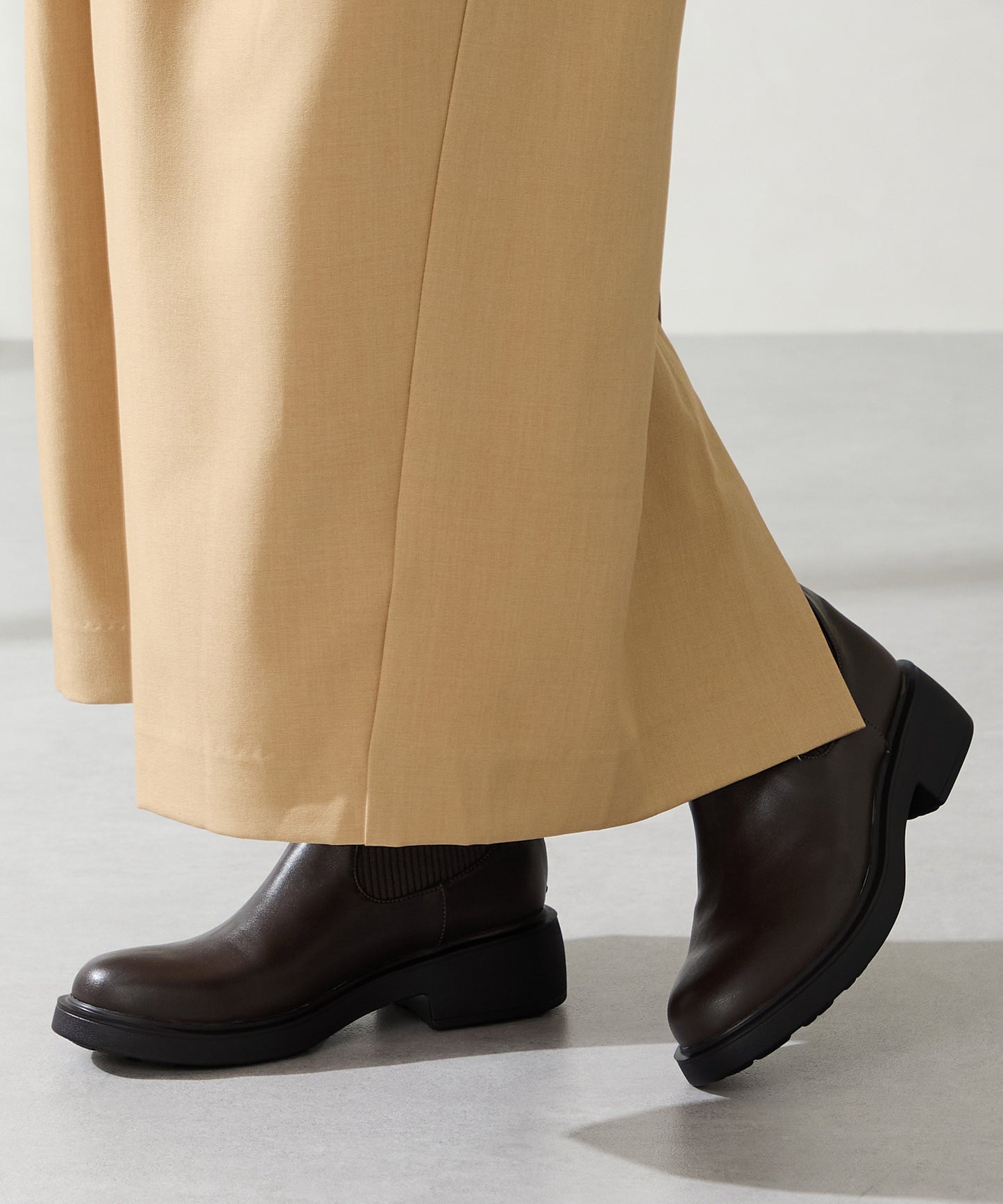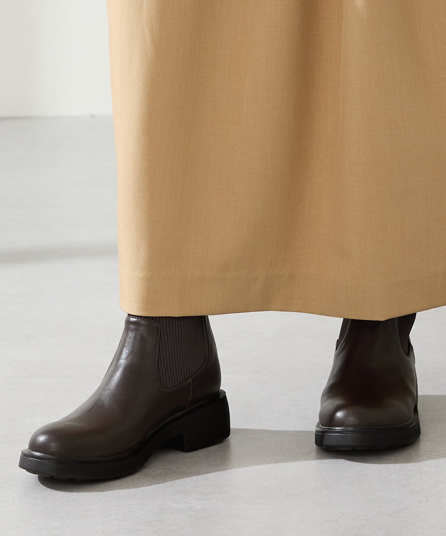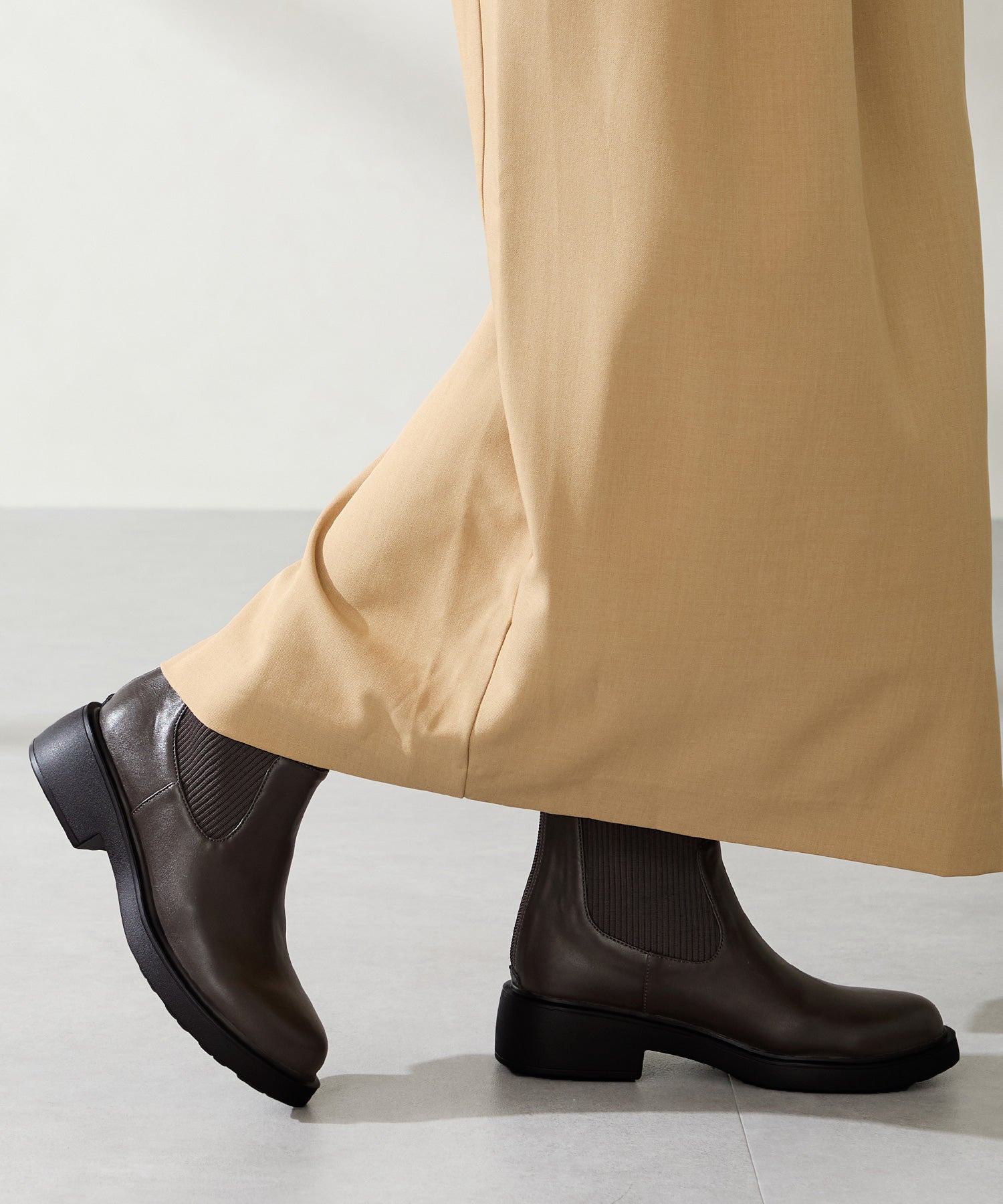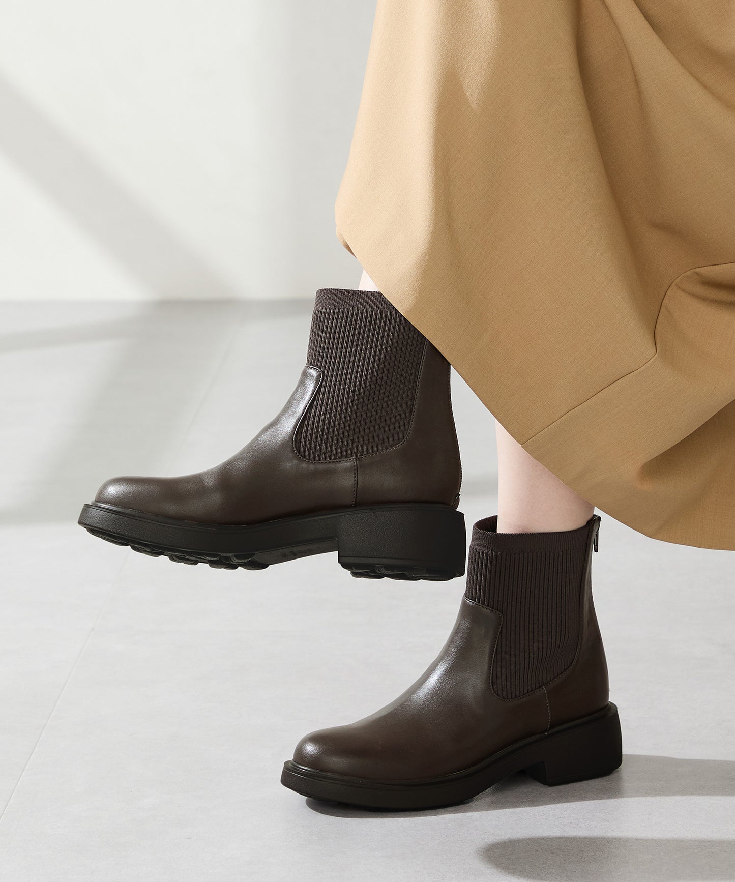 伸縮性のある柔らかなニット素材で足首周りのストレスフリーな履き心地を実現させたブーツ。程よいボリュームの厚底ソールは、軽いので疲れにくく、凹凸を付けたクッション入りのインソールで足裏の負担も軽減。バックファスナー仕様で着脱しやすく、後ろ姿からも縦のラインを綺麗に見せてくれる。絶妙な丈感が幅広いスタイリングにマッチしてくれる万能アイテム。