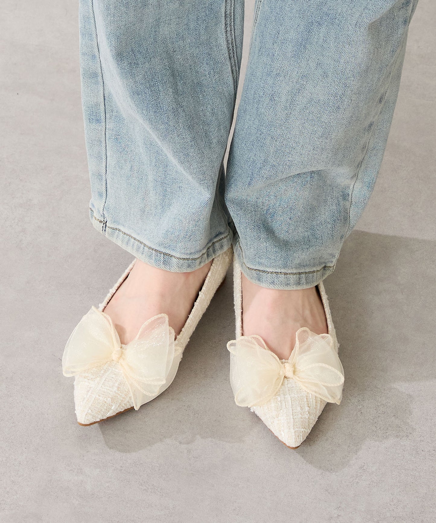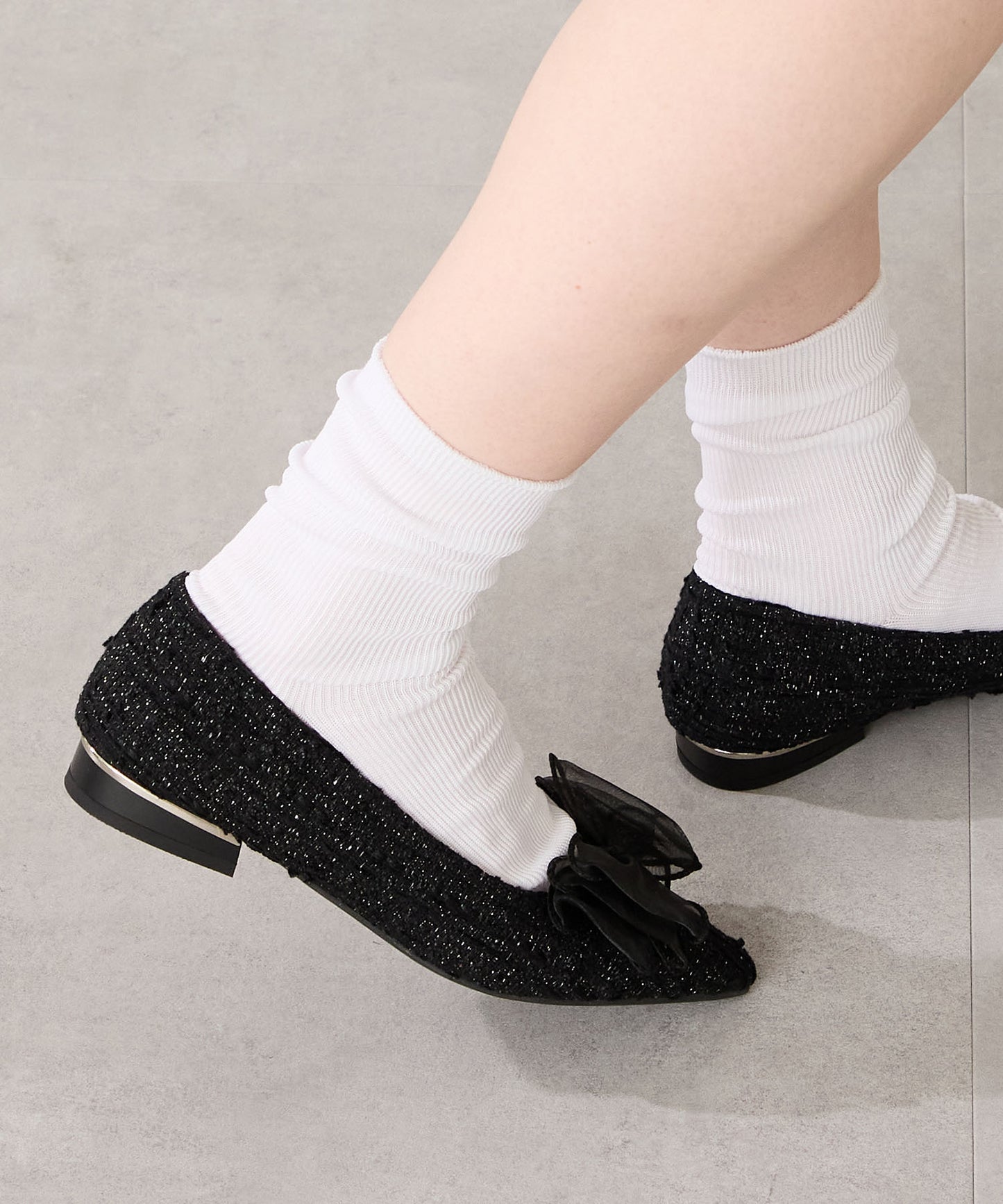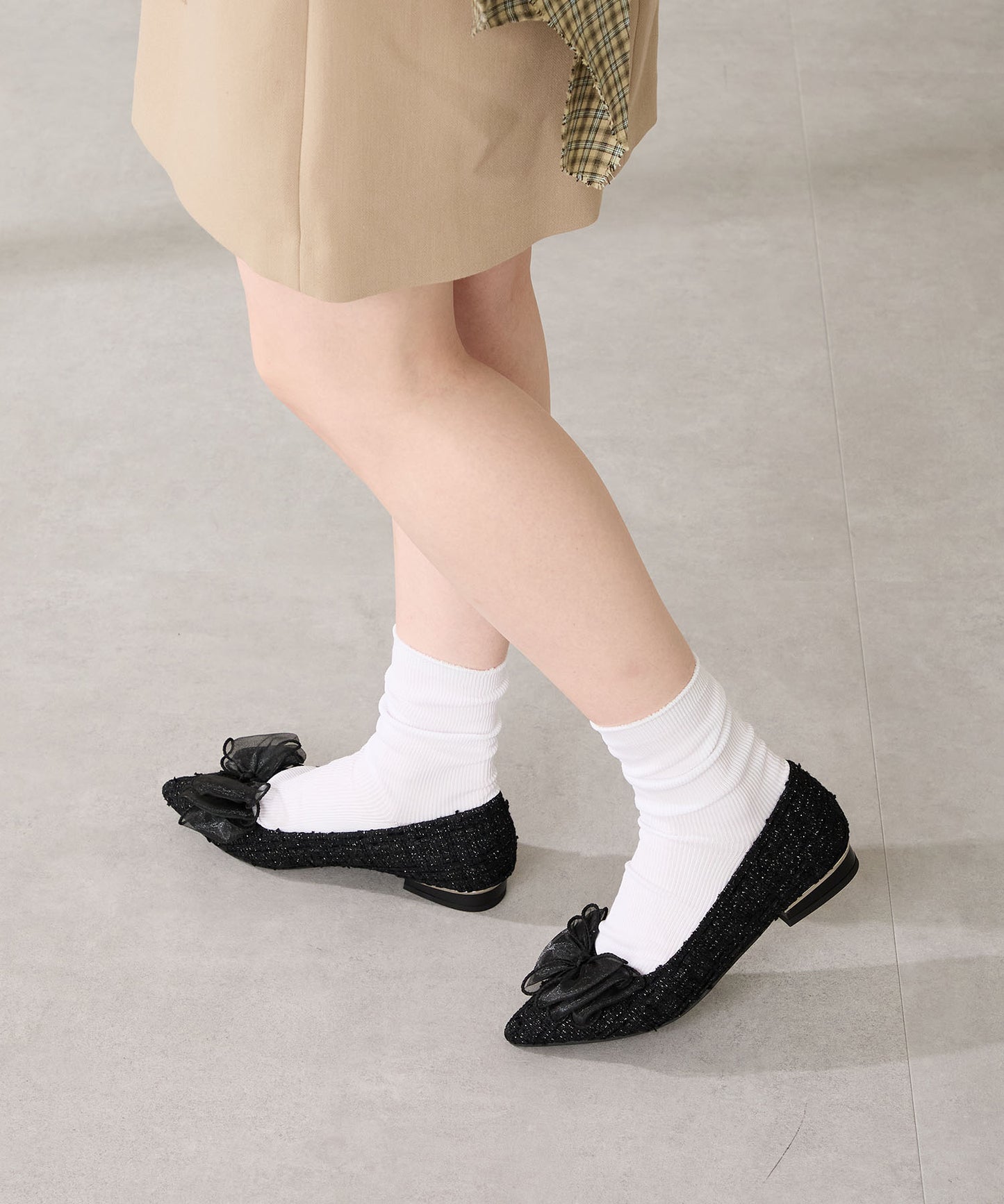 チュールのリボンと立体感のあるツイード素材がフェミニンなパンプスは、中敷にクッションが入っていて疲れにくく、フラットヒールで歩きやすいので足への負担も少なくお出かけにも大活躍なアイテム。ヒールのメタリックラインもポイントで女性らしさを楽しめるデザイン。スタイリングに取り入れやすい2色のカラー展開で日常使いはもちろん、パーティシーンにもおすすめ。