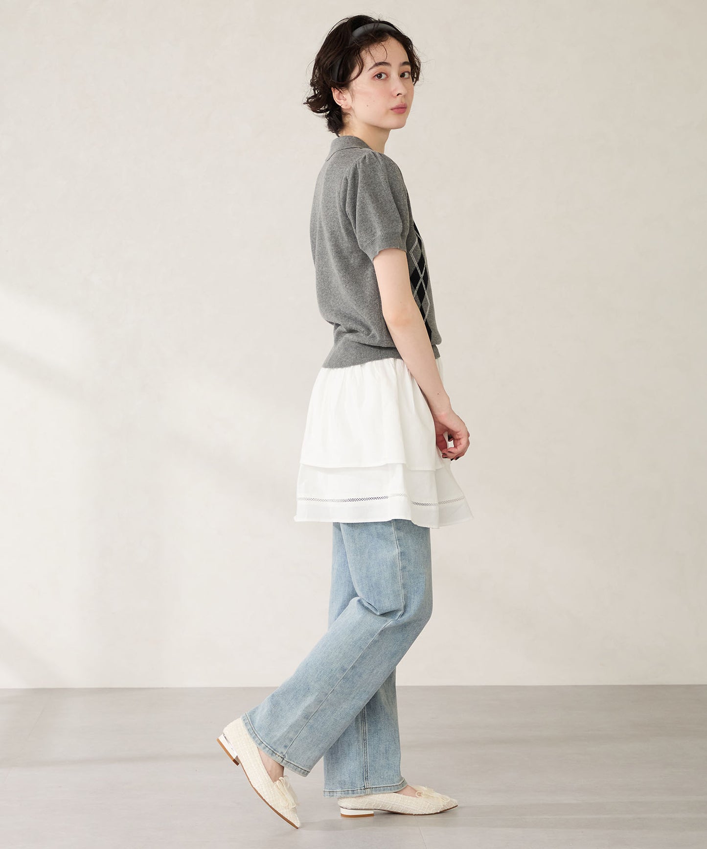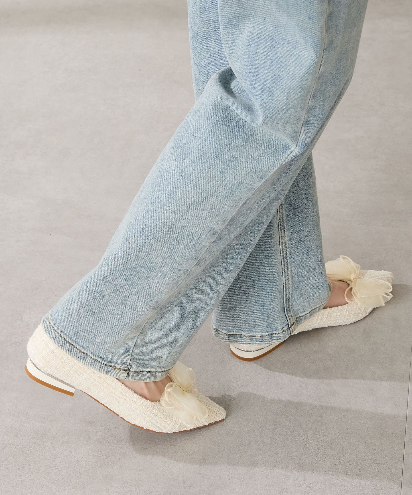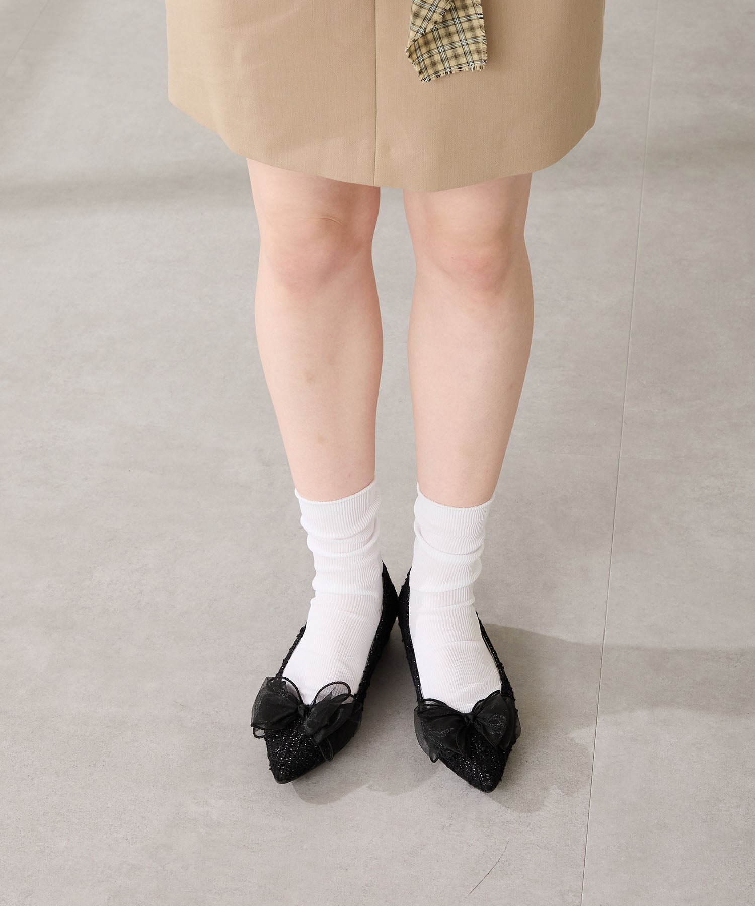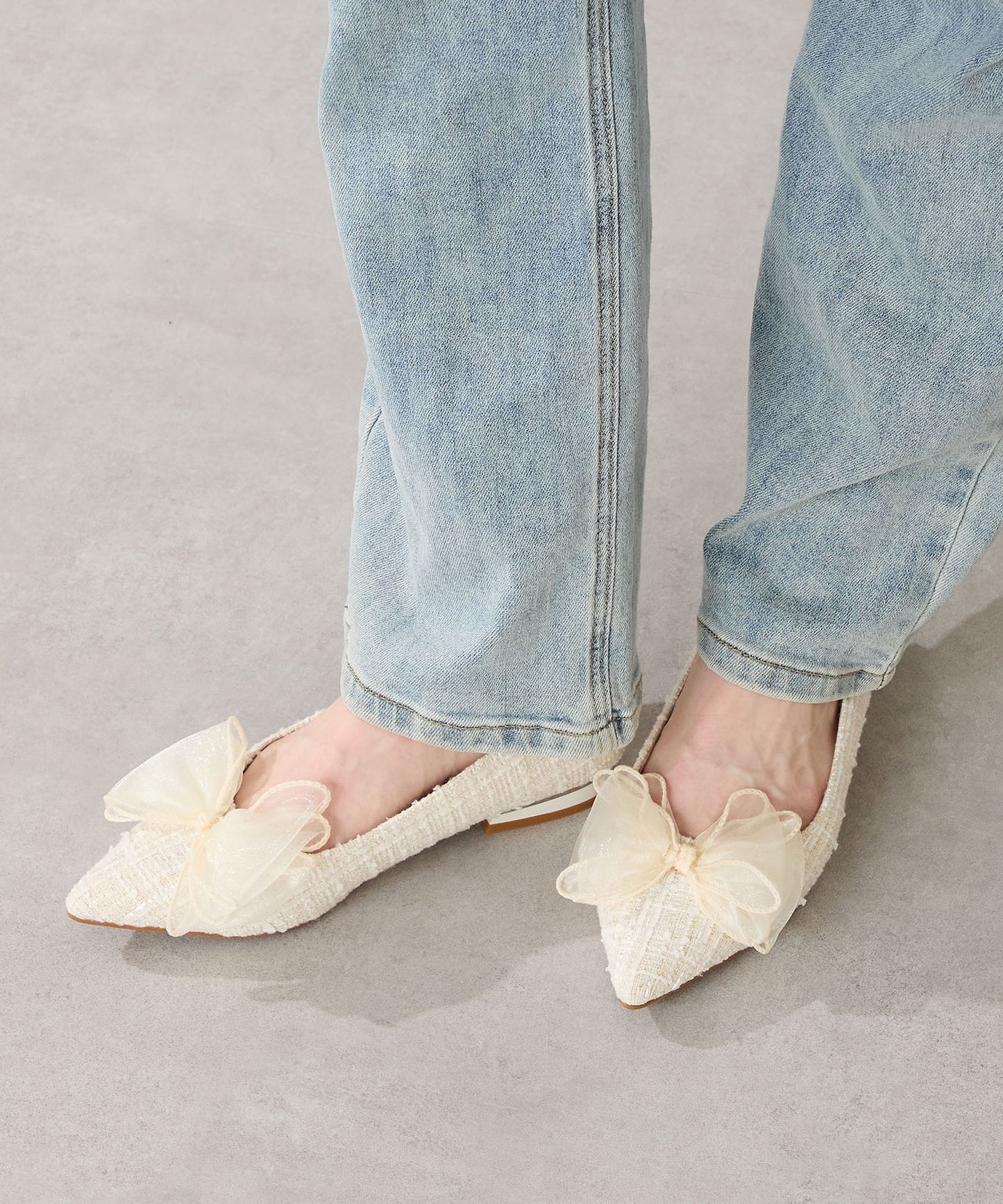 チュールのリボンと立体感のあるツイード素材がフェミニンなパンプスは、中敷にクッションが入っていて疲れにくく、フラットヒールで歩きやすいので足への負担も少なくお出かけにも大活躍なアイテム。ヒールのメタリックラインもポイントで女性らしさを楽しめるデザイン。スタイリングに取り入れやすい2色のカラー展開で日常使いはもちろん、パーティシーンにもおすすめ。