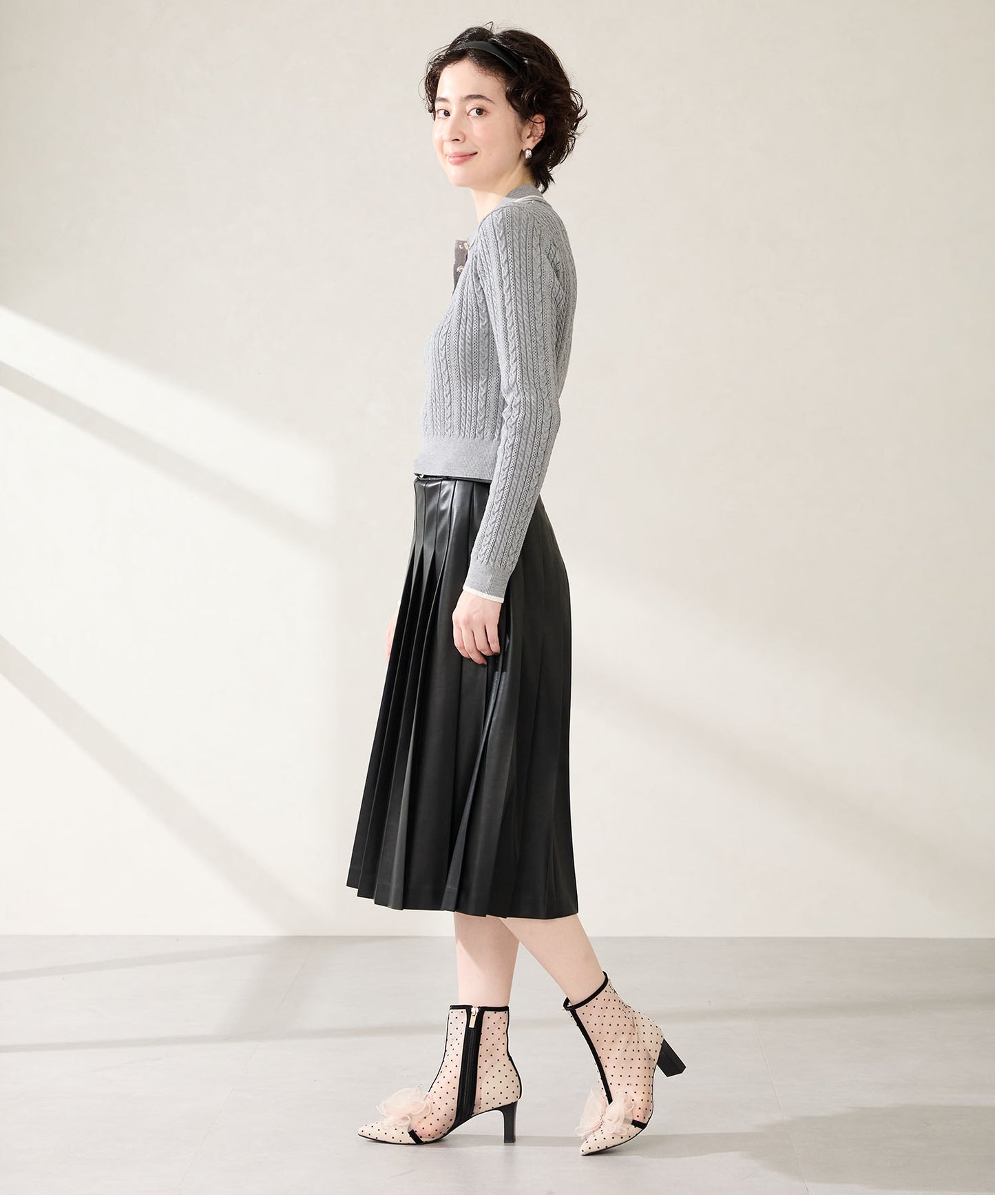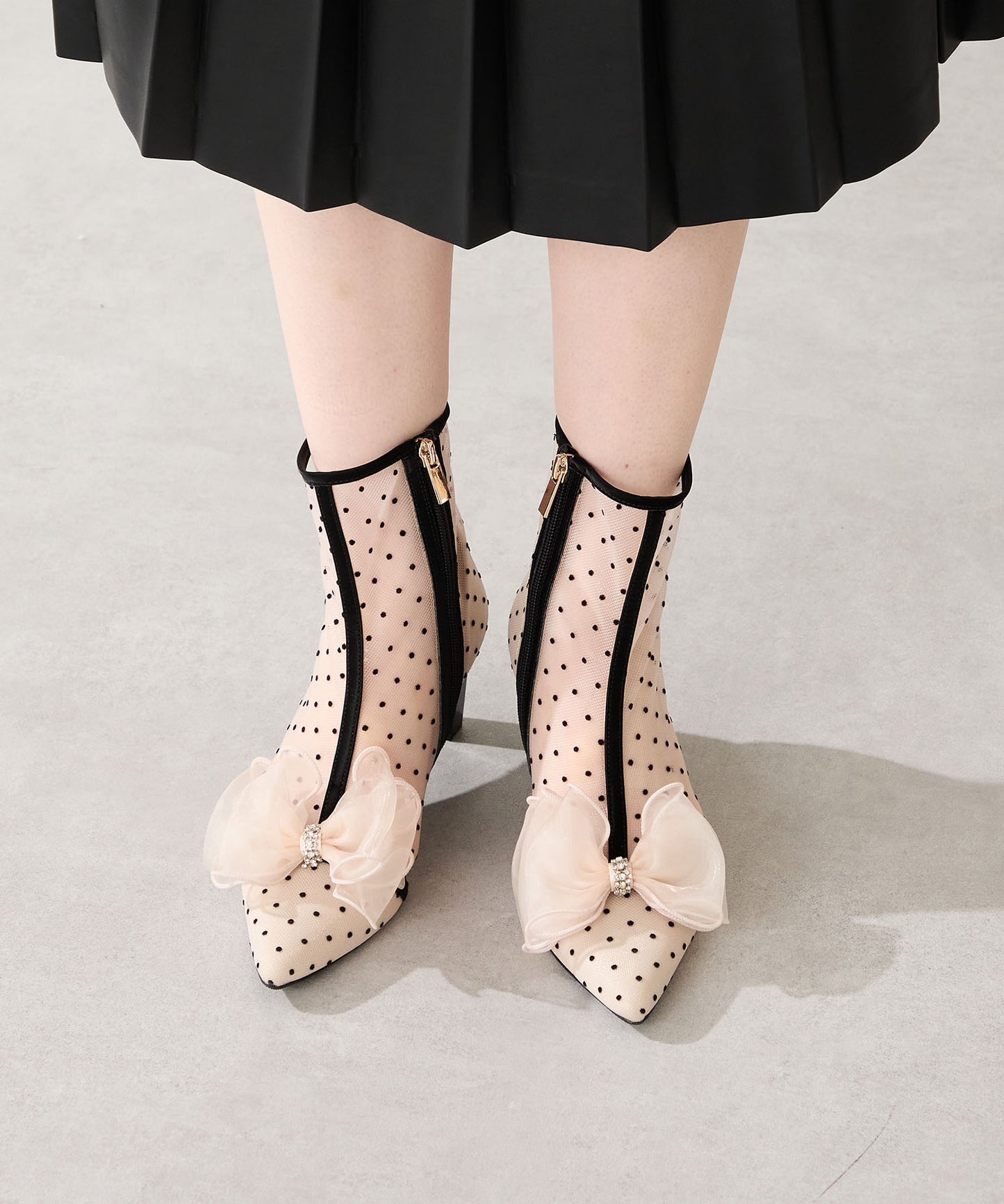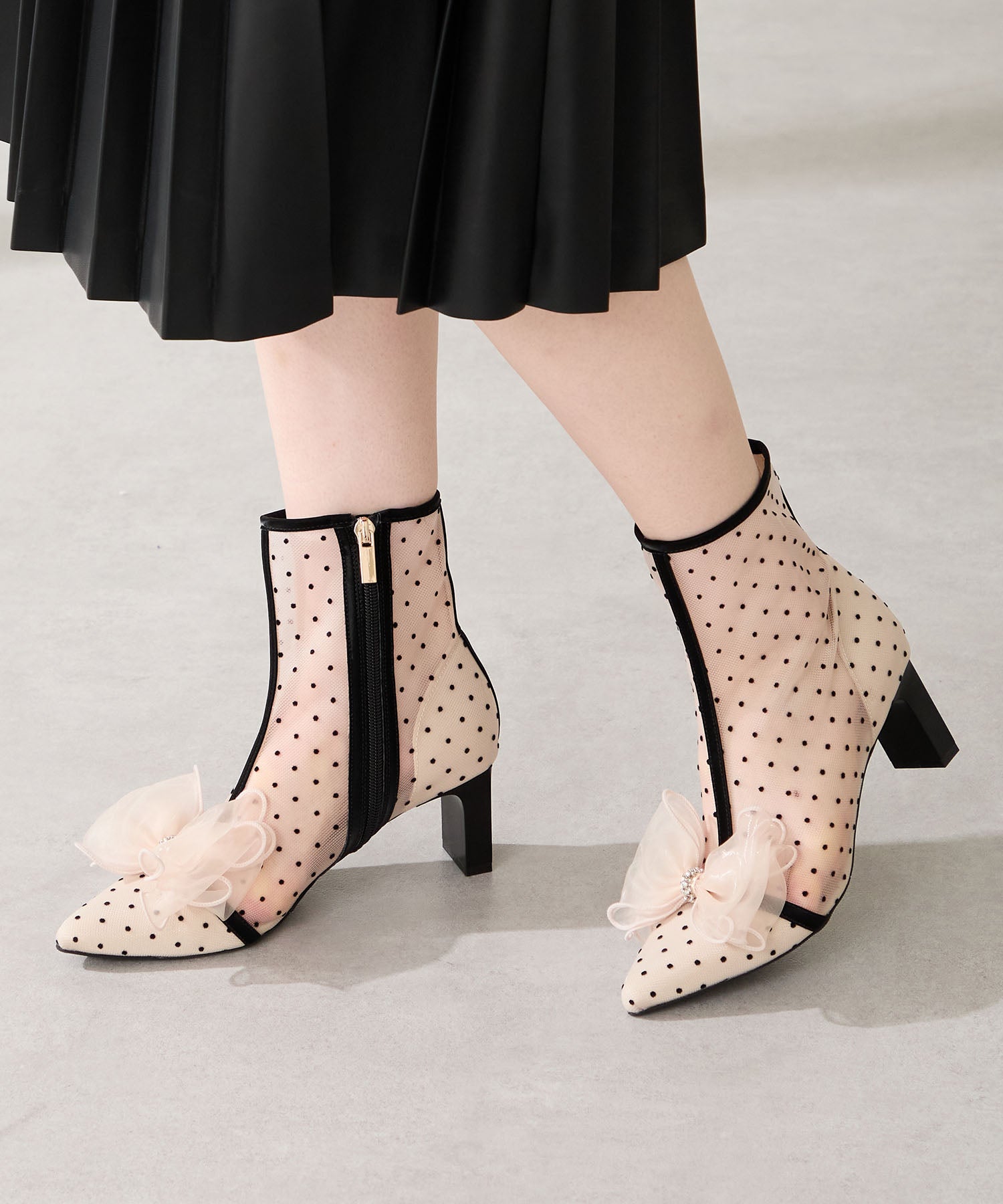 細かいドットと存在感のあるチュールリボンが目を惹くデザイン性の高いブーツは、涼しげなマテリアルでトレンド感が楽しめるアイテム。透け感のあるデザインとすっきりとしたシルエットは足元を上品に格上げ。程よい高さのプレートヒールは安定感もあり履きやすい1足で、シンプルなスタイリングのアクセントとして、一気に華やかでレディライクに仕上げてくれる。