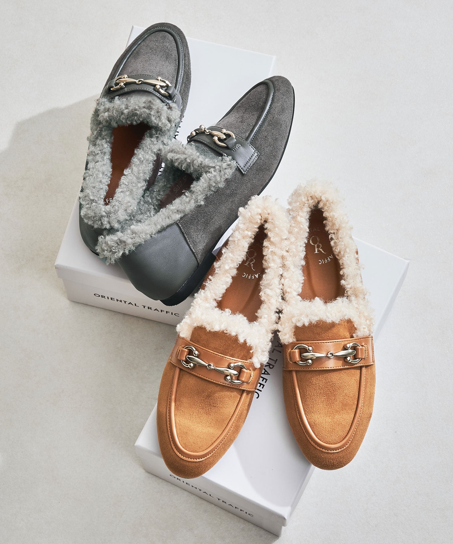 履き口に付けたボアがポイントのローファーは履くだけでシーズンライクな装いに。丸みのあるビットモチーフが程よい存在感を演出。優しい印象のスエード素材のアッパーにスムースの切替を付けることでメリハリと立体感をプラス。踵を踏んでも履けるバブーシュ仕様で、ストレスフリーな履き心地に。着まわしの効く2色展開で普段のコーディネートをアップデートしてくれること間違いなし。