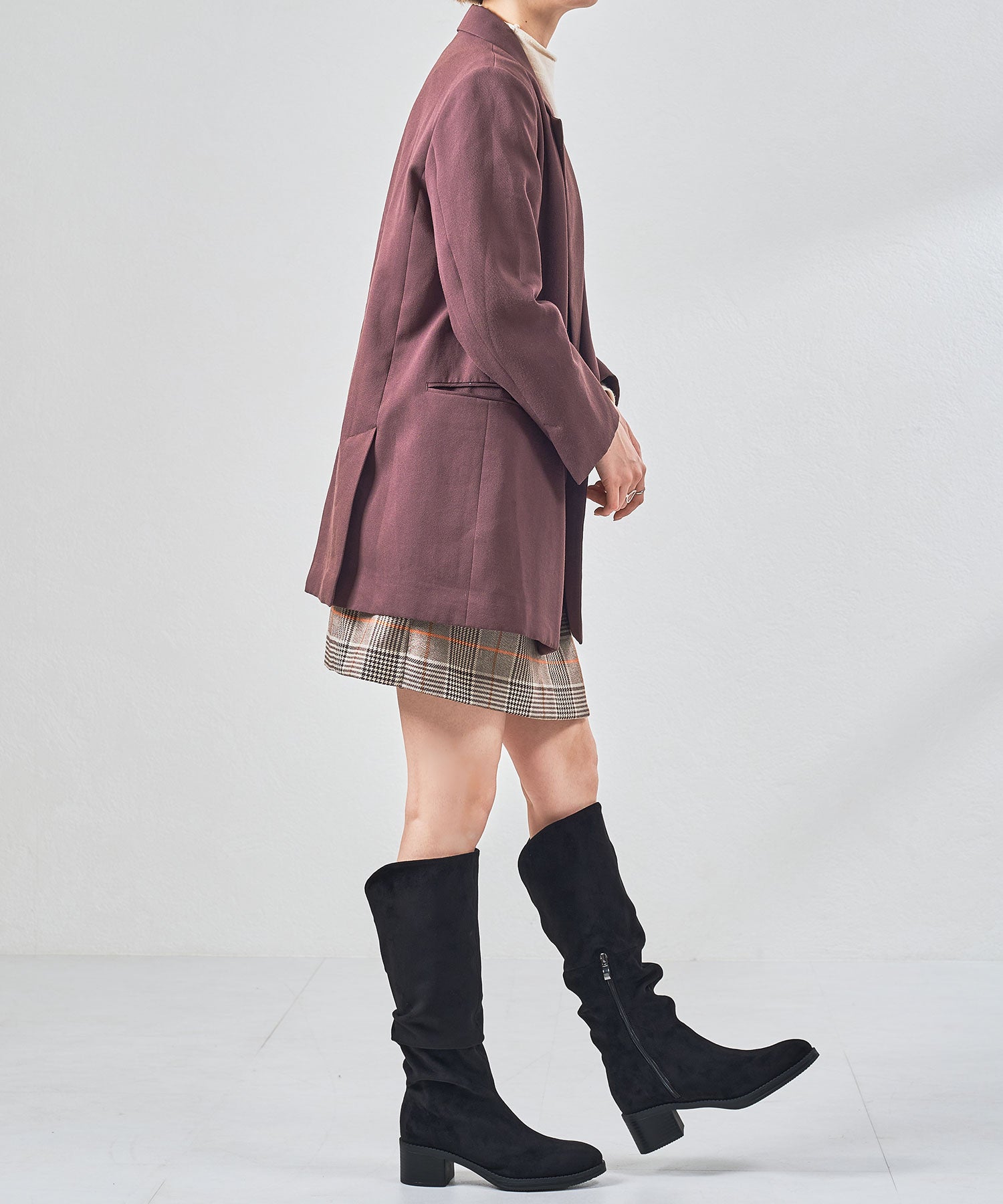 ルーズな足首周りのデザインがお洒落を格上げしてくれるロングブーツ。細身のトゥで足先を綺麗に見せながらもチャンキーヒールなので安定感があり歩きやすい。バックスリットで抜け感を出しつつ、履くだけで、すらっとした真っすぐな足元を演出し細見え効果も抜群。裏側が温かみのある起毛素材で寒い冬でも大活躍すること間違いなし。