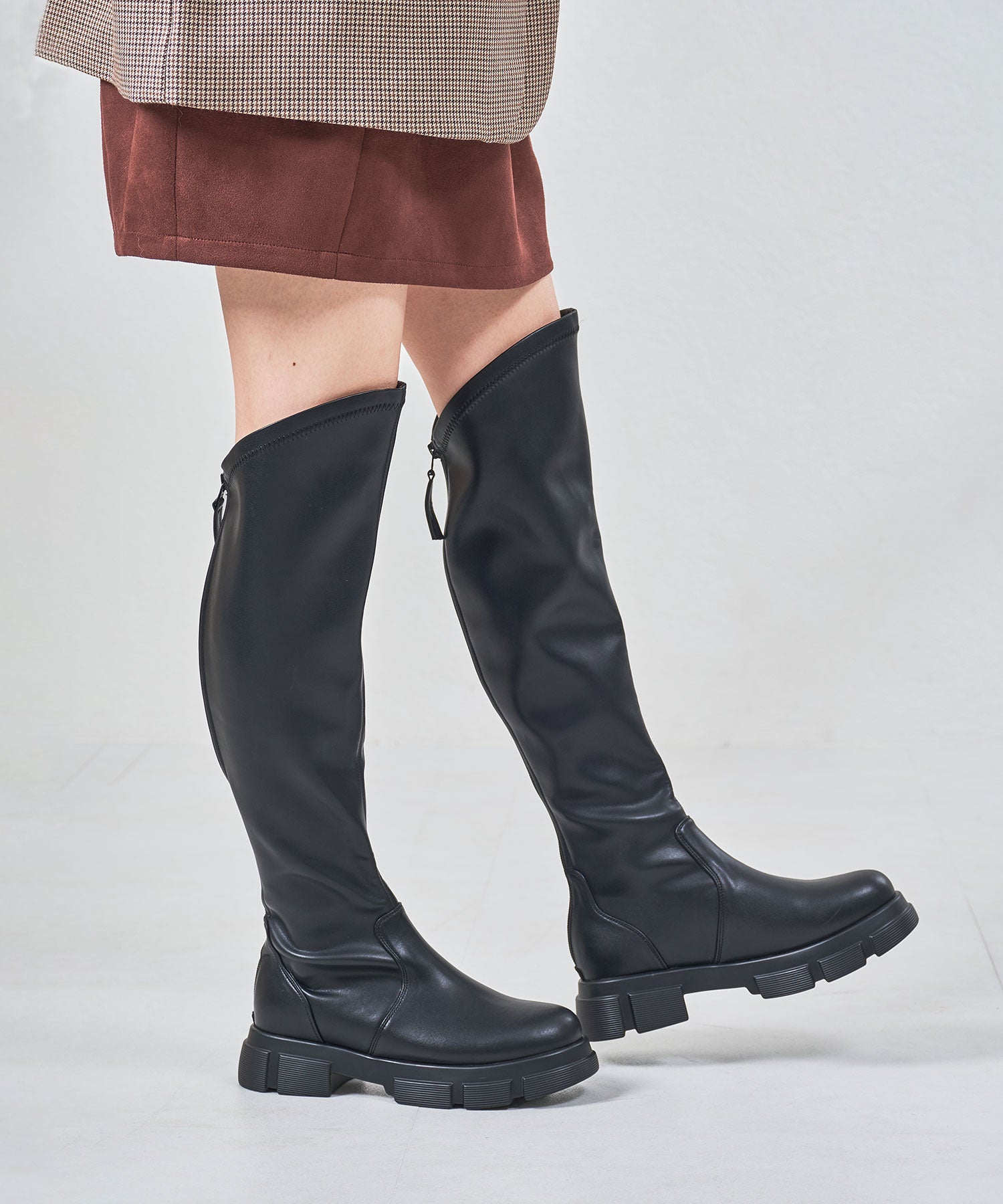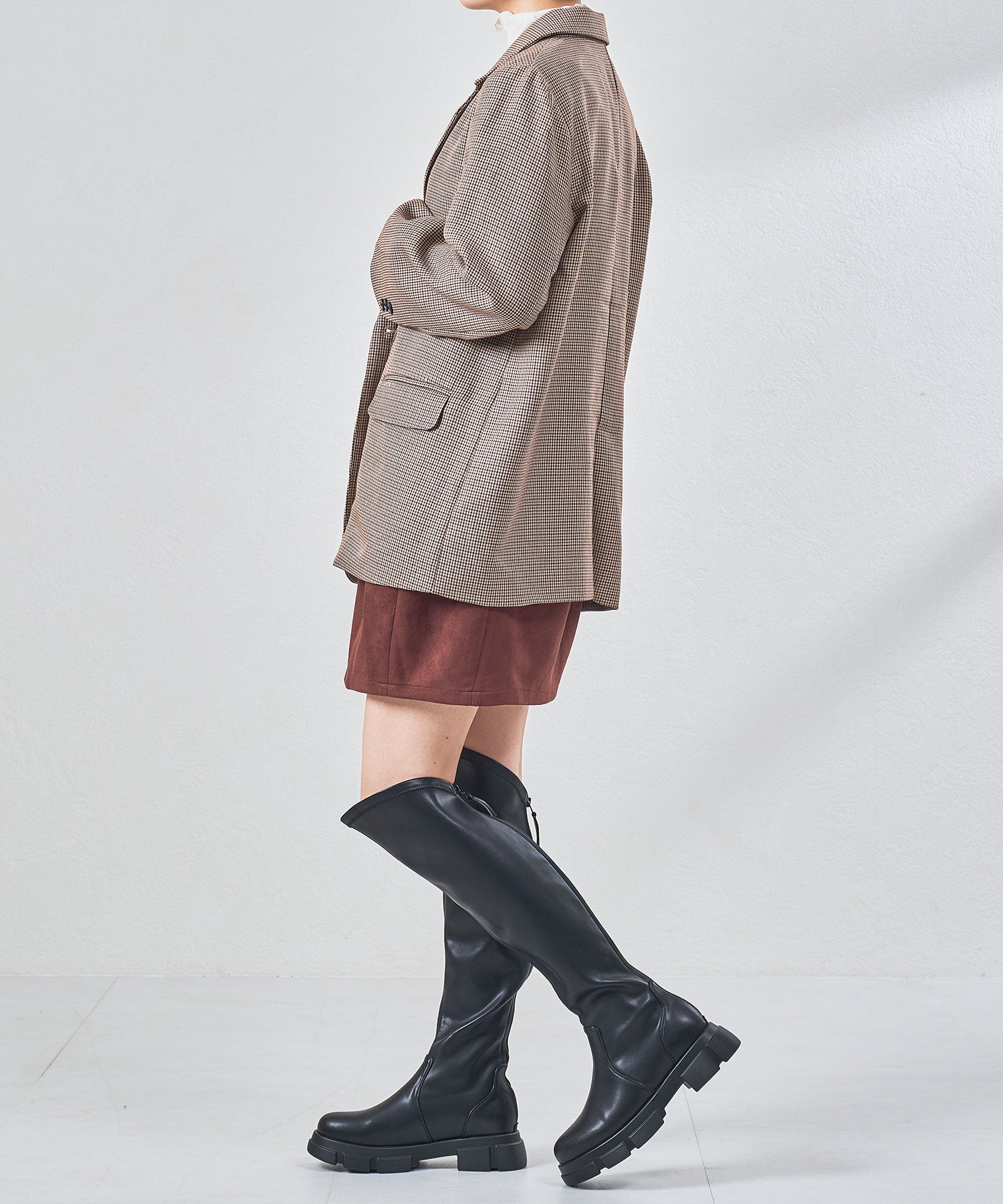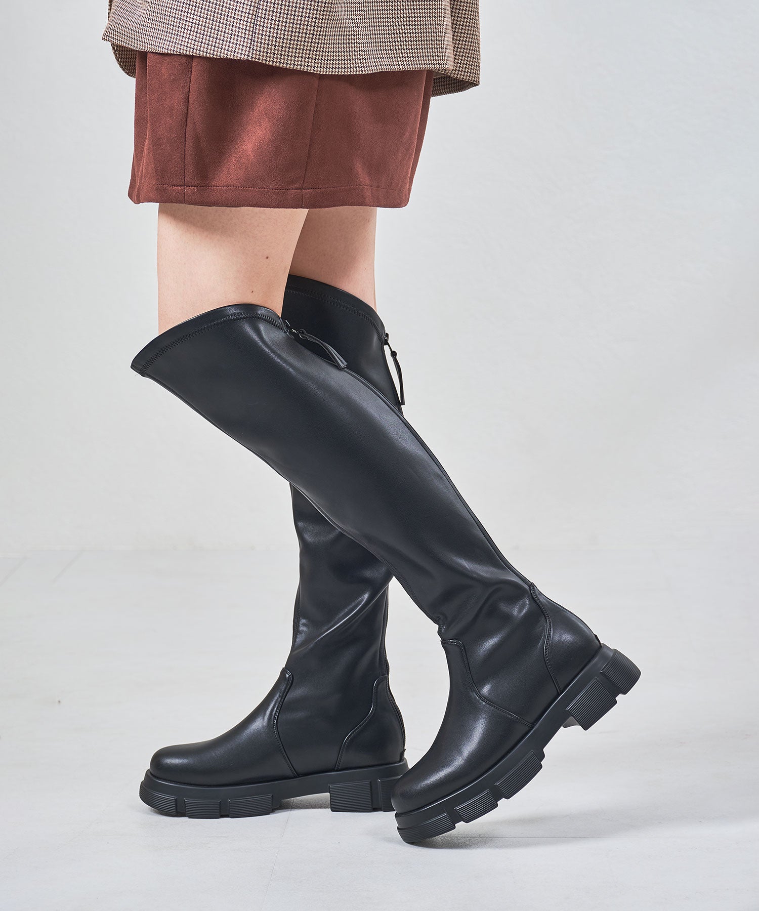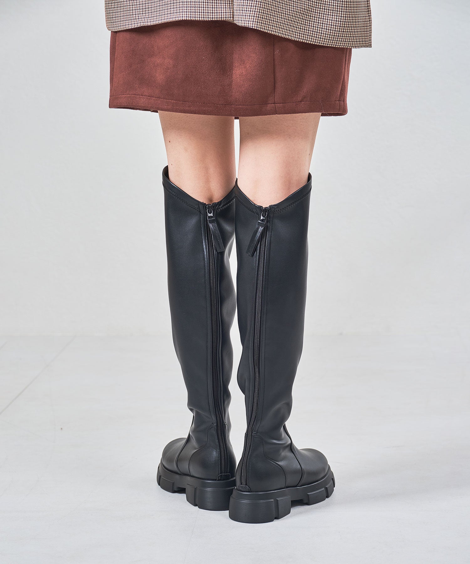 後ろ下がりのデザインがユニークなカジュアルに履けるニーハイブーツ。前側は膝上まで覆いつつ後ろに向かっての大胆なカットラインが目を惹き、サイドやバックスタイルを洗練された印象にしてくれる。フルバックファスナー付きで見た目以上に足入れが簡単にできるアイテム。内側全体はベロア素材なので優しい肌触りで快適な履き心地。