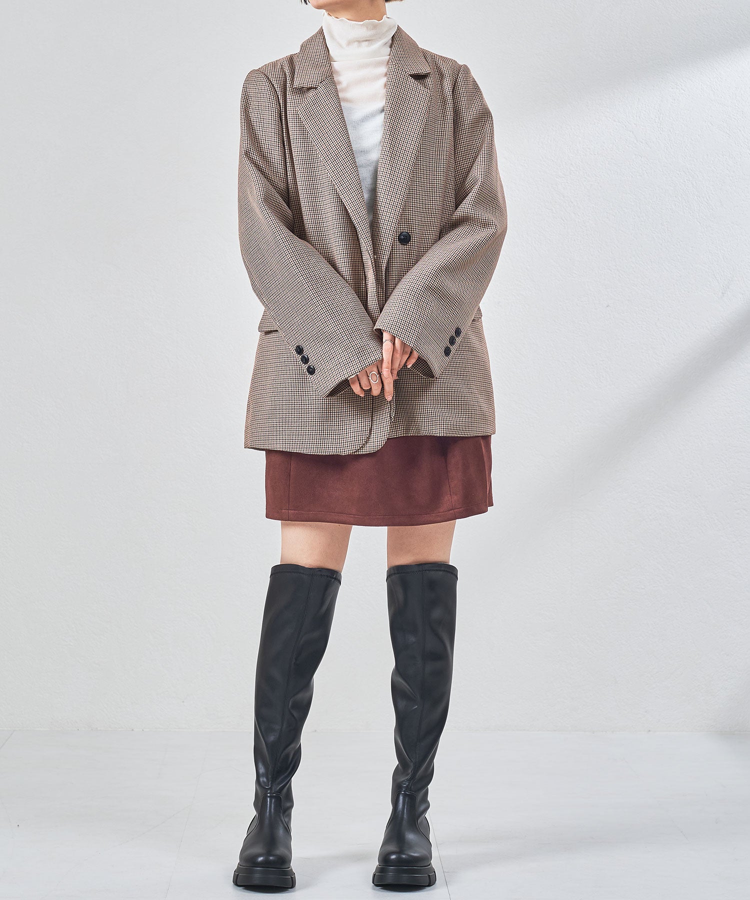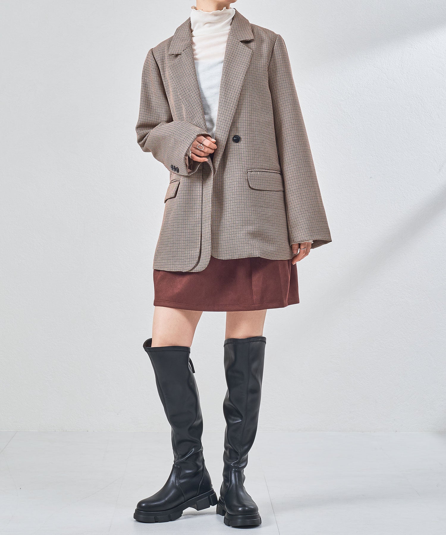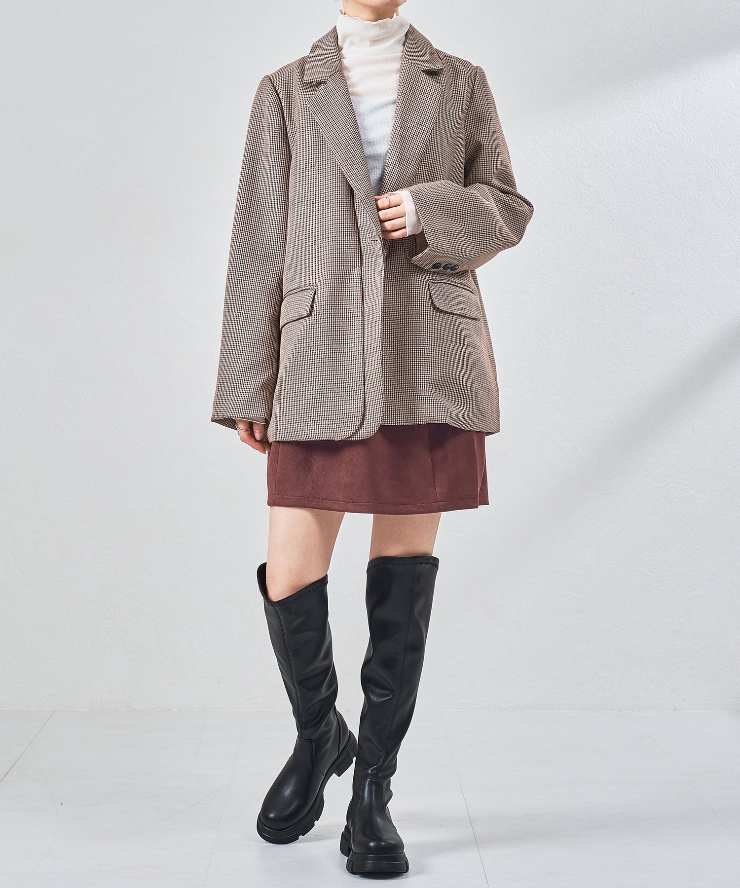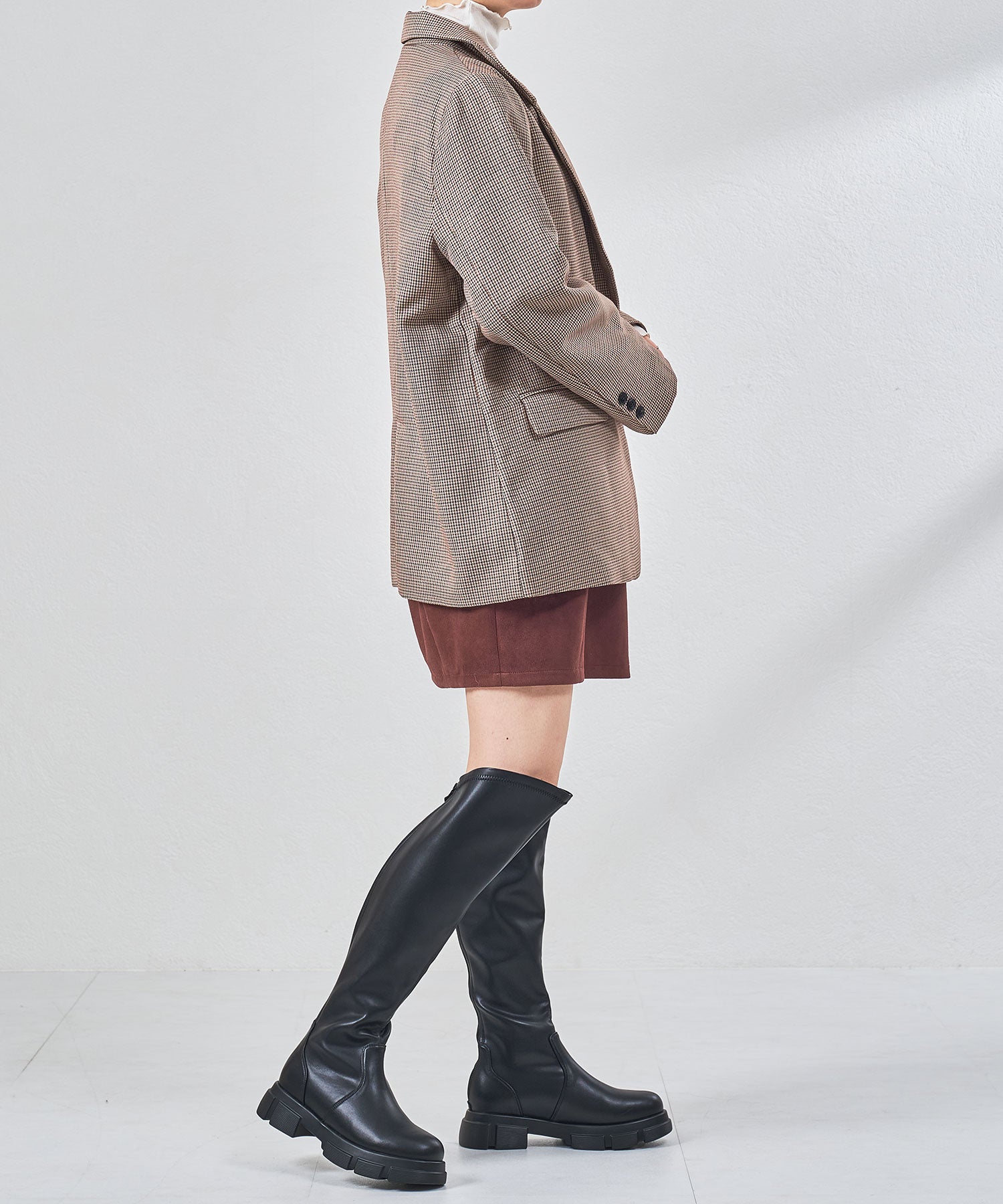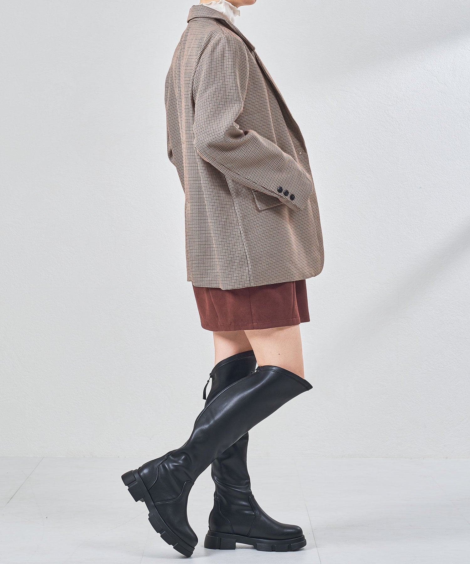 後ろ下がりのデザインがユニークなカジュアルに履けるニーハイブーツ。前側は膝上まで覆いつつ後ろに向かっての大胆なカットラインが目を惹き、サイドやバックスタイルを洗練された印象にしてくれる。フルバックファスナー付きで見た目以上に足入れが簡単にできるアイテム。内側全体はベロア素材なので優しい肌触りで快適な履き心地。