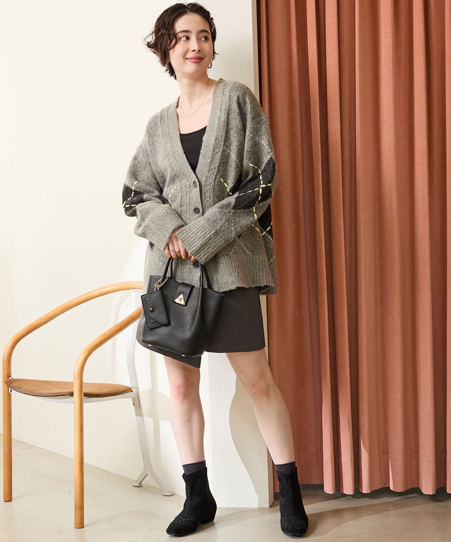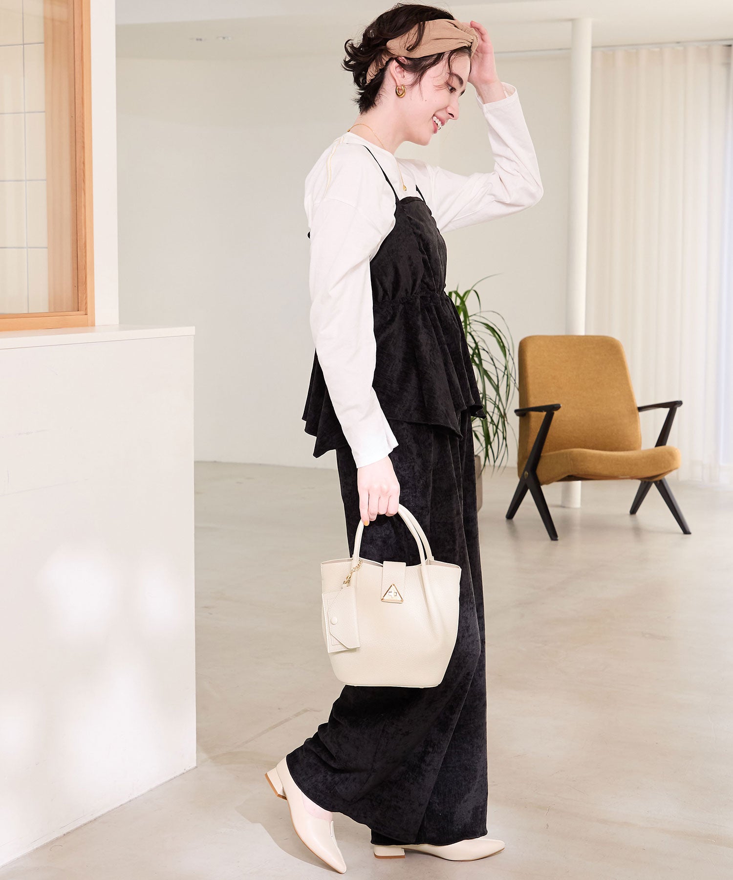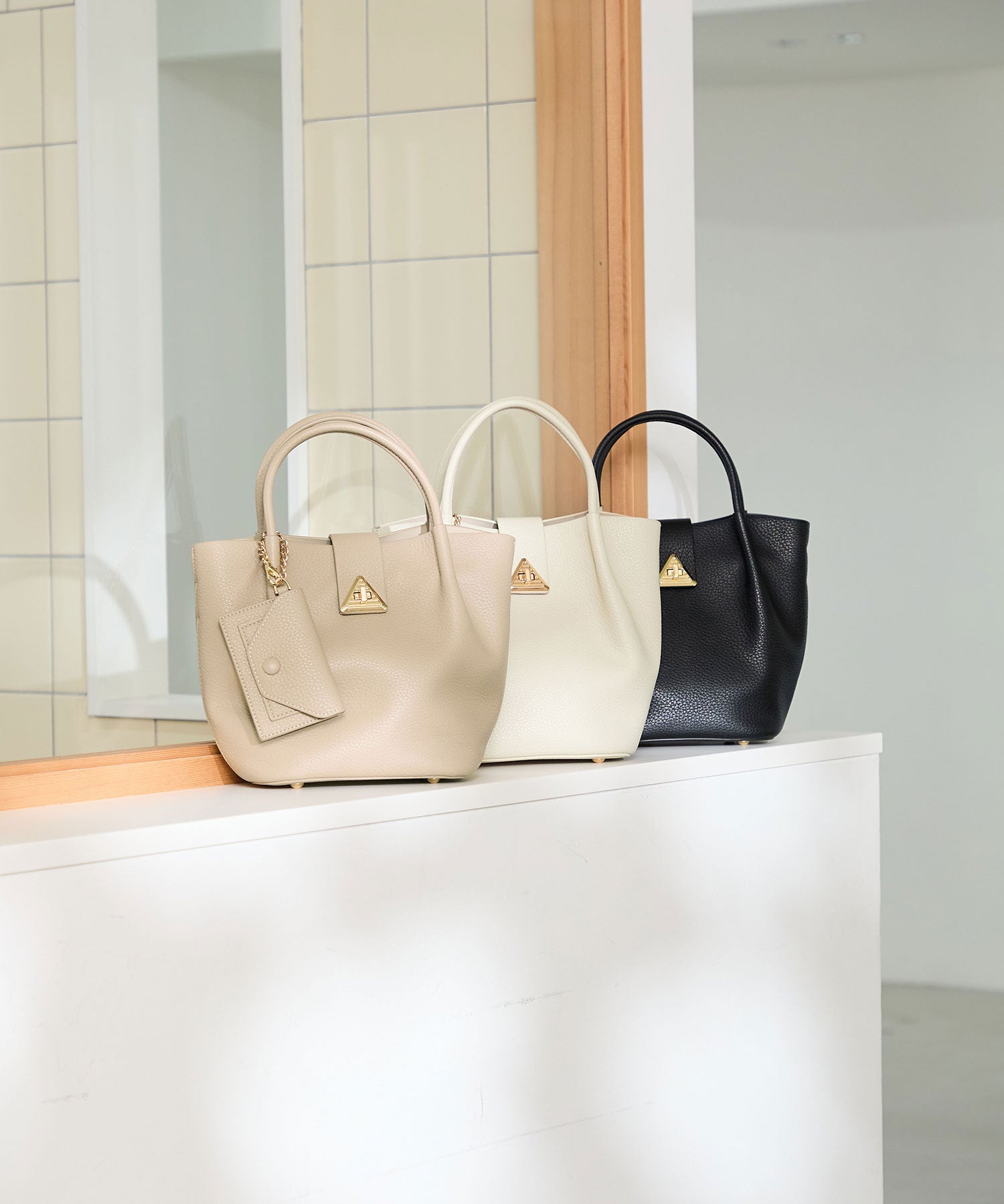 三角形のバックルモチーフや立体的なストラップデザインが高見えするハンドバッグは、シボ感のある素材を使用し上品な印象に。コンパクトなシルエットながらマチのある底回りで見た目以上に収納力があるのも嬉しい。取り外し可能なショルダーやポーチ付きで気分によってスタイルを変えて楽しめるのもポイント。