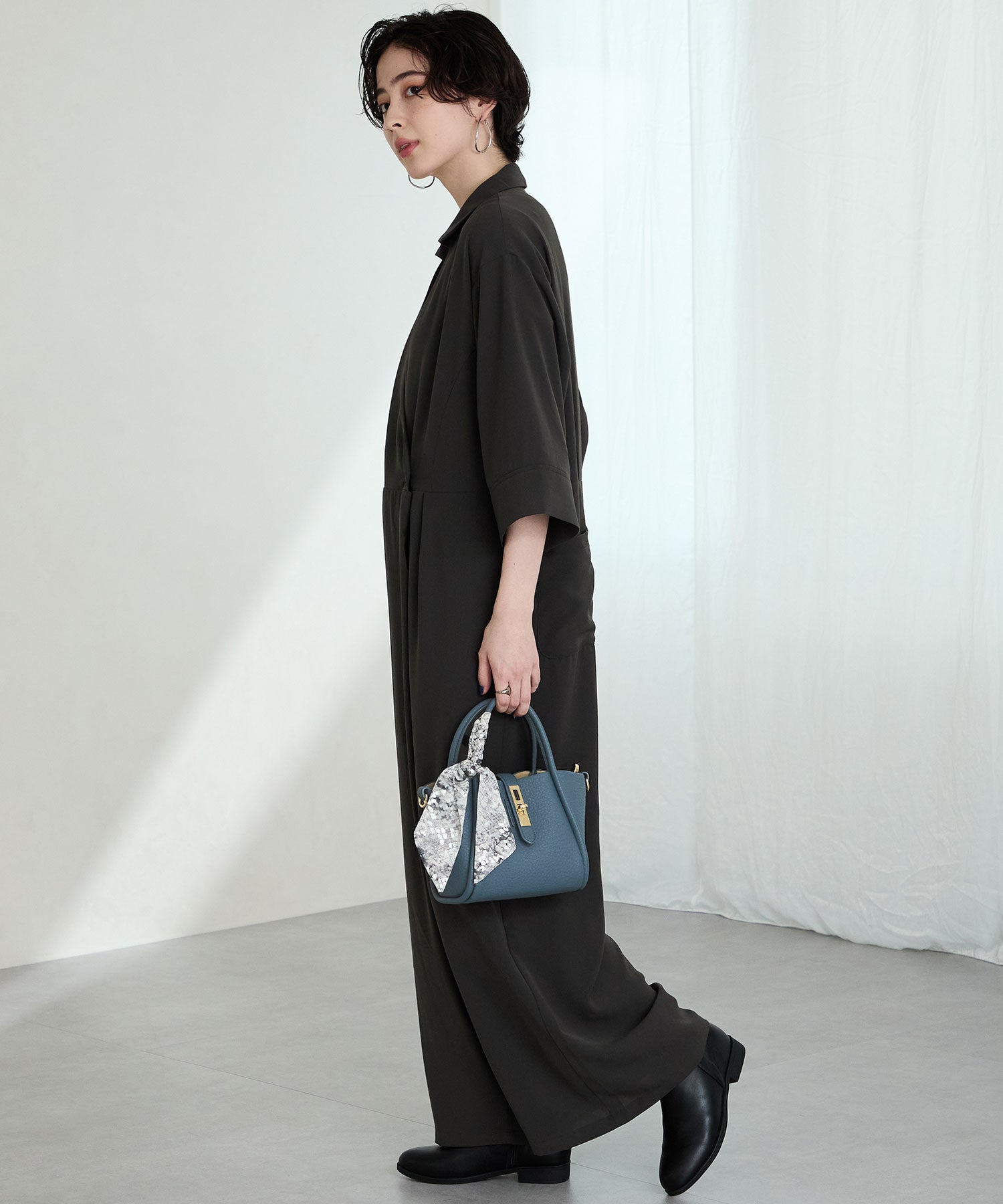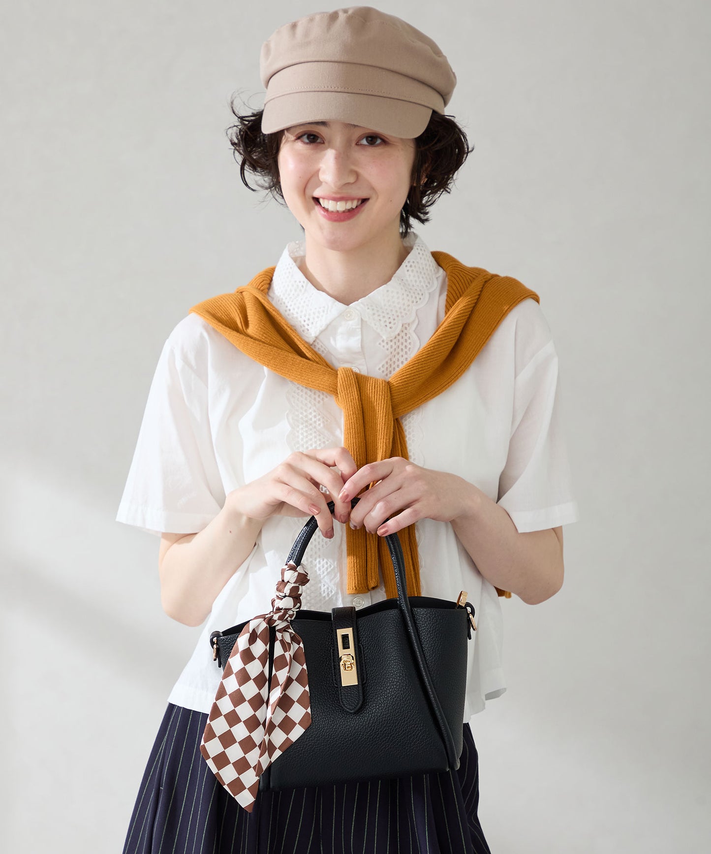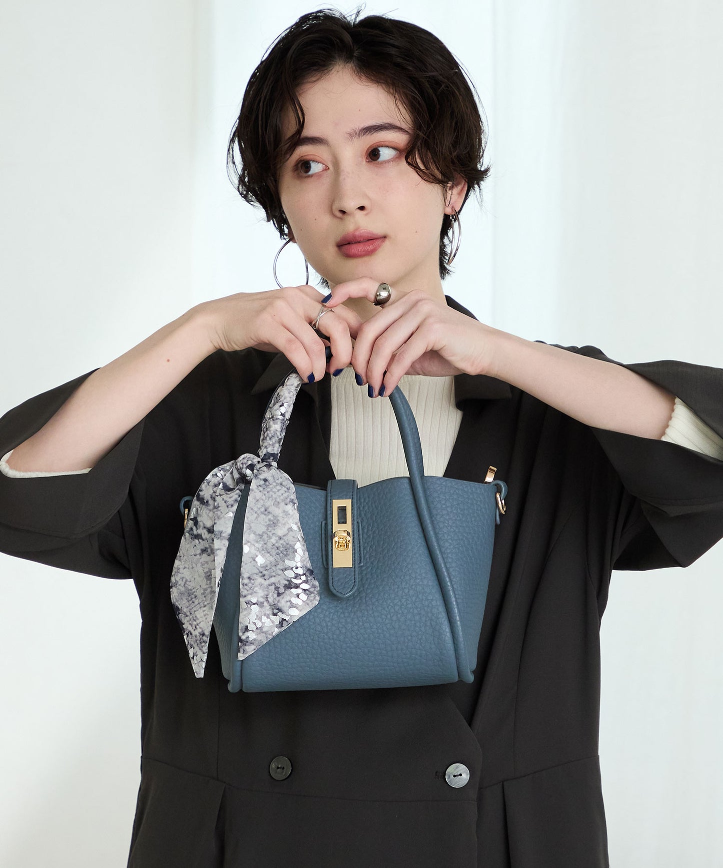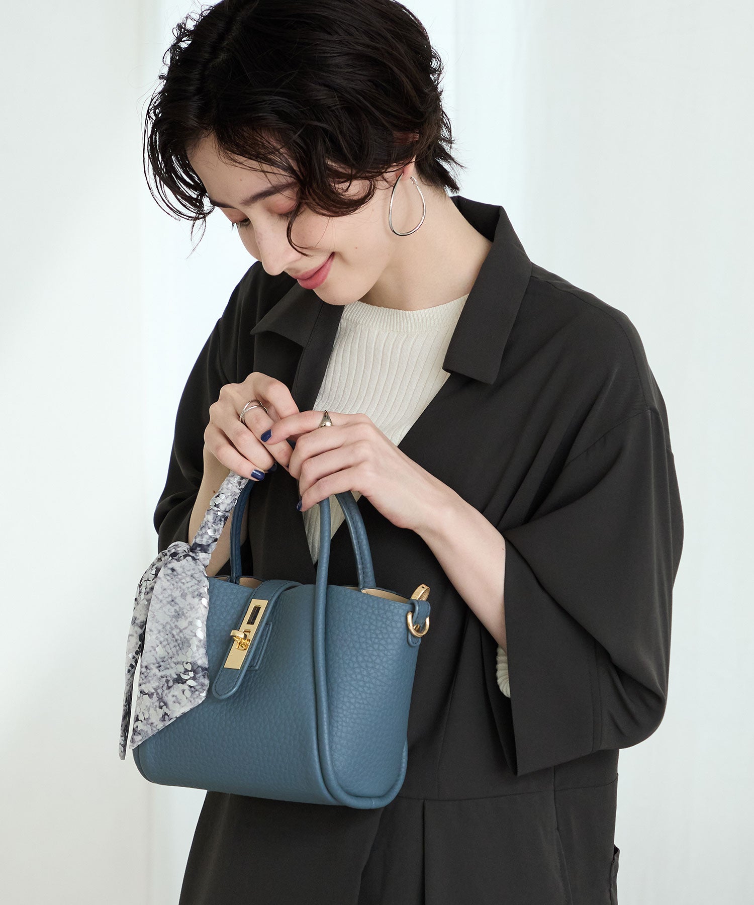 ブラックにはブロック柄、ベージュにはストライプ、ブルーにはニュアンスのあるアニマル柄とカラー毎にスカーフを変えたこだわりの詰まったバッグ。中にはファスナー付きの仕切りポケットが付いているので外から中身が見えないのが嬉しい。間口の留め具は2段階で調整が可能なので荷物が多い日も少ない日もしっかりと閉めることが出来る。