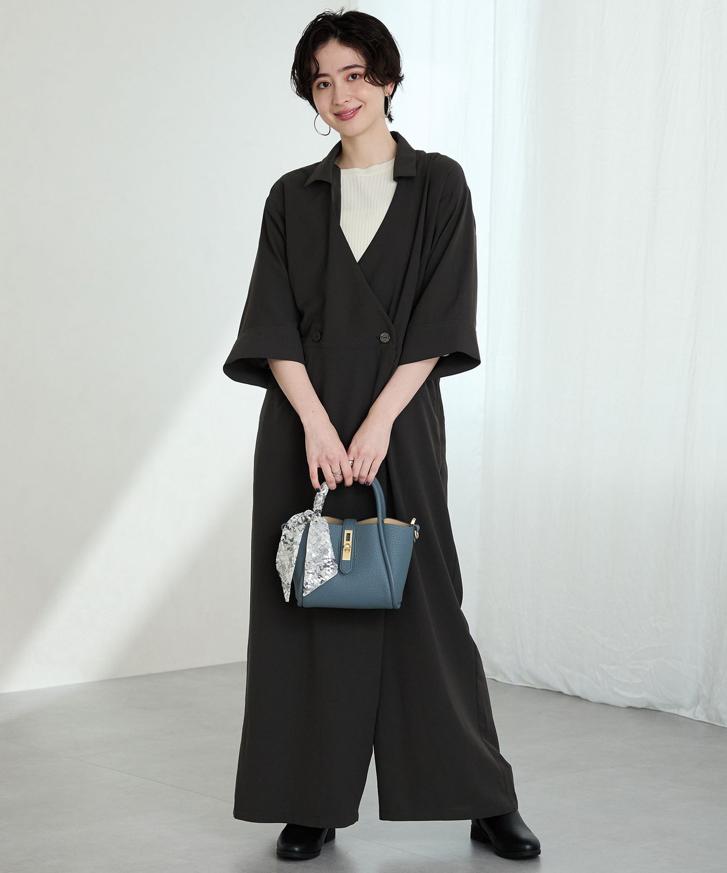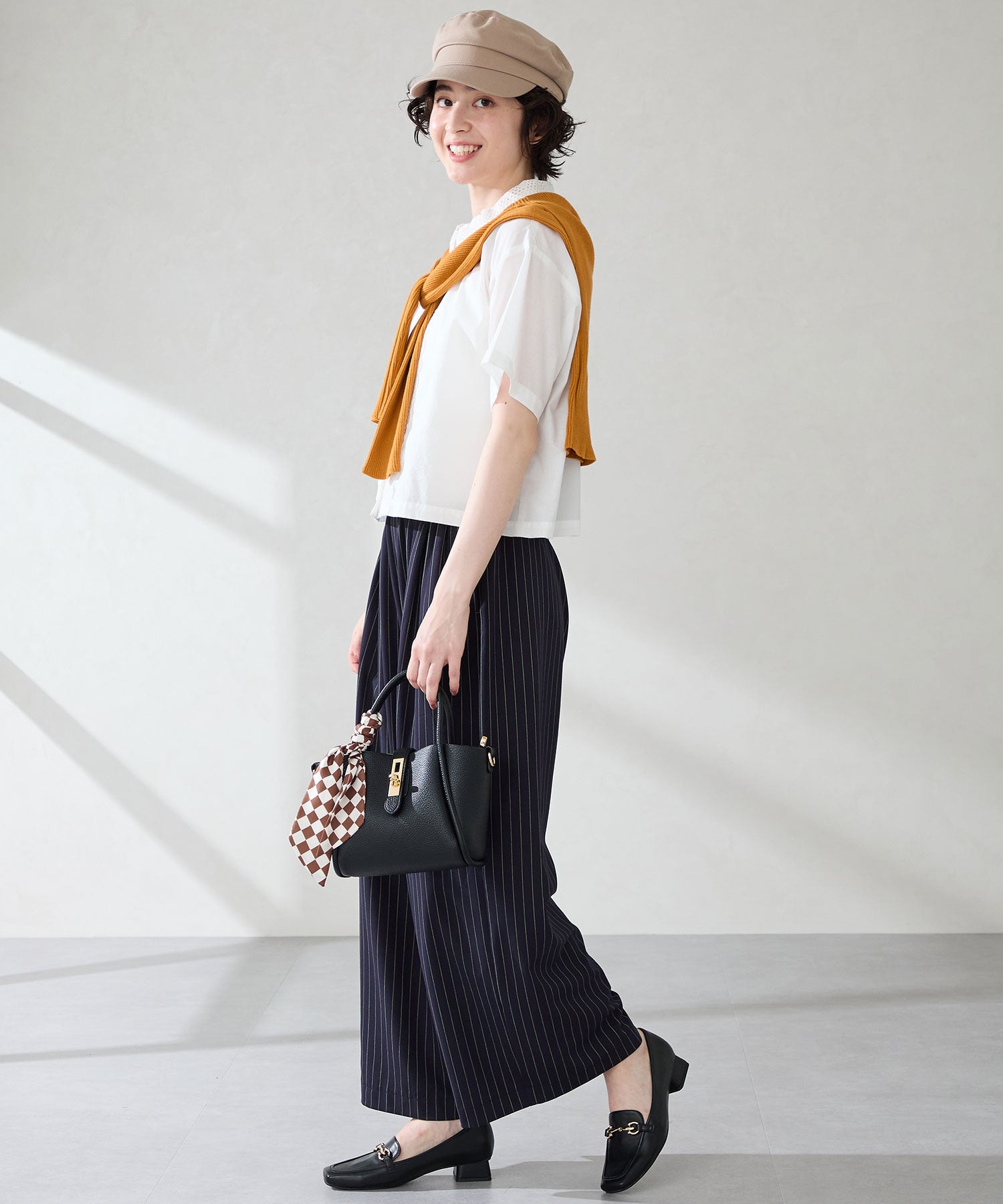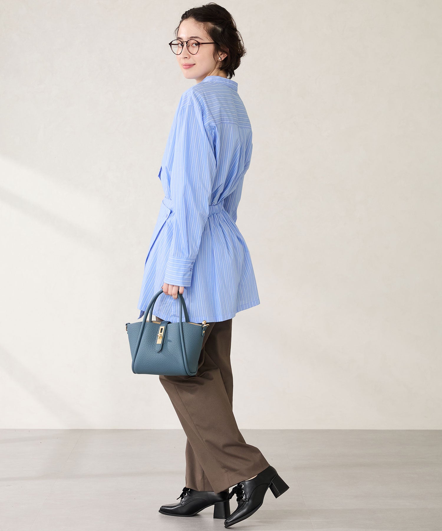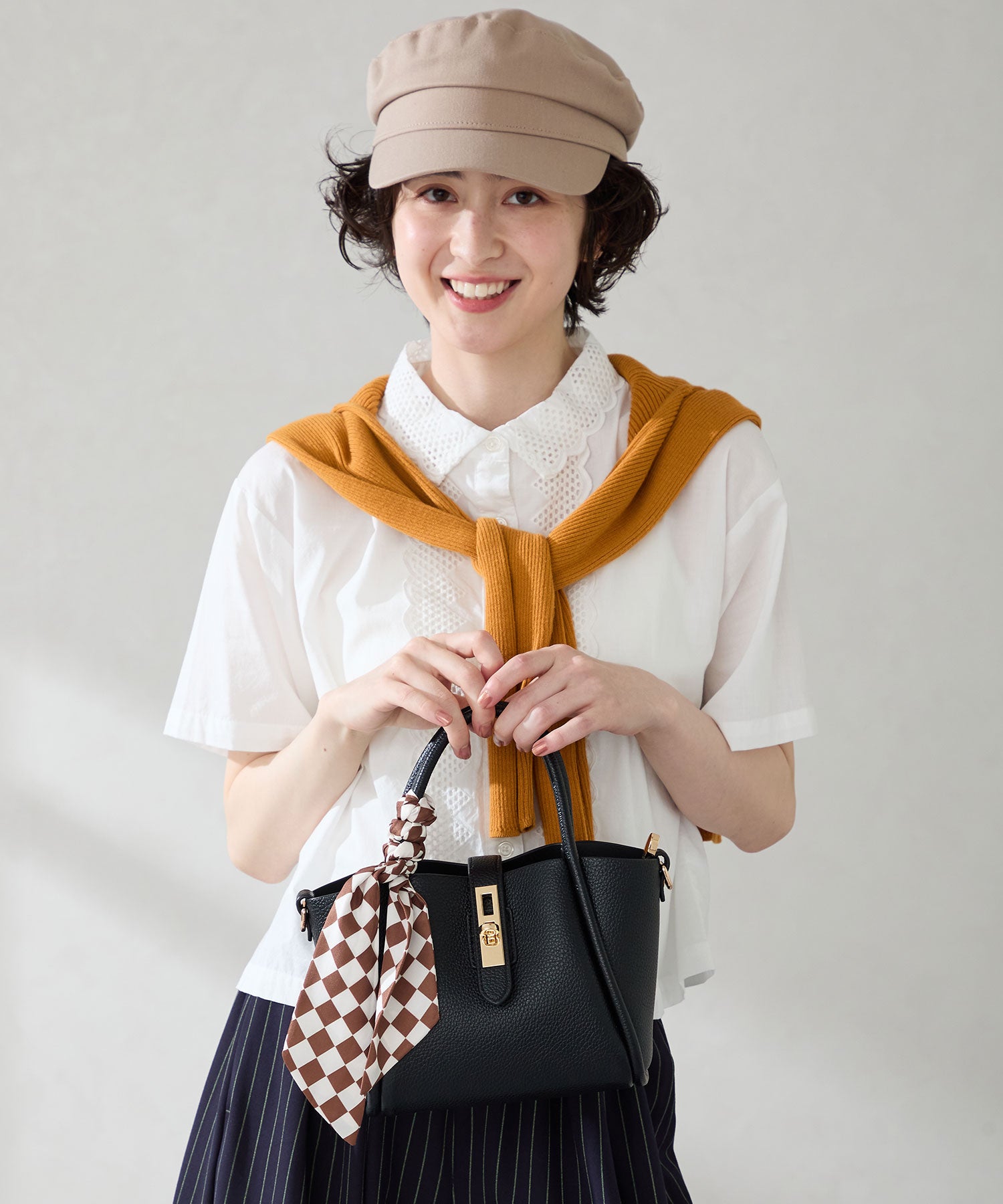 ブラックにはブロック柄、ベージュにはストライプ、ブルーにはニュアンスのあるアニマル柄とカラー毎にスカーフを変えたこだわりの詰まったバッグ。中にはファスナー付きの仕切りポケットが付いているので外から中身が見えないのが嬉しい。間口の留め具は2段階で調整が可能なので荷物が多い日も少ない日もしっかりと閉めることが出来る。