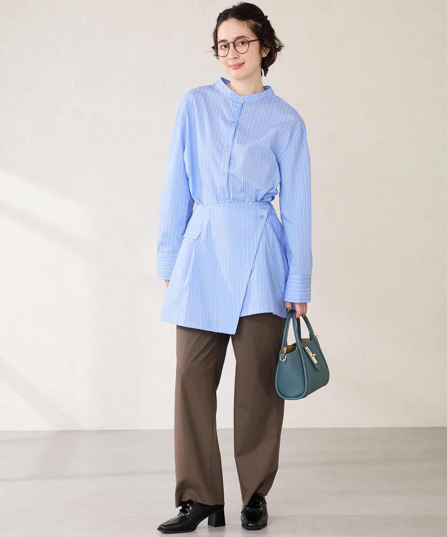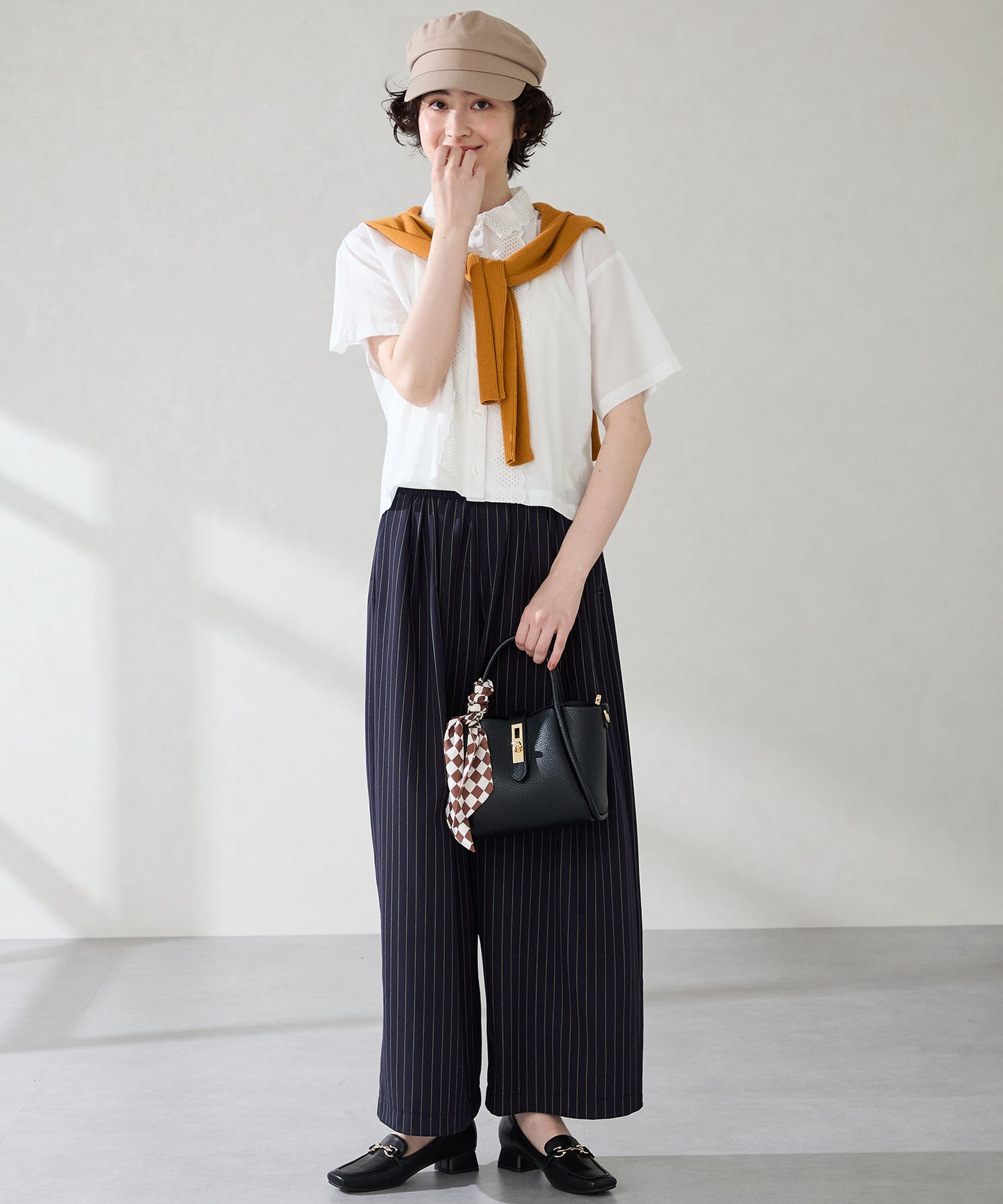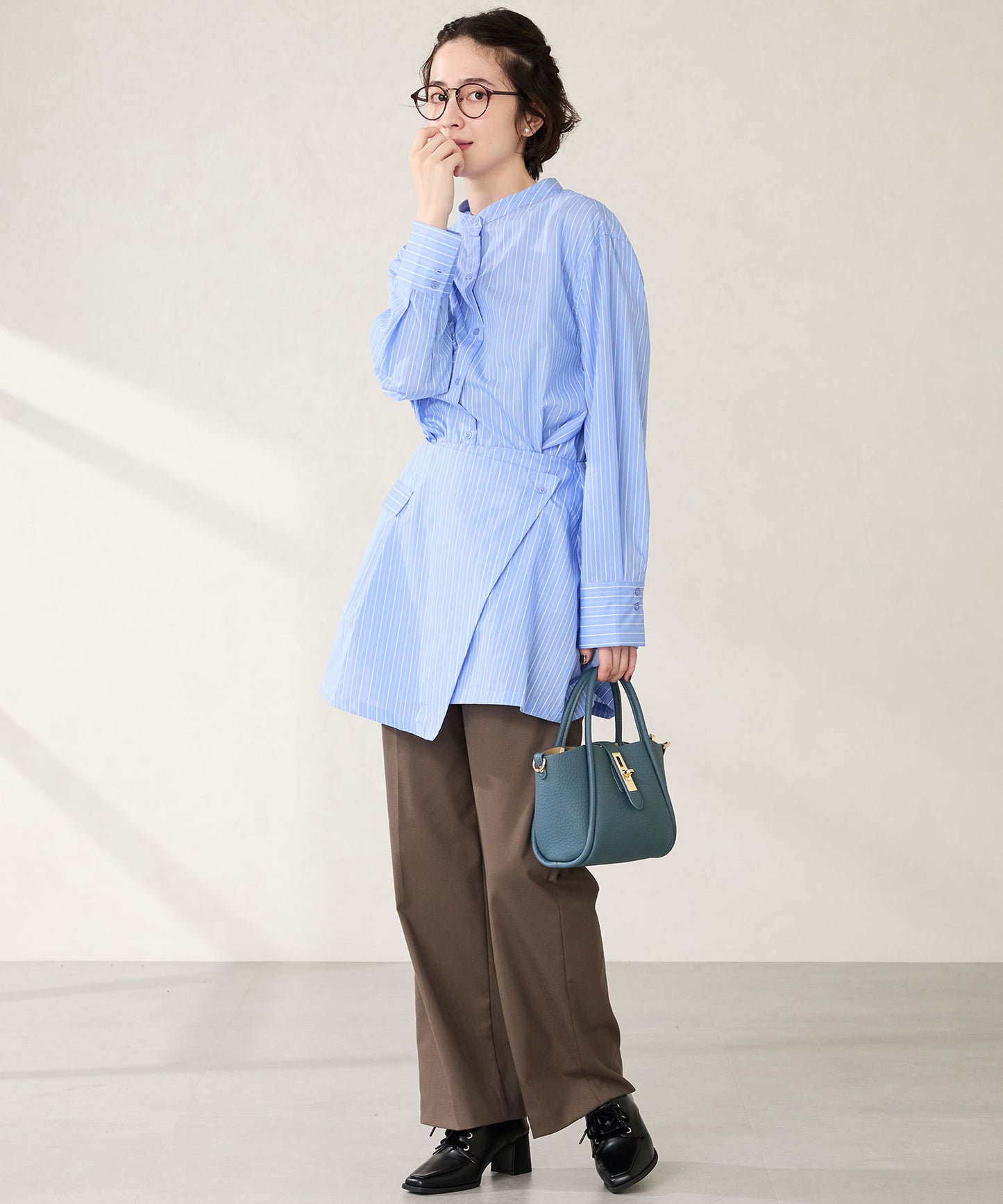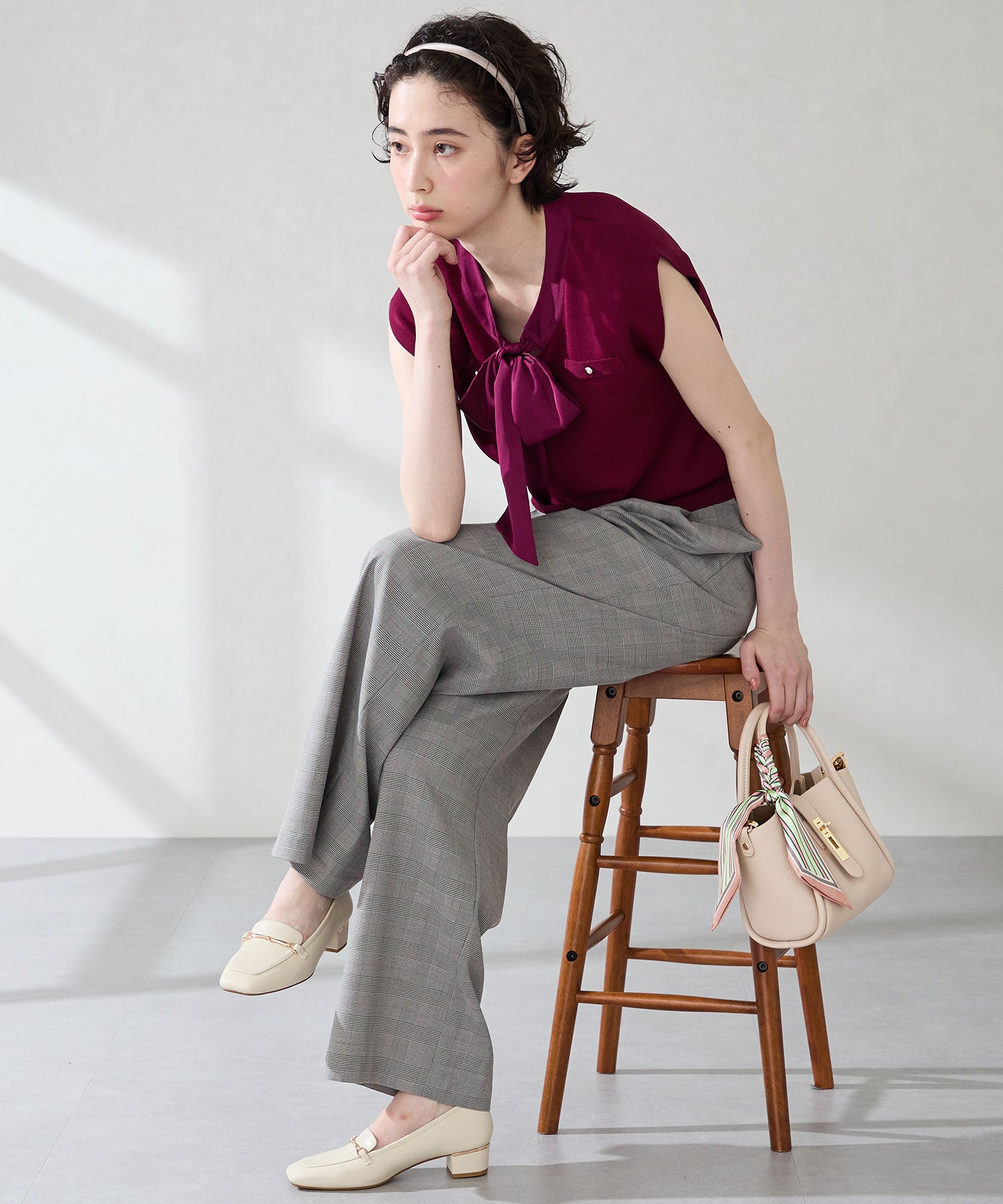 ブラックにはブロック柄、ベージュにはストライプ、ブルーにはニュアンスのあるアニマル柄とカラー毎にスカーフを変えたこだわりの詰まったバッグ。中にはファスナー付きの仕切りポケットが付いているので外から中身が見えないのが嬉しい。間口の留め具は2段階で調整が可能なので荷物が多い日も少ない日もしっかりと閉めることが出来る。