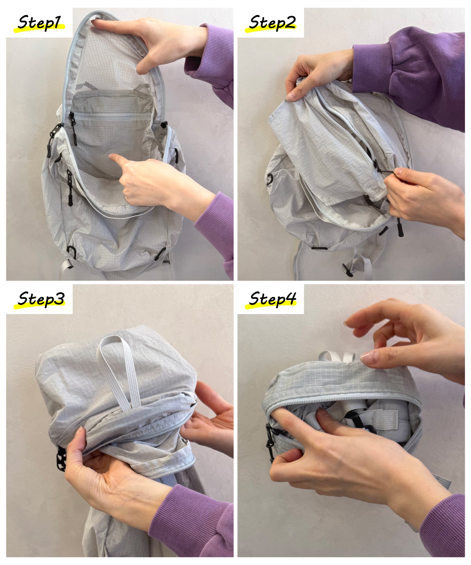 持ち運びに便利な折りたたみ式リュックは普段使いはもちろん、アウトドアなどの幅広いシーンにも対応。使わない時はコンパクトに収納でき、カバンやスーツケースに入れておけるのが嬉しいポイント。メイン収納は大きく開くファスナー設計で荷物の出し入れがスムーズで、外側には使いやすいジッパーポケットを配置し、小物類の整理も簡単な優秀アイテム。