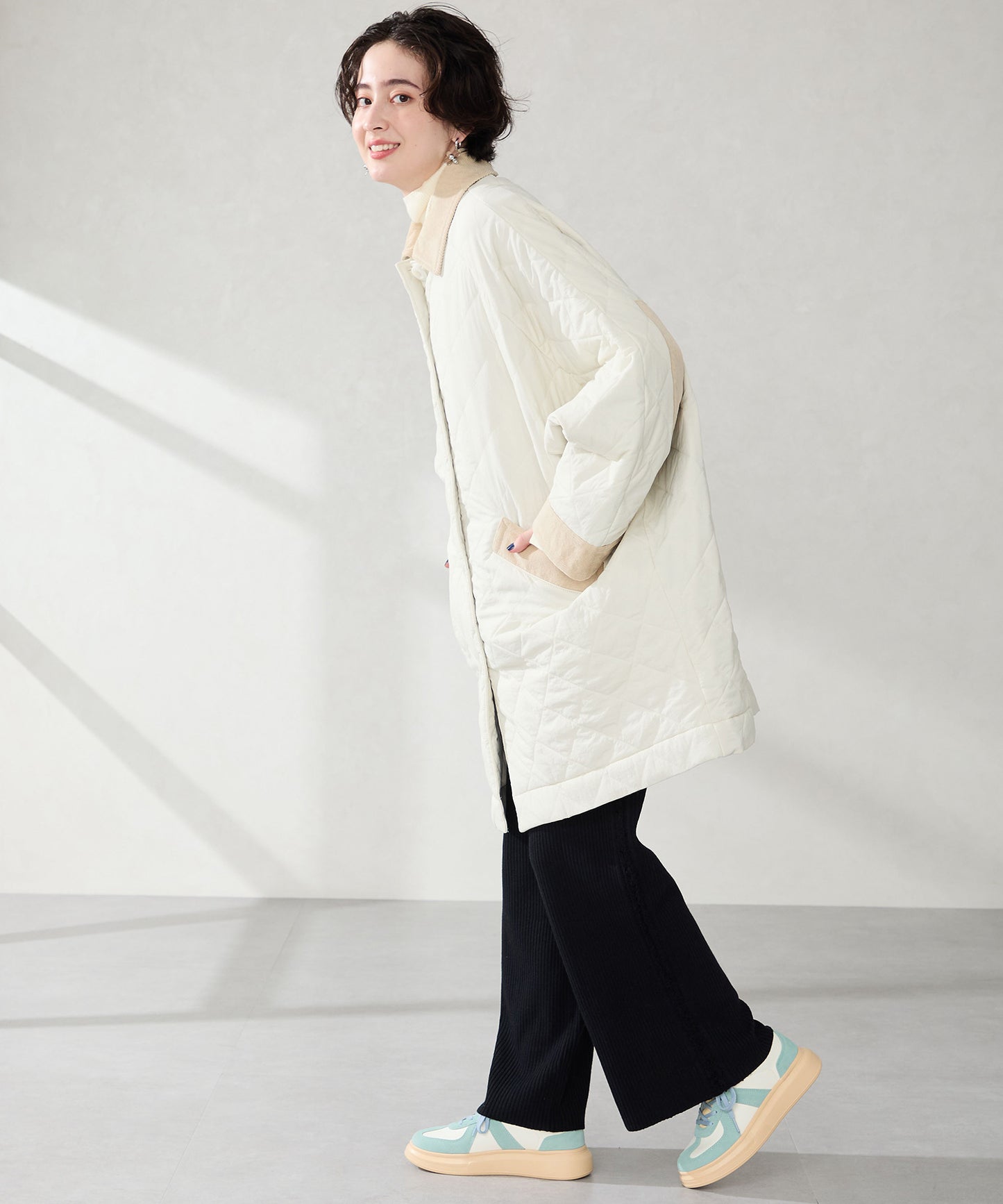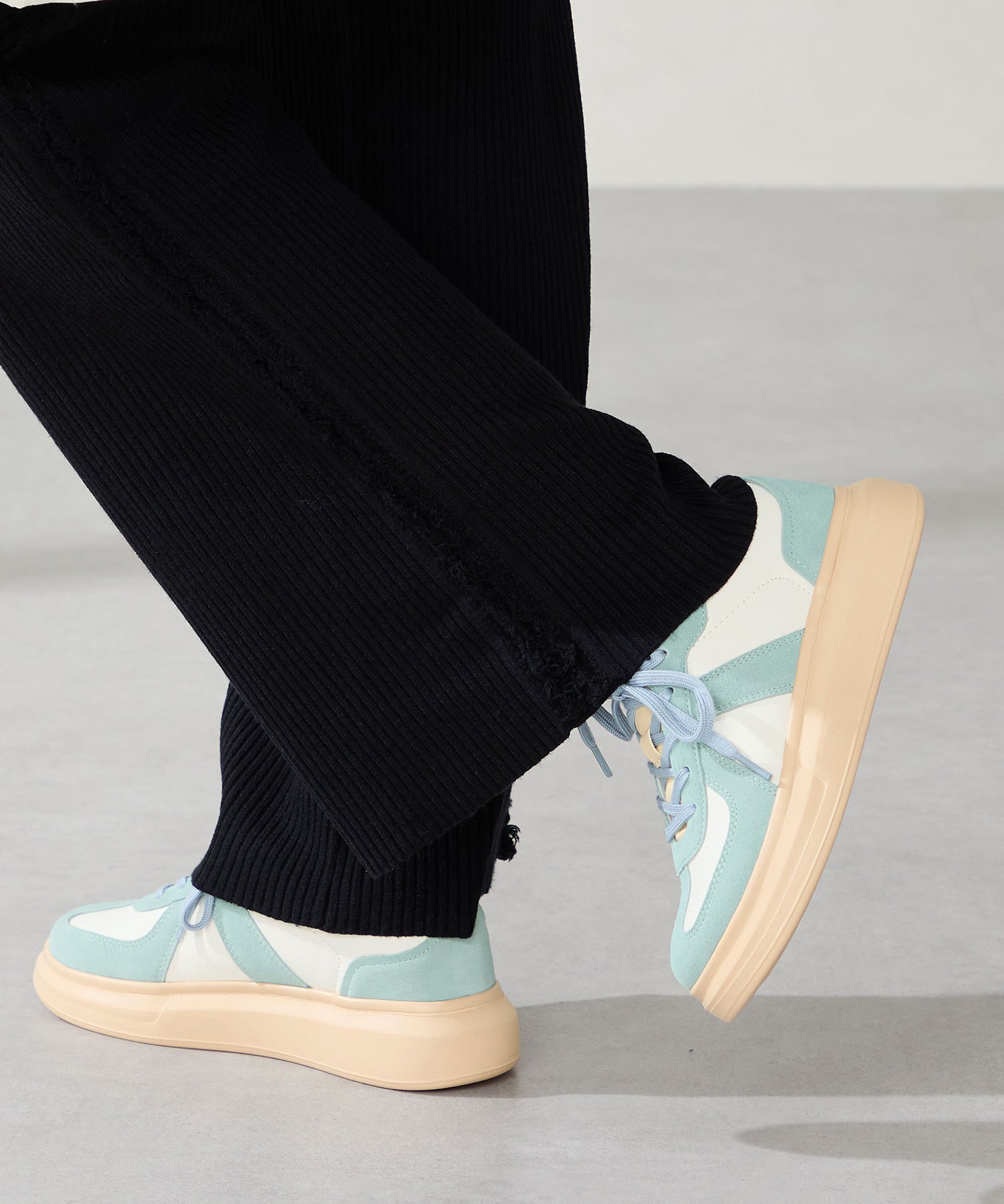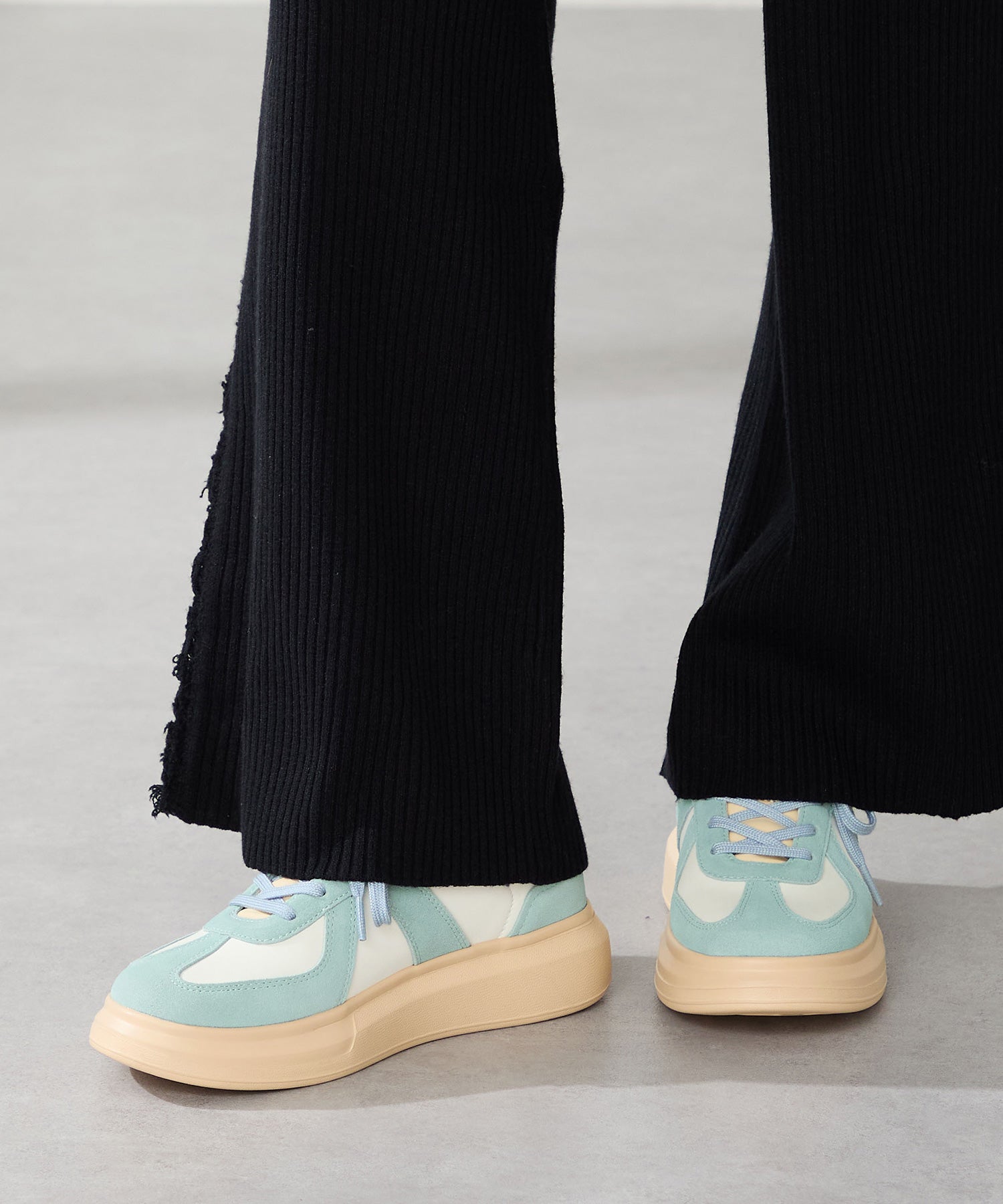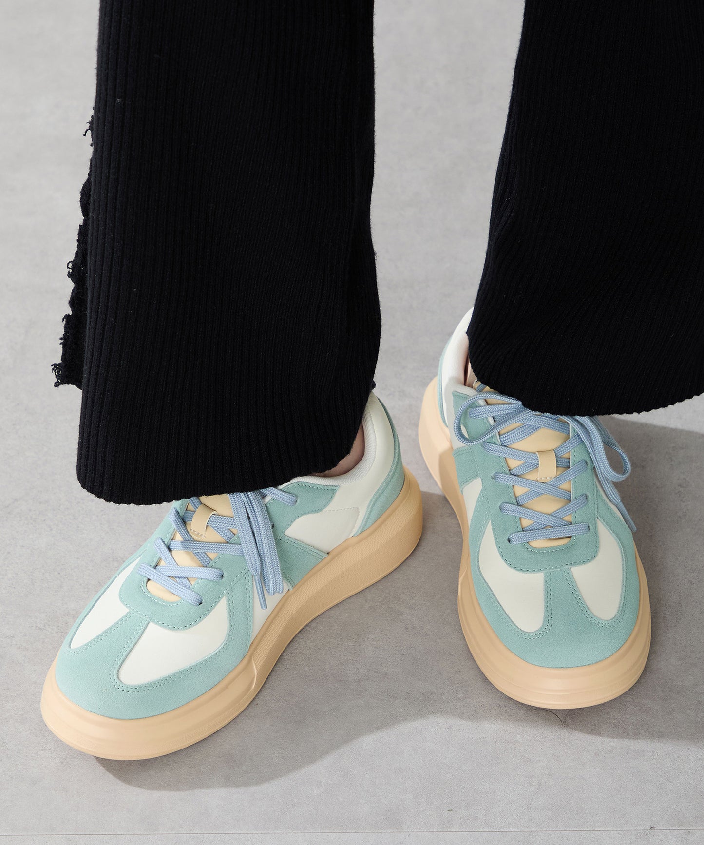 トレンド継続中のジャーマンデザインをぷっくりとした厚底ソールと掛け合わせた形が新鮮なスニーカーは取り入れるだけで旬なコーディネートに。一見カジュアルなデザインながら丸いつま先や全体的にコロンとした形がかわいらしく、つま先部分の本革スエードの風合いが足元を柔らかな雰囲気にしてくれる。ベージュとのバイカラーの組み合わせが爽やかなブルーが注目カラー。