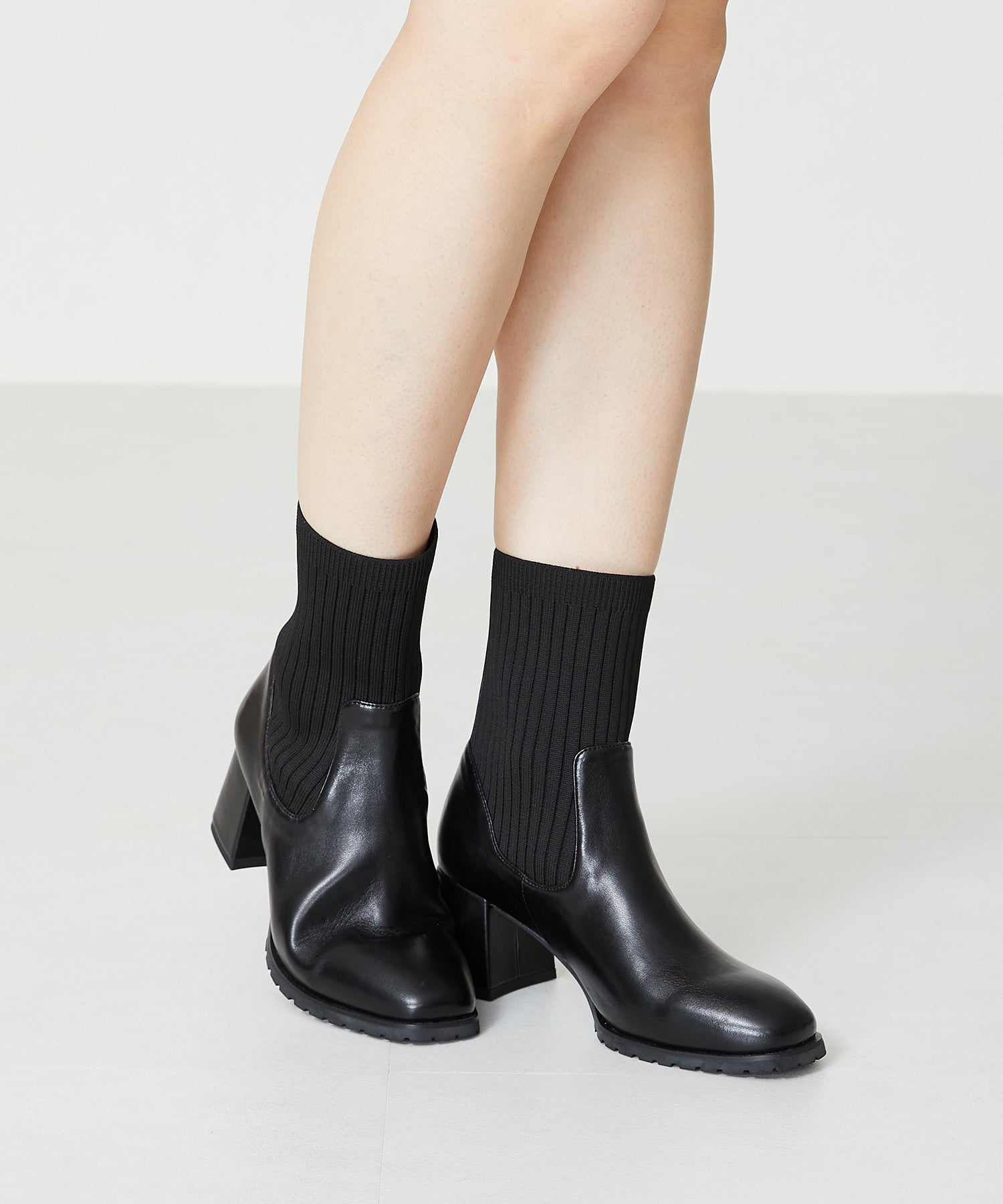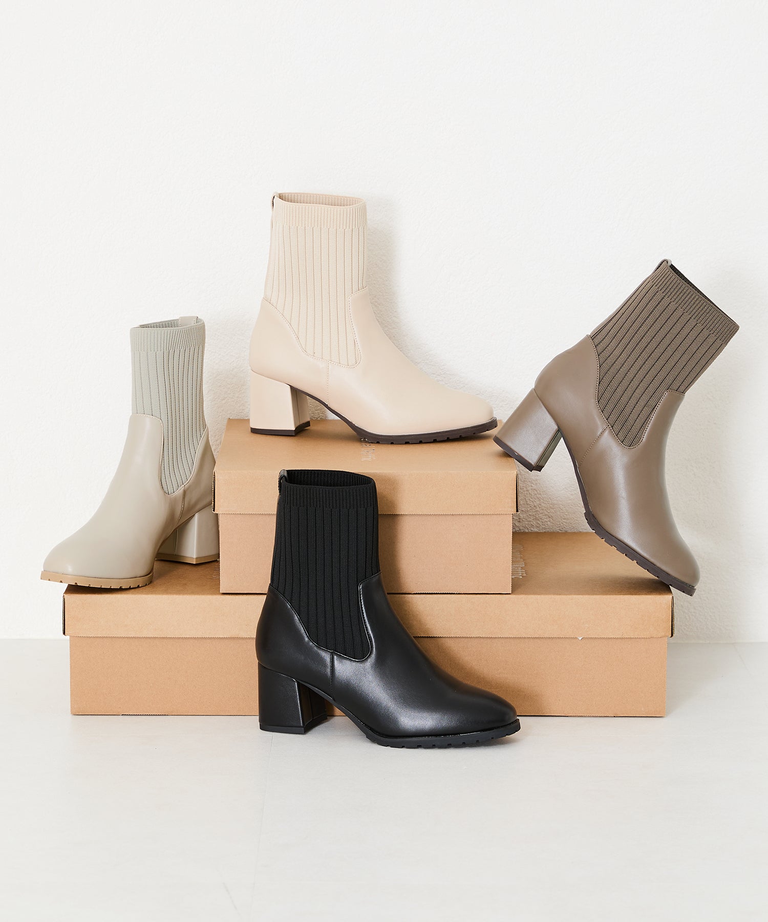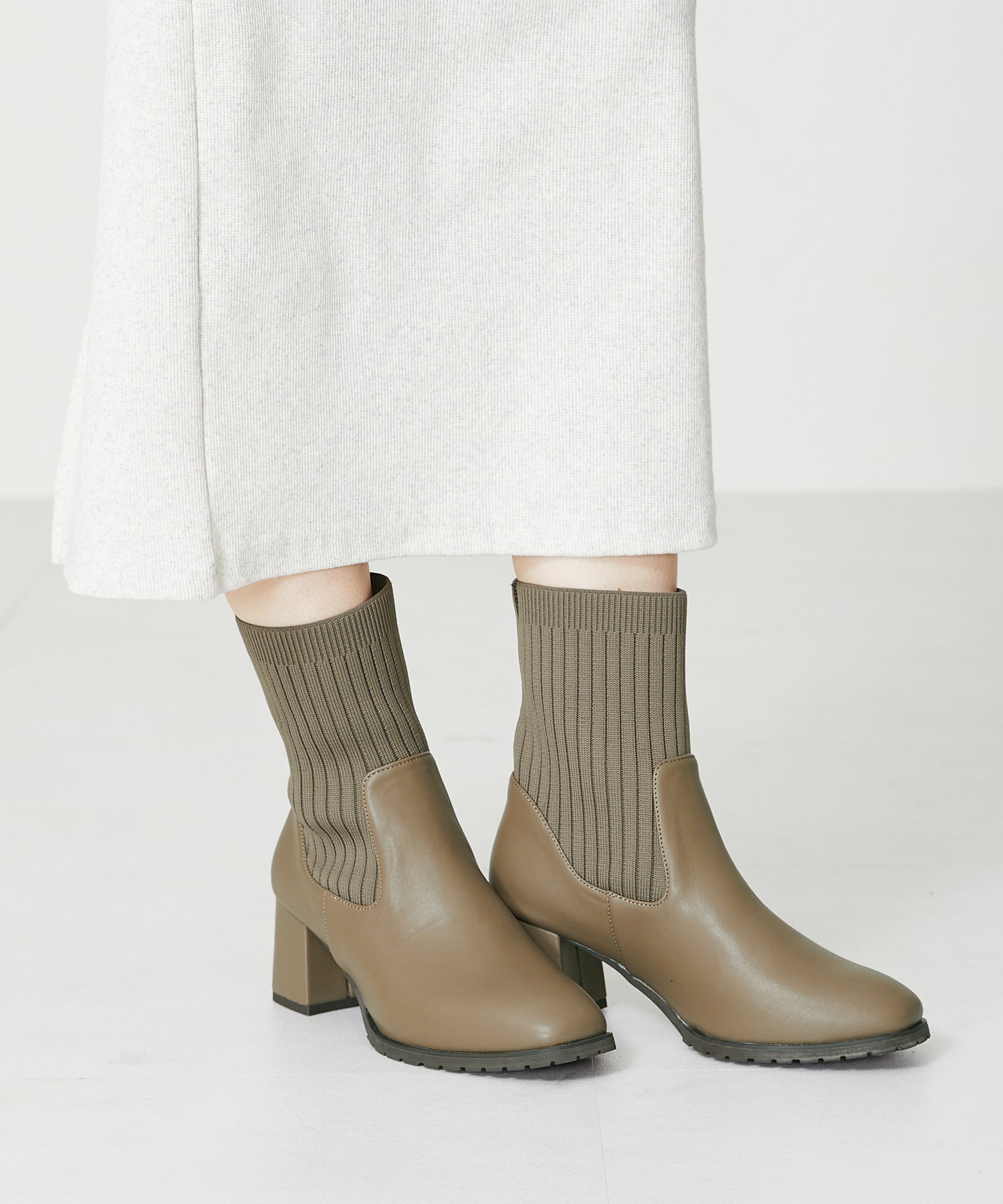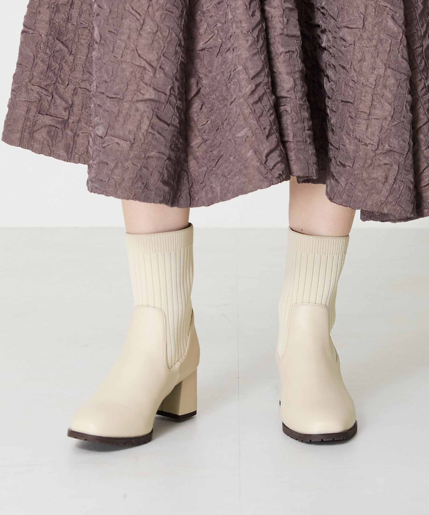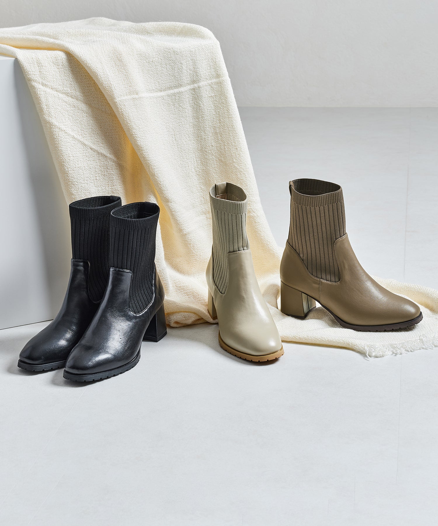 今シーズンのスタイリングには欠かせないニットブーツは履くだけで旬な足元になり大活躍間違いなしの1足。足首周りにニット素材を使用しているので足当たりが良くストレスのない履き心地。細身のスクエアトゥと6㎝のヒールできちんと感がありつつ、ソールを少しゴツゴツさせているので程よくカジュアルダウンし、どんなお洋服にも合わせやすい。落ち着いたカラーリングで大人っぽく決まる。