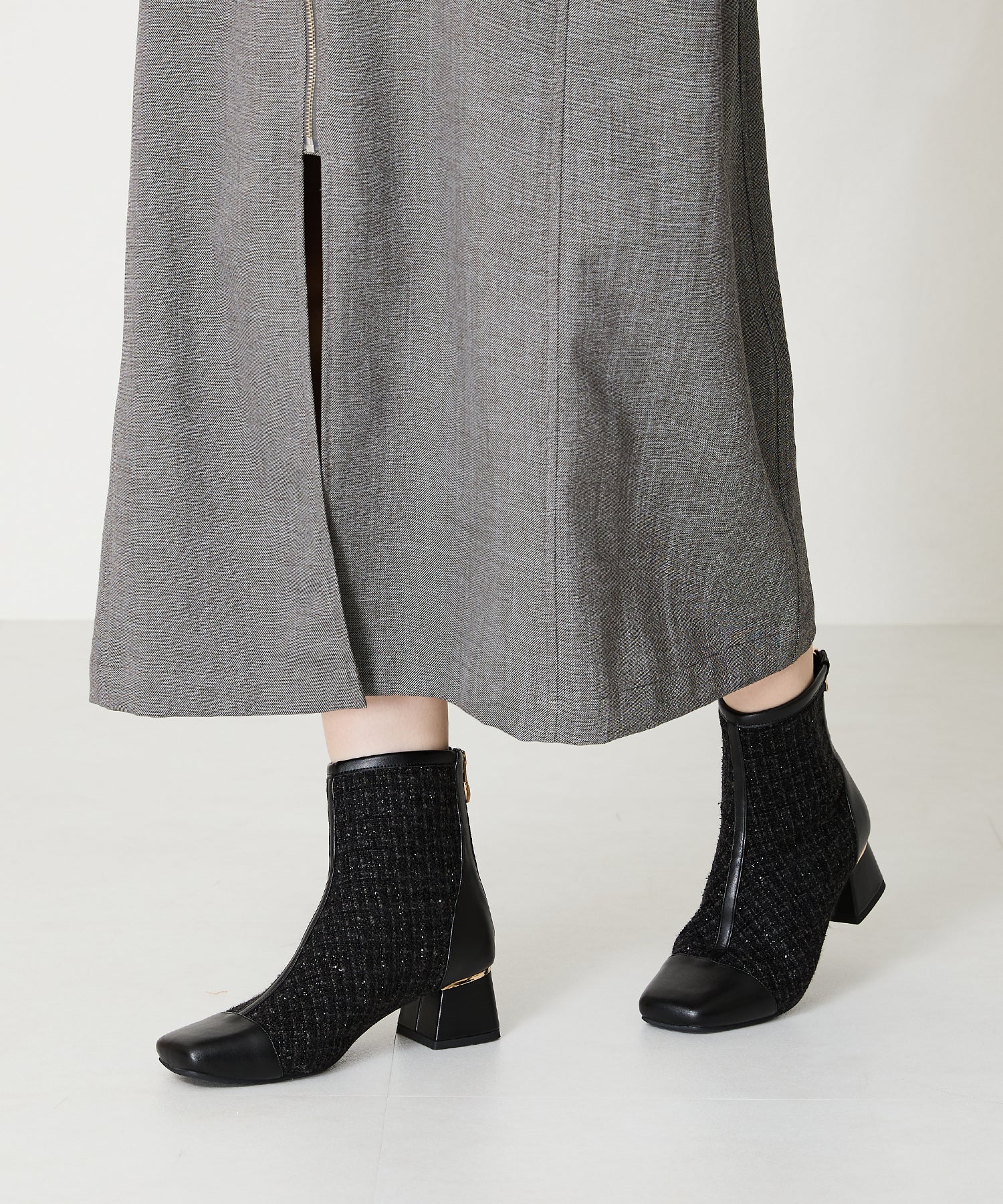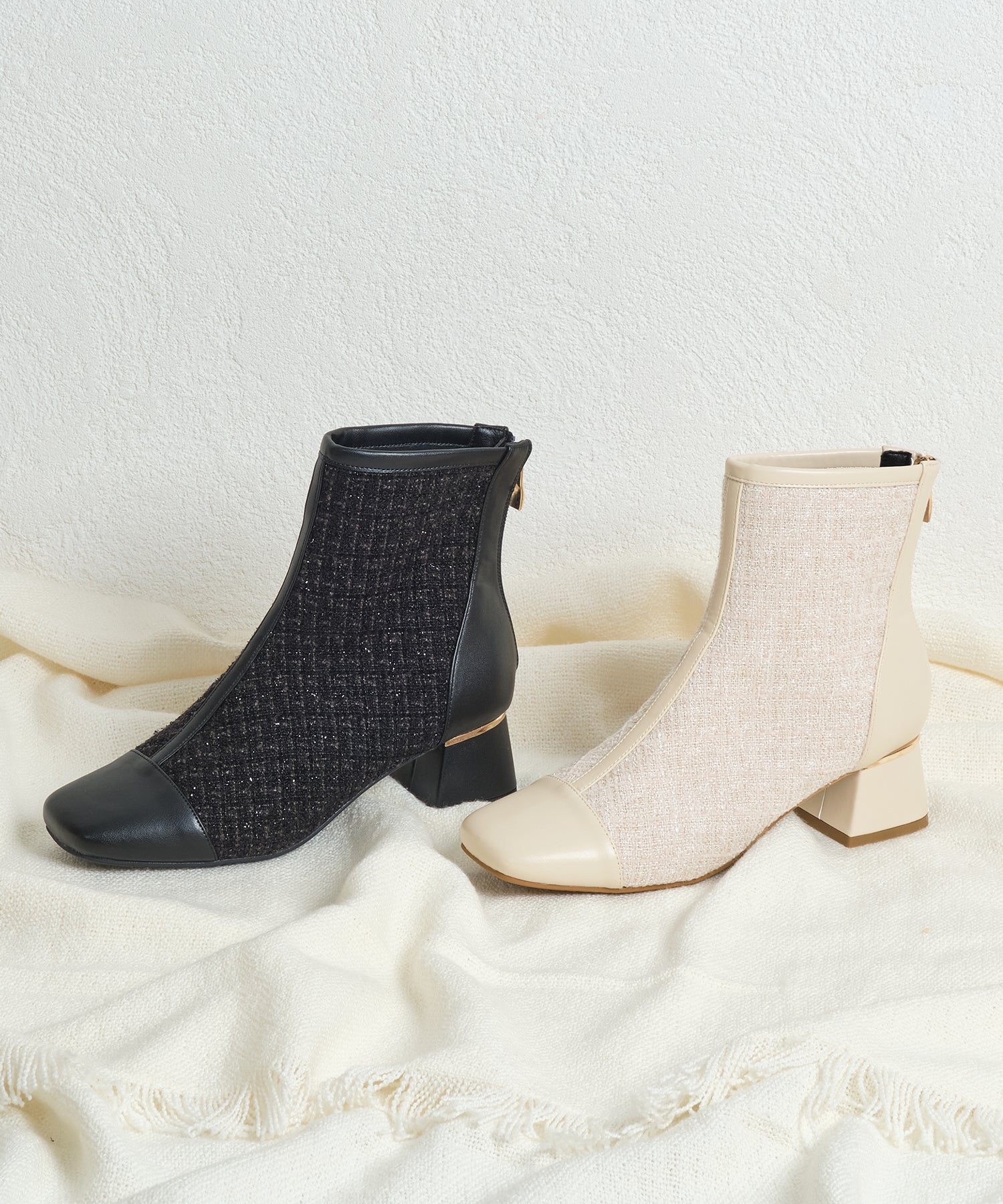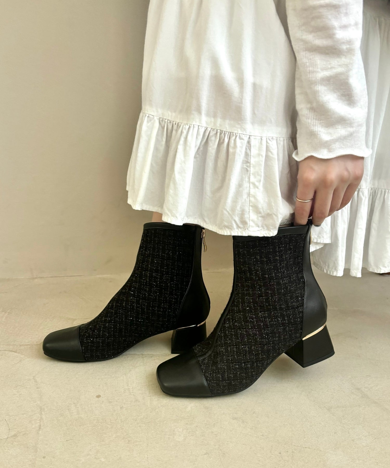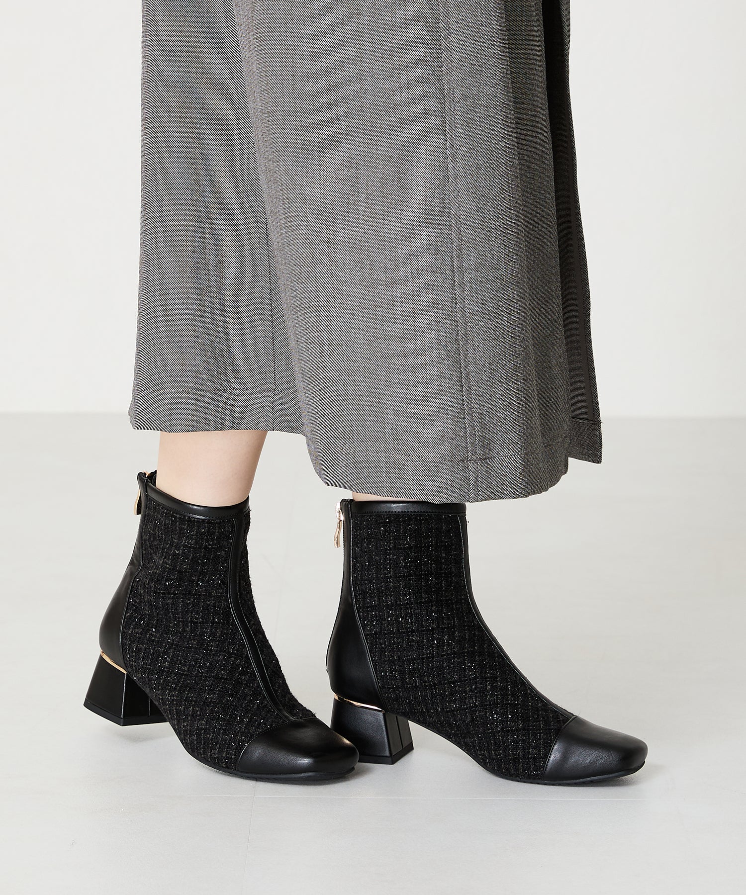 上品さの中にちょっぴり甘さのあるツイード素材のブーツは、この秋冬に取り入れたいとっておきのアイテム。スクエアトゥのつま先は切替デザインにして、メリハリのある引き締まった印象に。高見えする踵のメタリックラインやゴールドのバックファスナーは、おしゃれ度をぐっと高めてくれる細かなこだわりポイント。カラーは挑戦しやすいベーシックな2色展開。