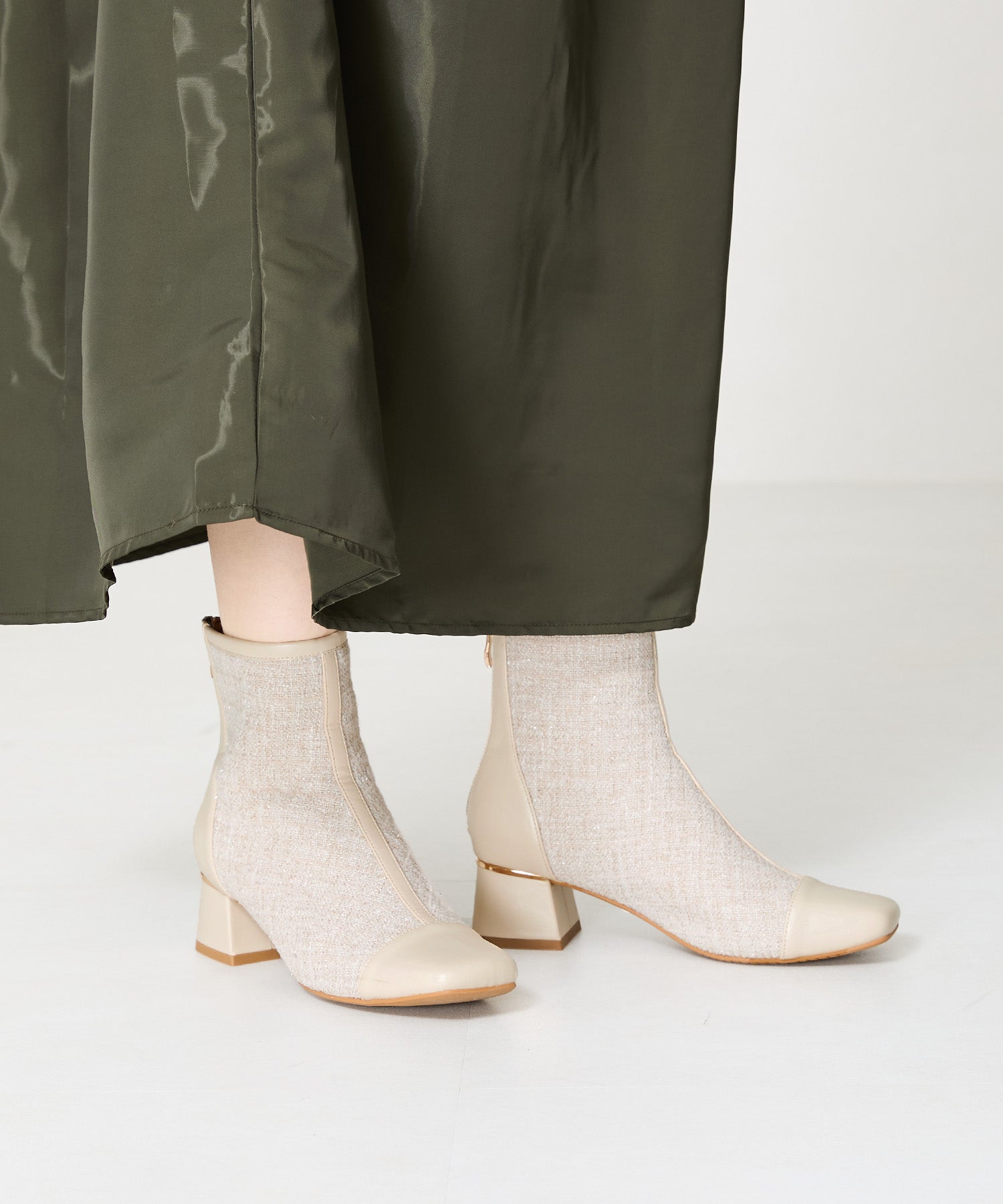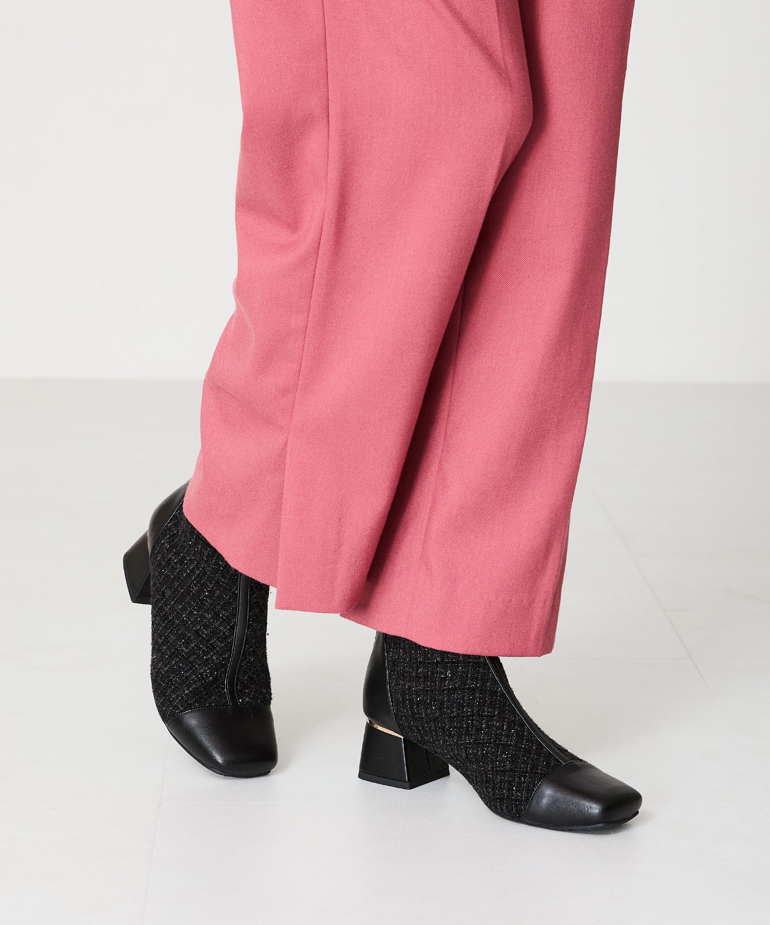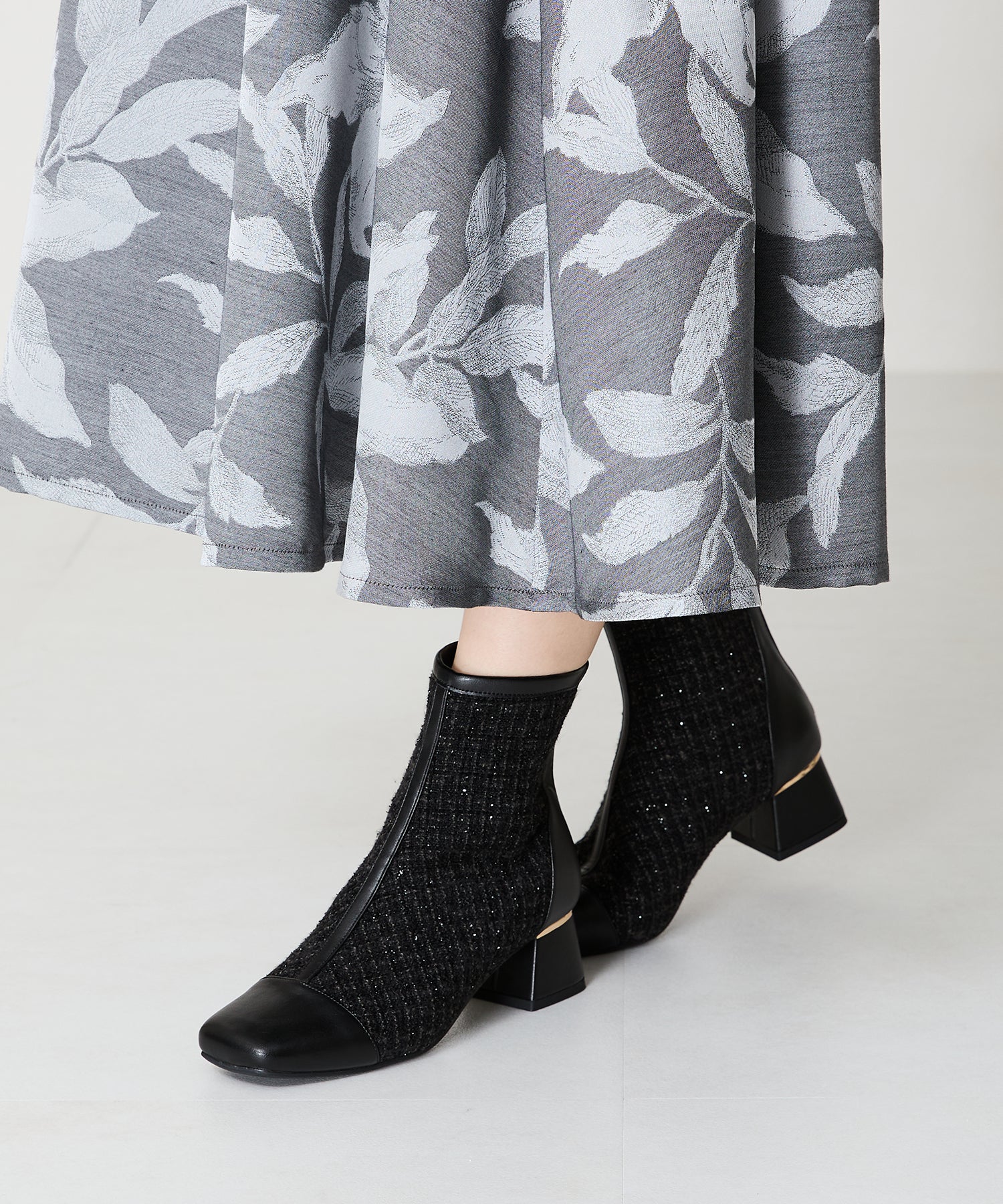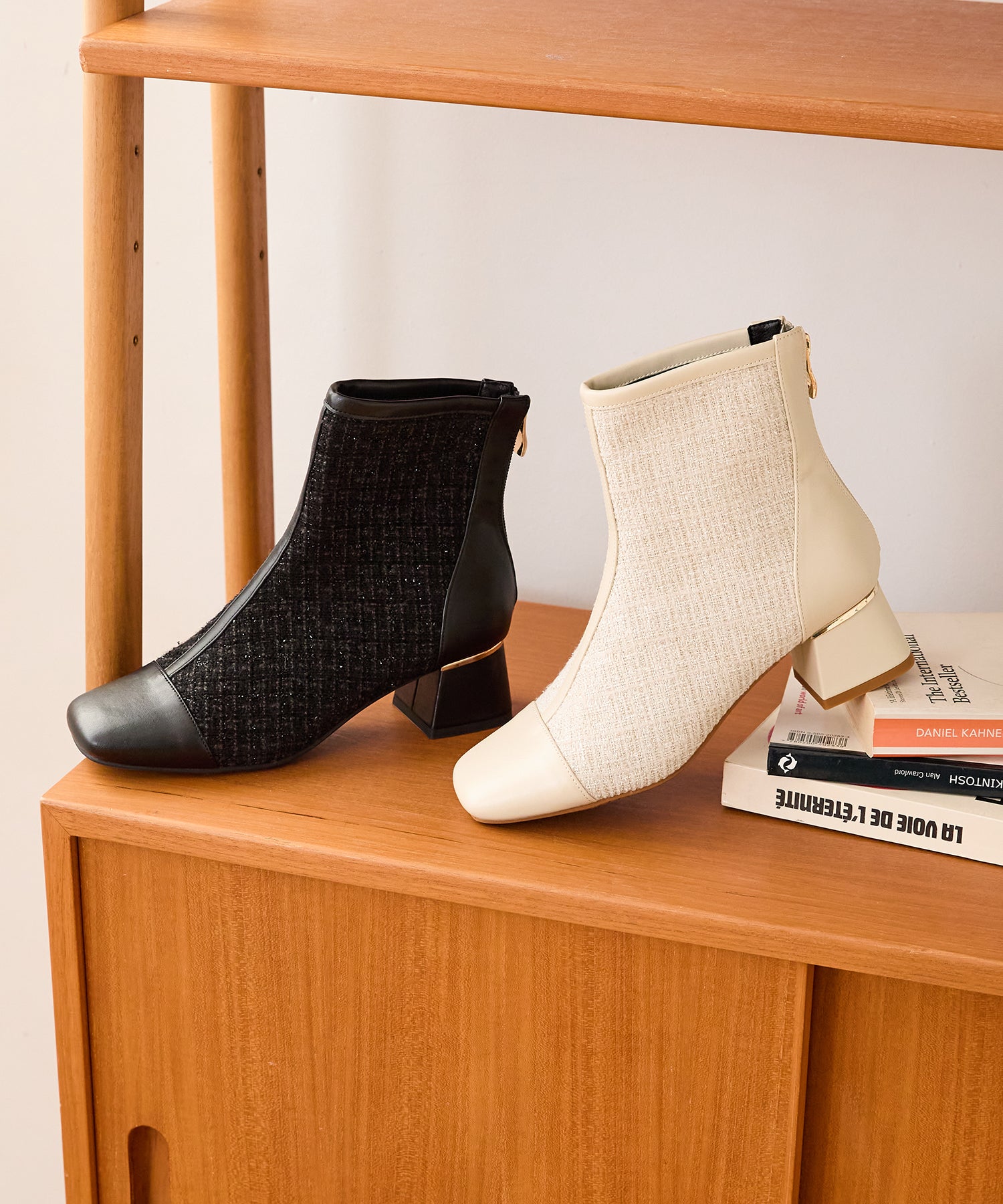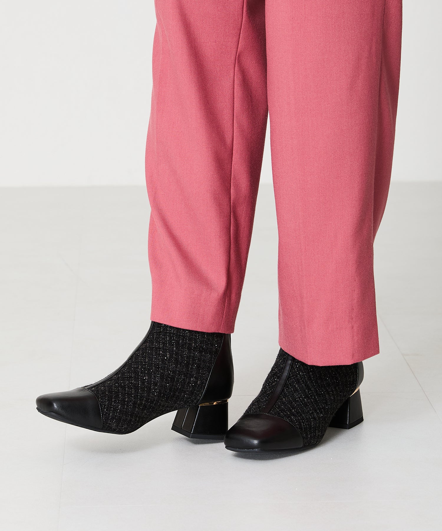 上品さの中にちょっぴり甘さのあるツイード素材のブーツは、この秋冬に取り入れたいとっておきのアイテム。スクエアトゥのつま先は切替デザインにして、メリハリのある引き締まった印象に。高見えする踵のメタリックラインやゴールドのバックファスナーは、おしゃれ度をぐっと高めてくれる細かなこだわりポイント。カラーは挑戦しやすいベーシックな2色展開。