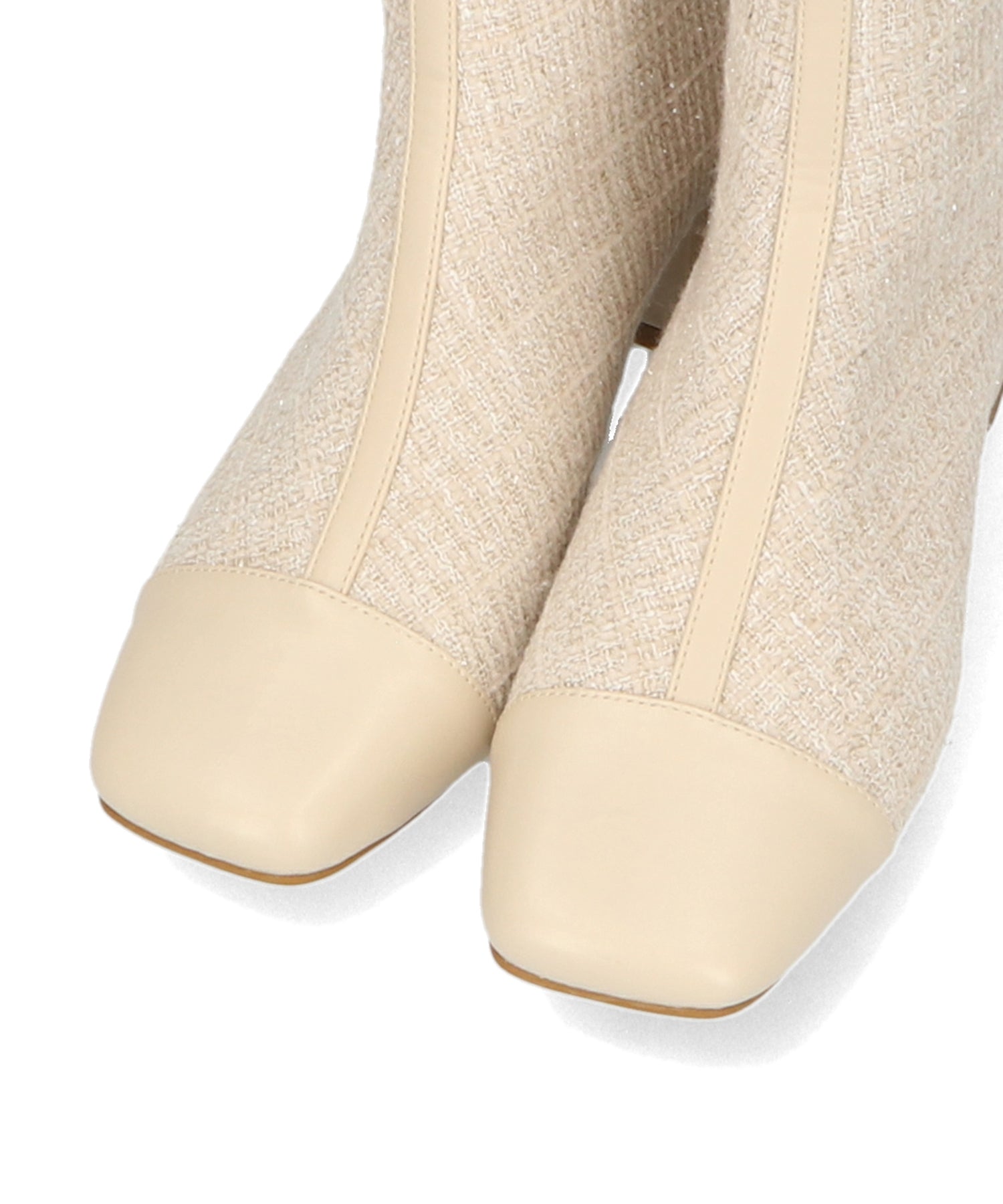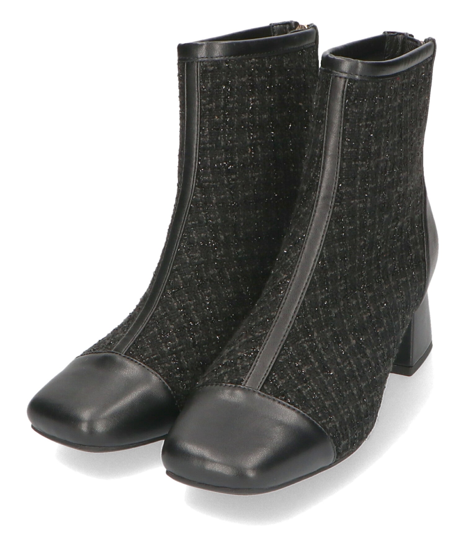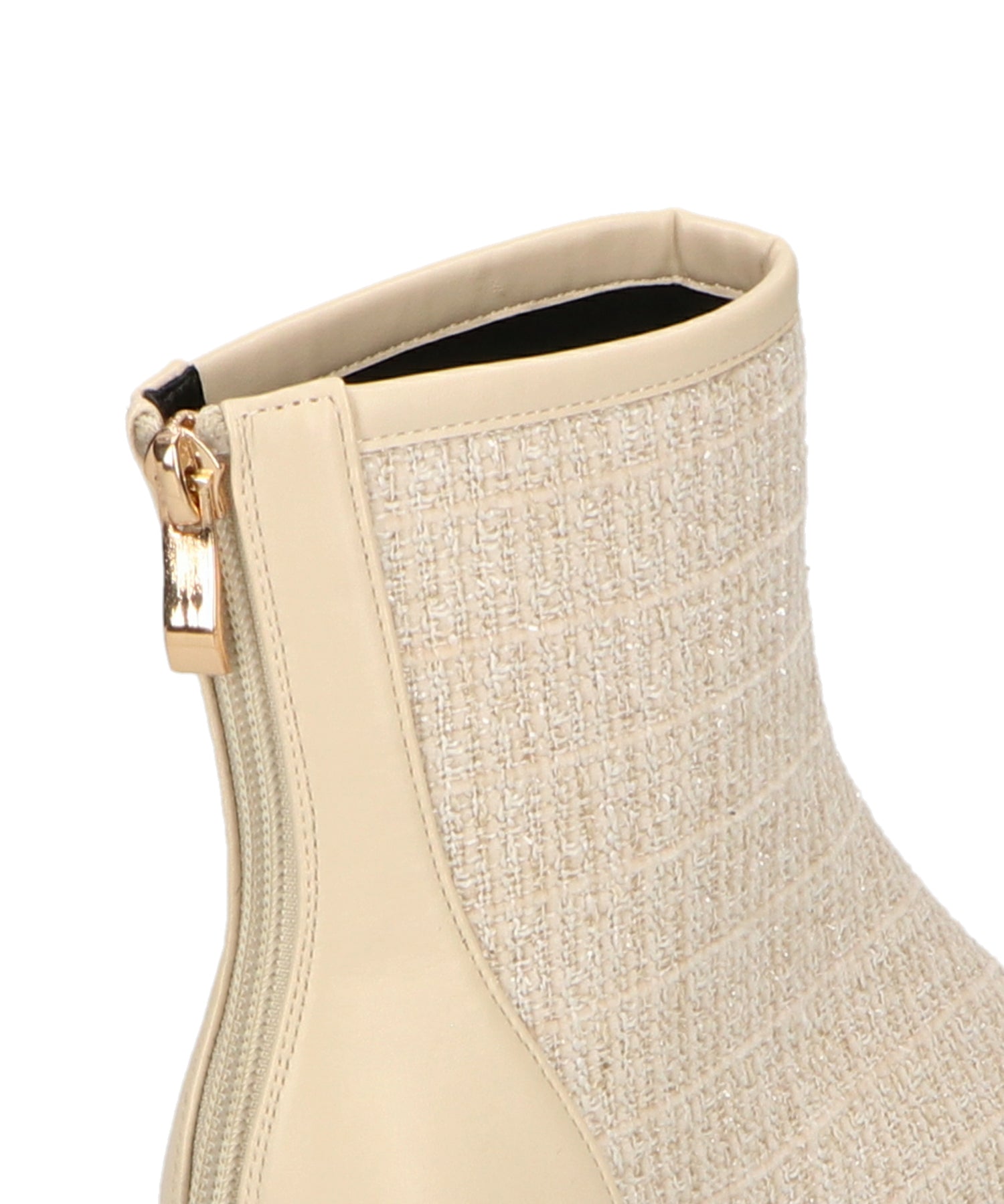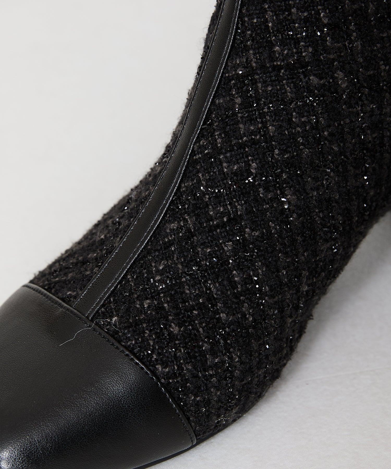 上品さの中にちょっぴり甘さのあるツイード素材のブーツは、この秋冬に取り入れたいとっておきのアイテム。スクエアトゥのつま先は切替デザインにして、メリハリのある引き締まった印象に。高見えする踵のメタリックラインやゴールドのバックファスナーは、おしゃれ度をぐっと高めてくれる細かなこだわりポイント。カラーは挑戦しやすいベーシックな2色展開。