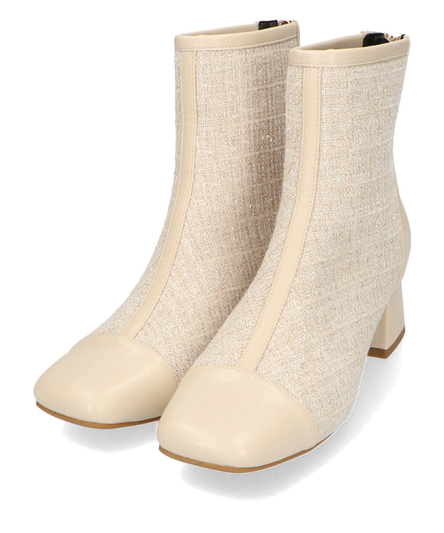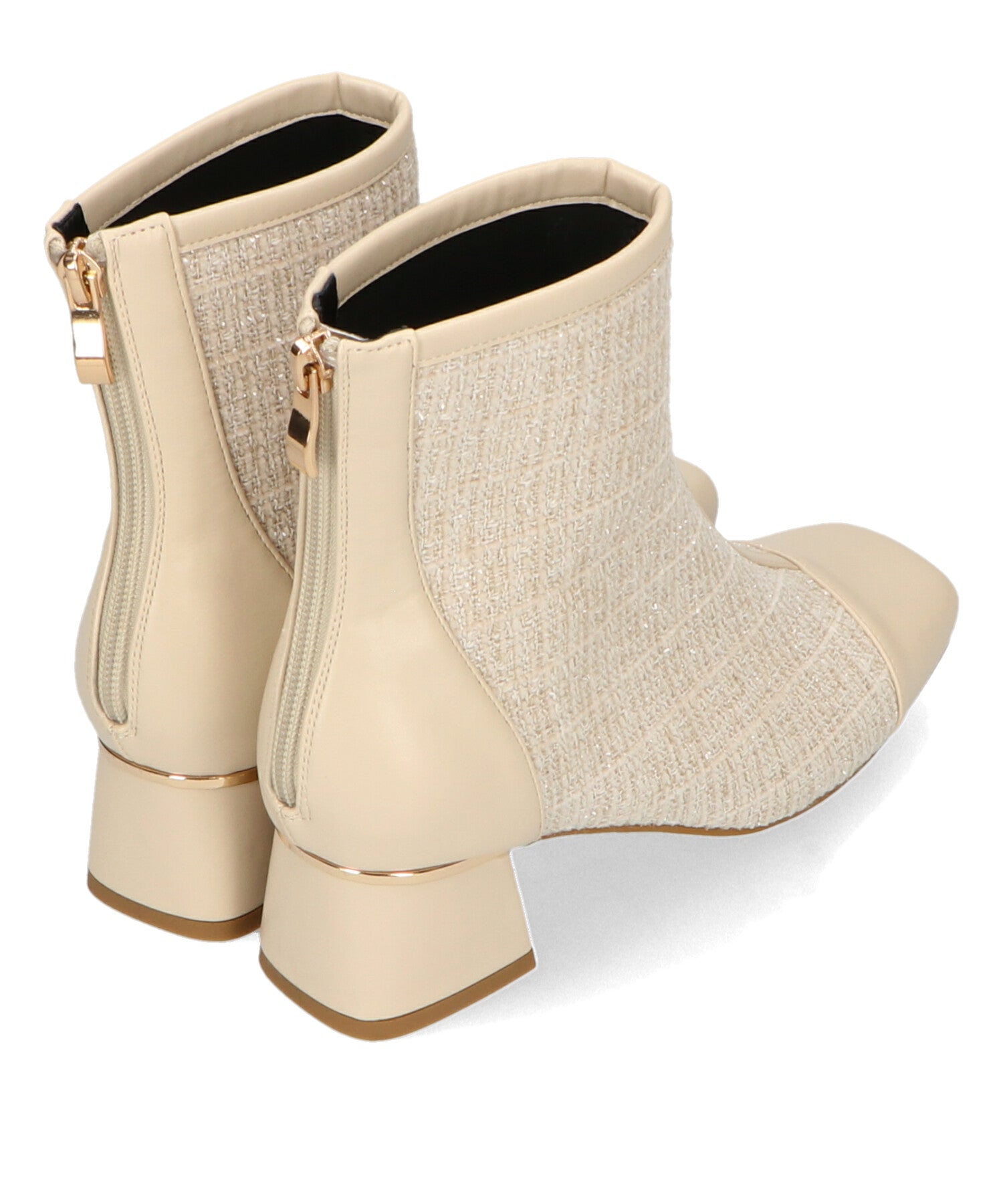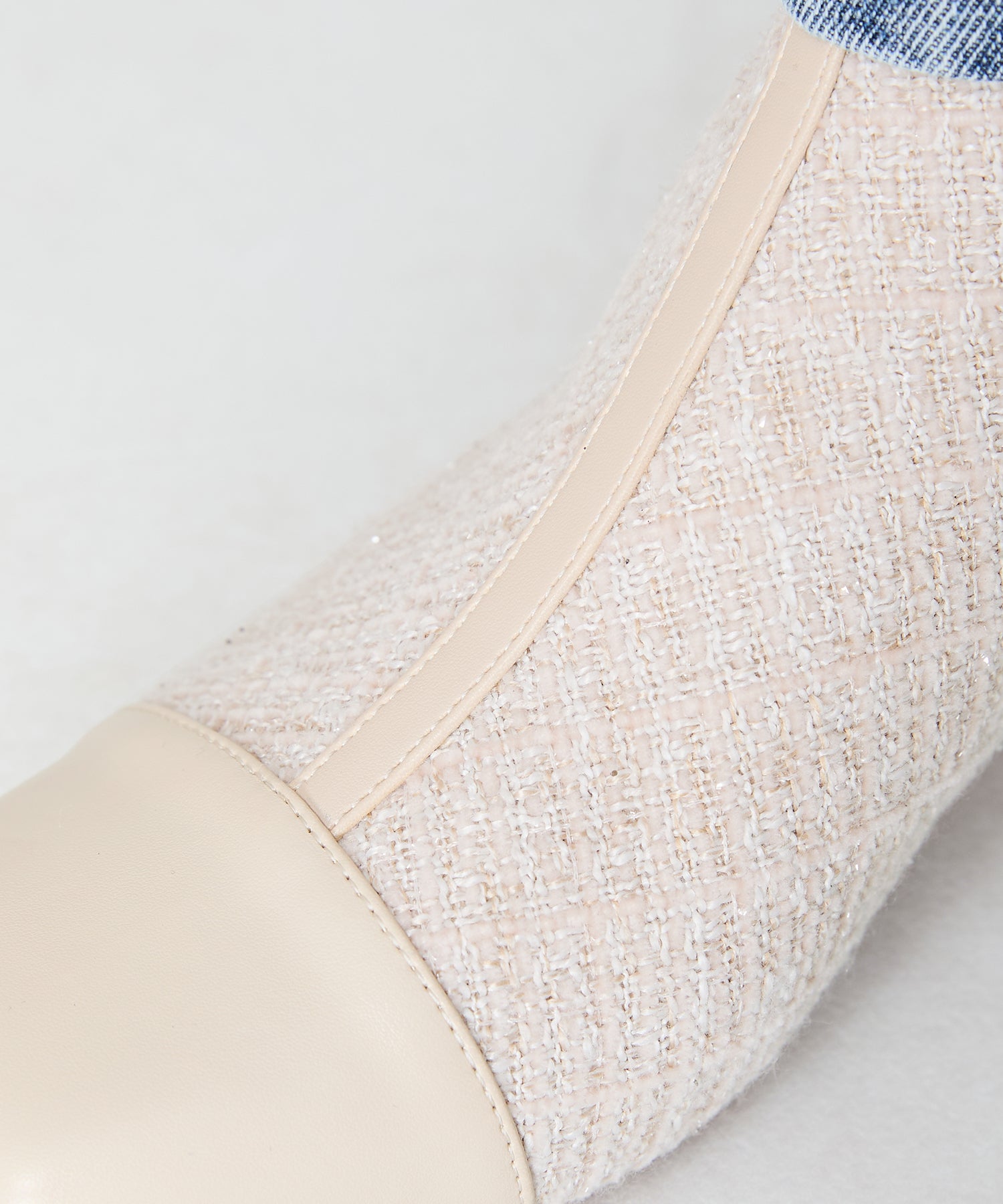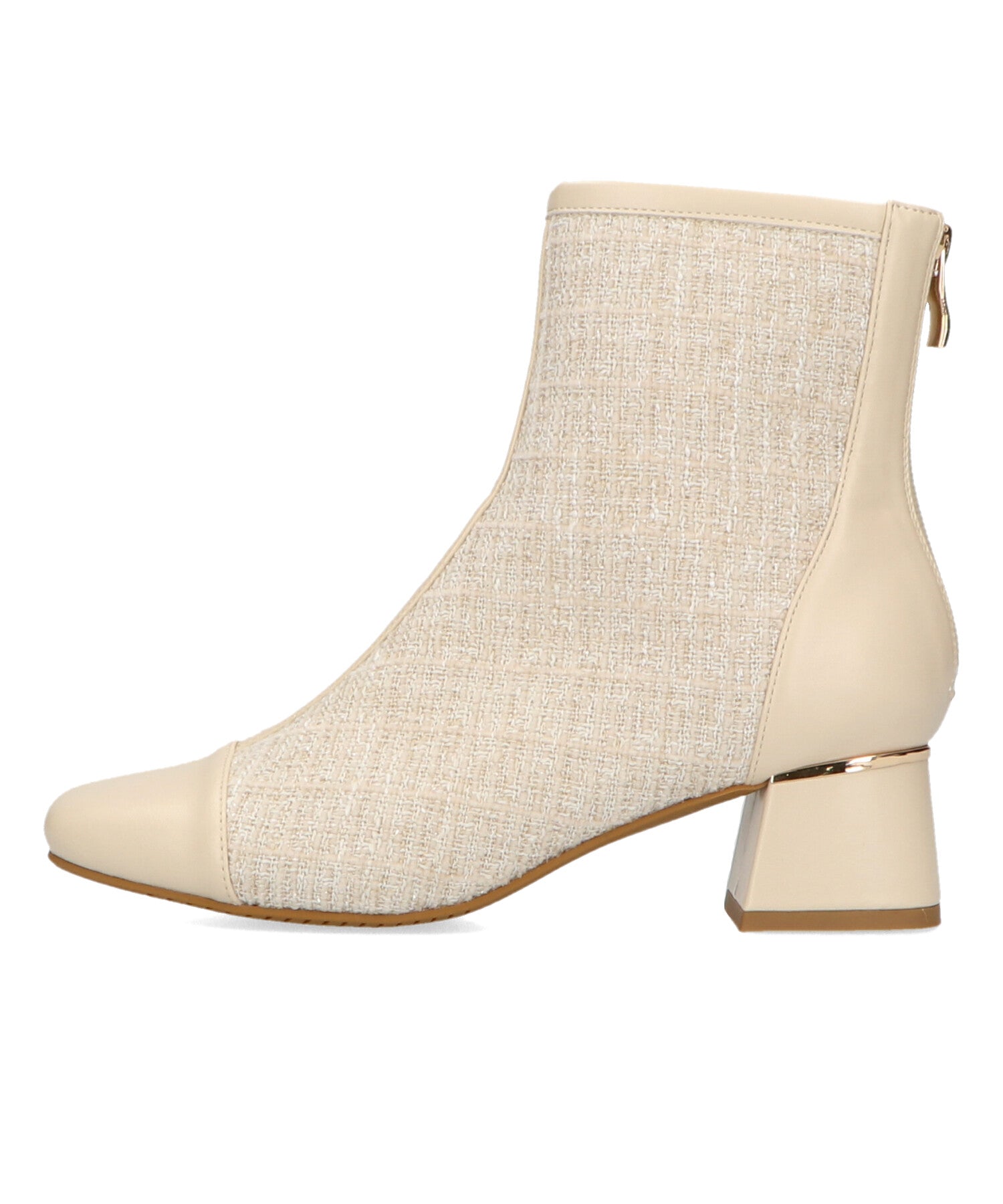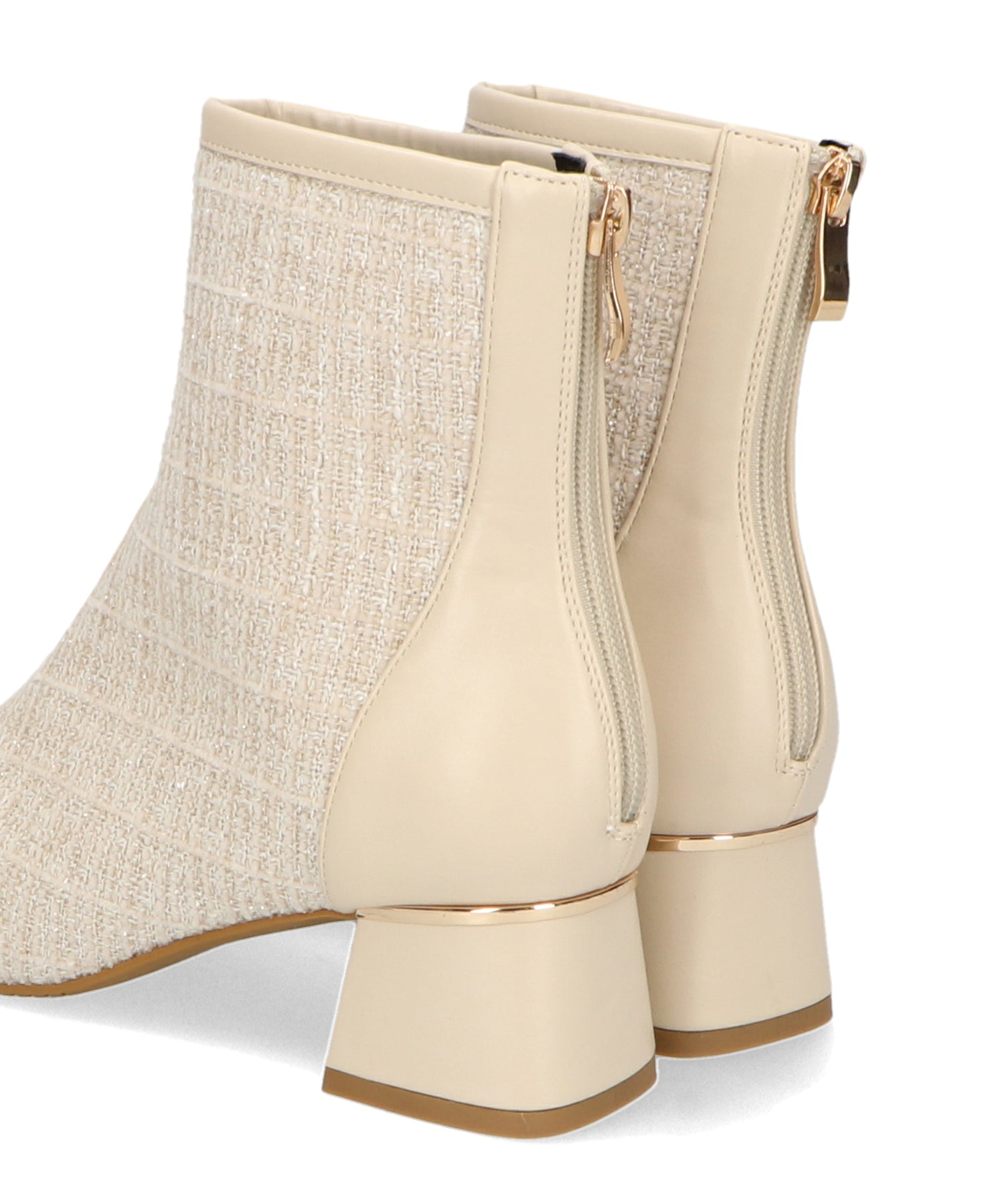 上品さの中にちょっぴり甘さのあるツイード素材のブーツは、この秋冬に取り入れたいとっておきのアイテム。スクエアトゥのつま先は切替デザインにして、メリハリのある引き締まった印象に。高見えする踵のメタリックラインやゴールドのバックファスナーは、おしゃれ度をぐっと高めてくれる細かなこだわりポイント。カラーは挑戦しやすいベーシックな2色展開。