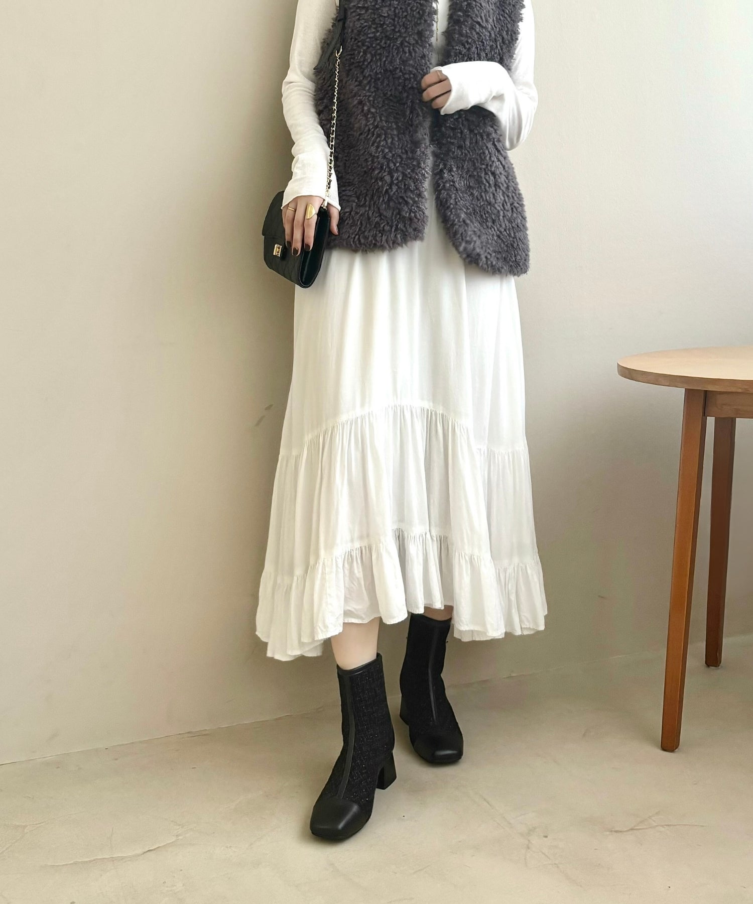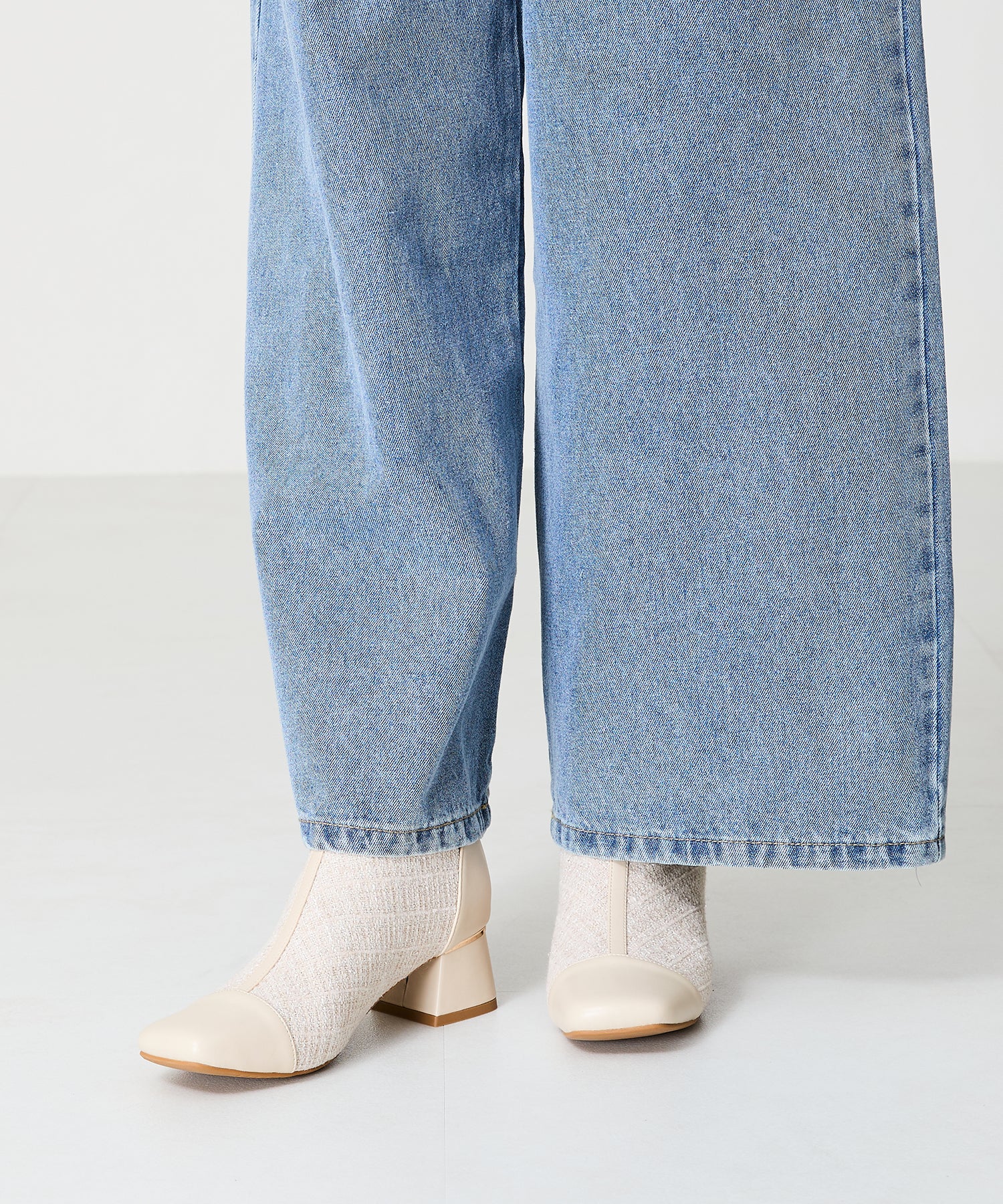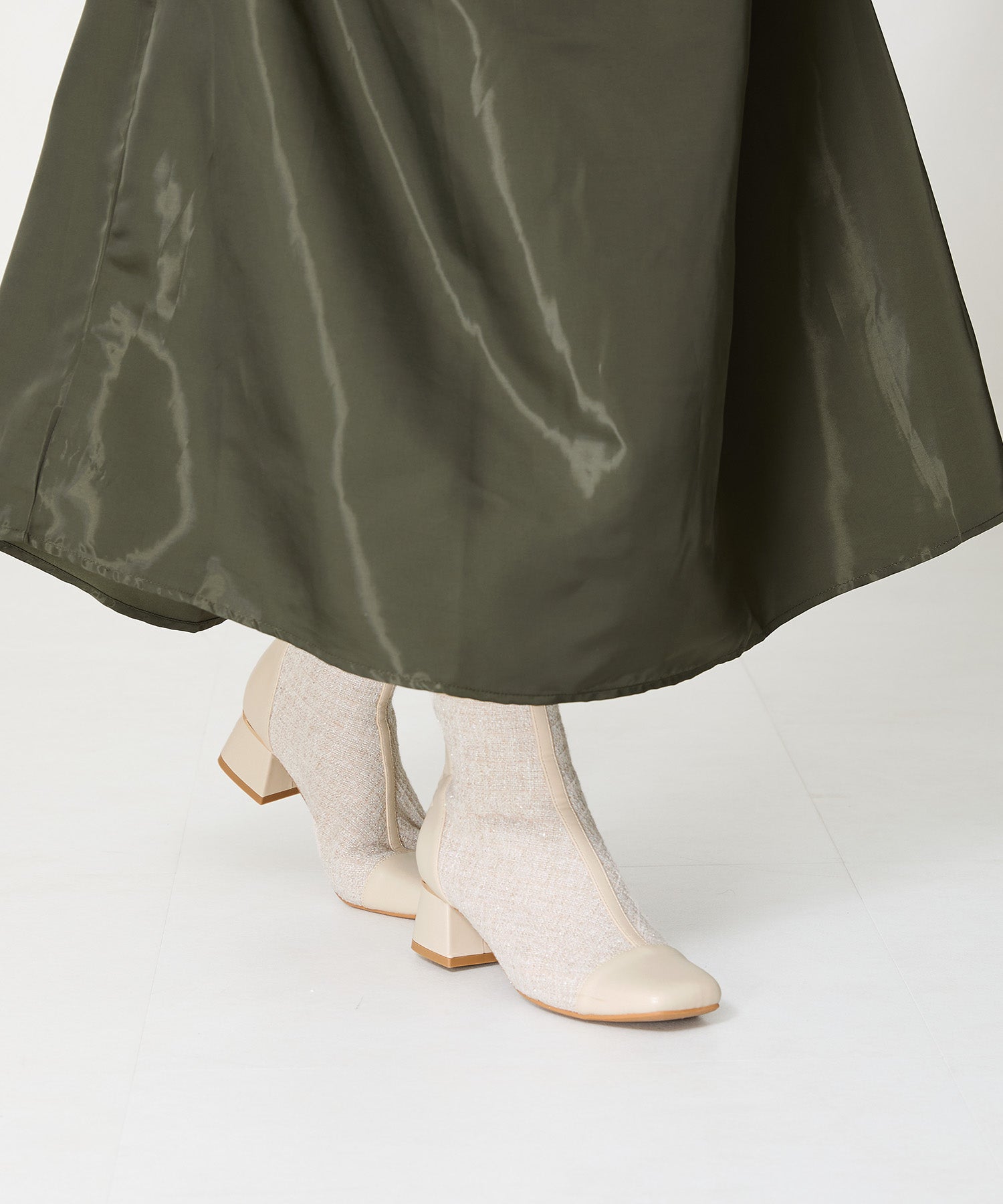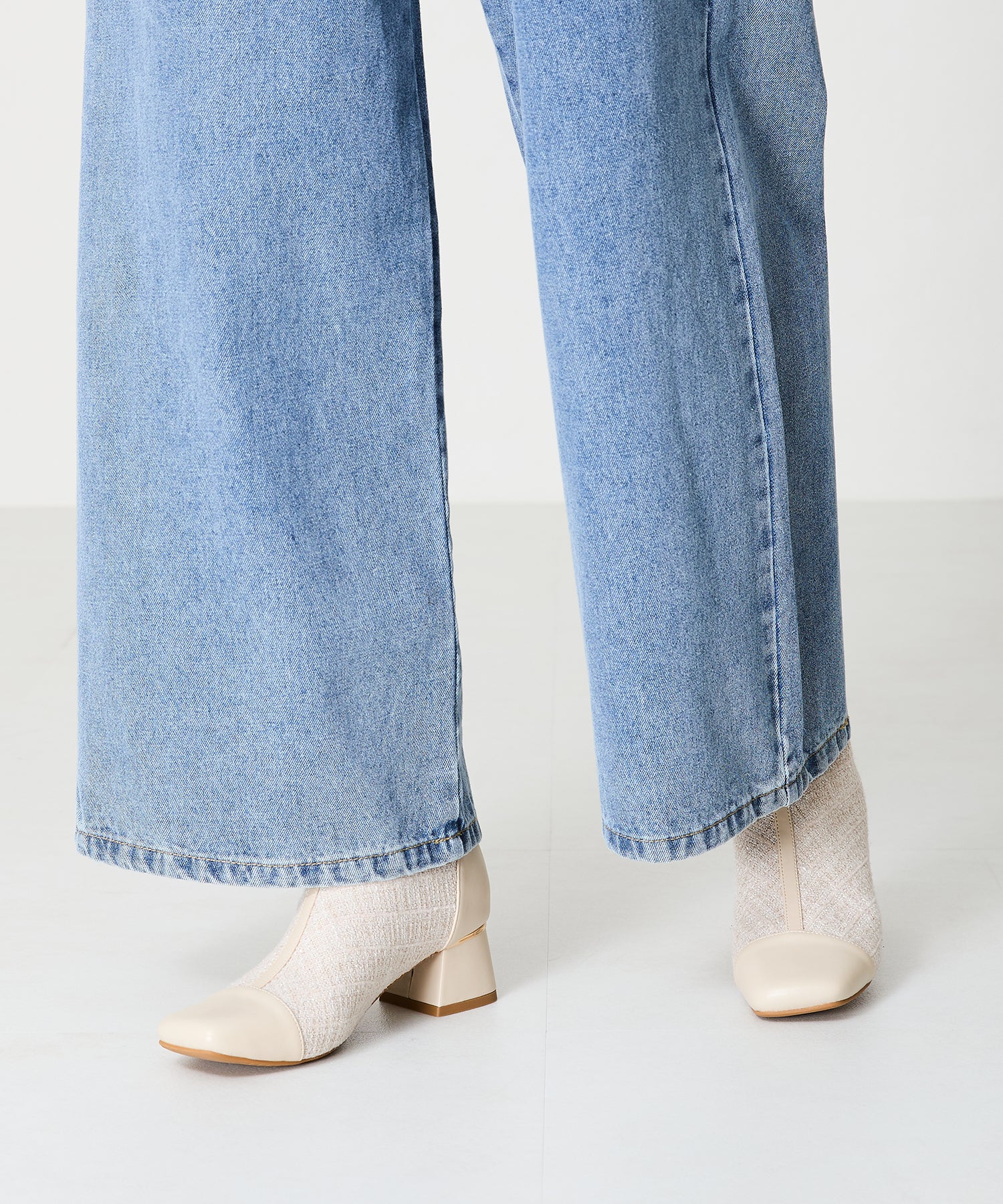 上品さの中にちょっぴり甘さのあるツイード素材のブーツは、この秋冬に取り入れたいとっておきのアイテム。スクエアトゥのつま先は切替デザインにして、メリハリのある引き締まった印象に。高見えする踵のメタリックラインやゴールドのバックファスナーは、おしゃれ度をぐっと高めてくれる細かなこだわりポイント。カラーは挑戦しやすいベーシックな2色展開。