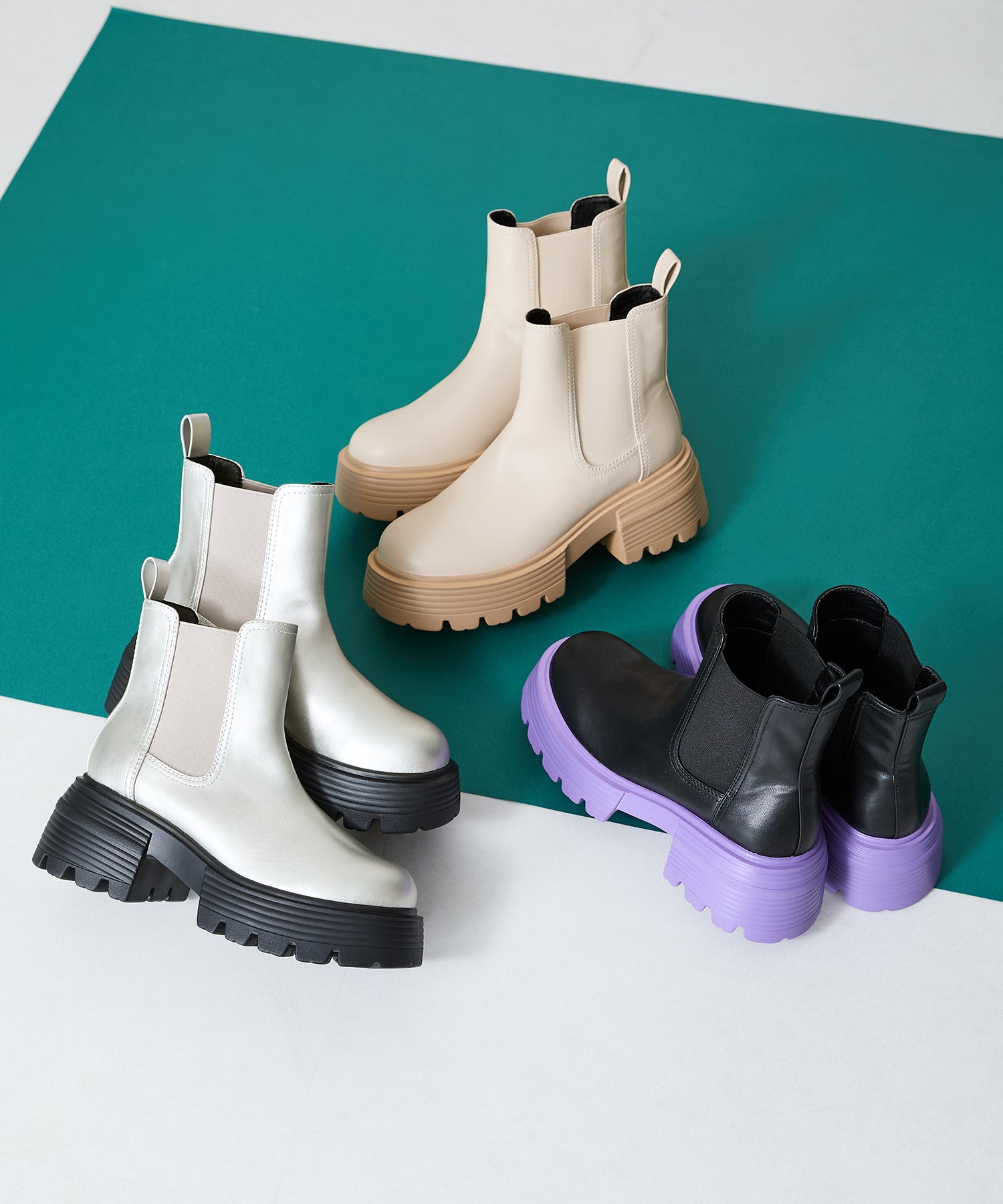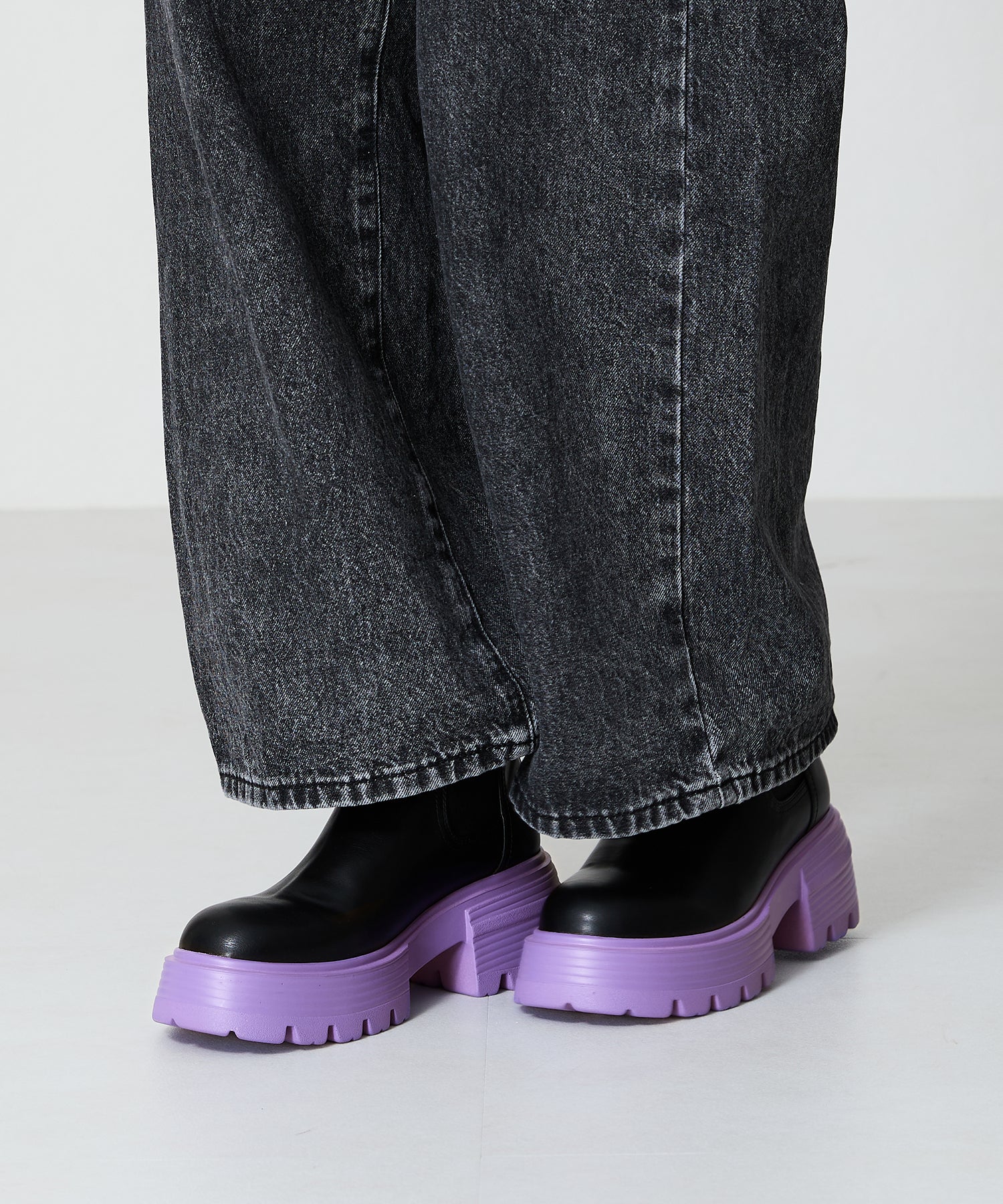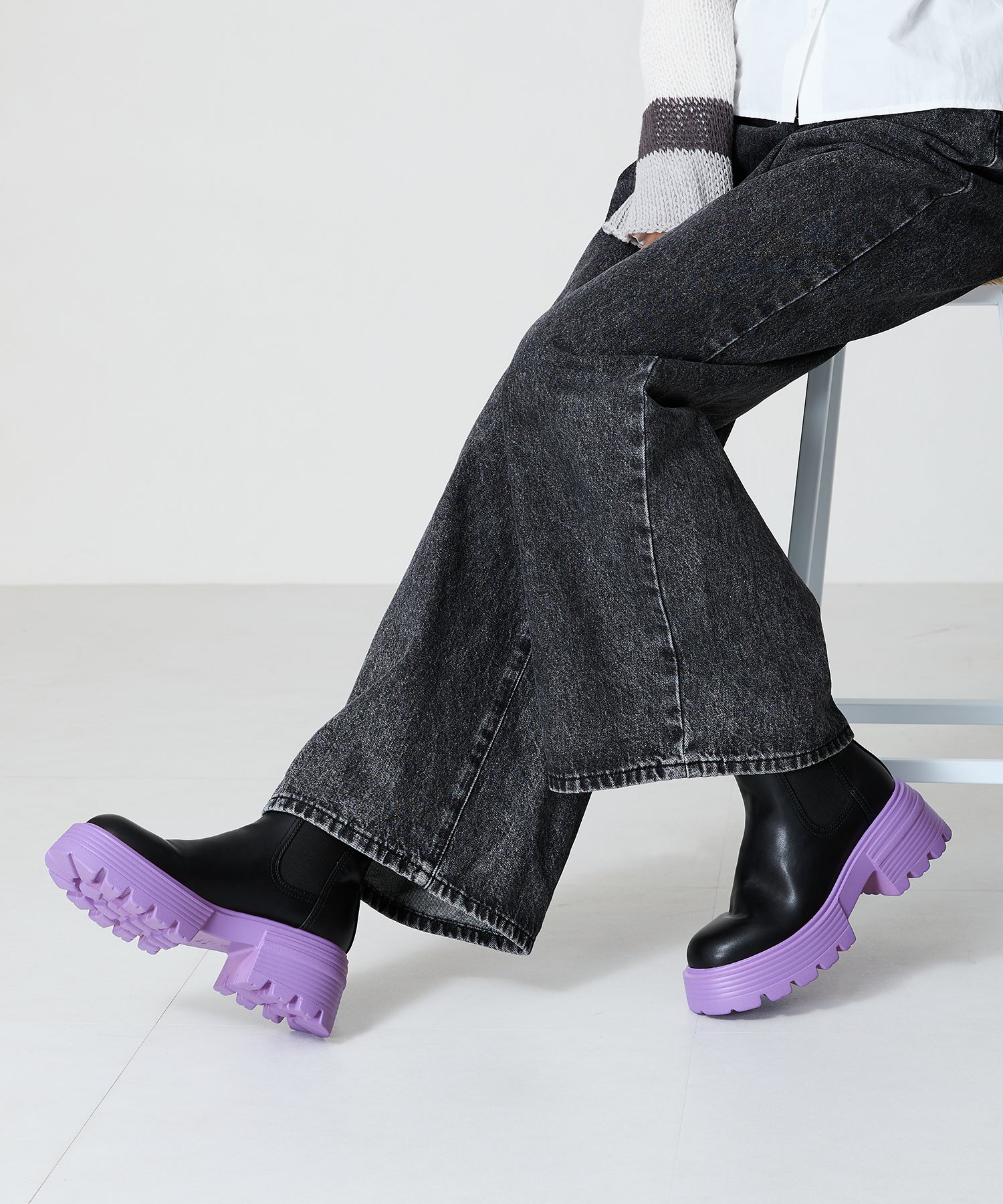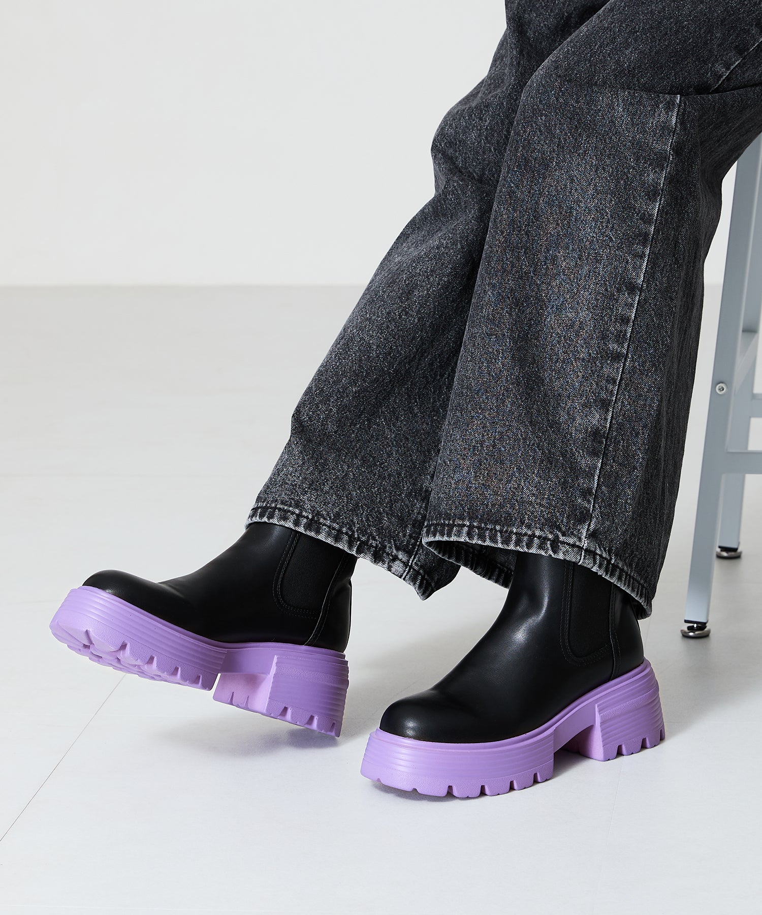 ボリューム感のあるソールとバイカラーの配色が目を引く厚底サイドゴアブーツ。存在感のあるソールは見た目以上に軽量で、高低差も少ないので足に負担がかかりにくく歩きやすい。取り入れるだけでトレンドライクなスタイルが完成する今季マストアイテム。遊び心のあるブラック×パープルはコーディネートが楽しくなるカラーリングでカジュアルコーデのアクセントにぴったり。