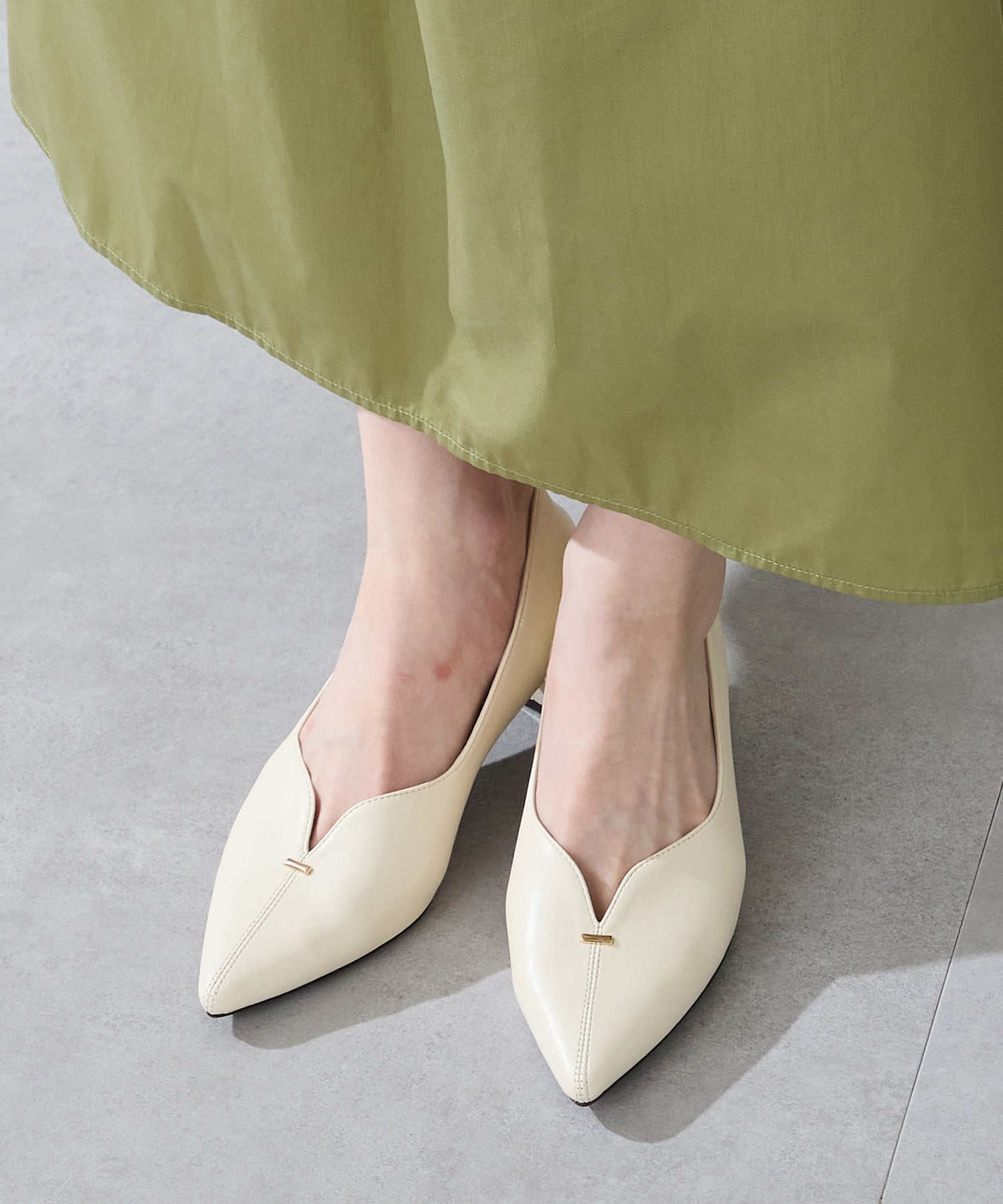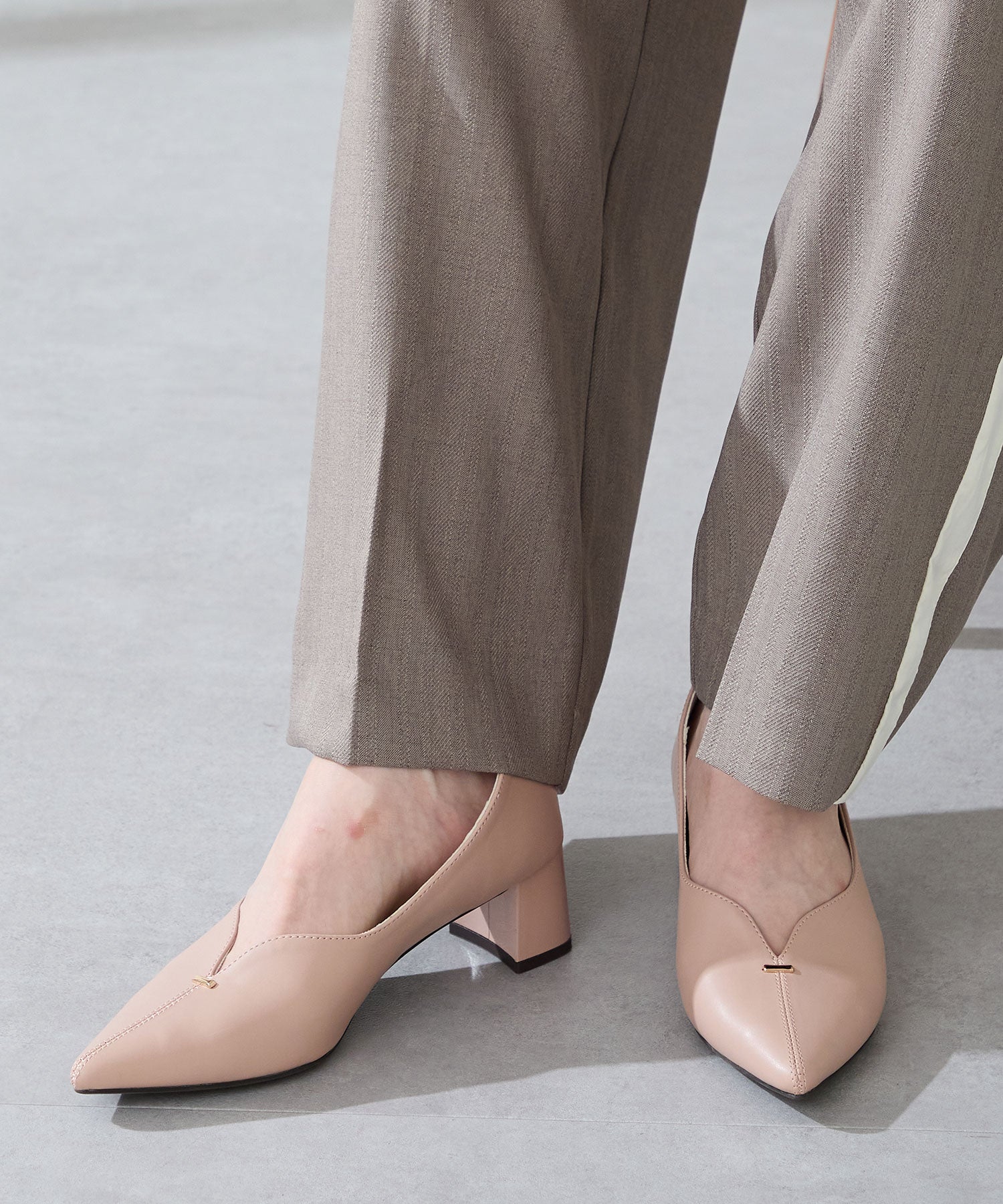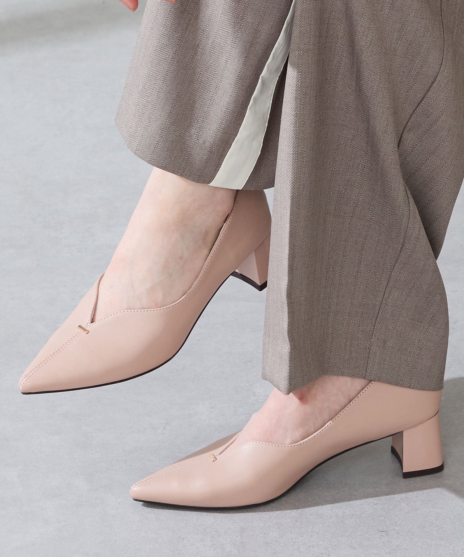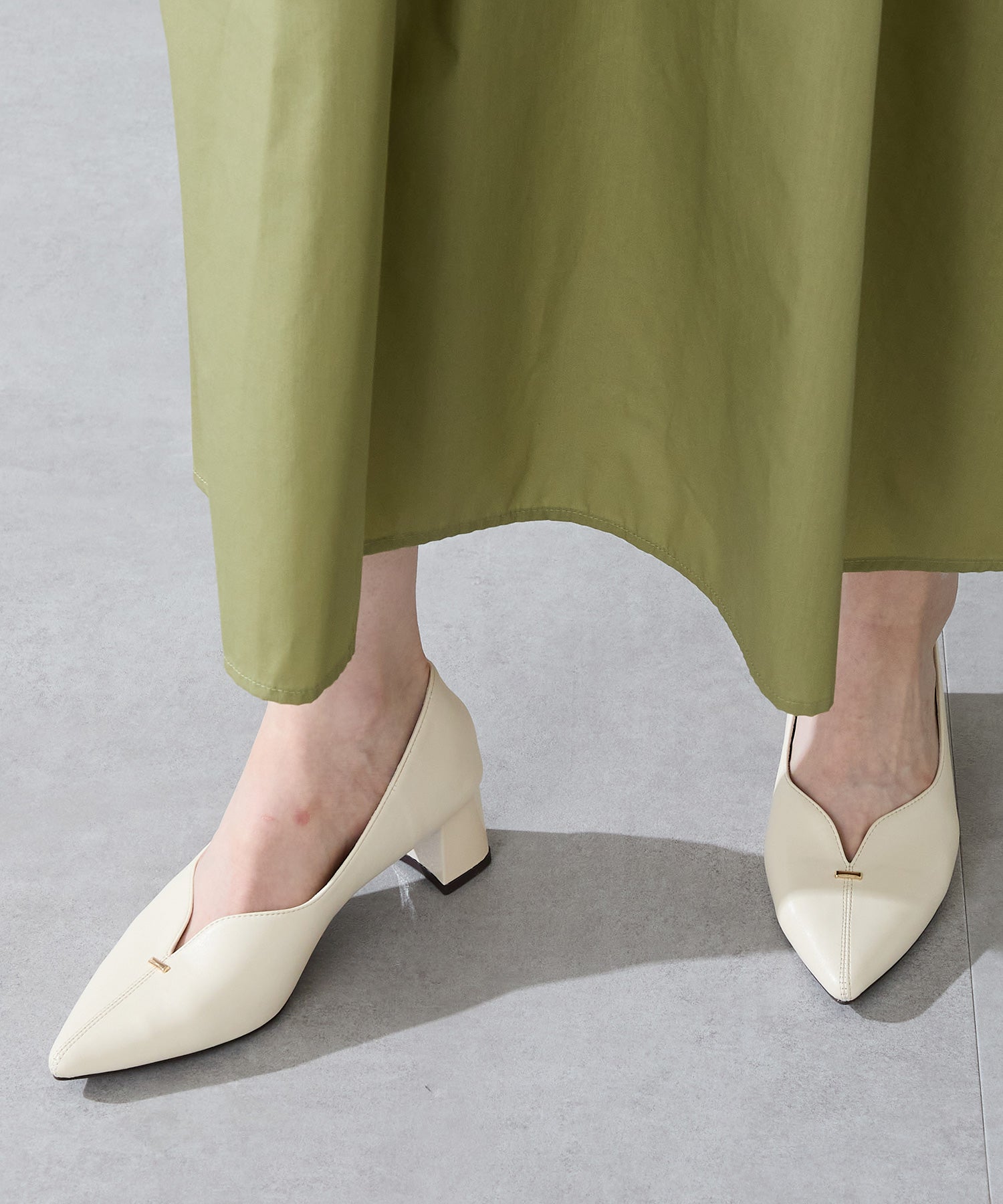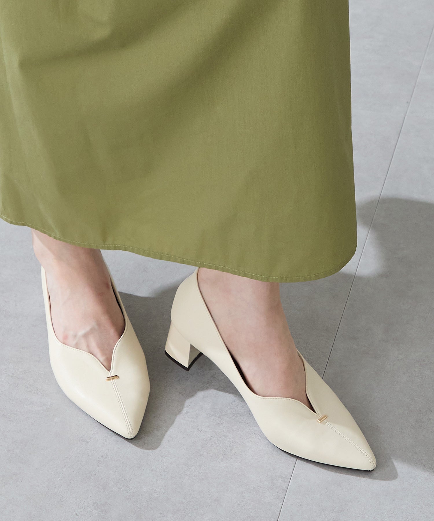 Vカットの履き口が足元をすっきりと見せてくれる美脚パンプス。アッパーのゴールドパーツがシンプルながらもさりげなくアクセントに。程よい高さのチャンキーヒールで歩きやすさと美しいシルエットを両立し、デイリーからオフィススタイルにマッチ。淡いベーシックなカラーリングとディテールにこだわったデザインが、日常のスタイリングを格上げしてくれるアイテム。