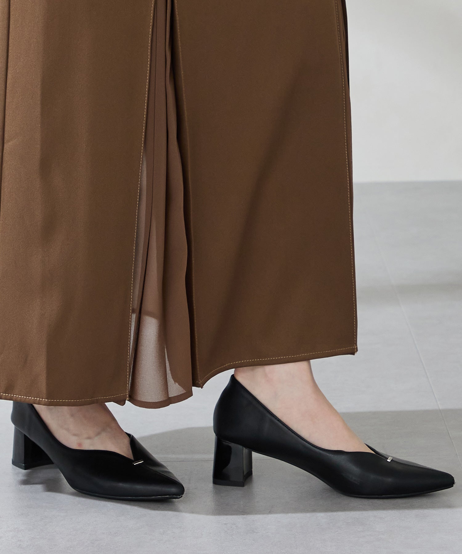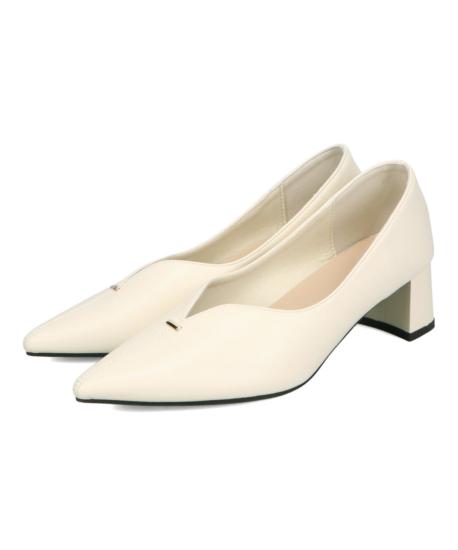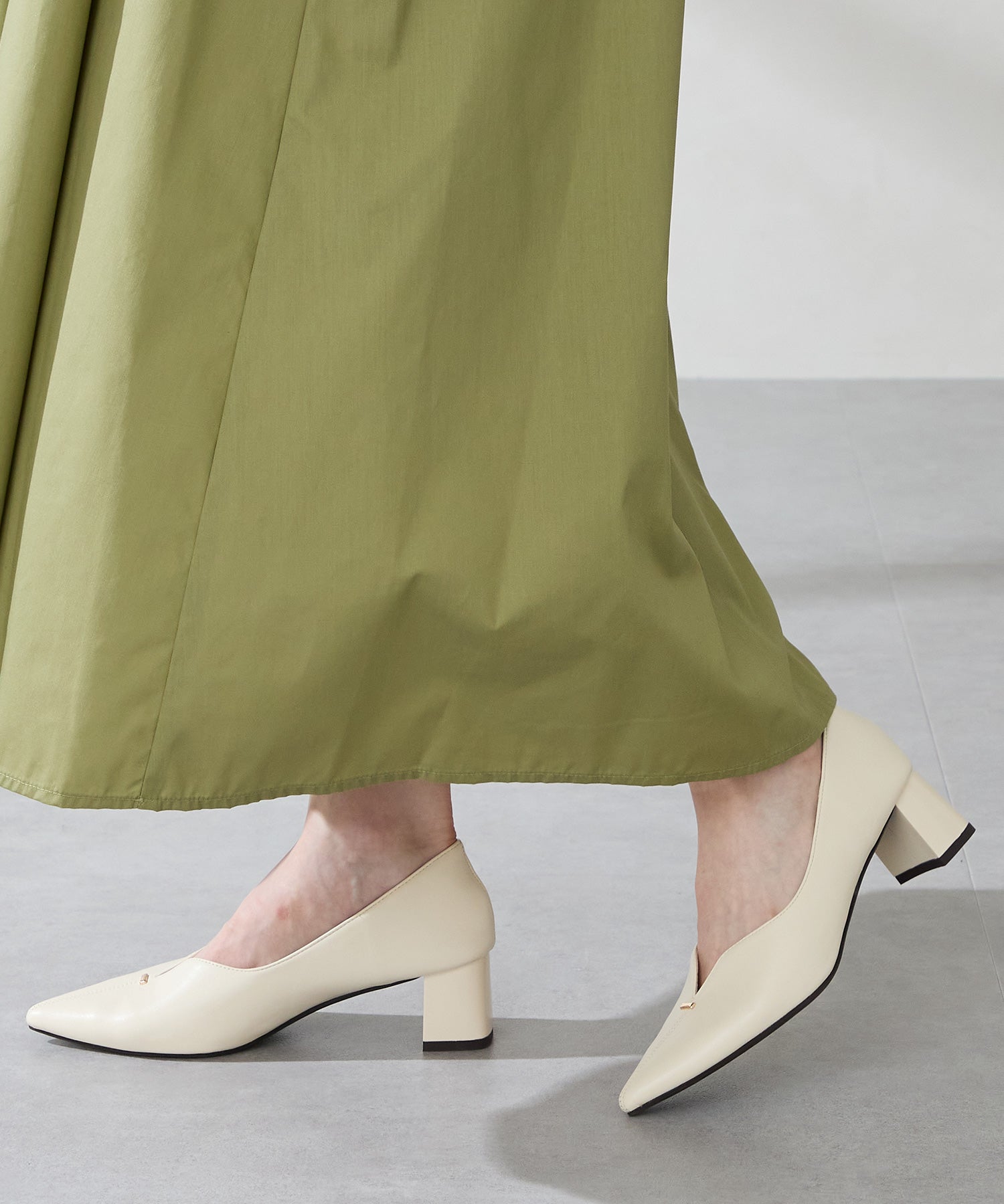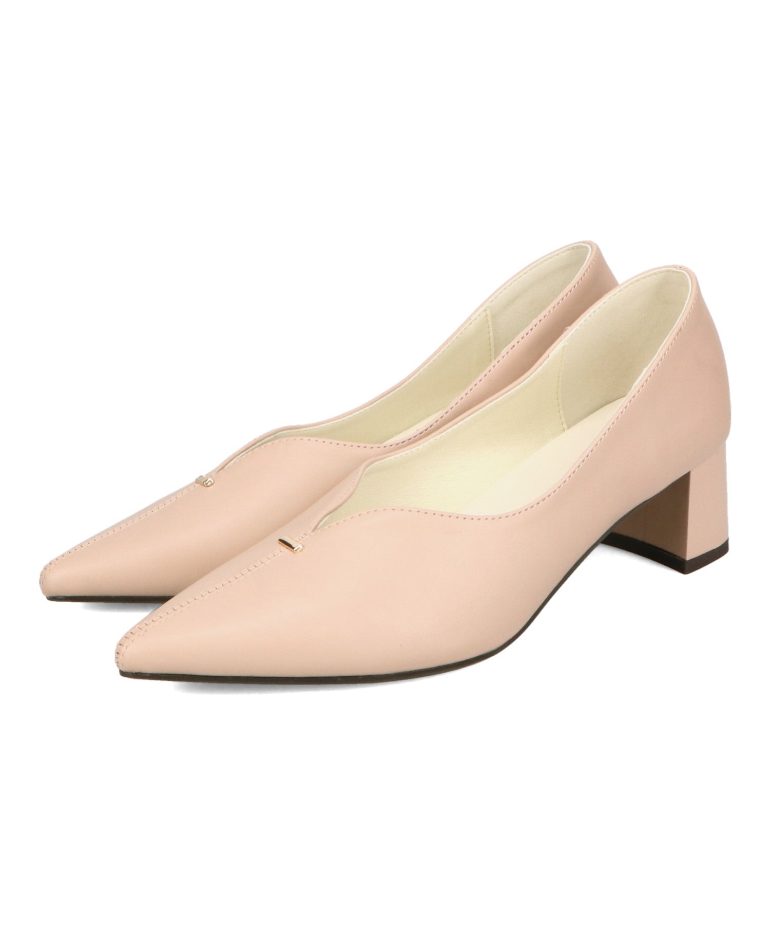 Vカットの履き口が足元をすっきりと見せてくれる美脚パンプス。アッパーのゴールドパーツがシンプルながらもさりげなくアクセントに。程よい高さのチャンキーヒールで歩きやすさと美しいシルエットを両立し、デイリーからオフィススタイルにマッチ。淡いベーシックなカラーリングとディテールにこだわったデザインが、日常のスタイリングを格上げしてくれるアイテム。