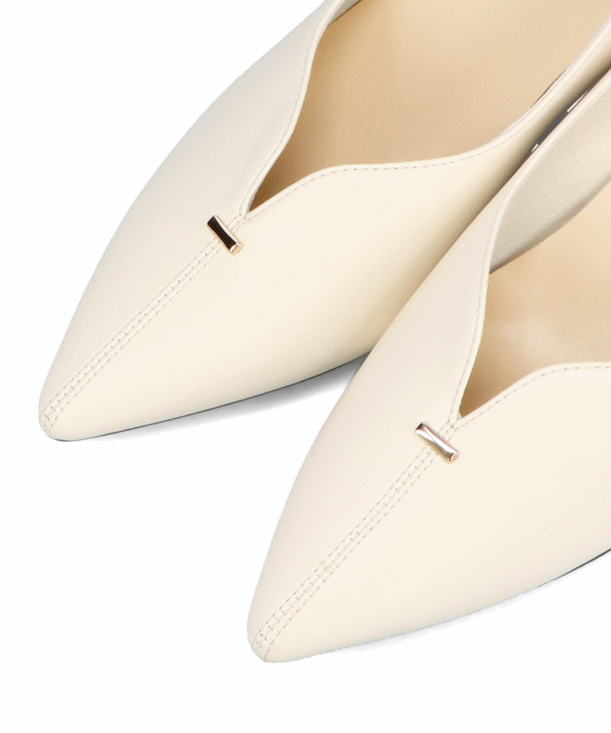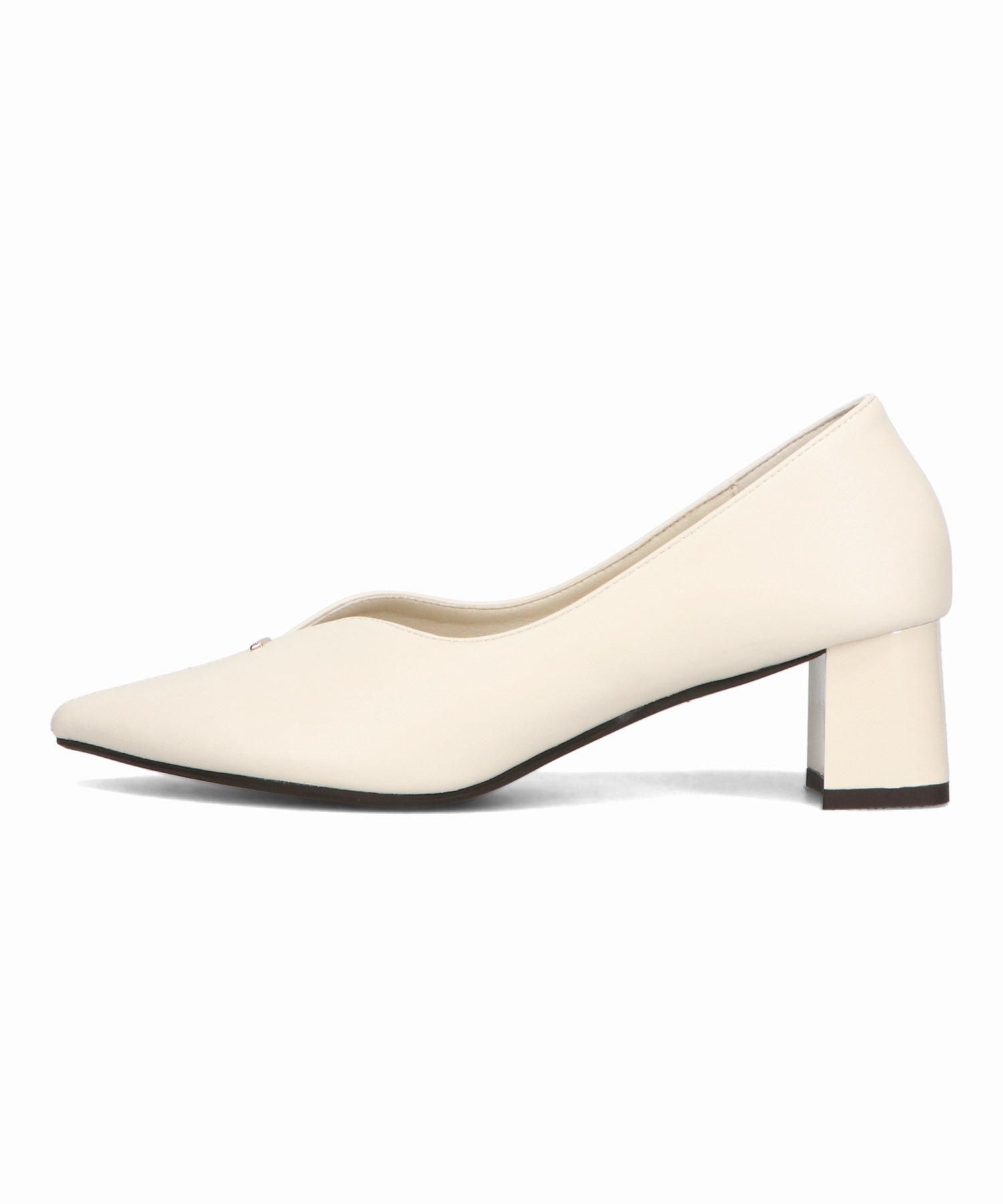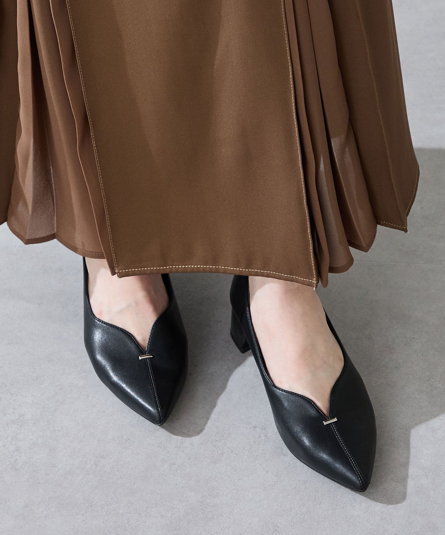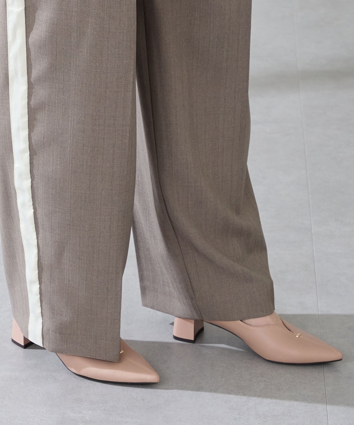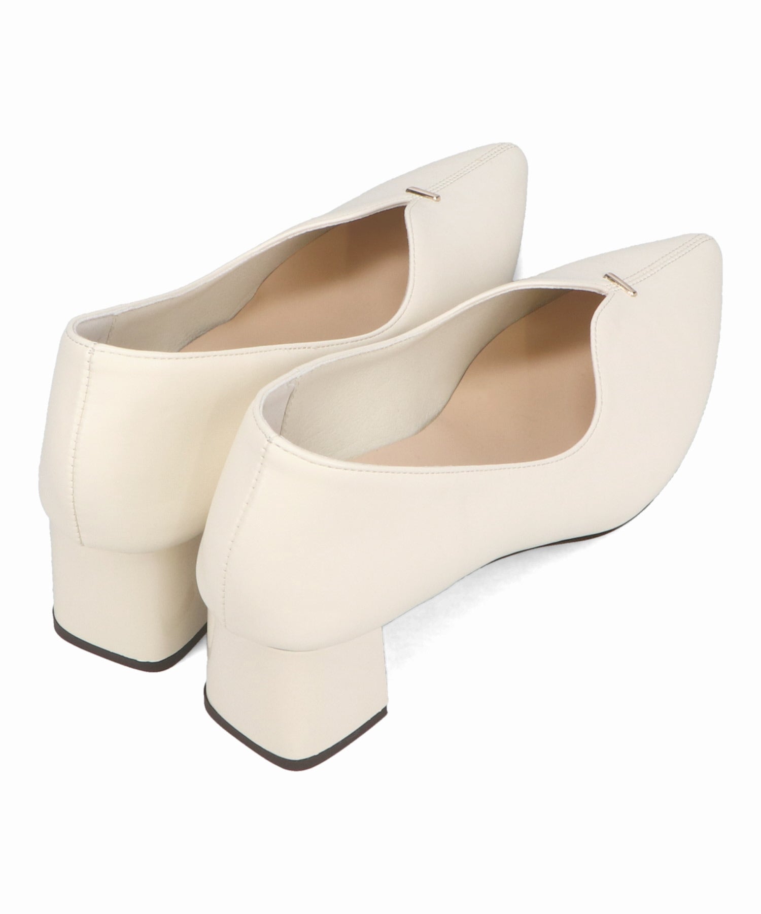 Vカットの履き口が足元をすっきりと見せてくれる美脚パンプス。アッパーのゴールドパーツがシンプルながらもさりげなくアクセントに。程よい高さのチャンキーヒールで歩きやすさと美しいシルエットを両立し、デイリーからオフィススタイルにマッチ。淡いベーシックなカラーリングとディテールにこだわったデザインが、日常のスタイリングを格上げしてくれるアイテム。