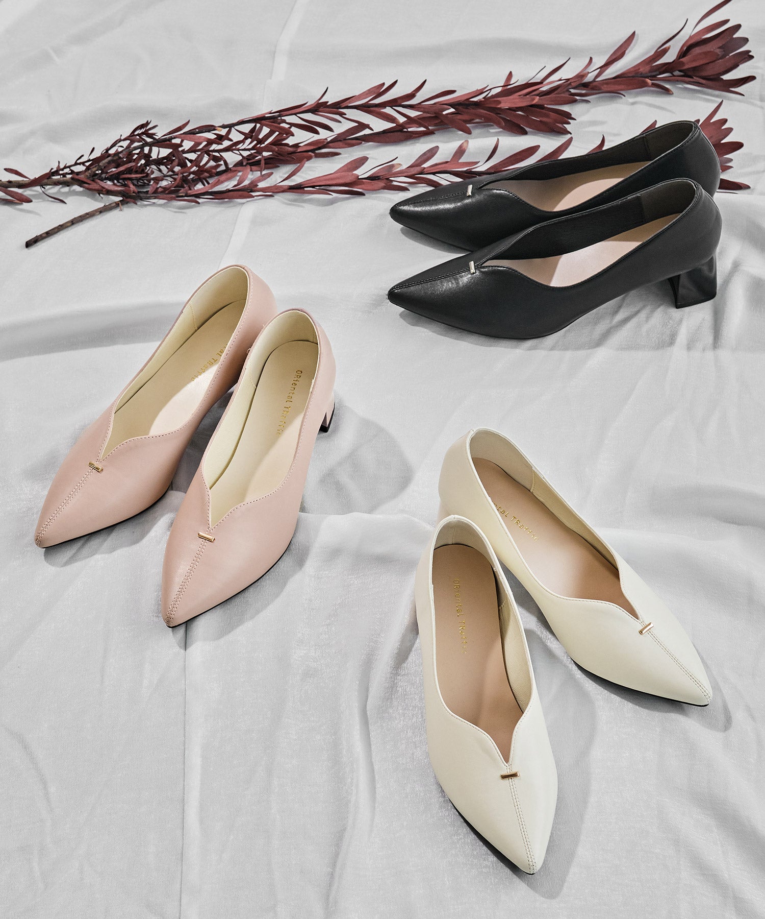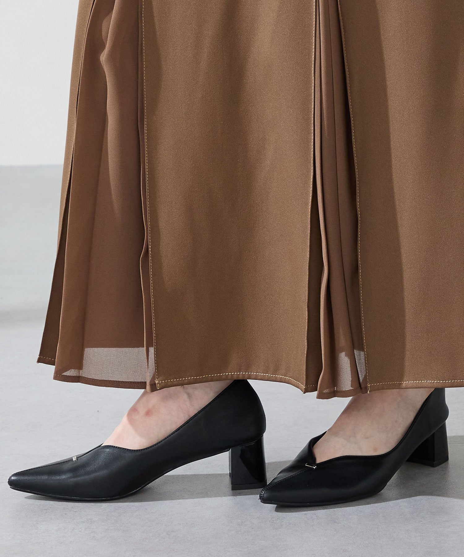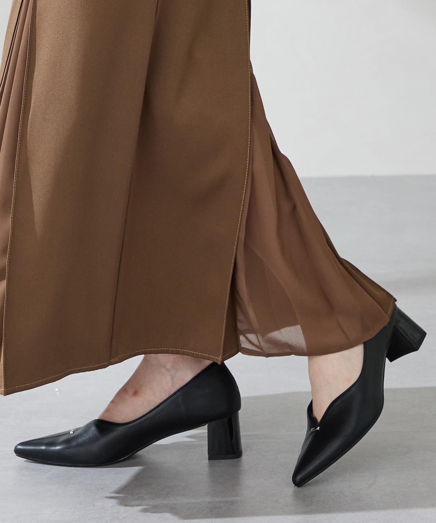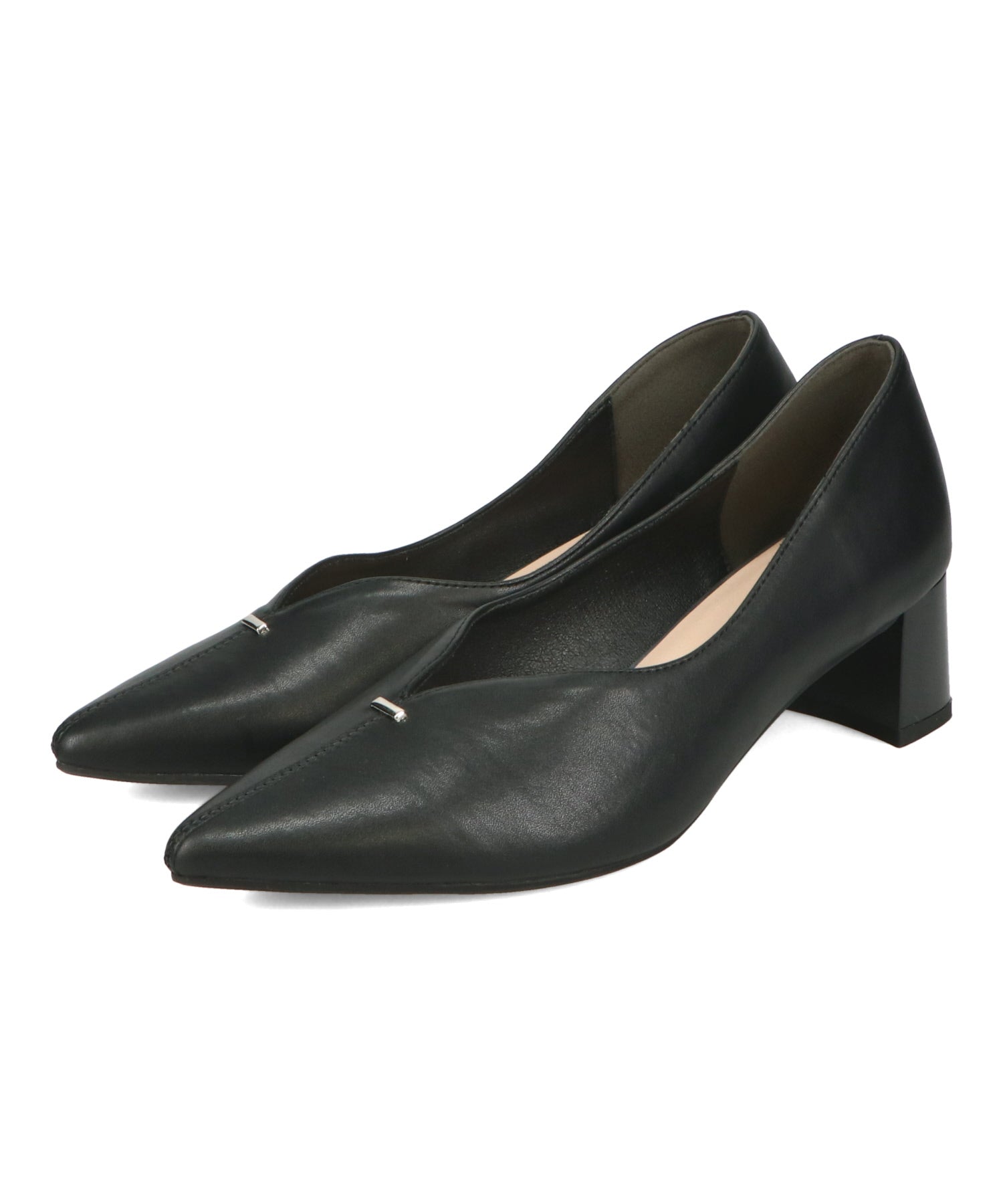 Vカットの履き口が足元をすっきりと見せてくれる美脚パンプス。アッパーのゴールドパーツがシンプルながらもさりげなくアクセントに。程よい高さのチャンキーヒールで歩きやすさと美しいシルエットを両立し、デイリーからオフィススタイルにマッチ。淡いベーシックなカラーリングとディテールにこだわったデザインが、日常のスタイリングを格上げしてくれるアイテム。