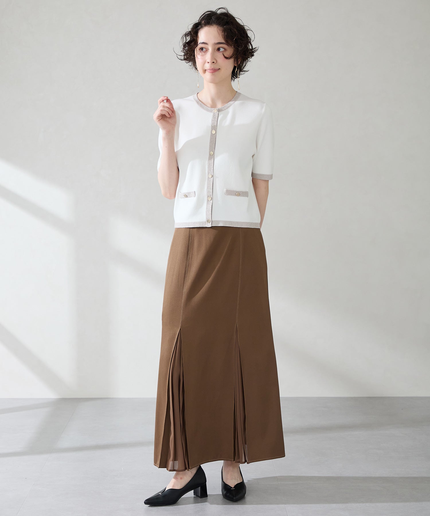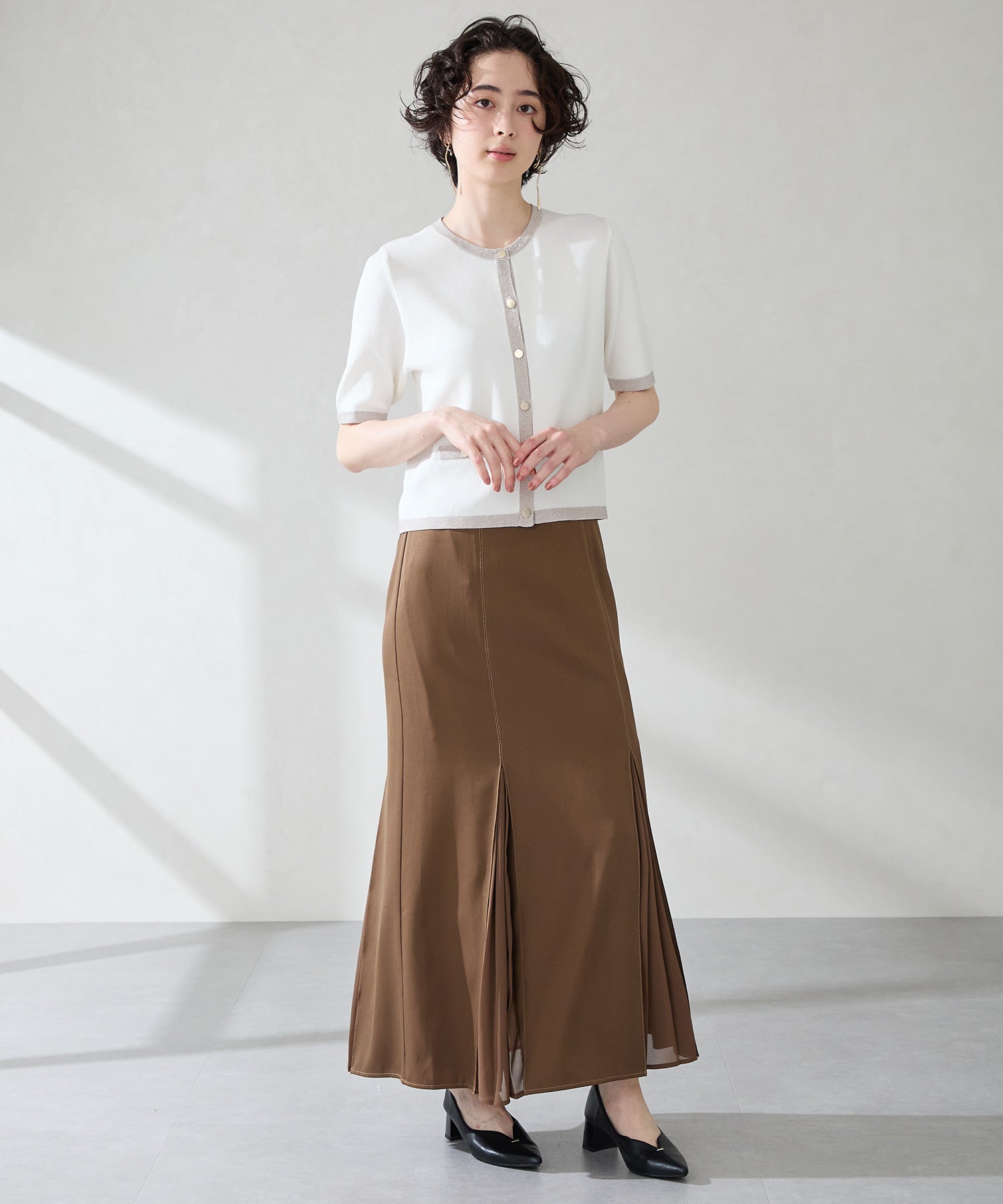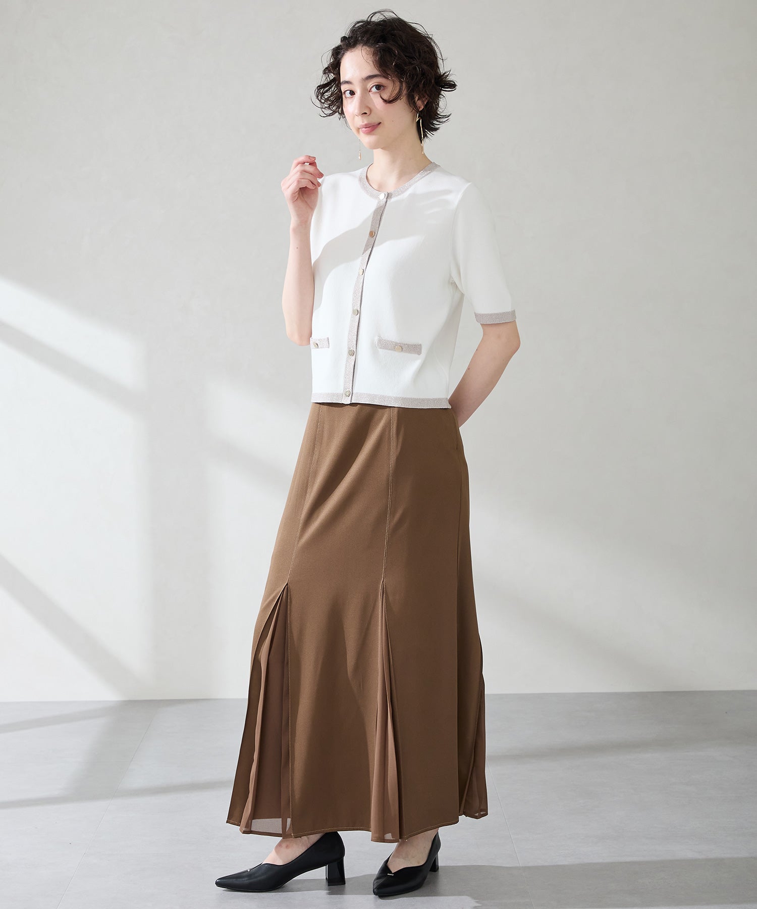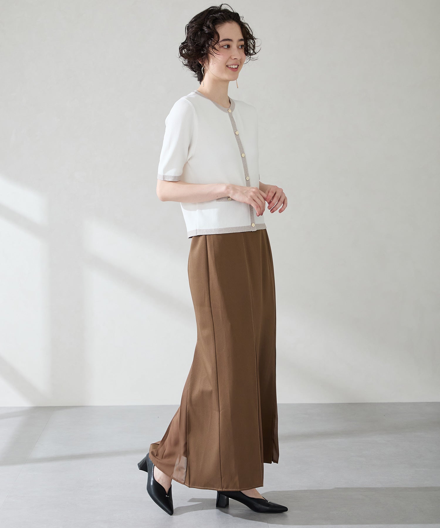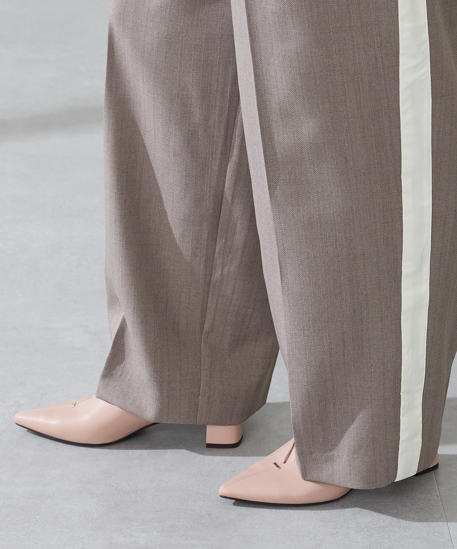 Vカットの履き口が足元をすっきりと見せてくれる美脚パンプス。アッパーのゴールドパーツがシンプルながらもさりげなくアクセントに。程よい高さのチャンキーヒールで歩きやすさと美しいシルエットを両立し、デイリーからオフィススタイルにマッチ。淡いベーシックなカラーリングとディテールにこだわったデザインが、日常のスタイリングを格上げしてくれるアイテム。