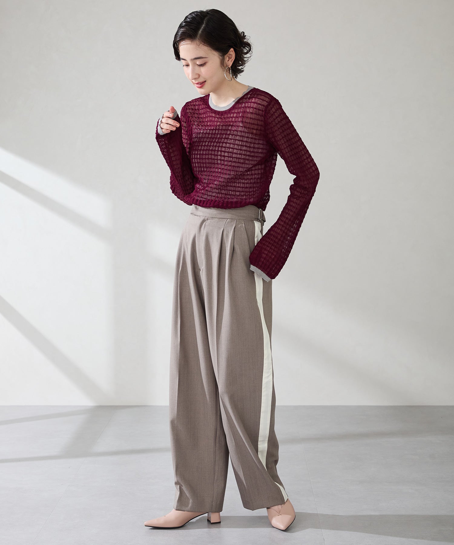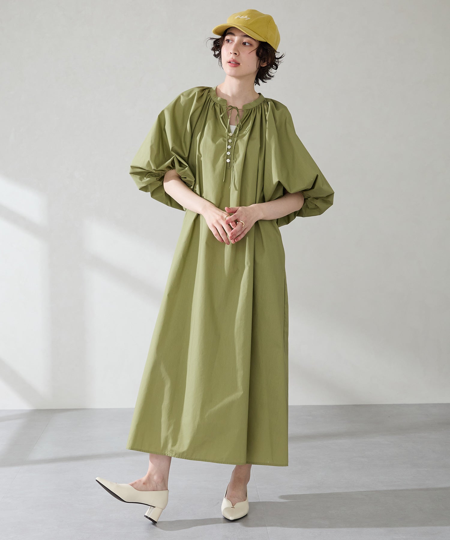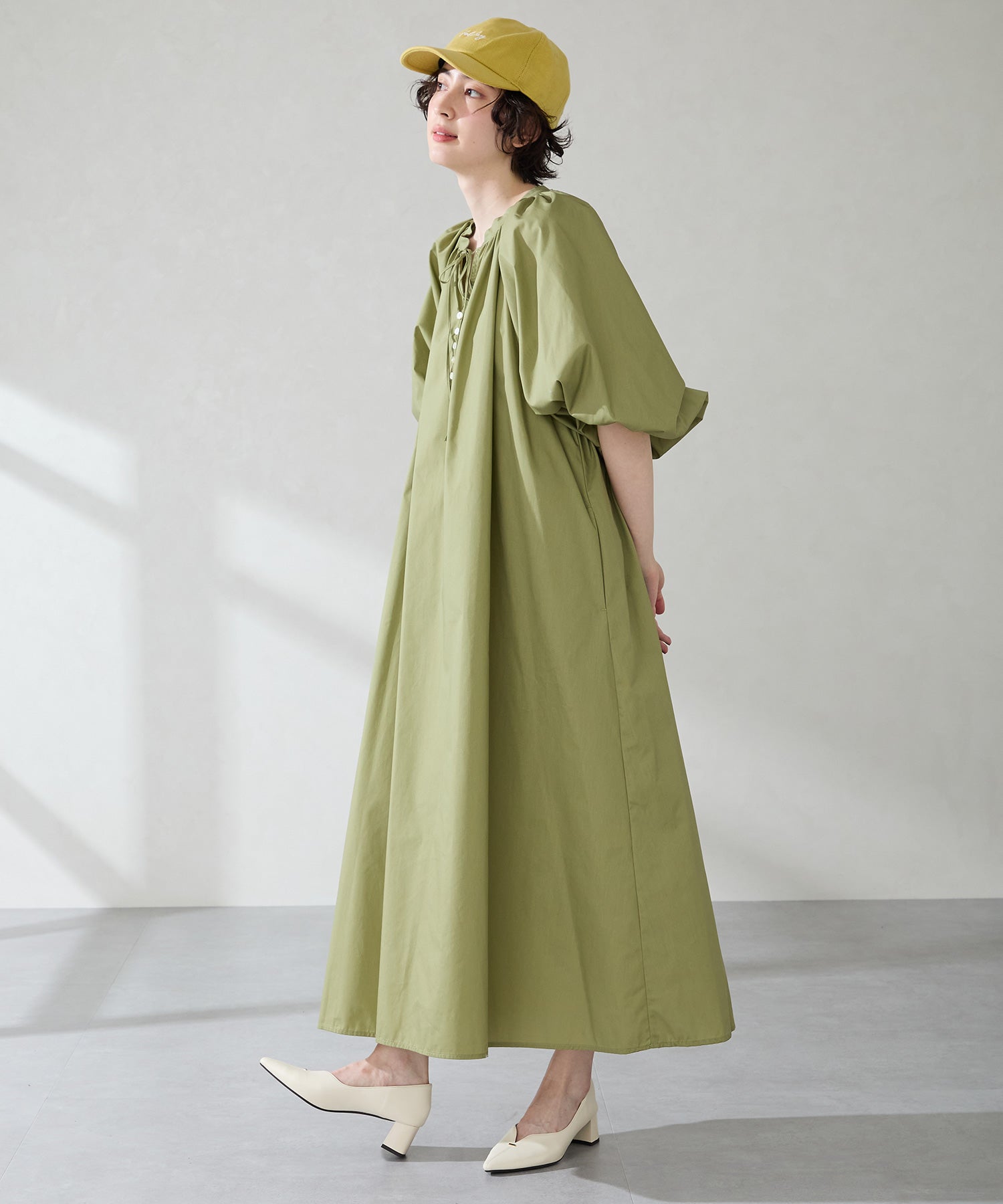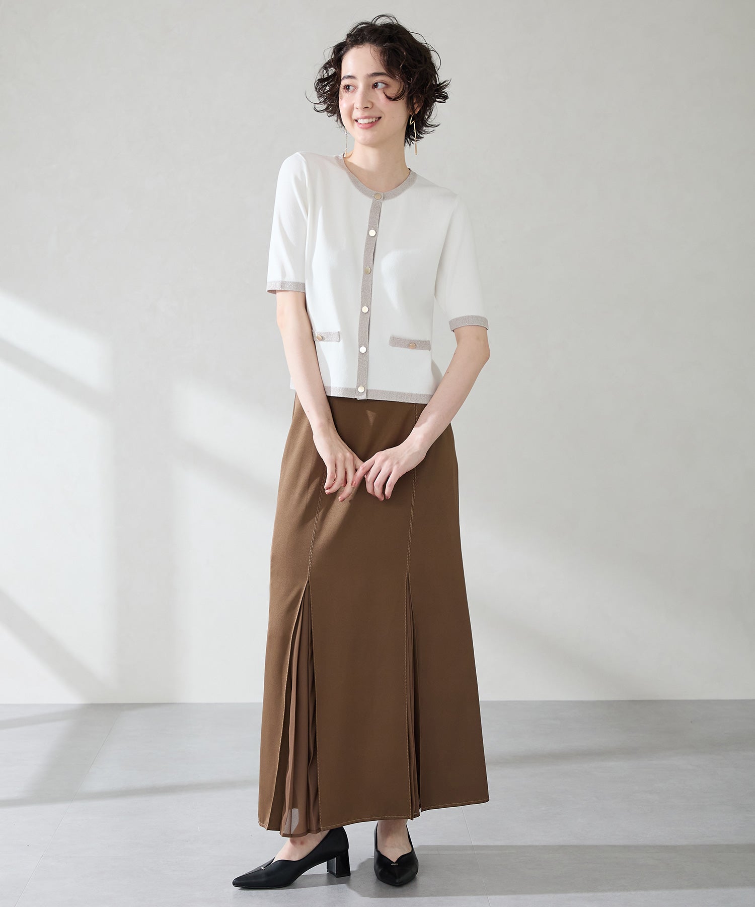 Vカットの履き口が足元をすっきりと見せてくれる美脚パンプス。アッパーのゴールドパーツがシンプルながらもさりげなくアクセントに。程よい高さのチャンキーヒールで歩きやすさと美しいシルエットを両立し、デイリーからオフィススタイルにマッチ。淡いベーシックなカラーリングとディテールにこだわったデザインが、日常のスタイリングを格上げしてくれるアイテム。