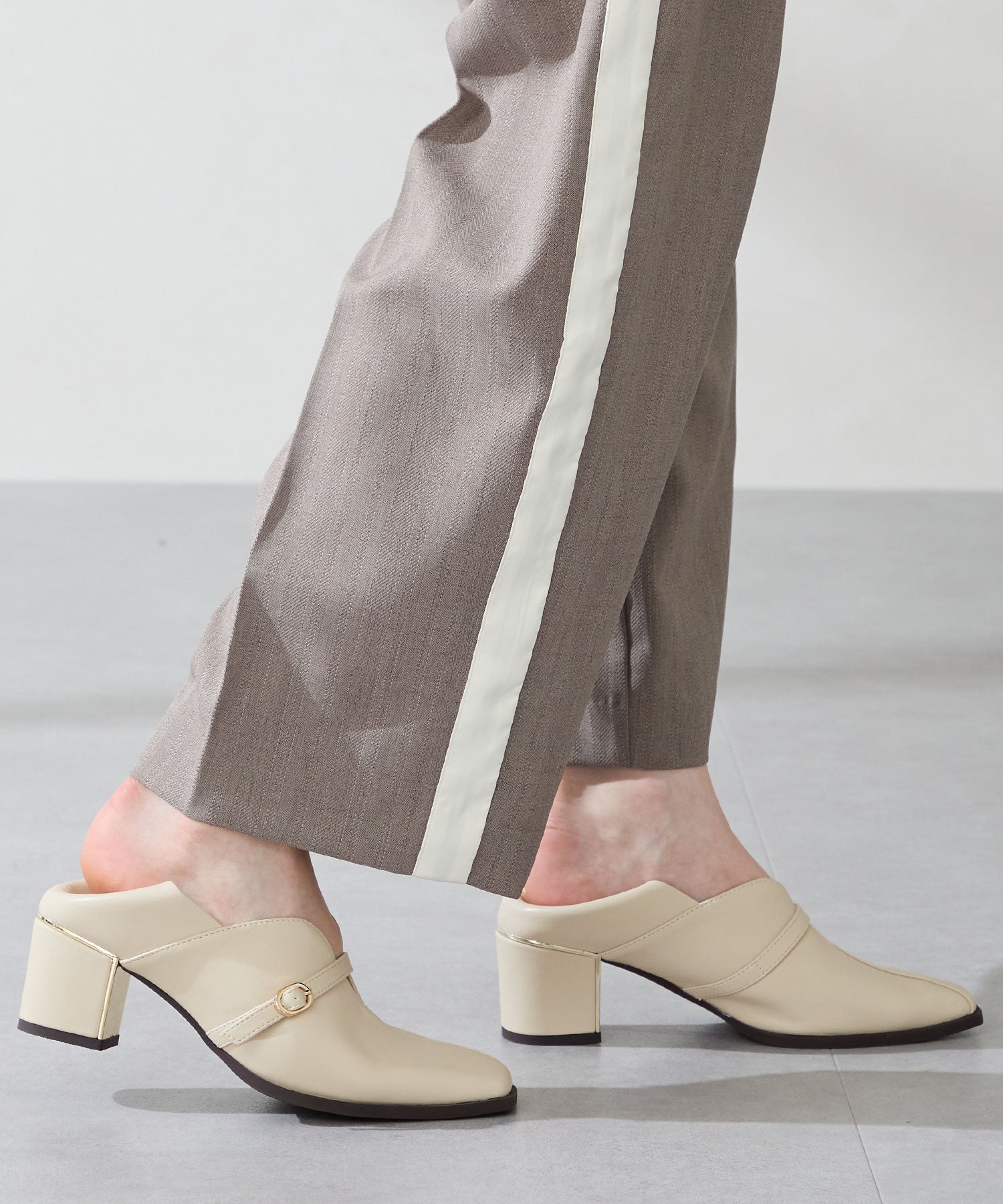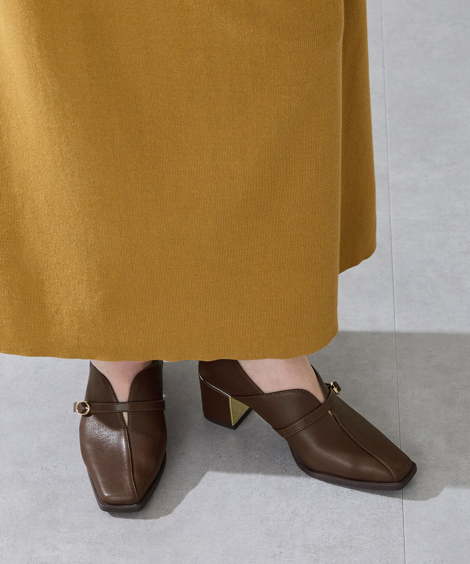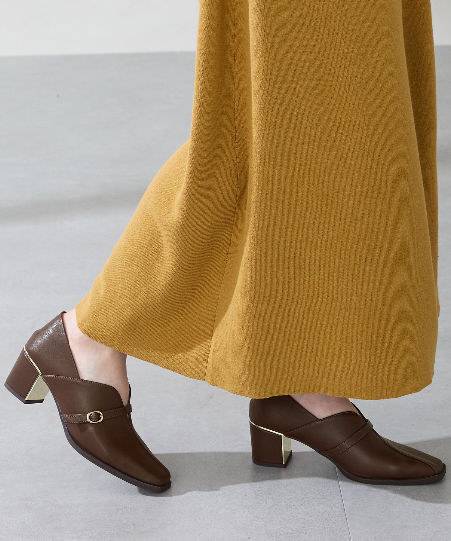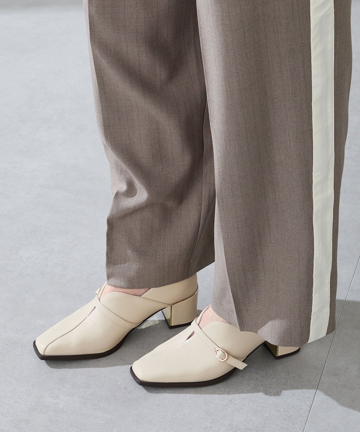 シャープなスクエアトゥと甲のカットラインが足元に抜け感を出し、ソールに付けたコバデザインでモードな雰囲気を纏った1足。太めのヒールで安定感もありつつ、ゴールドのメタリックラインがワンポイントになり、高級感を演出。脱ぎ履きが簡単な踵を踏んでも履けるバブーシュタイプで、2wayで使える優れもの。細めの甲ベルトが足元を引き締め、スタイルアップも◎。