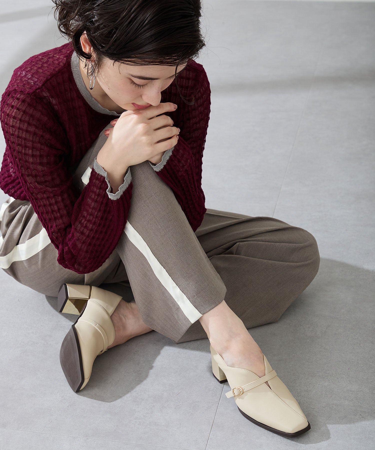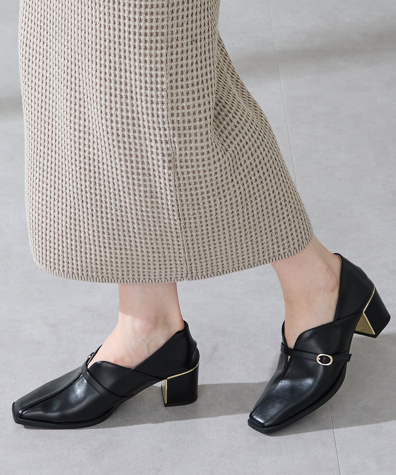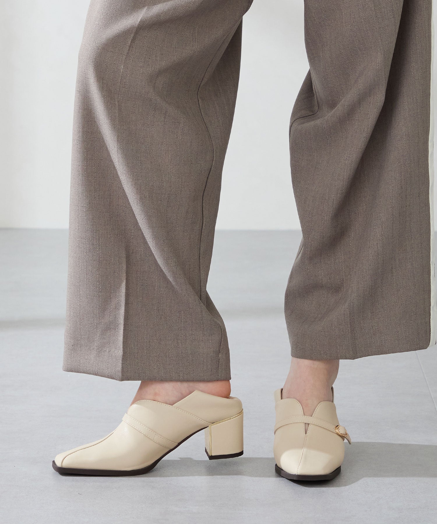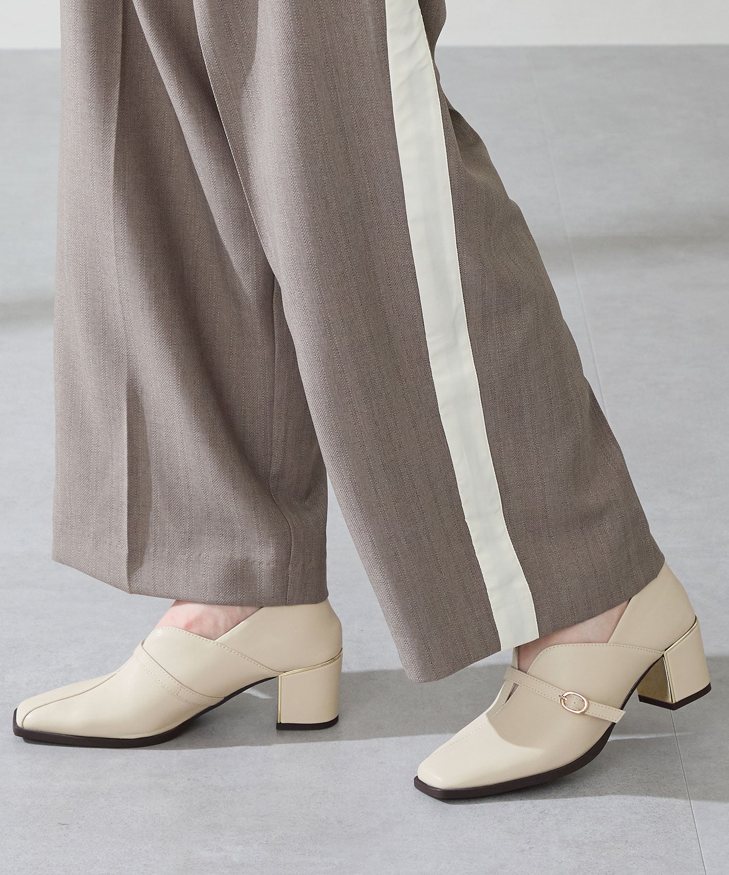 シャープなスクエアトゥと甲のカットラインが足元に抜け感を出し、ソールに付けたコバデザインでモードな雰囲気を纏った1足。太めのヒールで安定感もありつつ、ゴールドのメタリックラインがワンポイントになり、高級感を演出。脱ぎ履きが簡単な踵を踏んでも履けるバブーシュタイプで、2wayで使える優れもの。細めの甲ベルトが足元を引き締め、スタイルアップも◎。